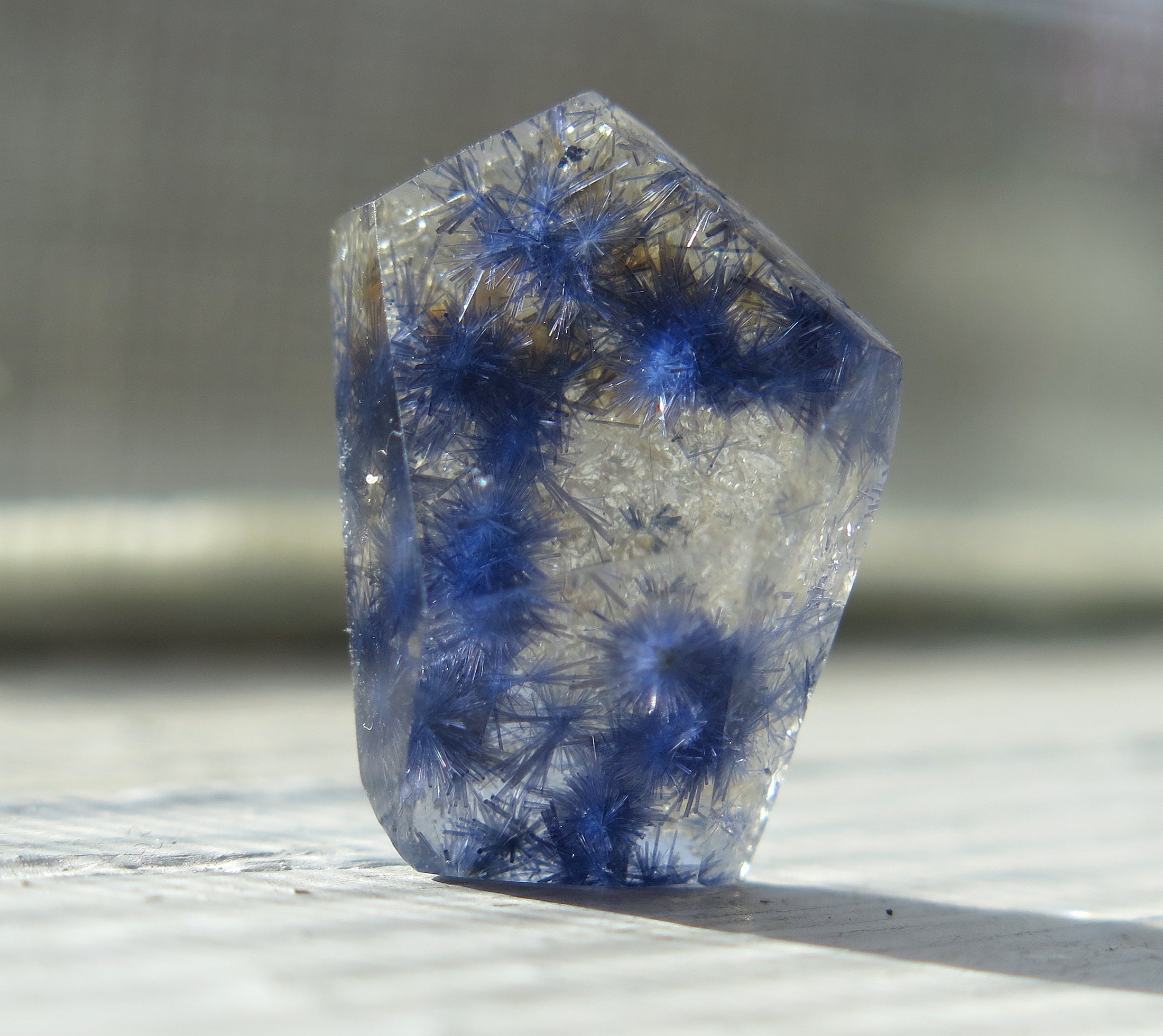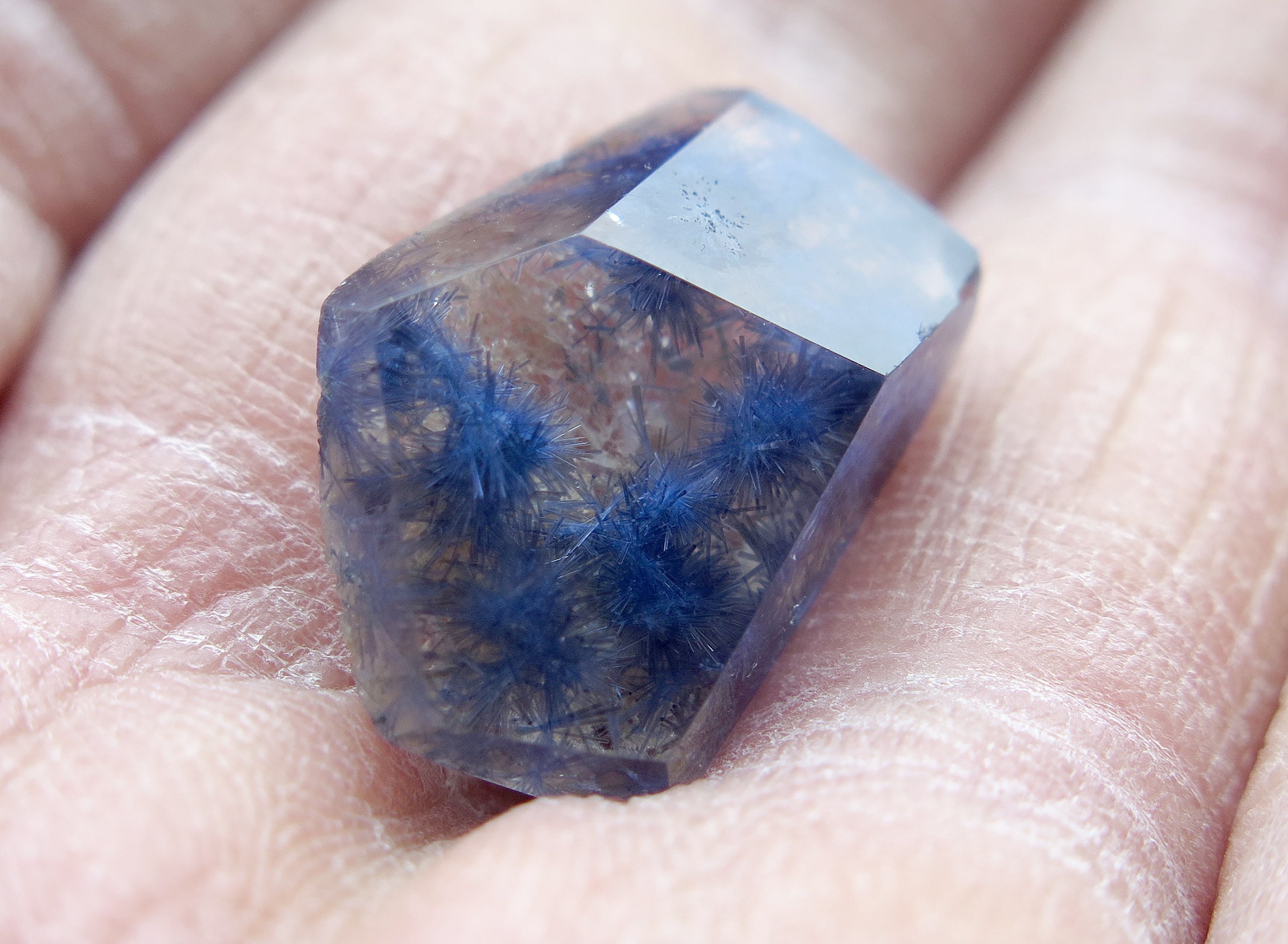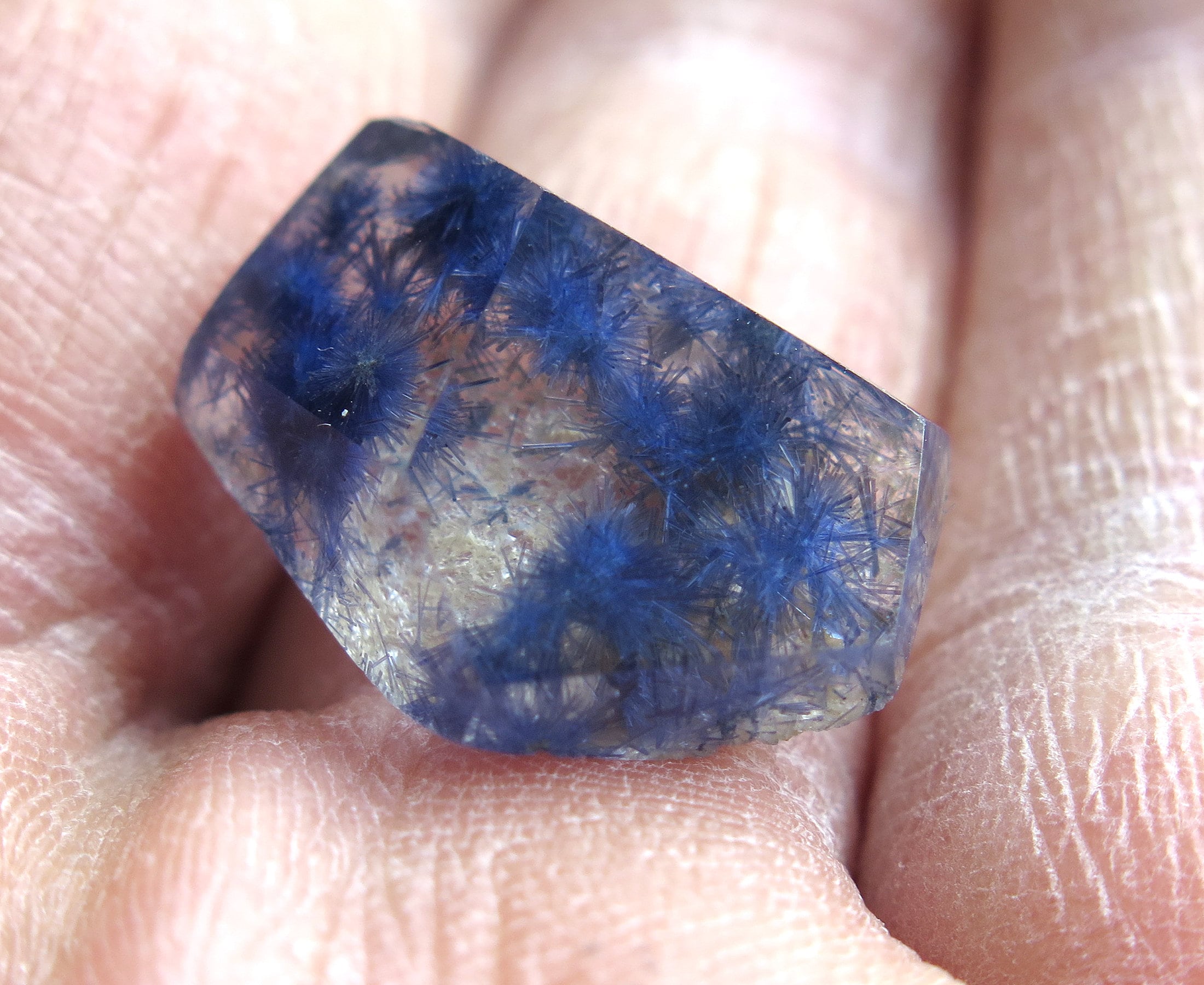 Offering a 13.75 carat intense blue Polished Dumortierite included water clear quartz. Photos shot with a macro lens. Crystal is very very nice and mighty scarce these days. Note the size of this crystal, it measures 20mm tall by 15mm wide by 10mm thick. It is a excellent quality detailed with sprays of Dumortierite on it's back wall spraying outward within the quartz. Mined in Vaca Morte, Bahia, Brazil 2003. Would make an excellent wrap or pendant or just stand it on end to display as is. USA first class with signature.