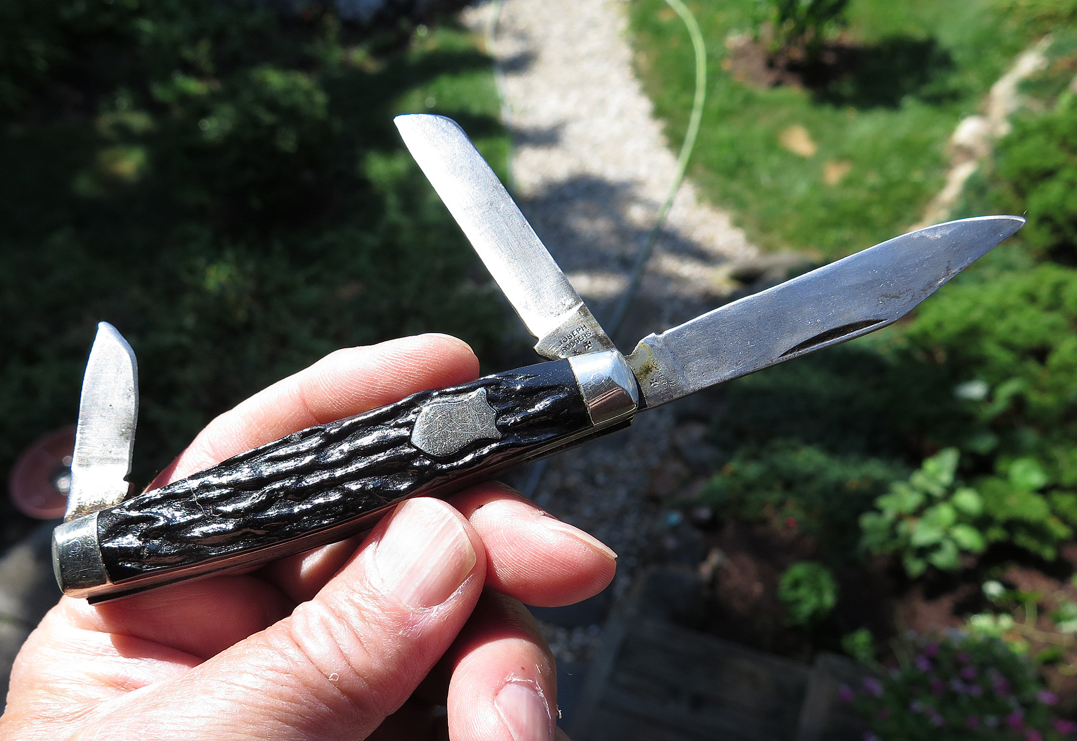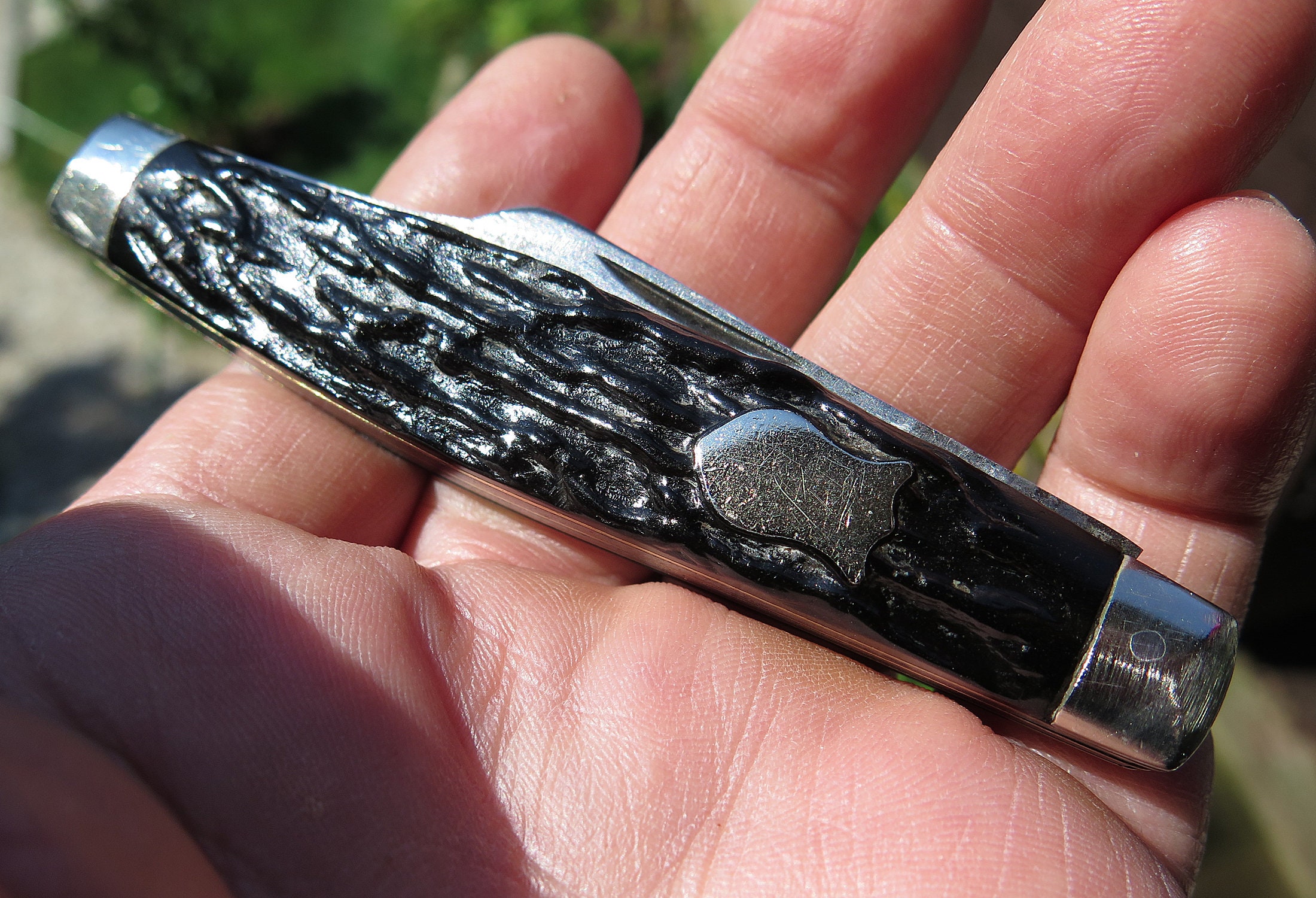 Offering an antique Joseph Rodgers, Sheffield England, used Stockman with cool rough black handles. 4 inches closed. All 3 blades snap very hard both ways. The knife is old and well used. There is a hairline crack on the front that does not wrap around. Considering age and price it's no big deal. USA only.