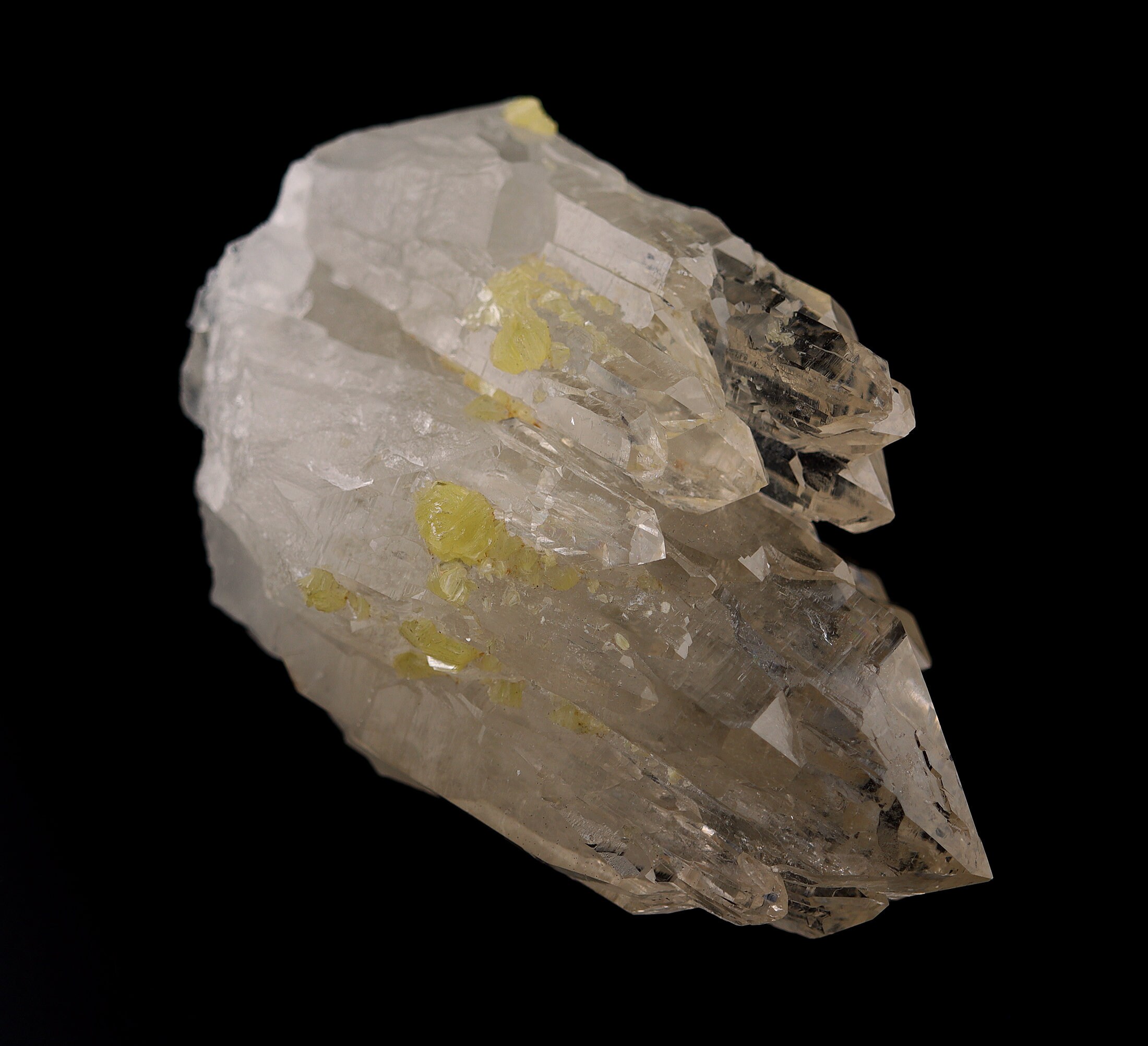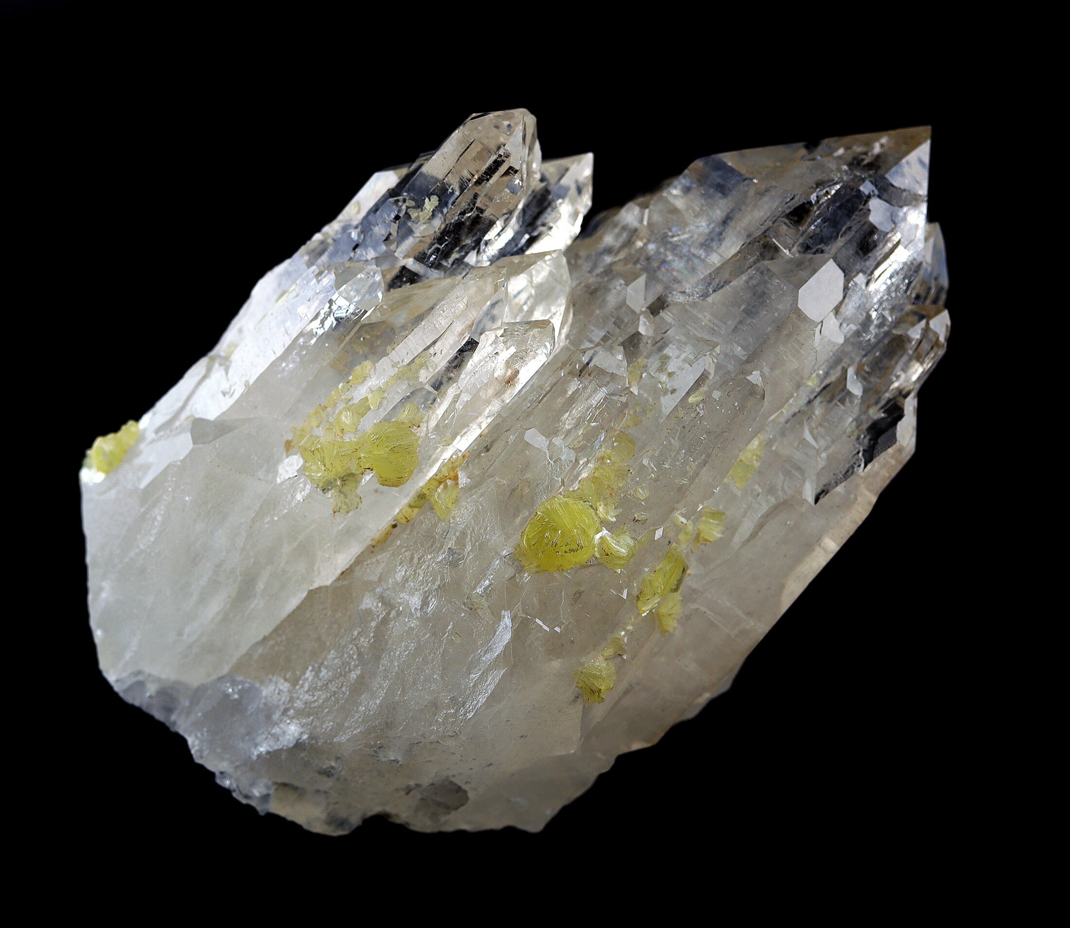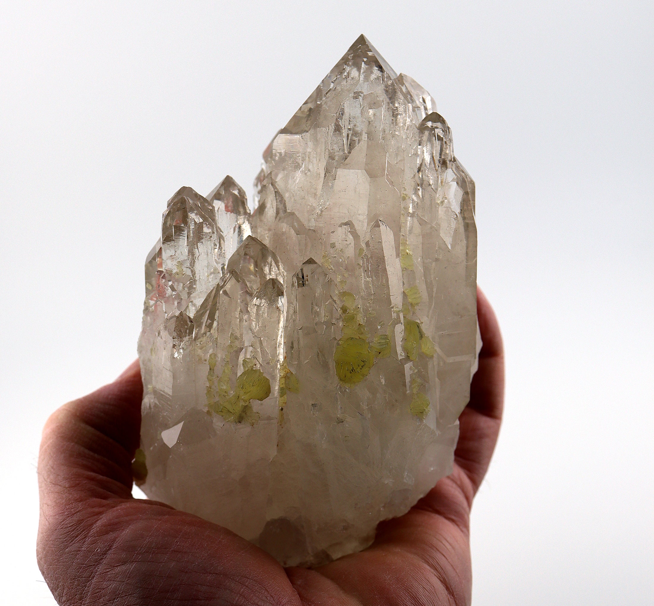 Offering a top grade highly lustrous cathedral quartz crystal. This crystal has been in our cabinet since 1990's, its that good. We have kept this this long for its top quality, condition, and aesthetics. Time for a new home. The crystal is dozens of crystal spires of which EVERY one is PERFECT and damage free. A special large natural glassy crystal that was well cared for during the mining process and handling. The top half is icy clear with an excellent arrangement of points. Measure is 14 cm tall by 9.1 cm wide. Weight: 1 pound 13.8 ounce. Mined from Itinga, Minas Gerais, Brazil. The crystal will sit upright on its own although its quality warrants a custom base if one chooses to get one. We guarantee total satisfaction of we will happily pay for its return within the USA only. Overseas customers must write us to discuss procedure.