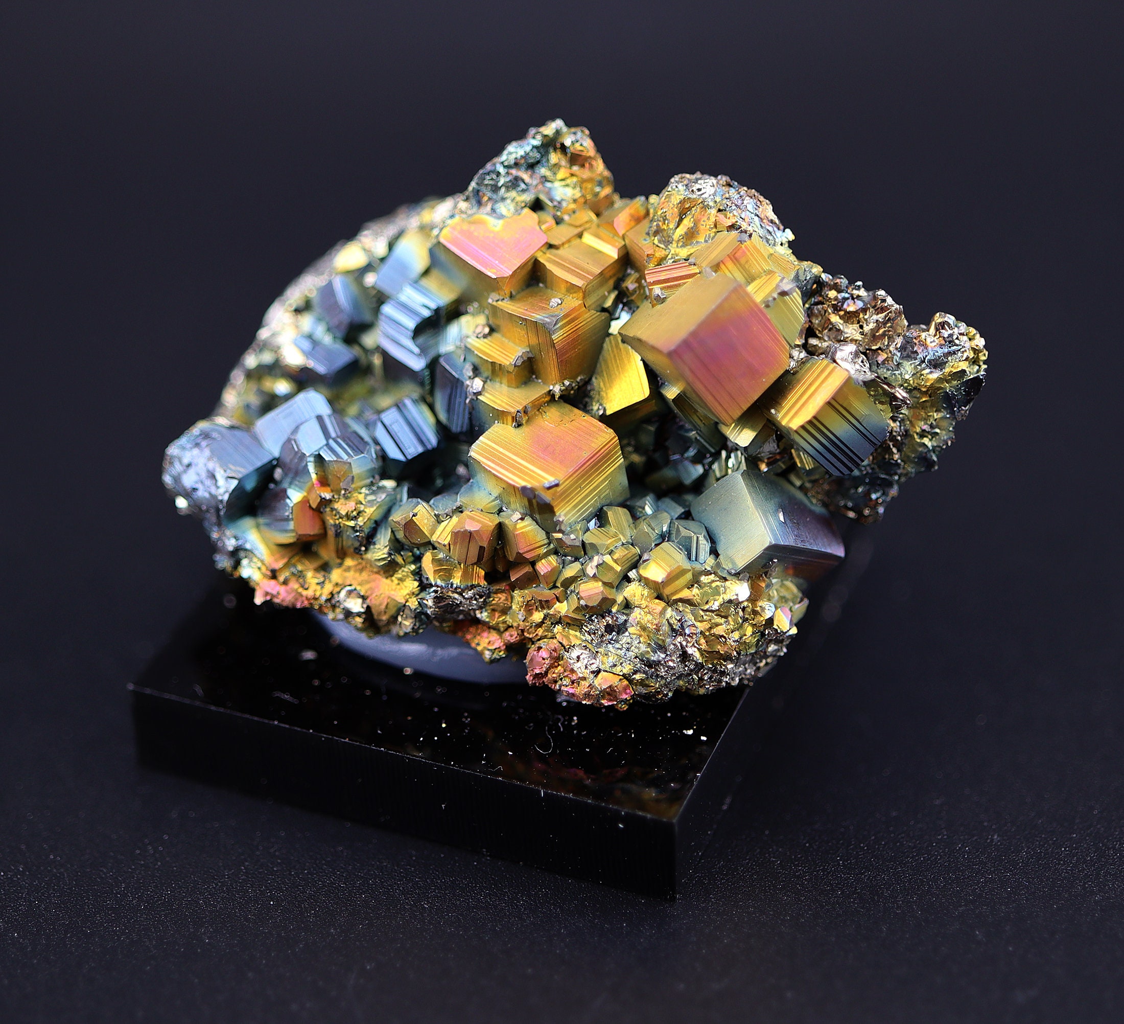 Love not only the iridescence but the structure as well. Natural iridescent Pyrite crystal. Las Minas, Veracruz, Mexico. We cleaned gently with water and air. Weight 149.8 carats (with black Lucite block). 29.9 grams (with black Lucite block) 43 mm across. 100% natural with iron oxides within the pocket causing rainbow color. Limited pocket, when they are gone they are gone. This one comes mounted as shown.