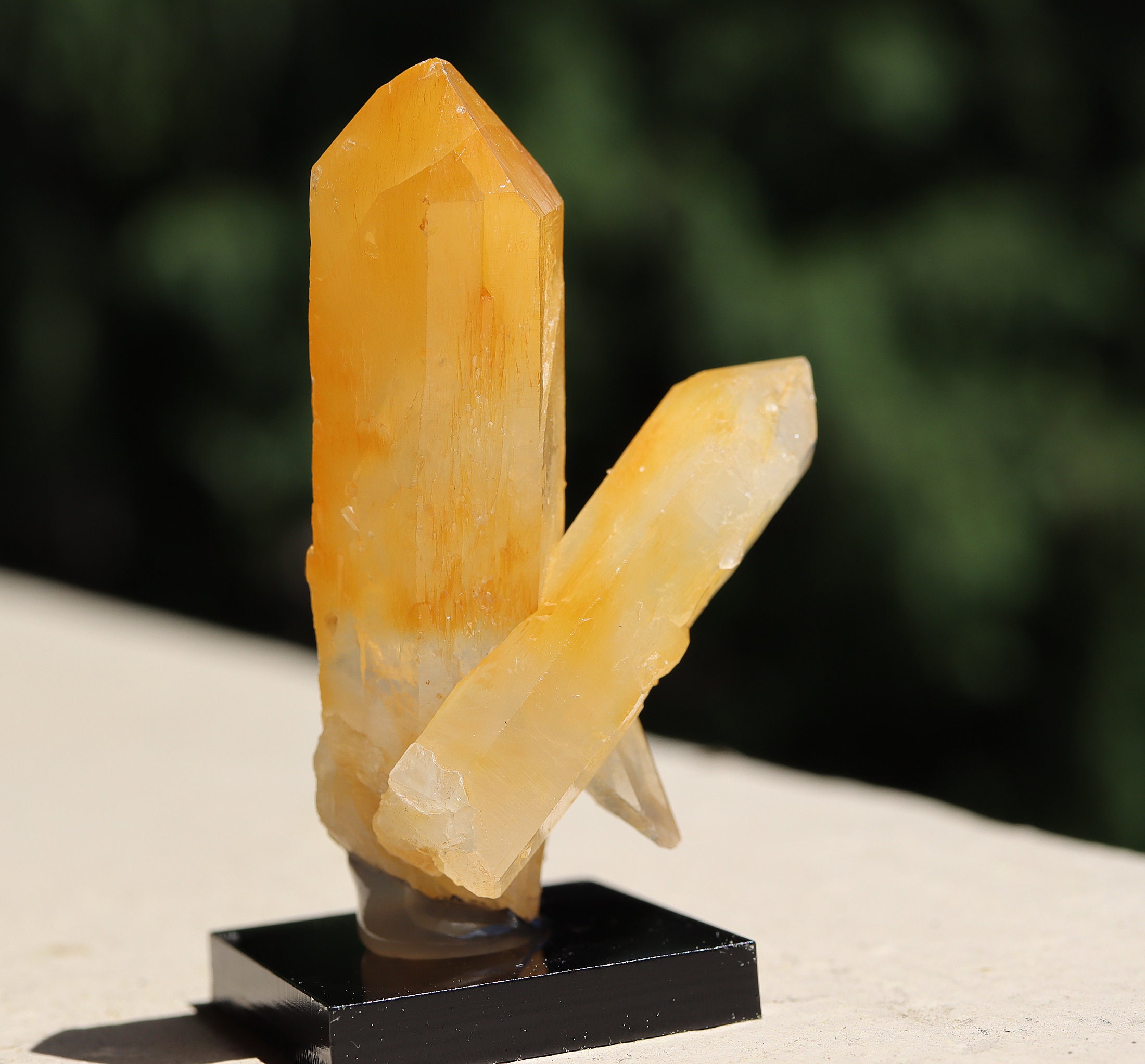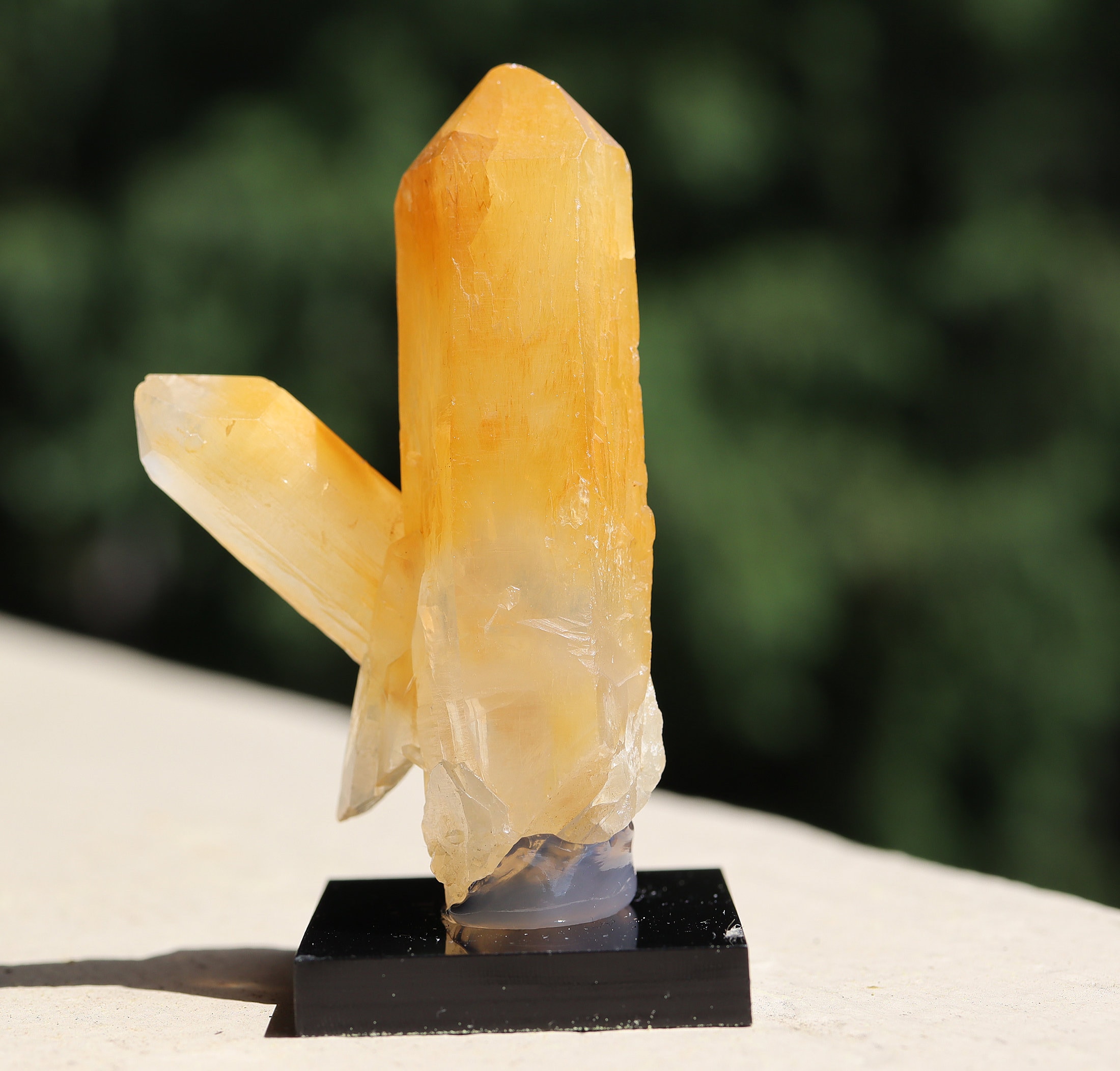 A fine Mango quartz, Halloysite included crystal twin. The piece has intense color. Cabiche, Municipal de Quipama, Boyaca Dept., Colombia. Comes with a black base as shown