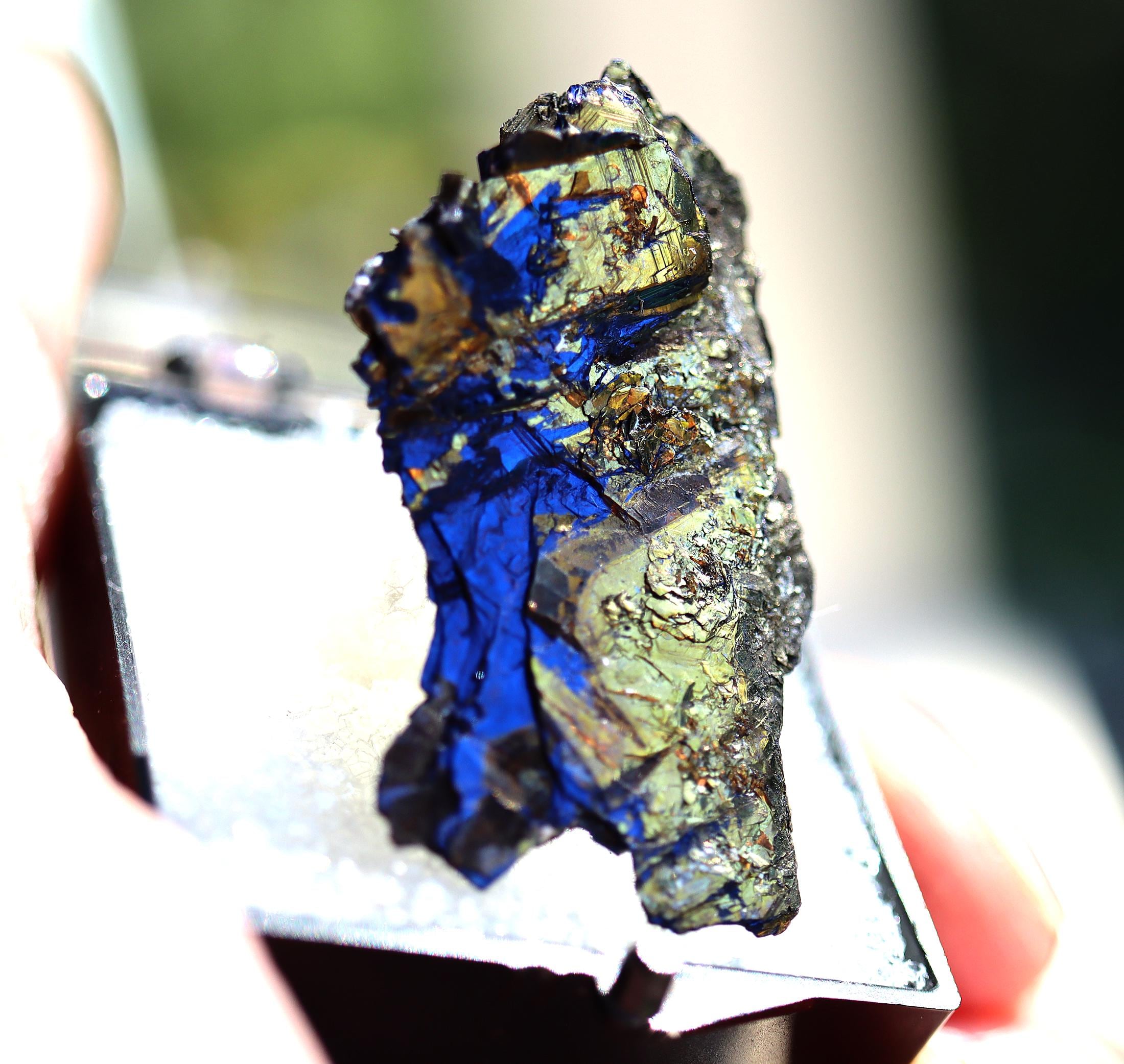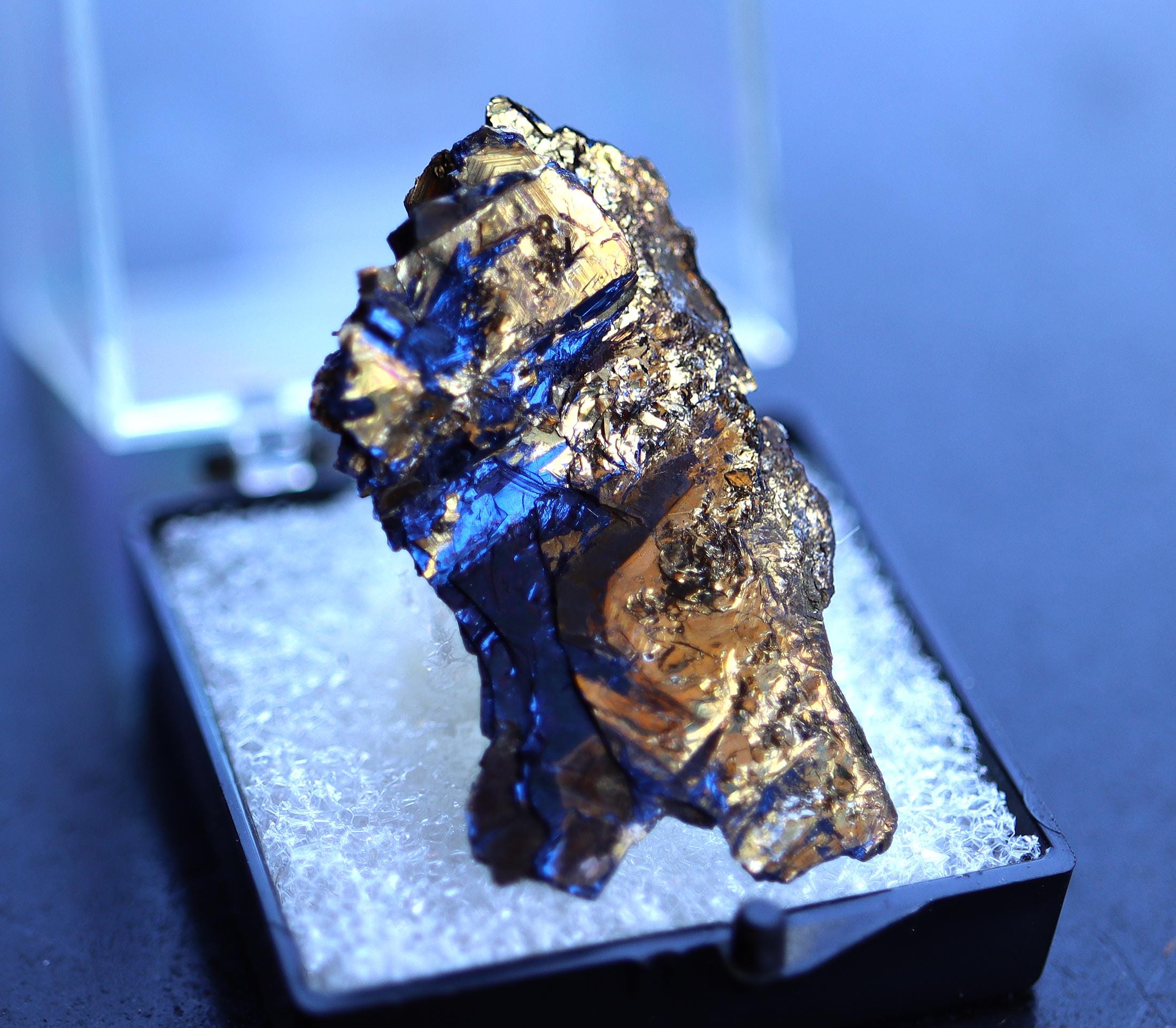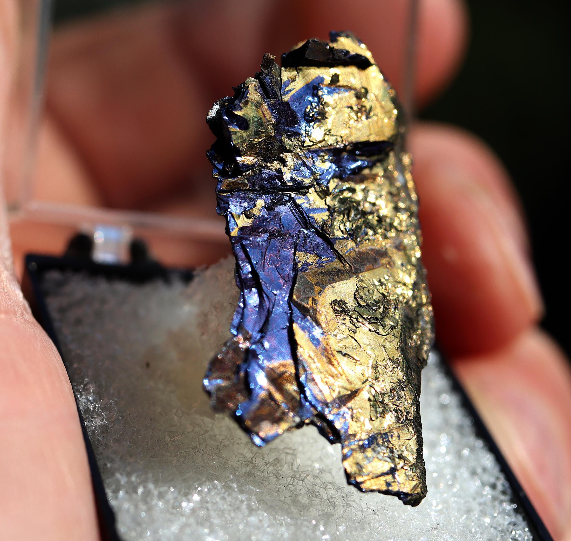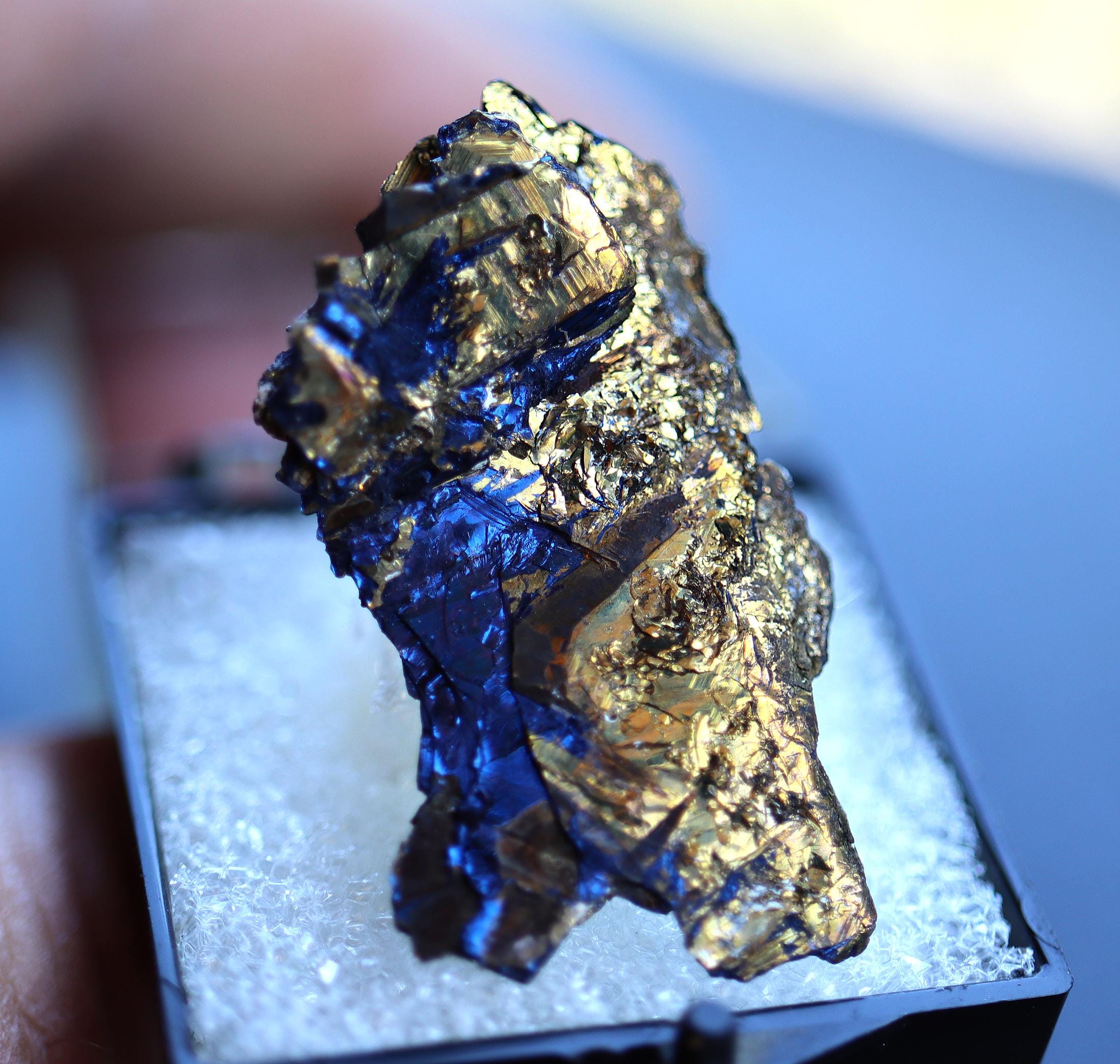Offering a large thumbnail of Chalcopyrite on Covellite. The specimen has great gold and blue color and luster in light at the correct angles. It is a long wafer specimen mounted in a perky box at an angle to get it in. 1.5 inch tall. Comes with an old Ex Scott Williams label and others. Ex Fallbrook Gem & Mineral Society. Solid specimen.