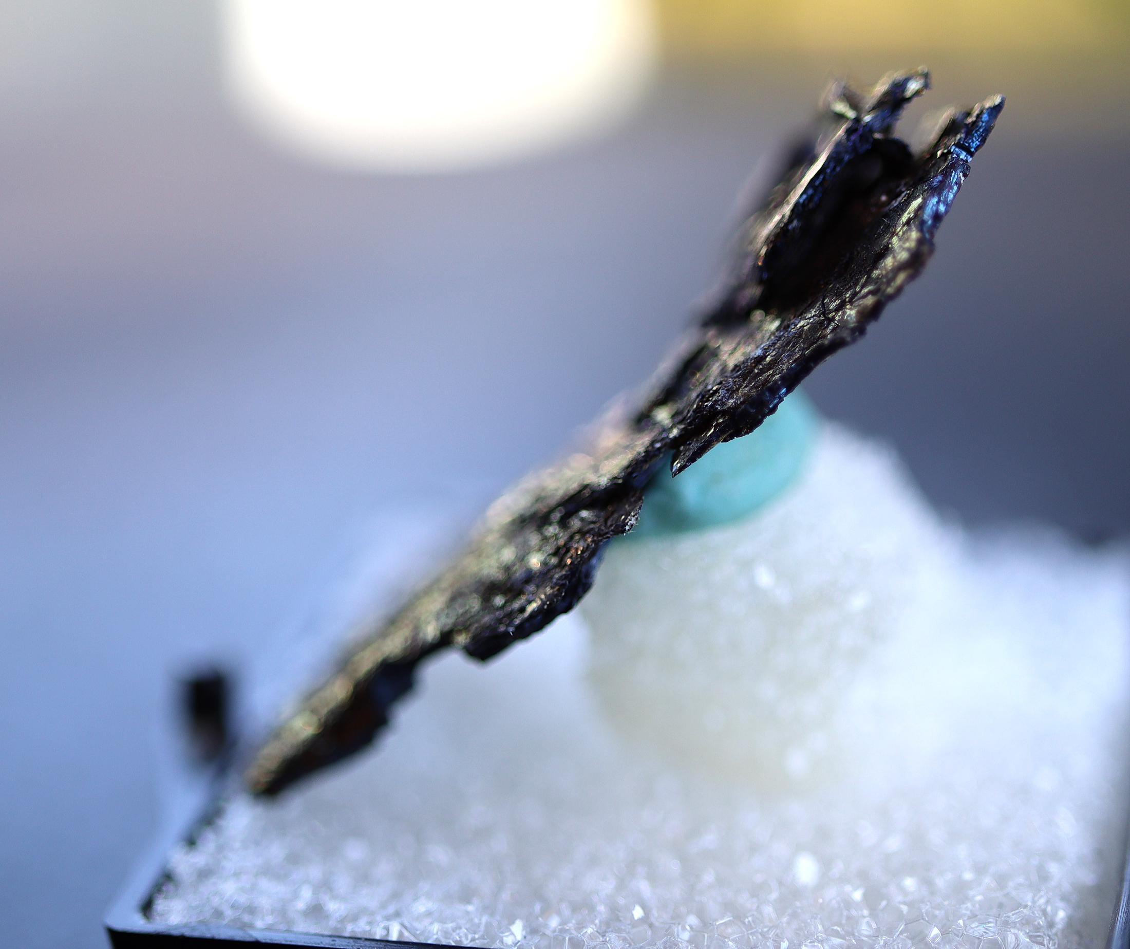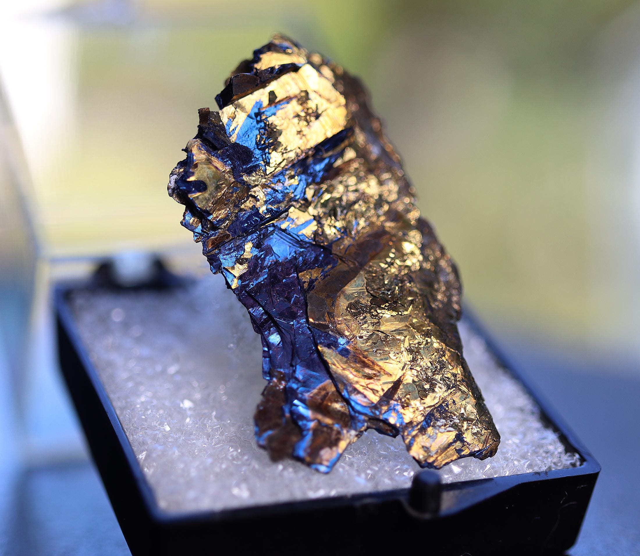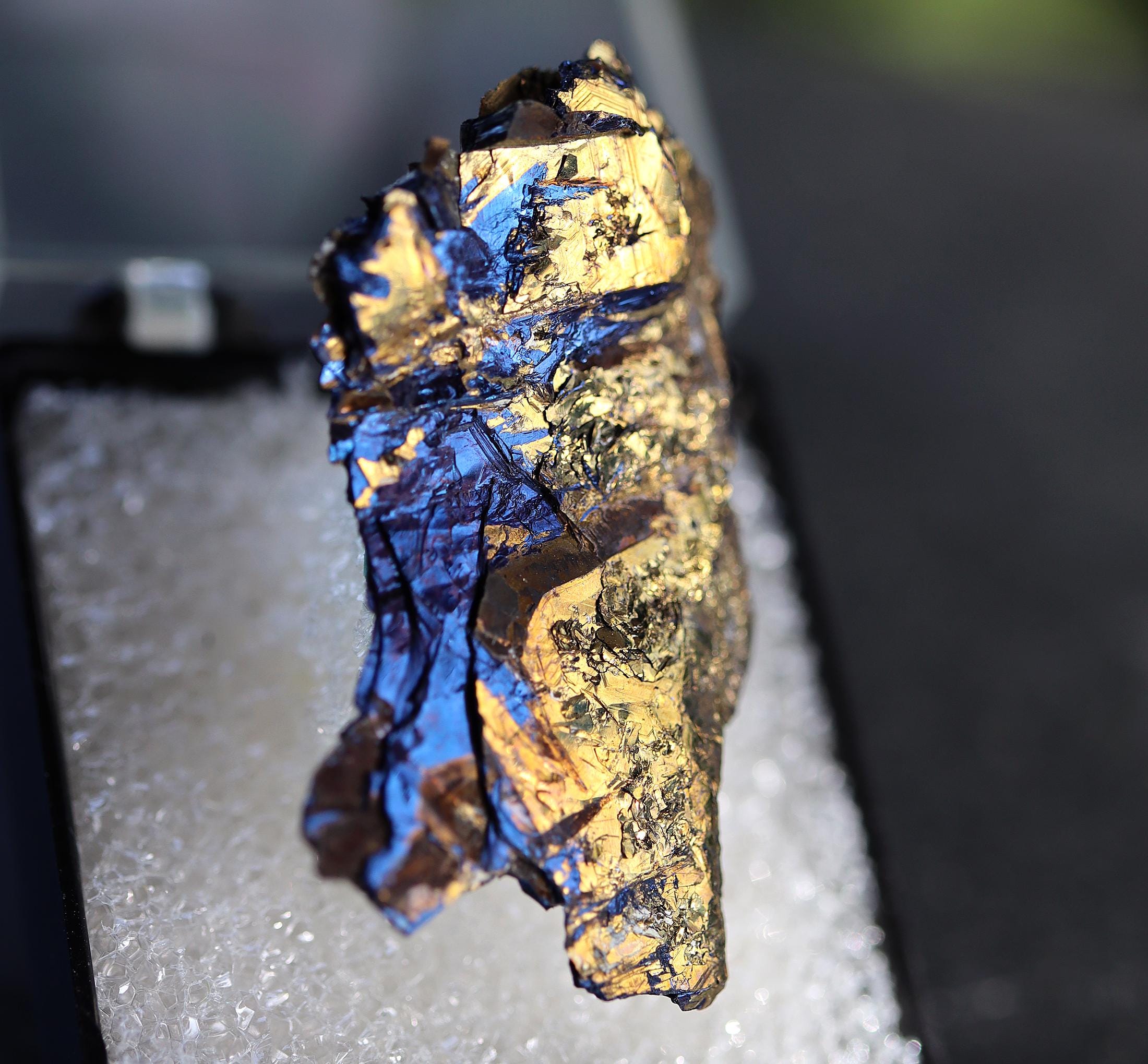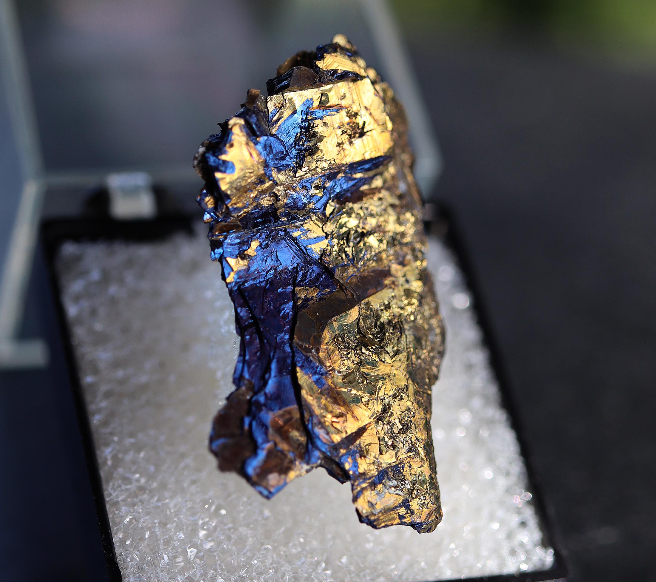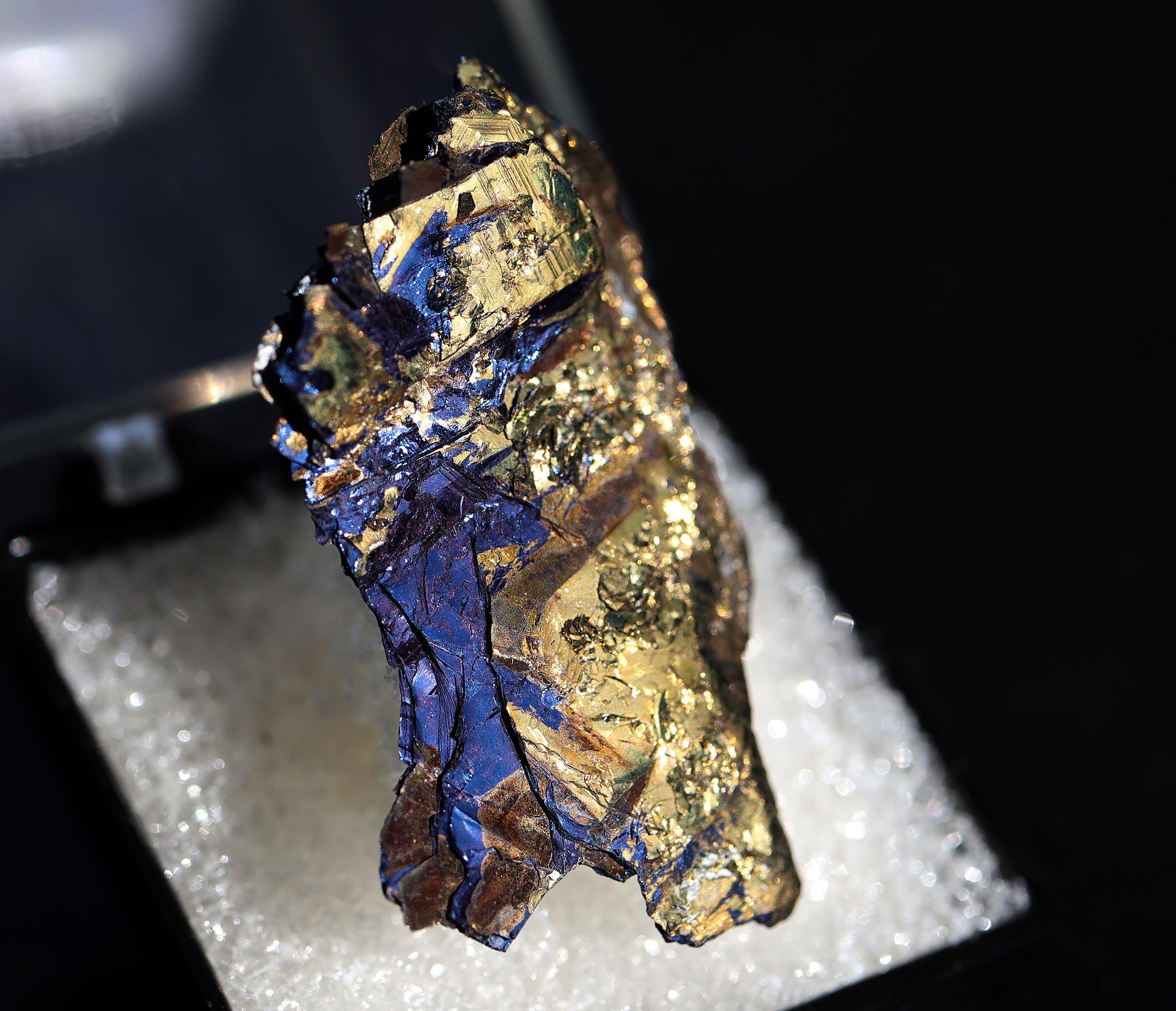 Offering a large thumbnail of Chalcopyrite on Covellite. The specimen has great gold and blue color and luster in light at the correct angles. It is a long wafer specimen mounted in a perky box at an angle to get it in. 1.5 inch tall. Comes with an old Ex Scott Williams label and others. Ex Fallbrook Gem & Mineral Society. Solid specimen.