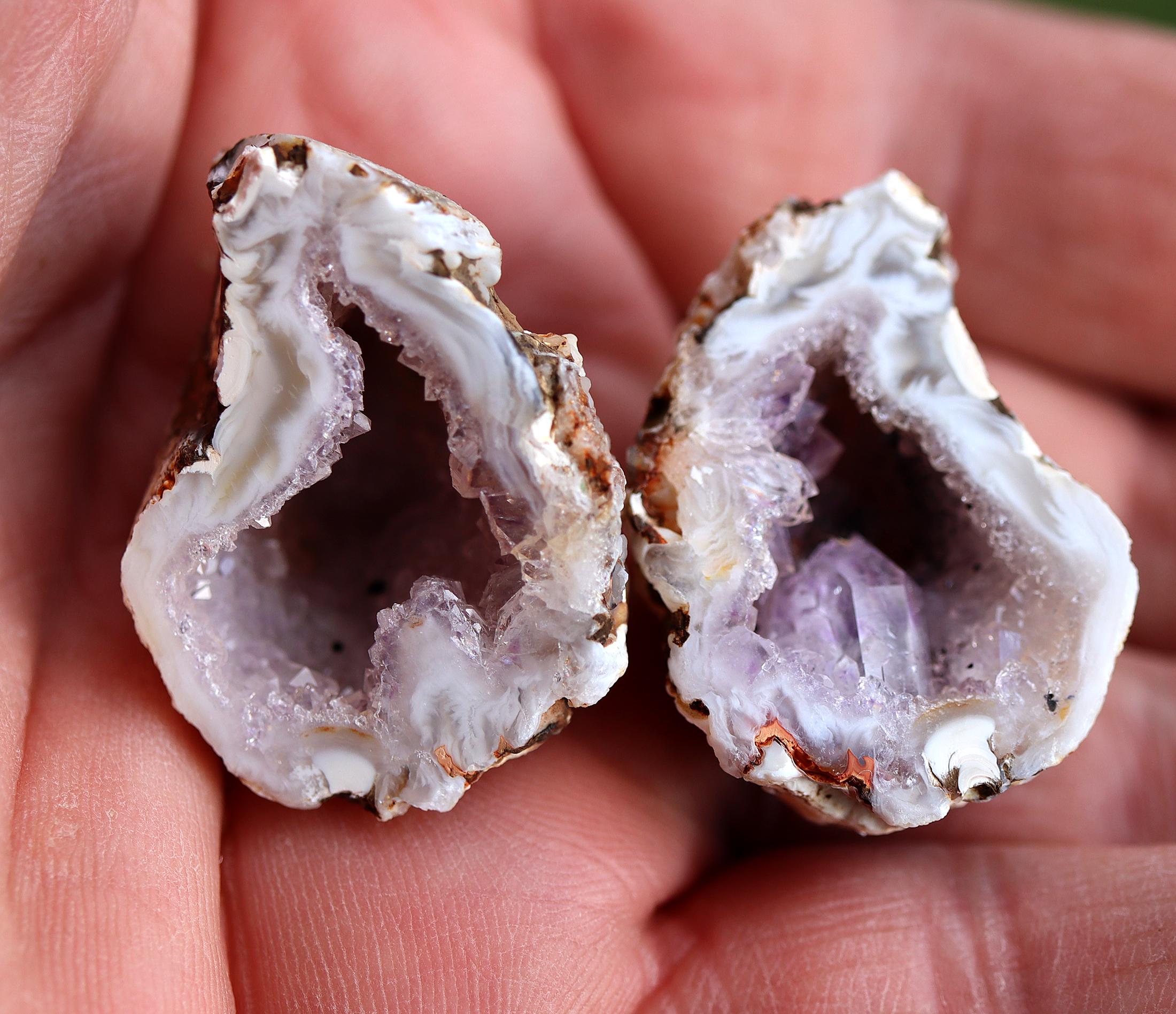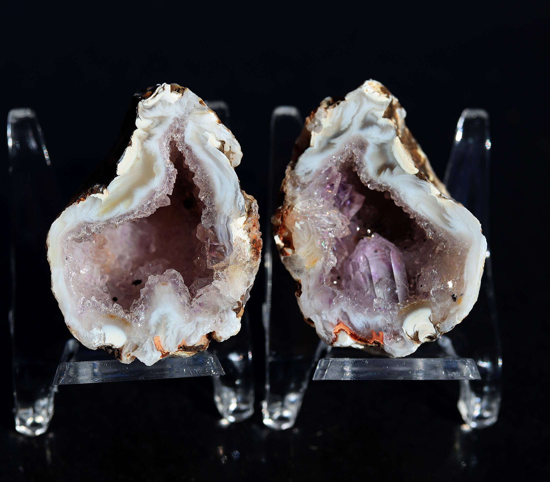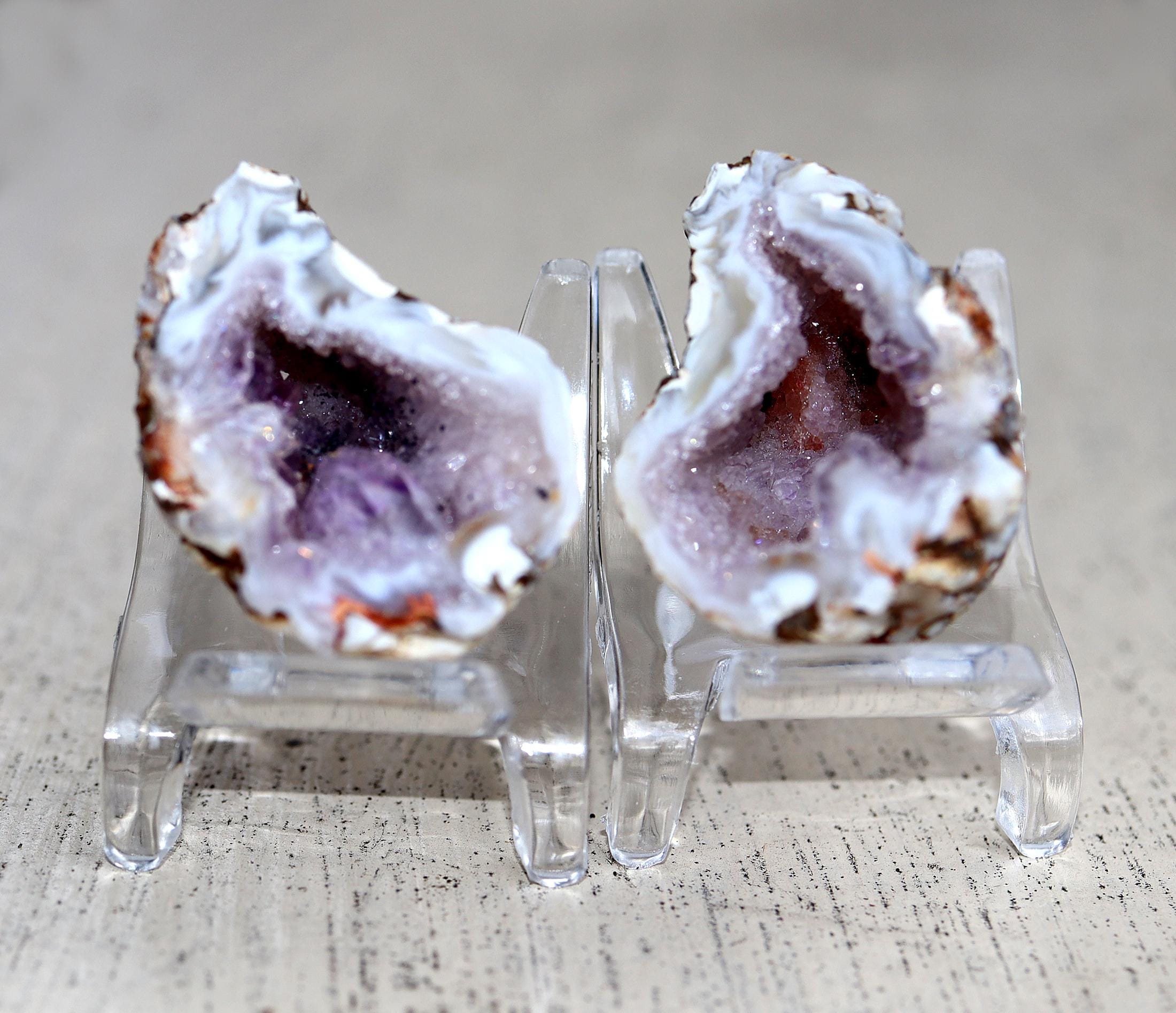 Tabasco geodes, also known as Illianites, are the smallest geode formation in the world. They are found in basalt flows near the town of Tabasco, Zacatecas, Mexico. 1 3/8 inch each. Note the perfect crystal amethyst quartz point that formed inside the geode. Sold as a matched pair as shown that have been cut in half and polished to reveal the crystal cave inside. Stands included.