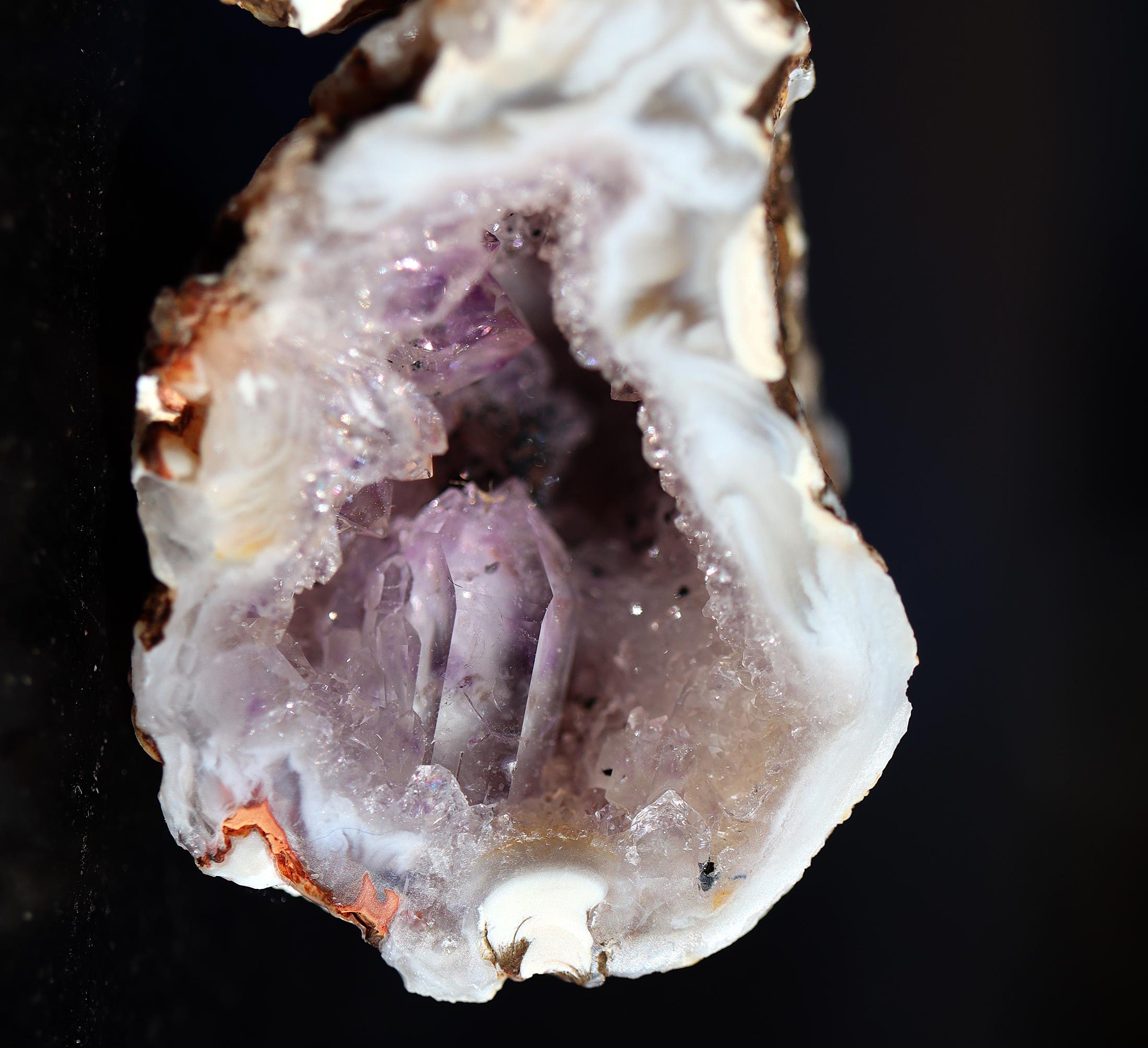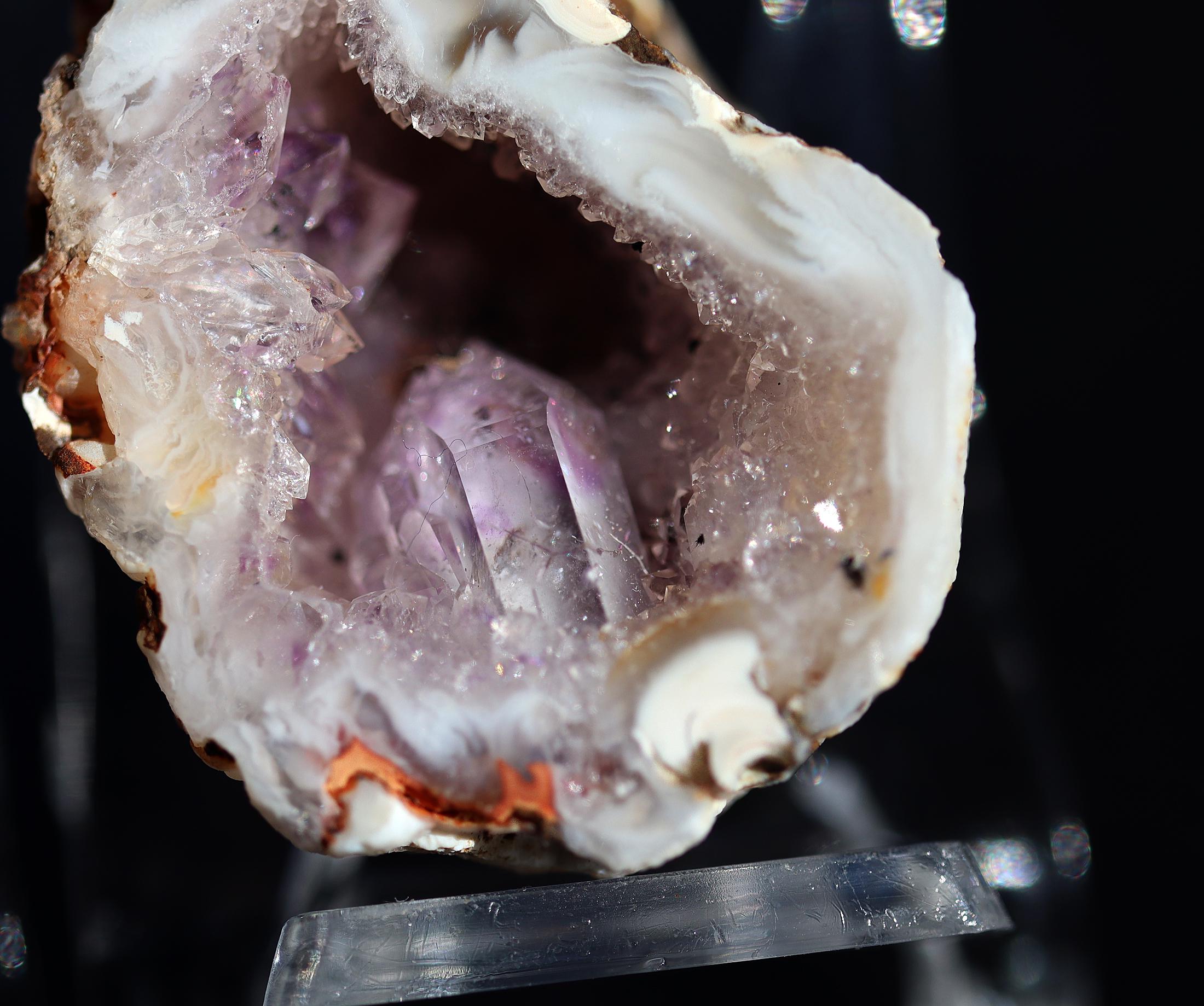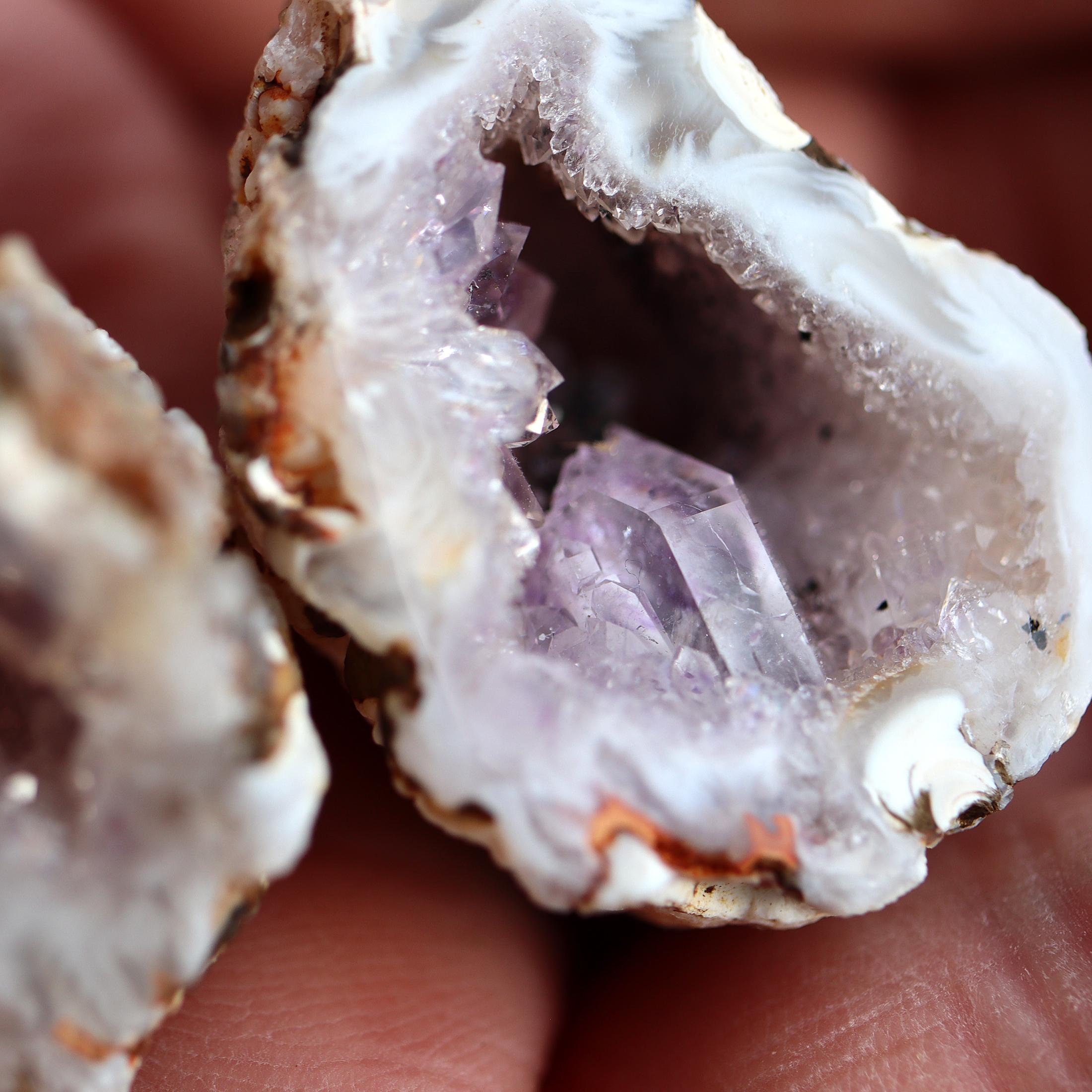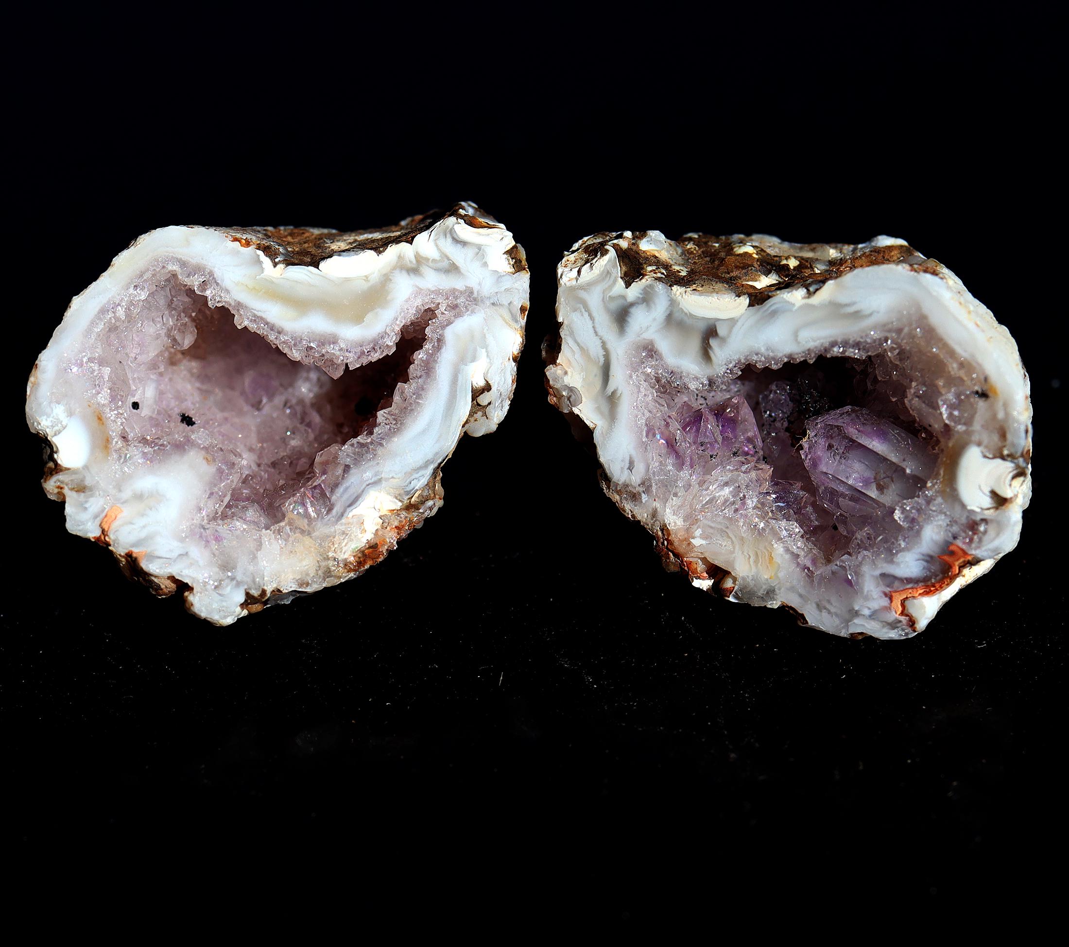 Tabasco geodes, also known as Illianites, are the smallest geode formation in the world. They are found in basalt flows near the town of Tabasco, Zacatecas, Mexico. 1 3/8 inch each. Note the perfect crystal amethyst quartz point that formed inside the geode. Sold as a matched pair as shown that have been cut in half and polished to reveal the crystal cave inside. Stands included.
