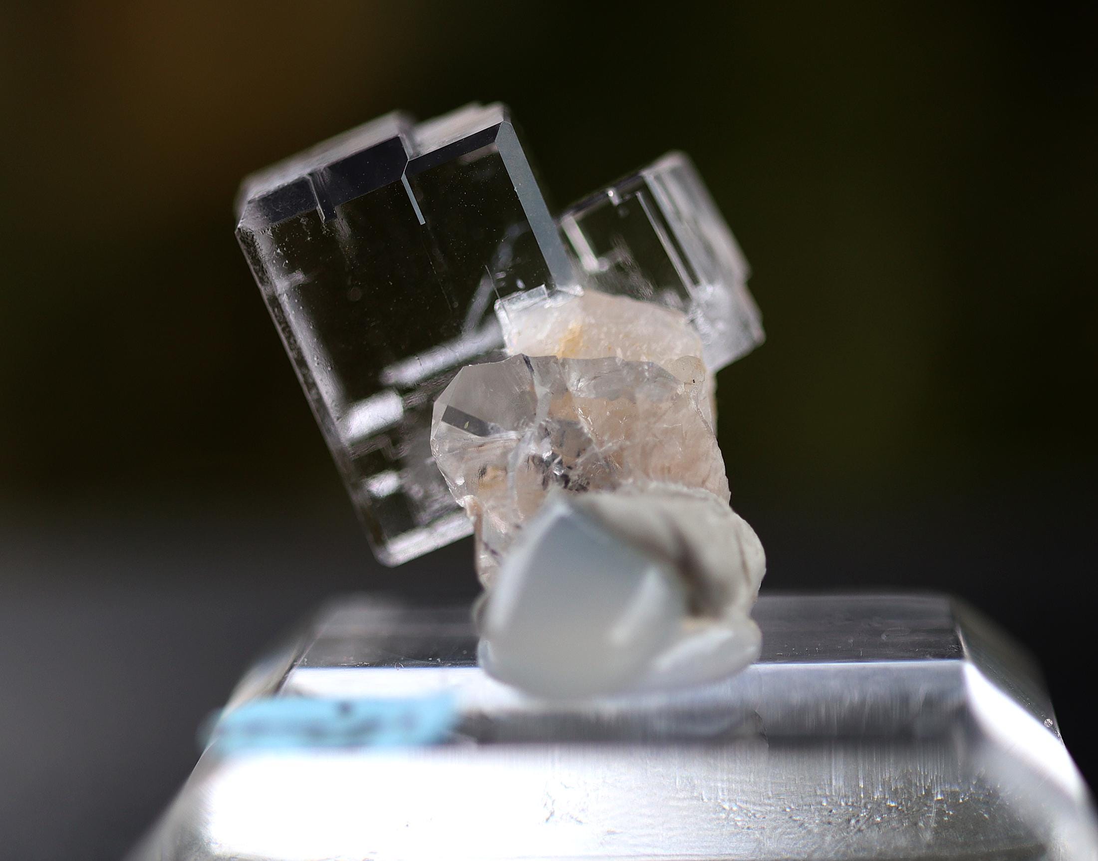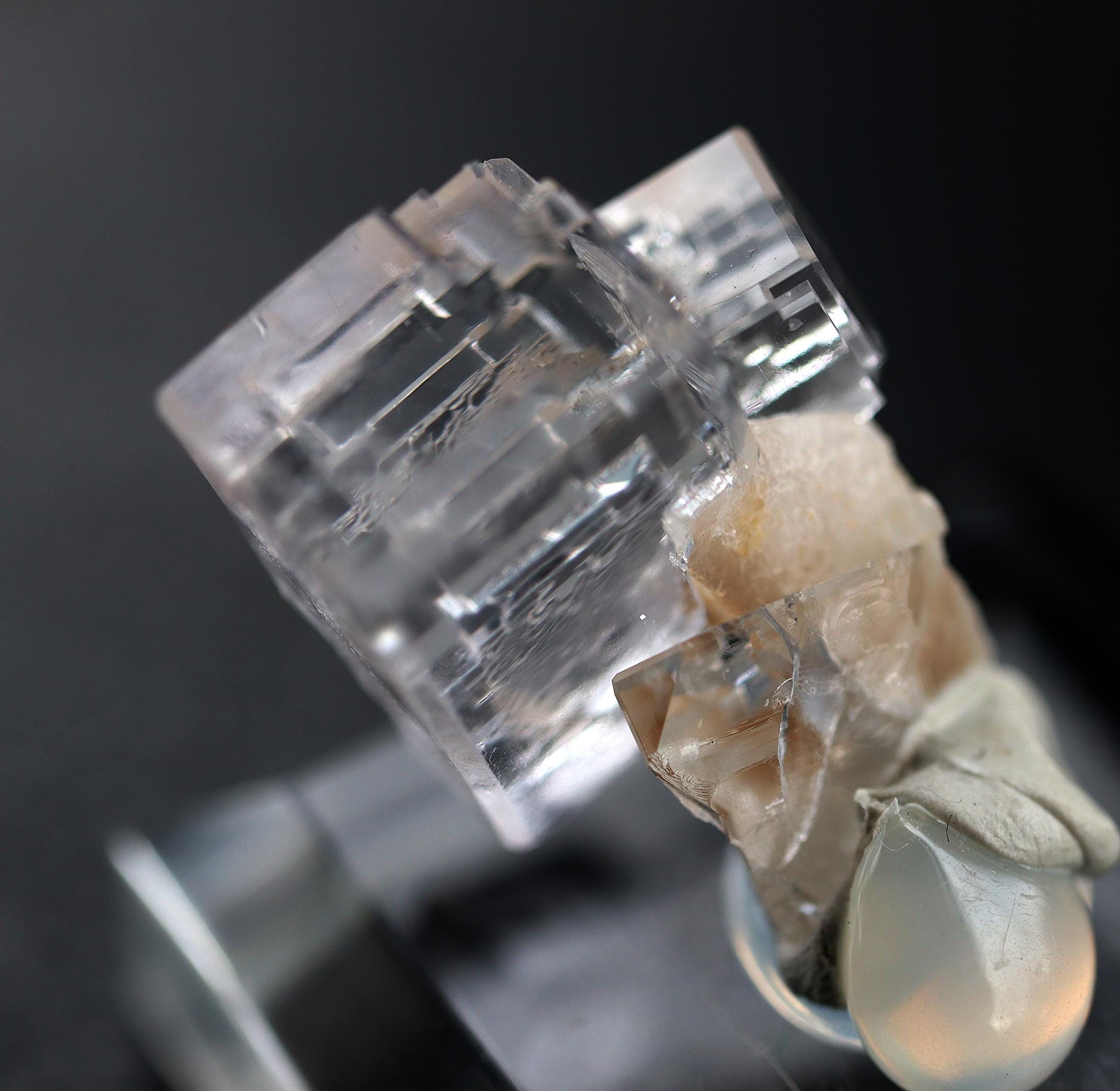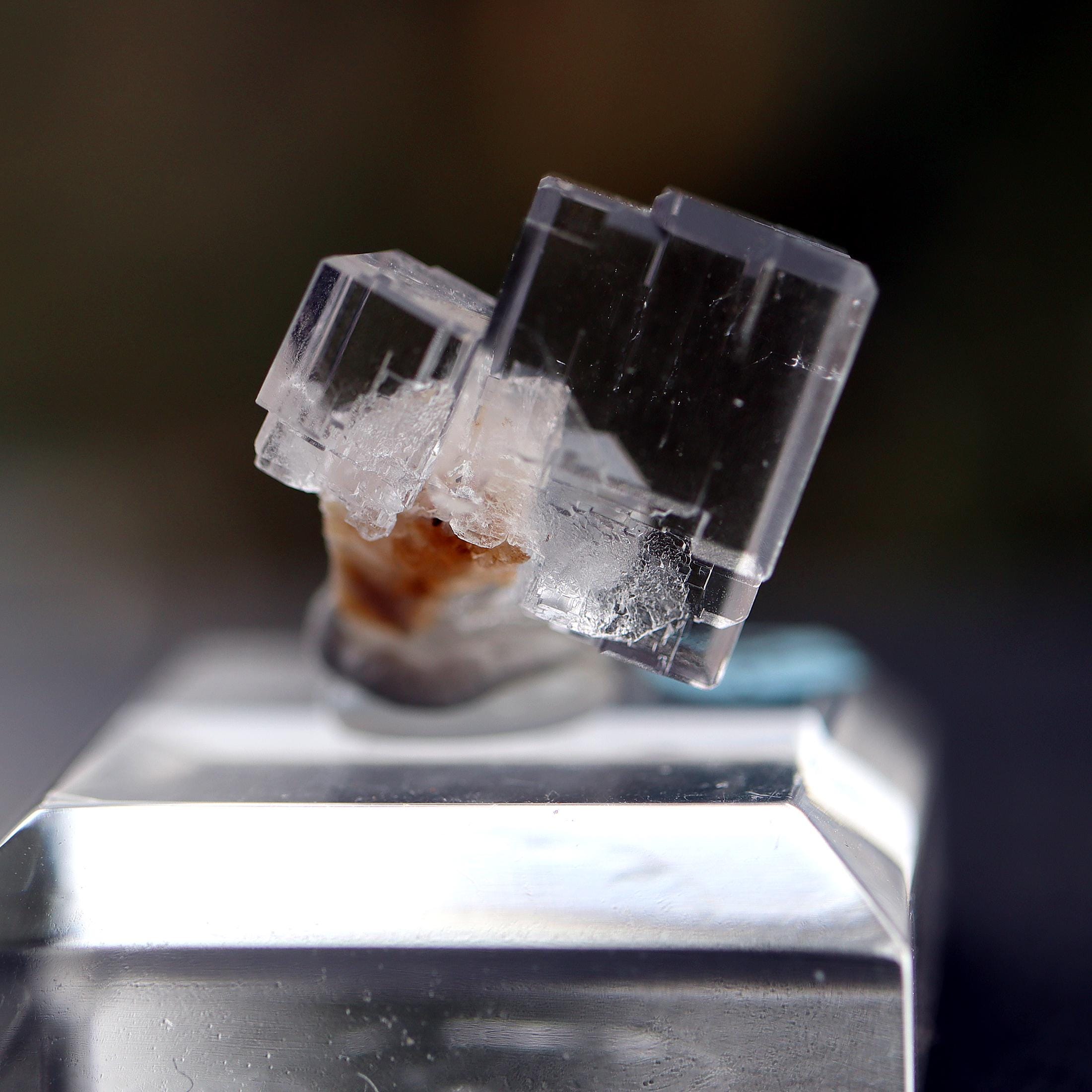 Offering a aesthetic ice clear stepped Fluorite cube with a bit of calcite. This is a thumbnail on a Lucite base and is in excellent condition. All edges on the cubes damage free. Ex Philip Phillips collection. No. 1604. I am working on getting his hand note card on this piece and will send it along when I receive it from my friend whom is traveling. I have the specimen. 25 mm tall. Mined Llamas Quarry, Asturias, Spain.