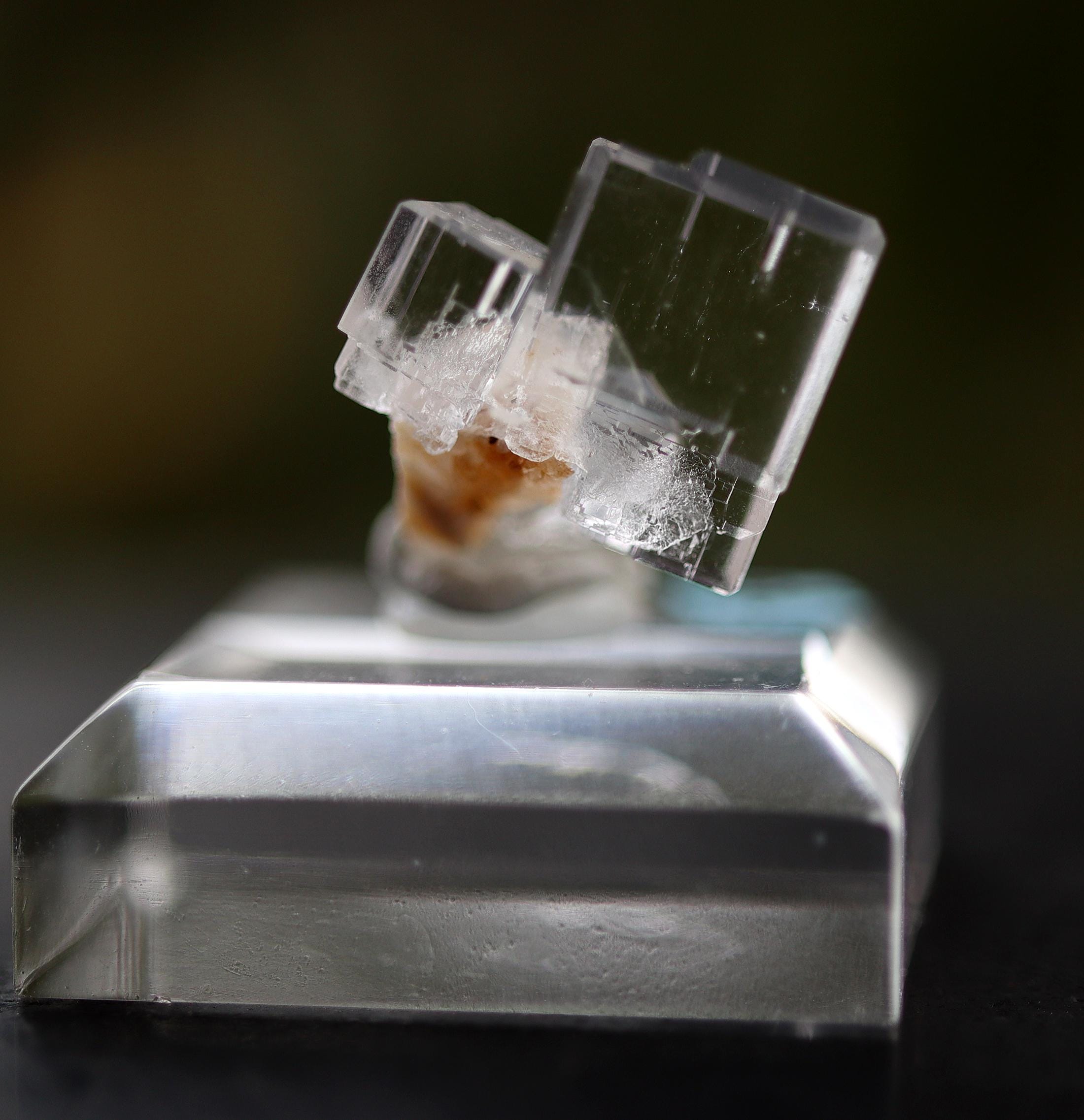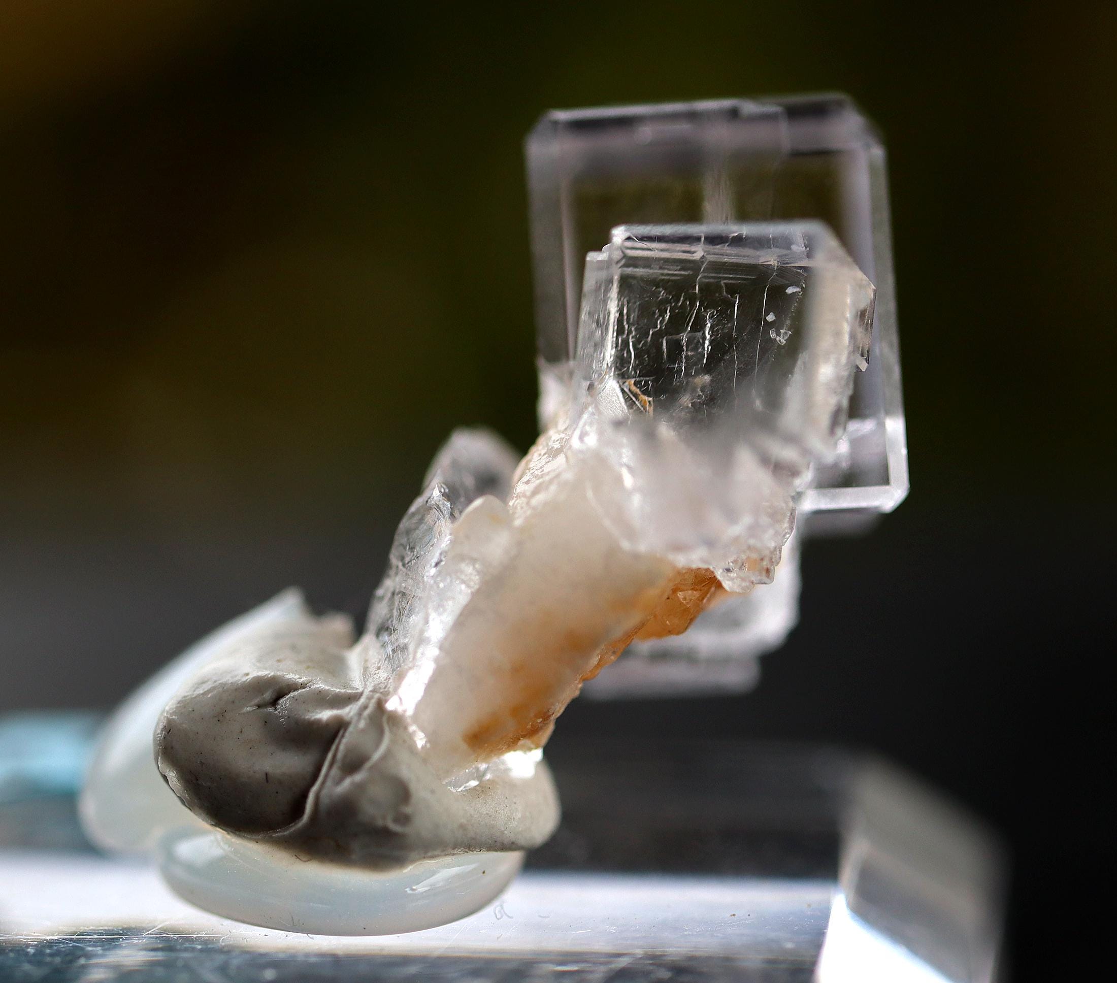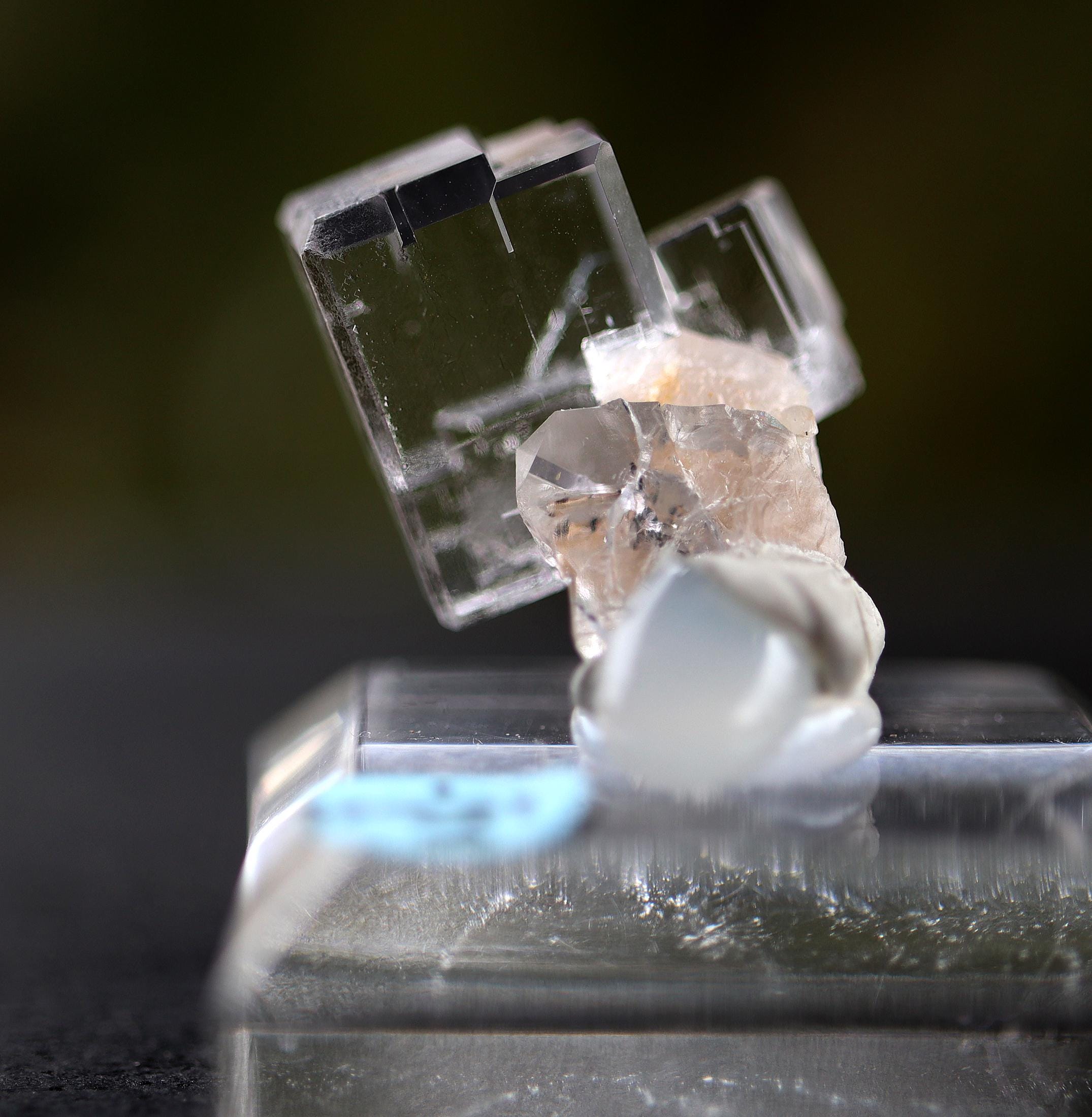 Offering a aesthetic ice clear stepped Fluorite cube with a bit of calcite. This is a thumbnail on a Lucite base and is in excellent condition. All edges on the cubes damage free. Ex Philip Phillips collection. No. 1604. I am working on getting his hand note card on this piece and will send it along when I receive it from my friend whom is traveling. I have the specimen. 25 mm tall. Mined Llamas Quarry, Asturias, Spain.