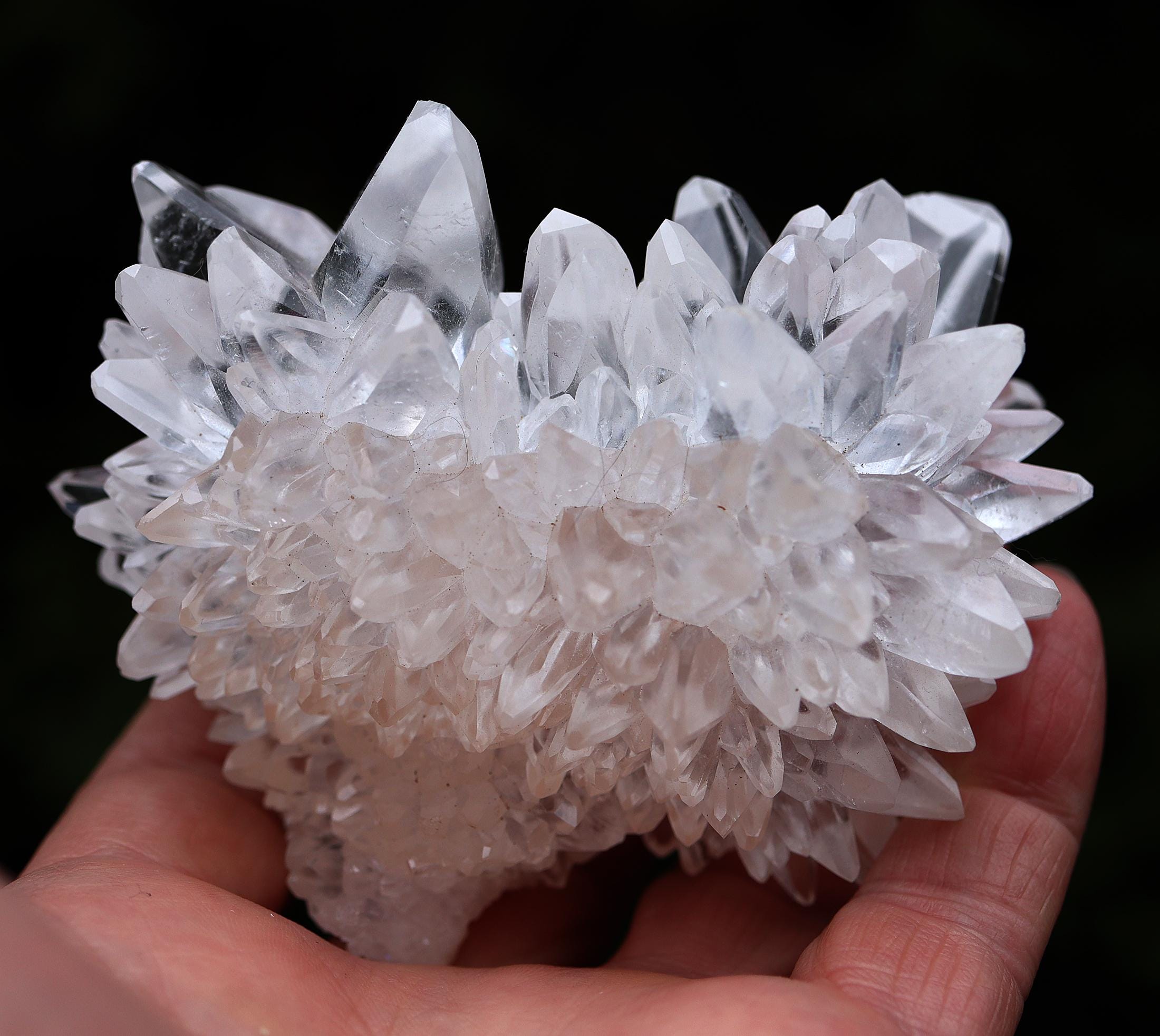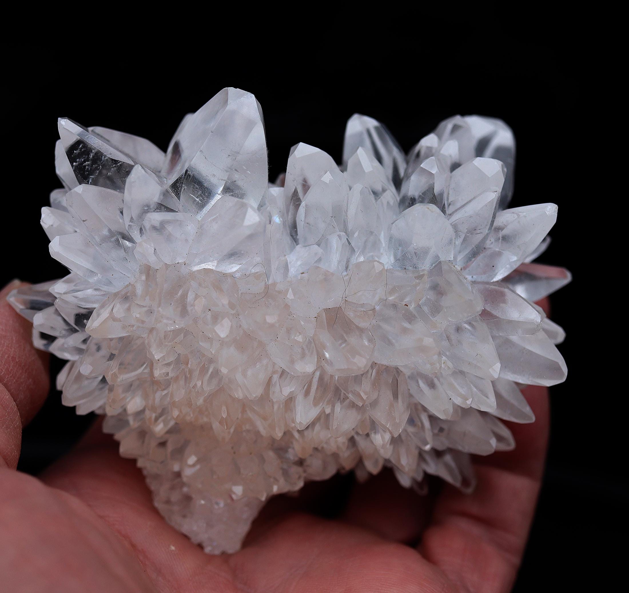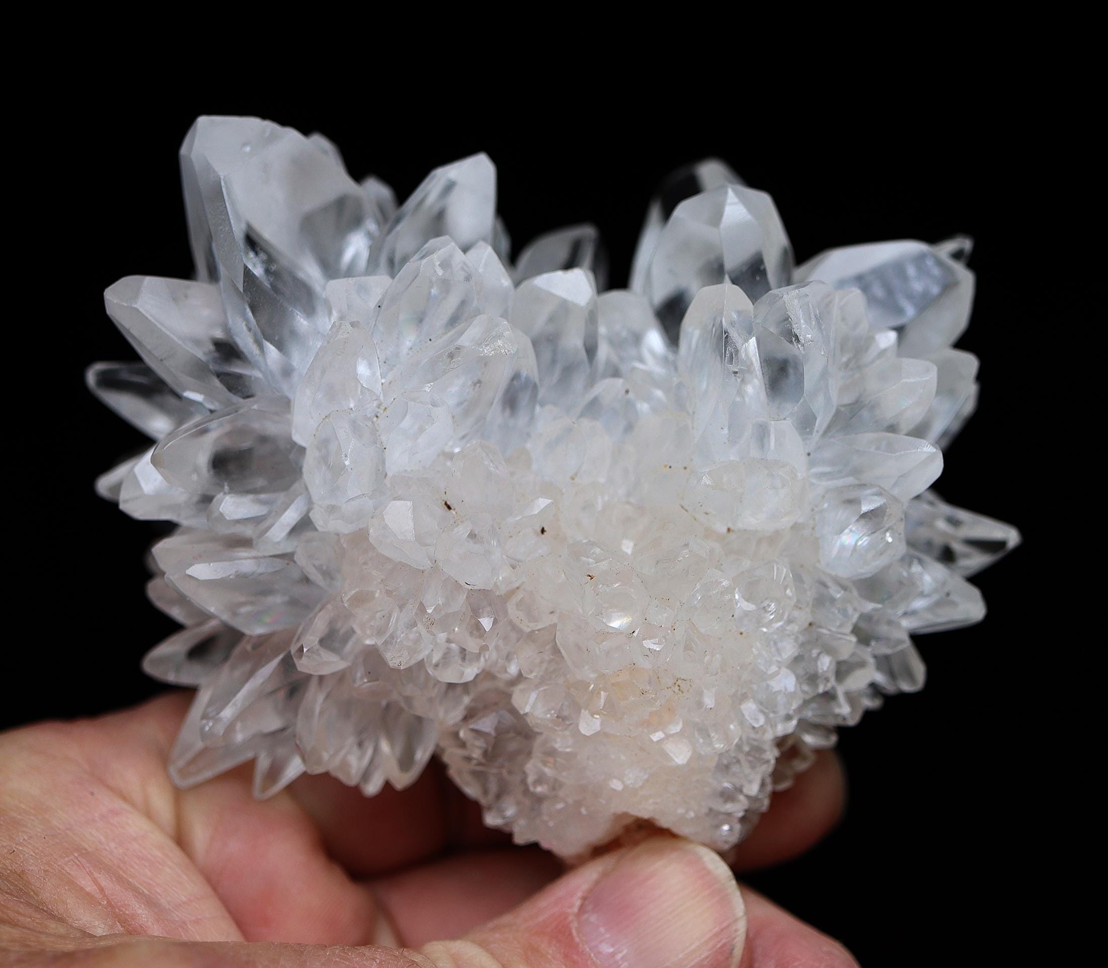 Offering a gem calcite flower. Shows all around and in pristine condition. This is from a recent find and we have the best one of the lot. Amazingly clear calcite points with a slightly yellowish color. One detach tiny area at the bottom otherwise this is a near floater. Nothing broken. Mined Obi Island, Indonesia. 3.75 inch across. Small cabinet. It fills your hand. Not a low end piece. USA sale only