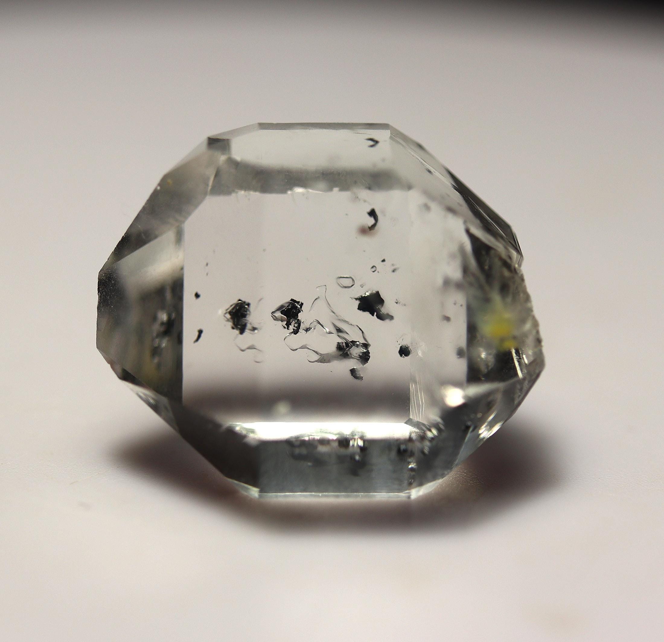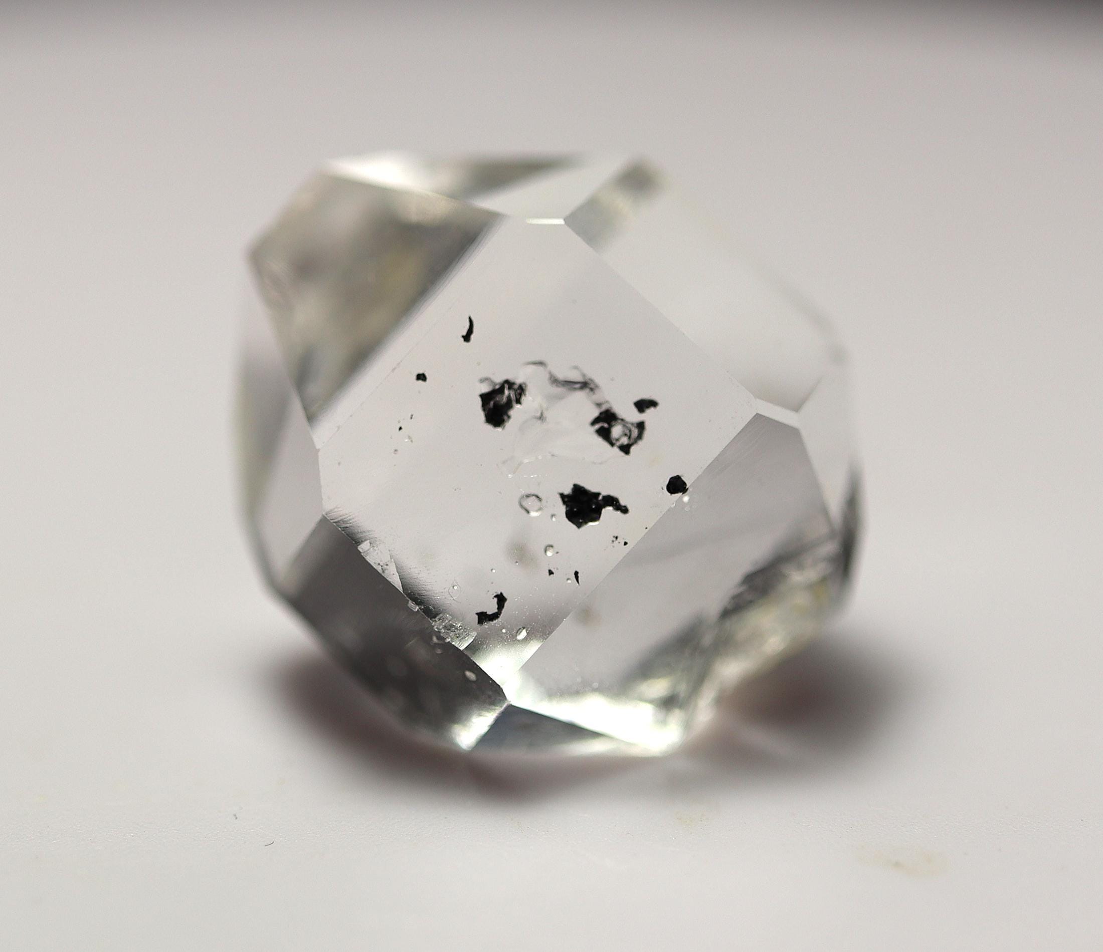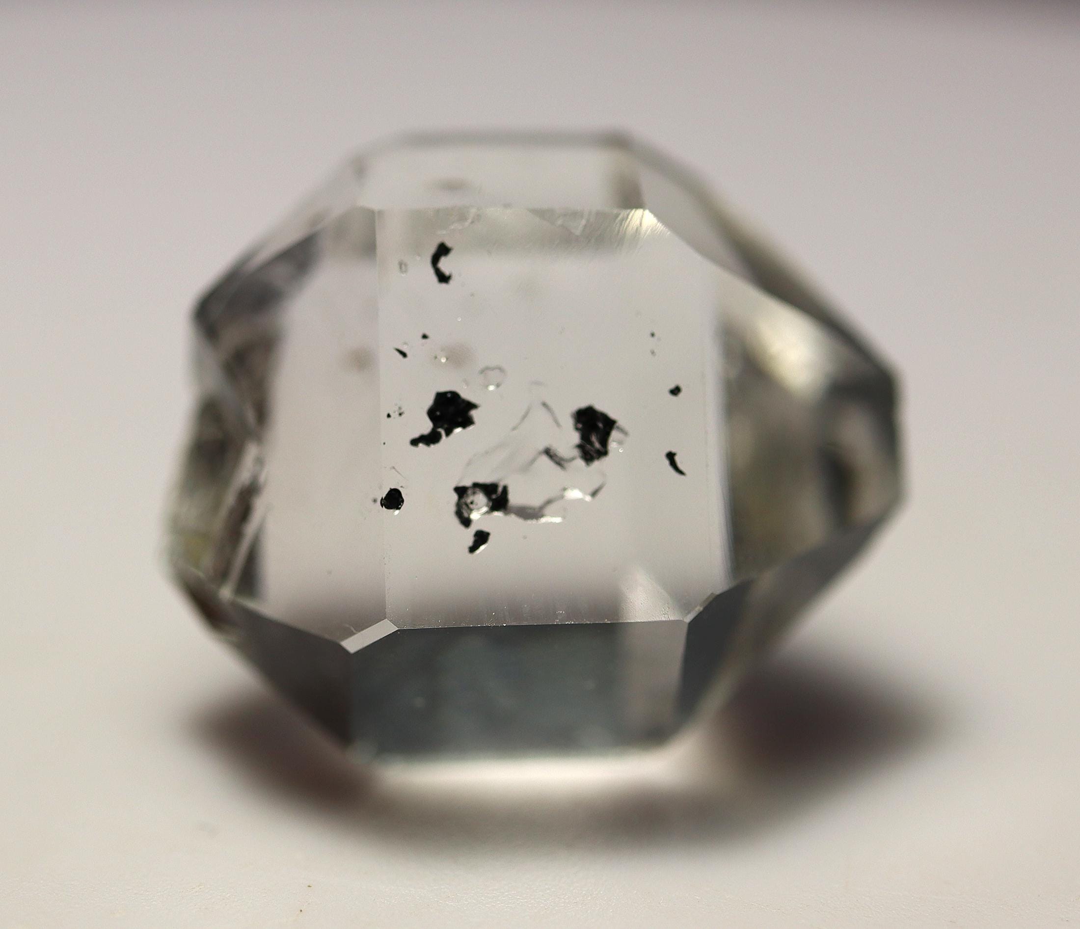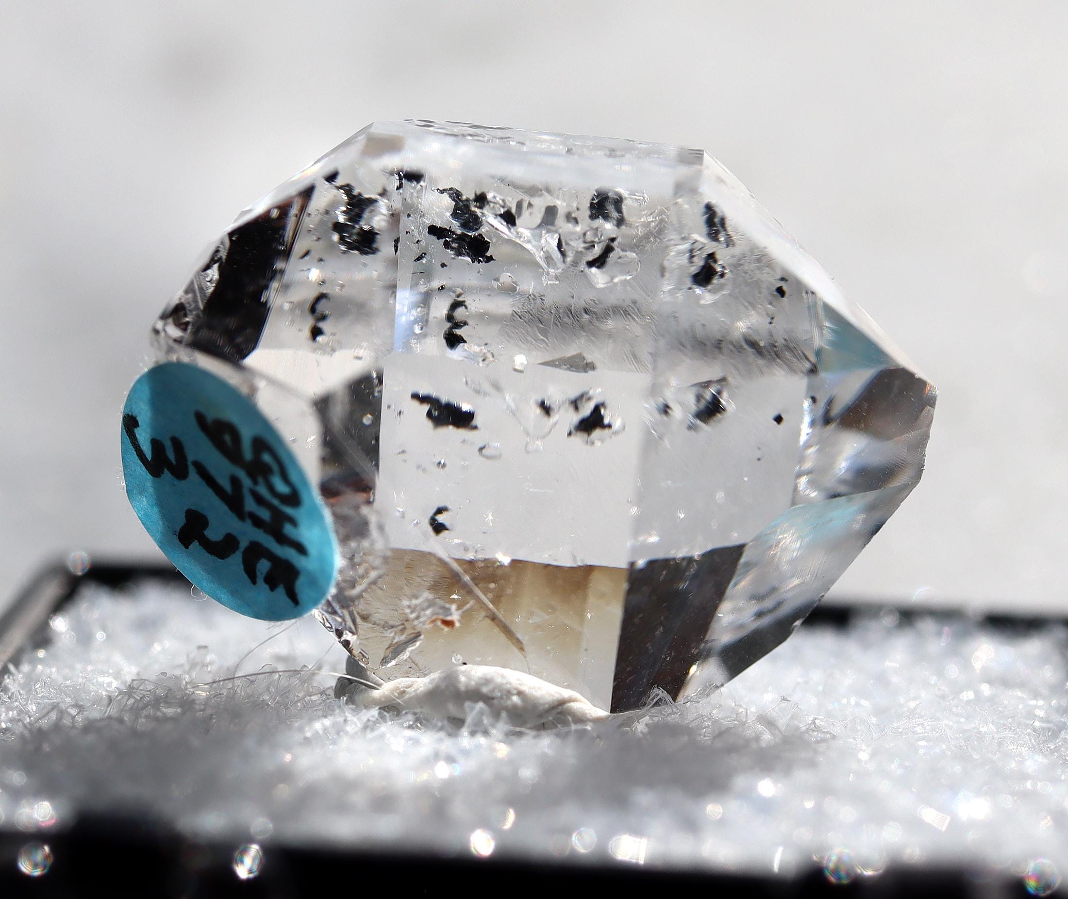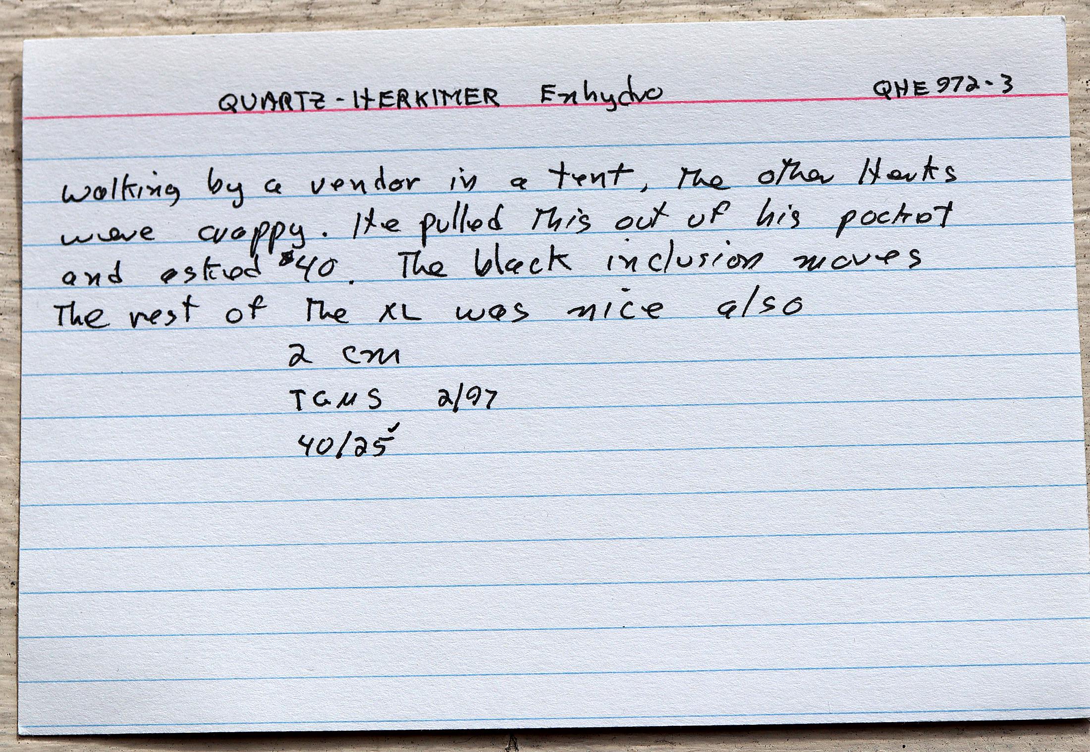 As noted: Enhydro Herkimer Diamond Quartz, Middleville, Herkimer Co., New York. Ex Philip Phillips collection. Hand notes included. Acquired Tucson, TGMS 2/14/97. Under magnification I see a bubble or two which are stationary. Mr. Phillips notes The black inclusion moves but my eyes are too old to see that. See his written note on QHE972-3. 2 cm