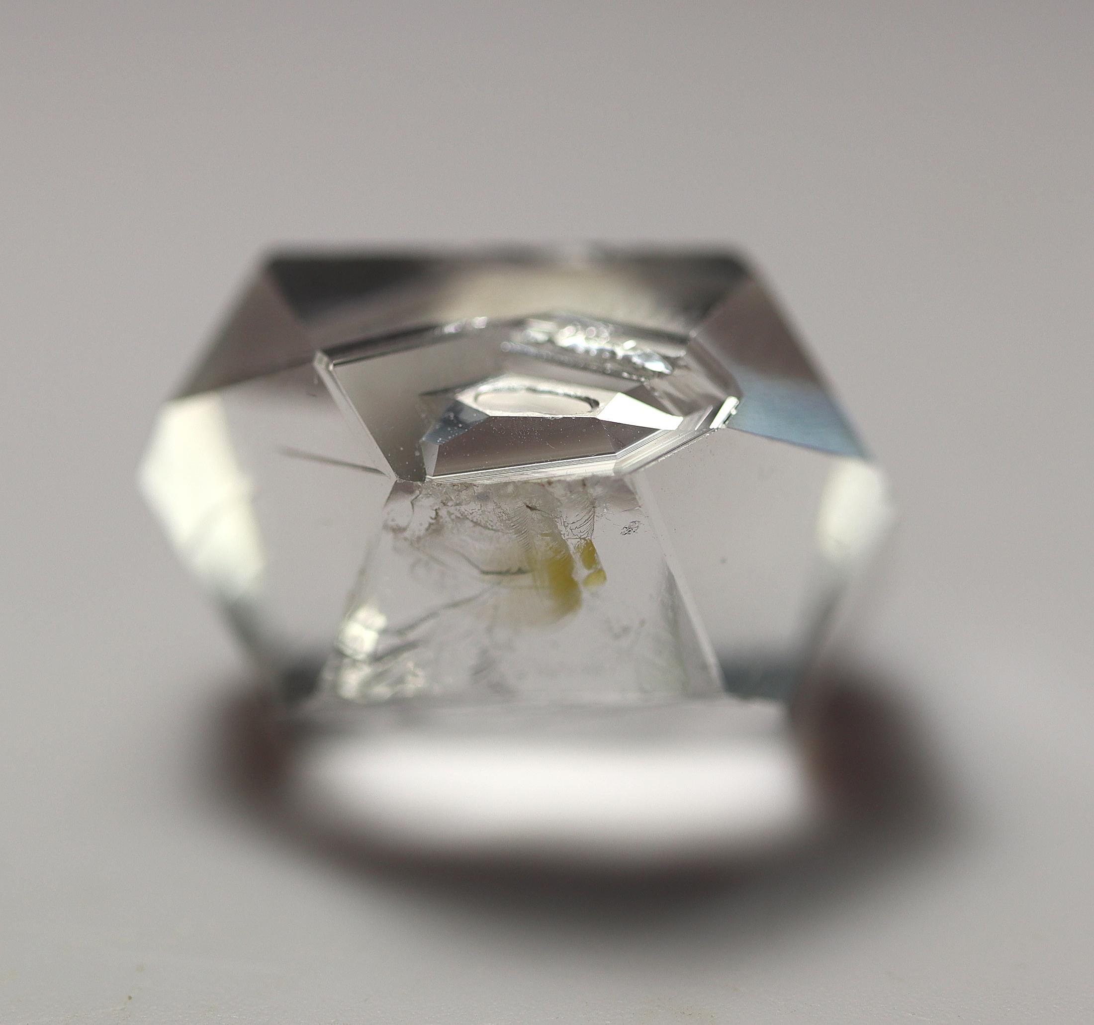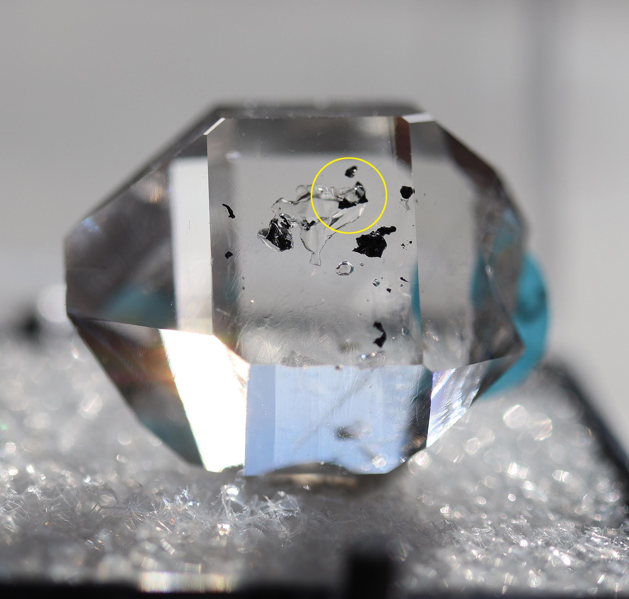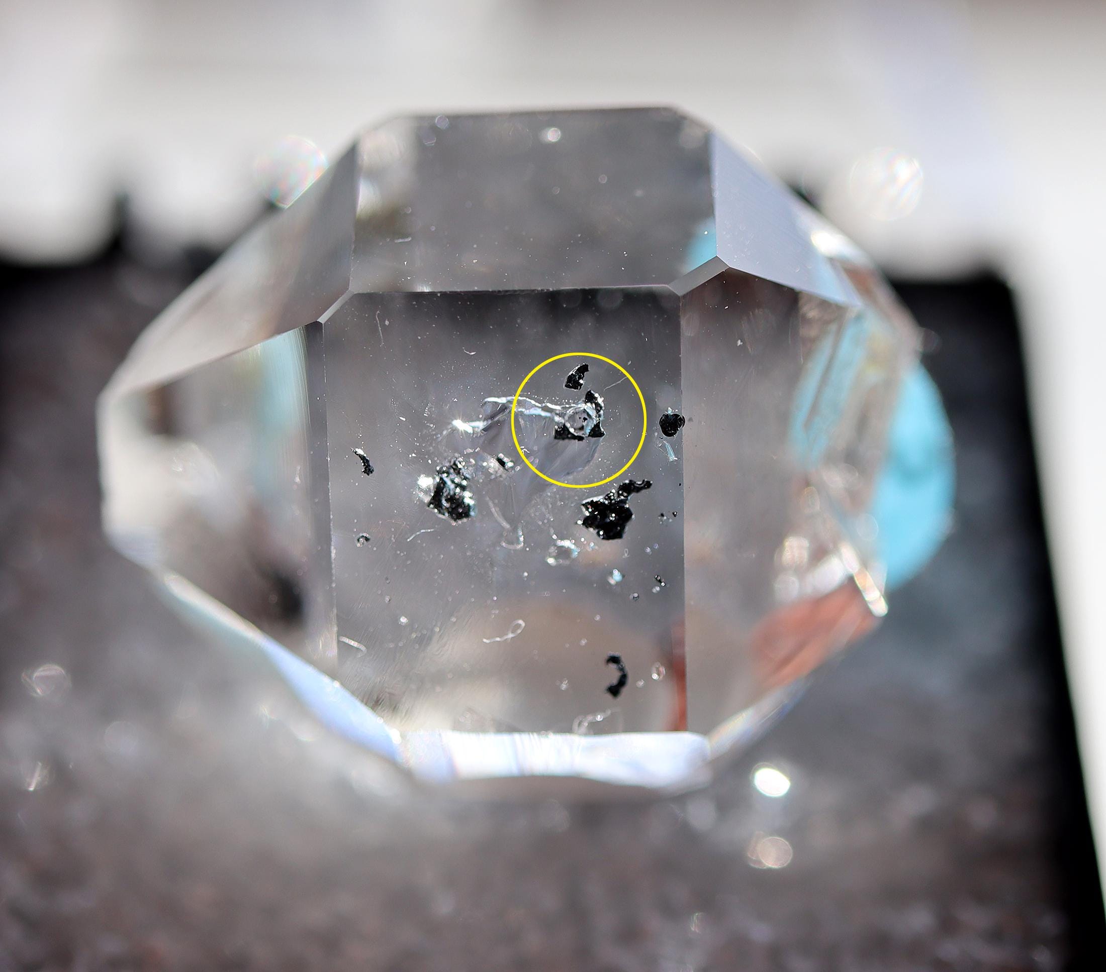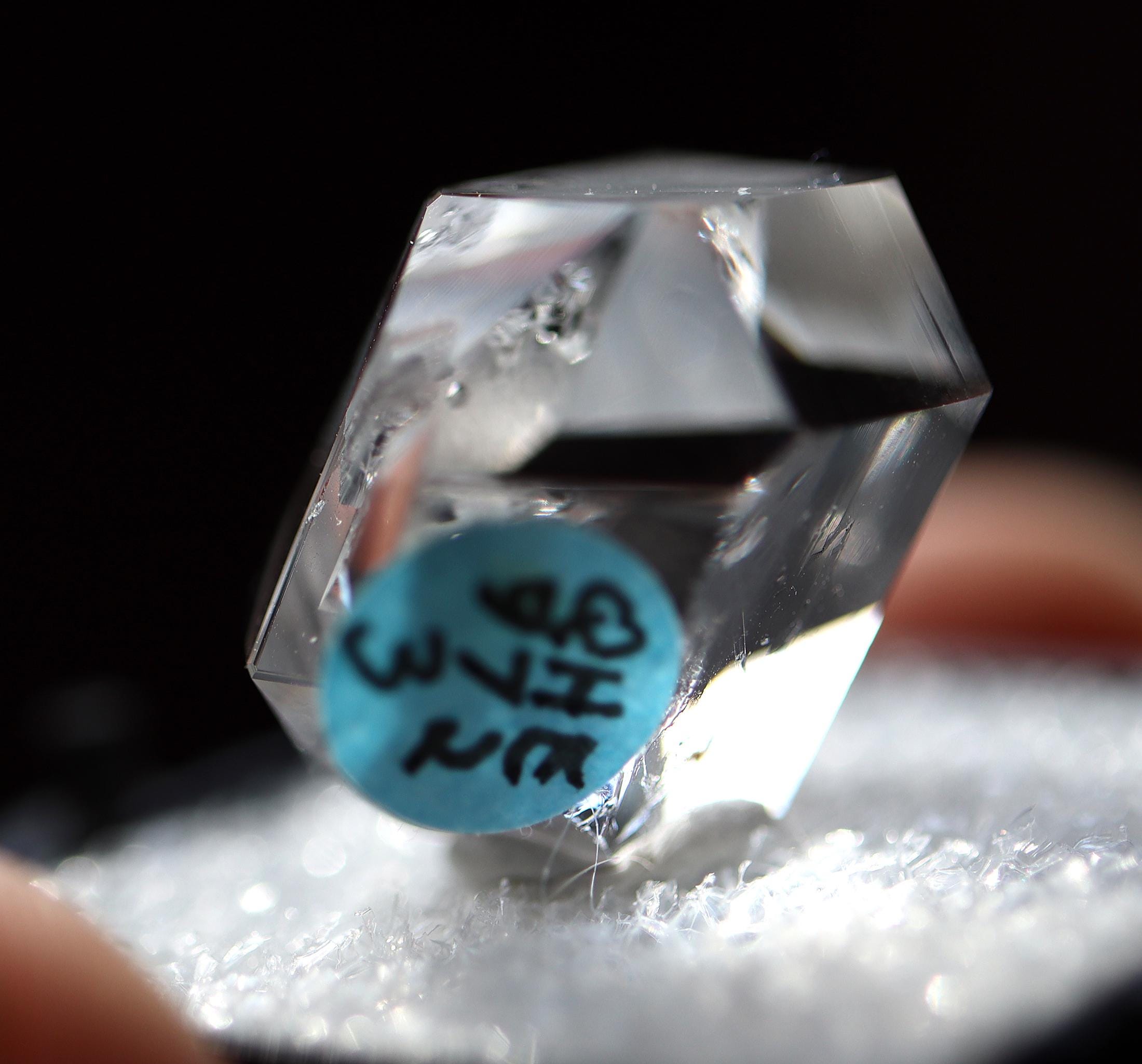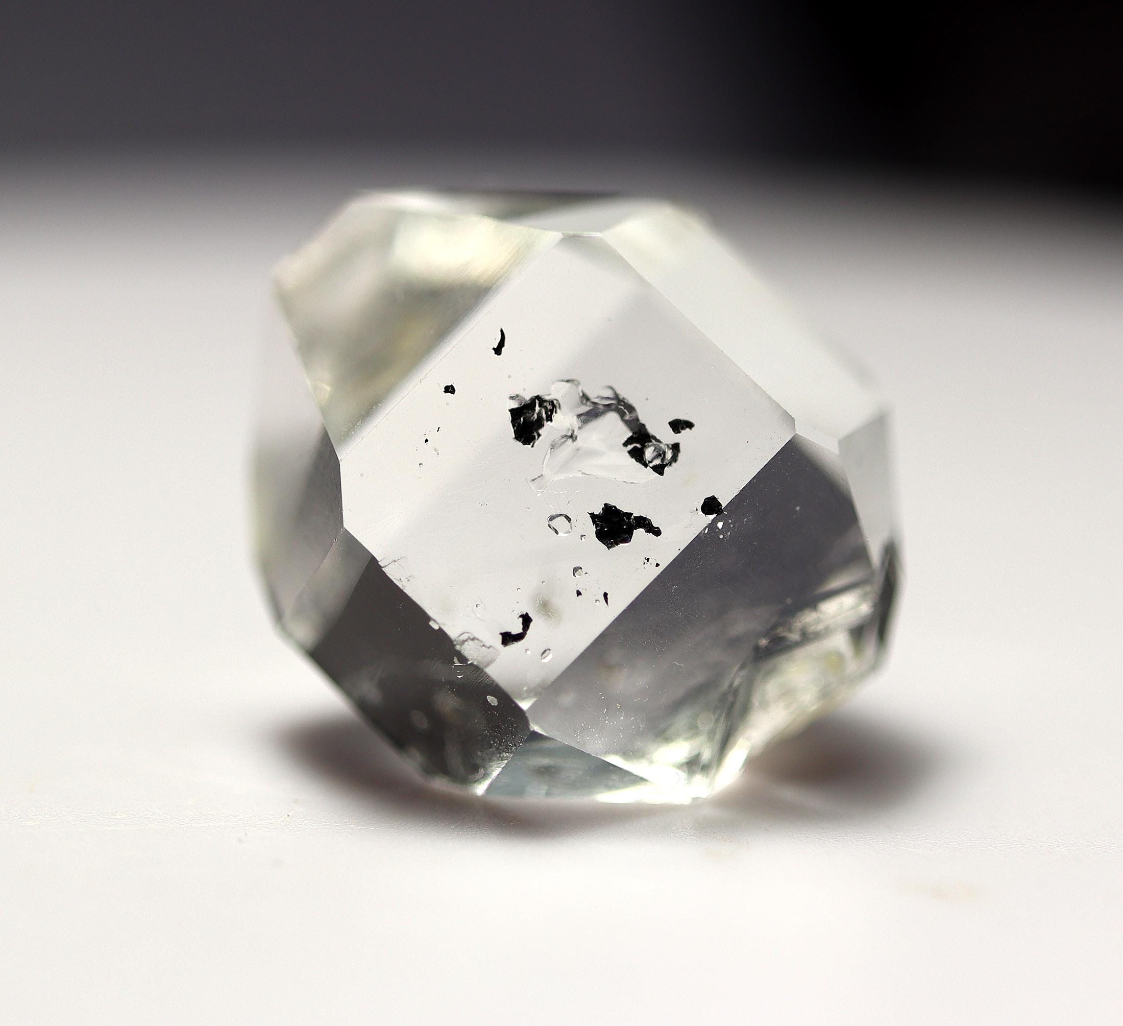 As noted: Enhydro Herkimer Diamond Quartz, Middleville, Herkimer Co., New York. Ex Philip Phillips collection. Hand notes included. Acquired Tucson, TGMS 2/14/97. Under magnification I see a bubble or two which are stationary. Mr. Phillips notes The black inclusion moves but my eyes are too old to see that. See his written note on QHE972-3. 2 cm