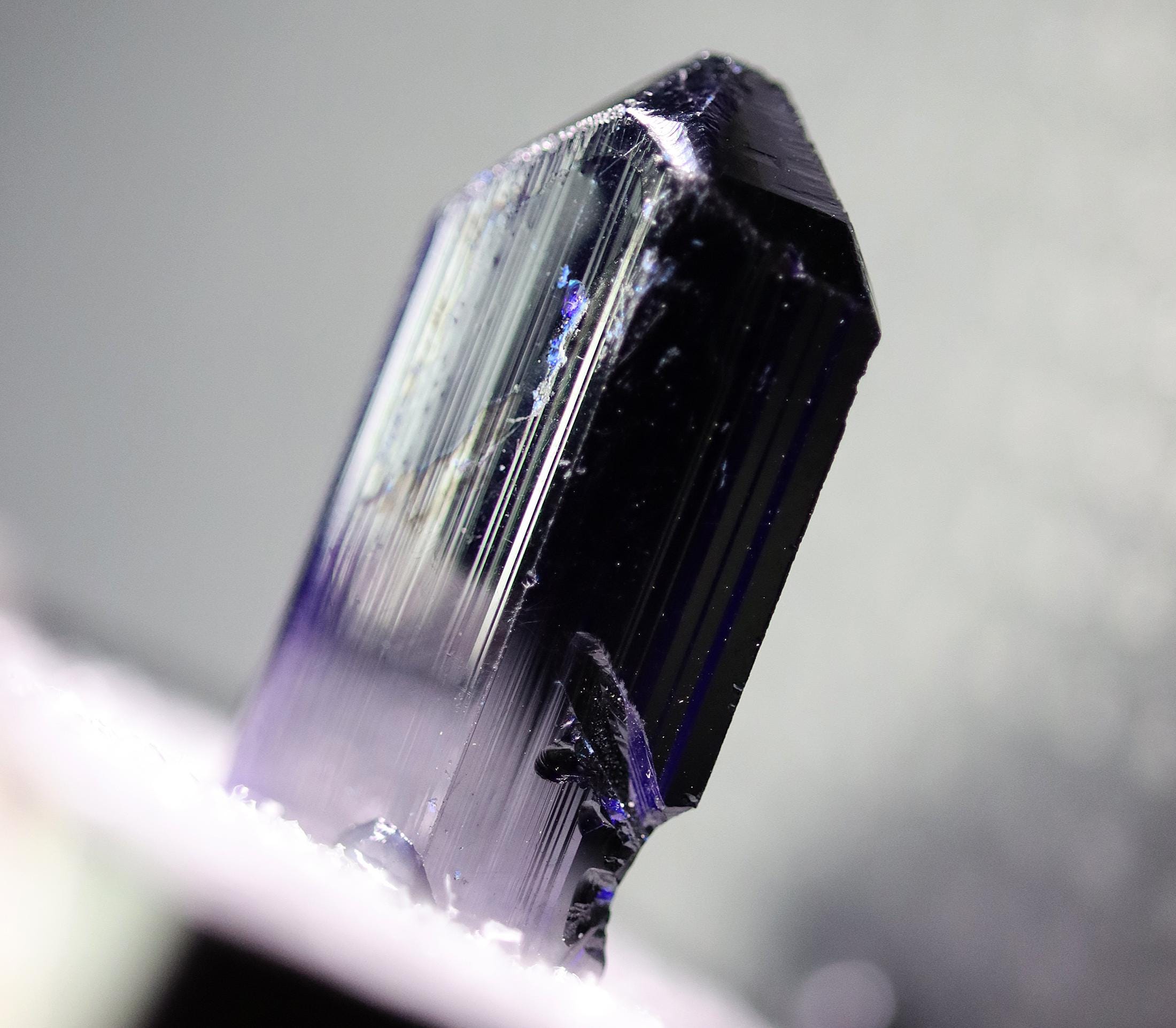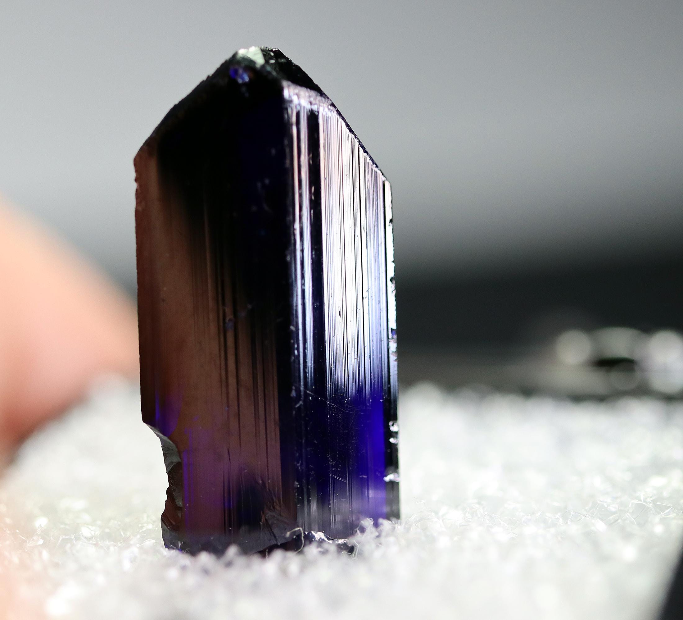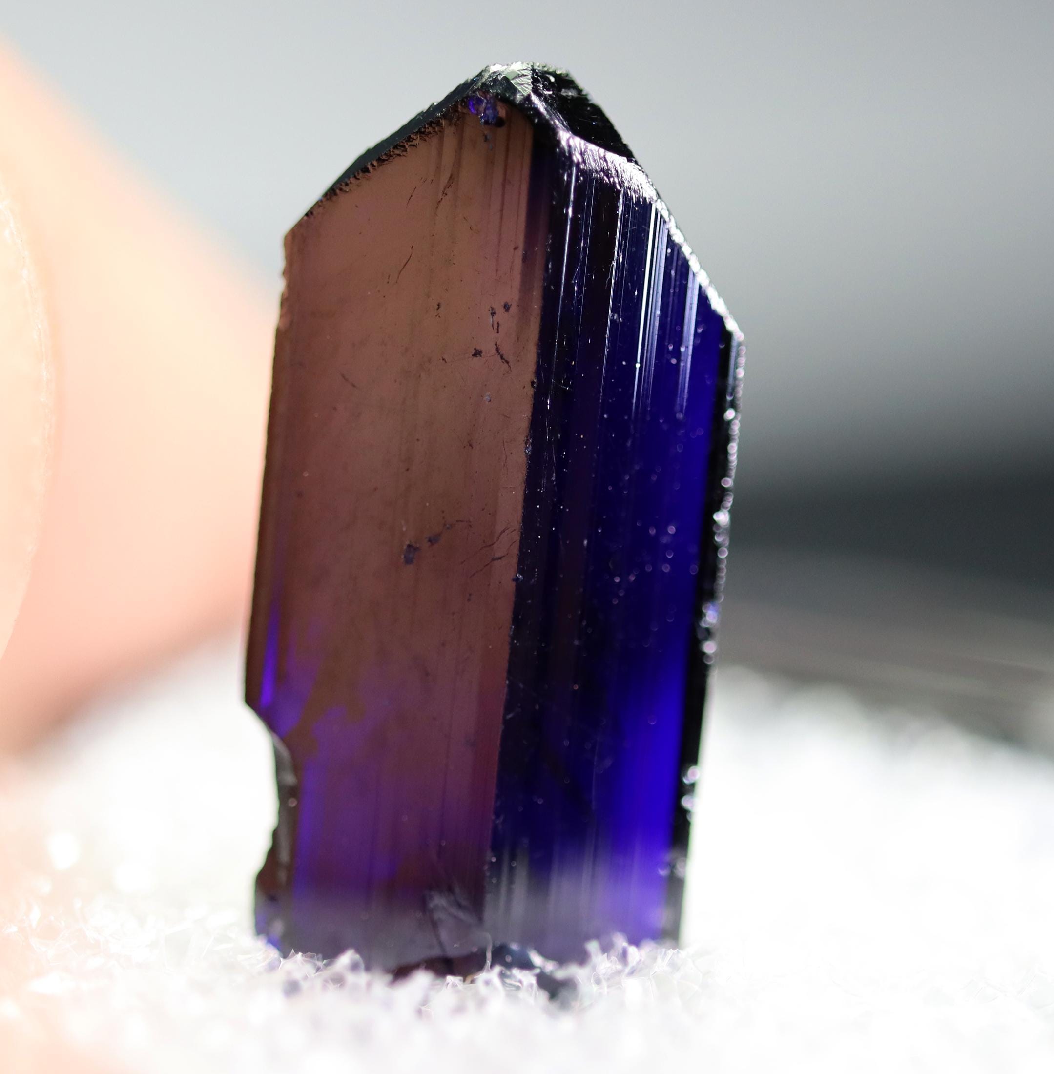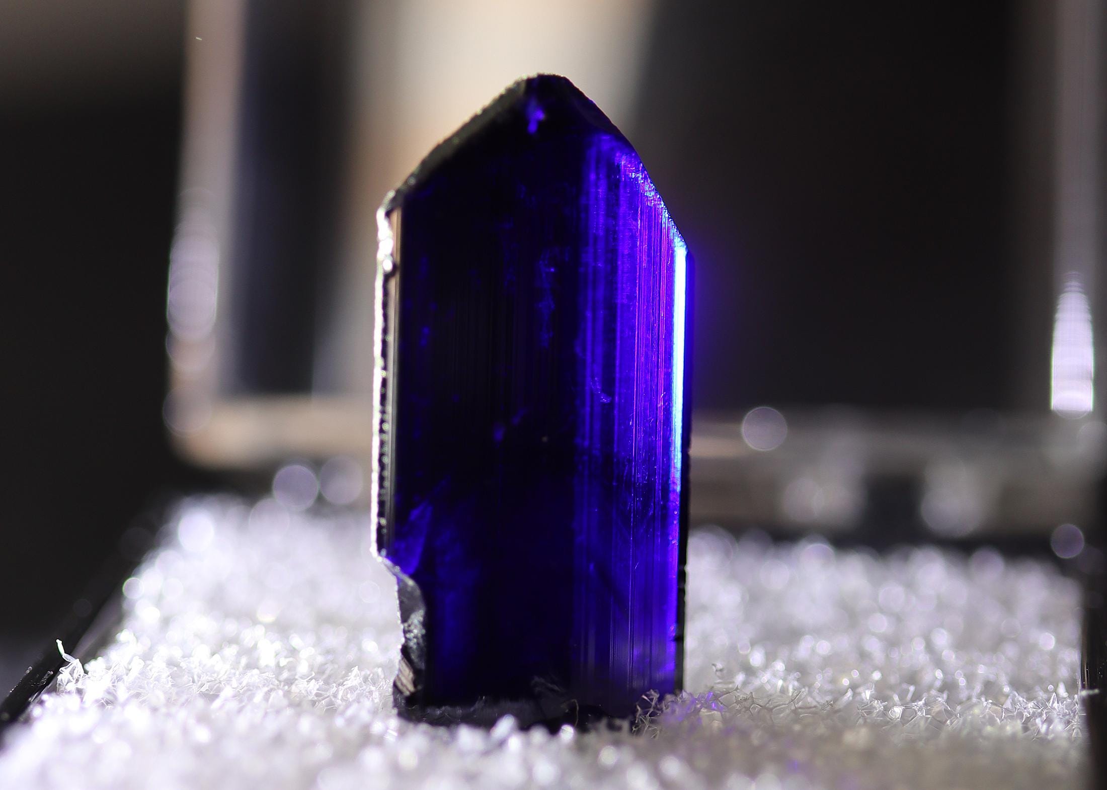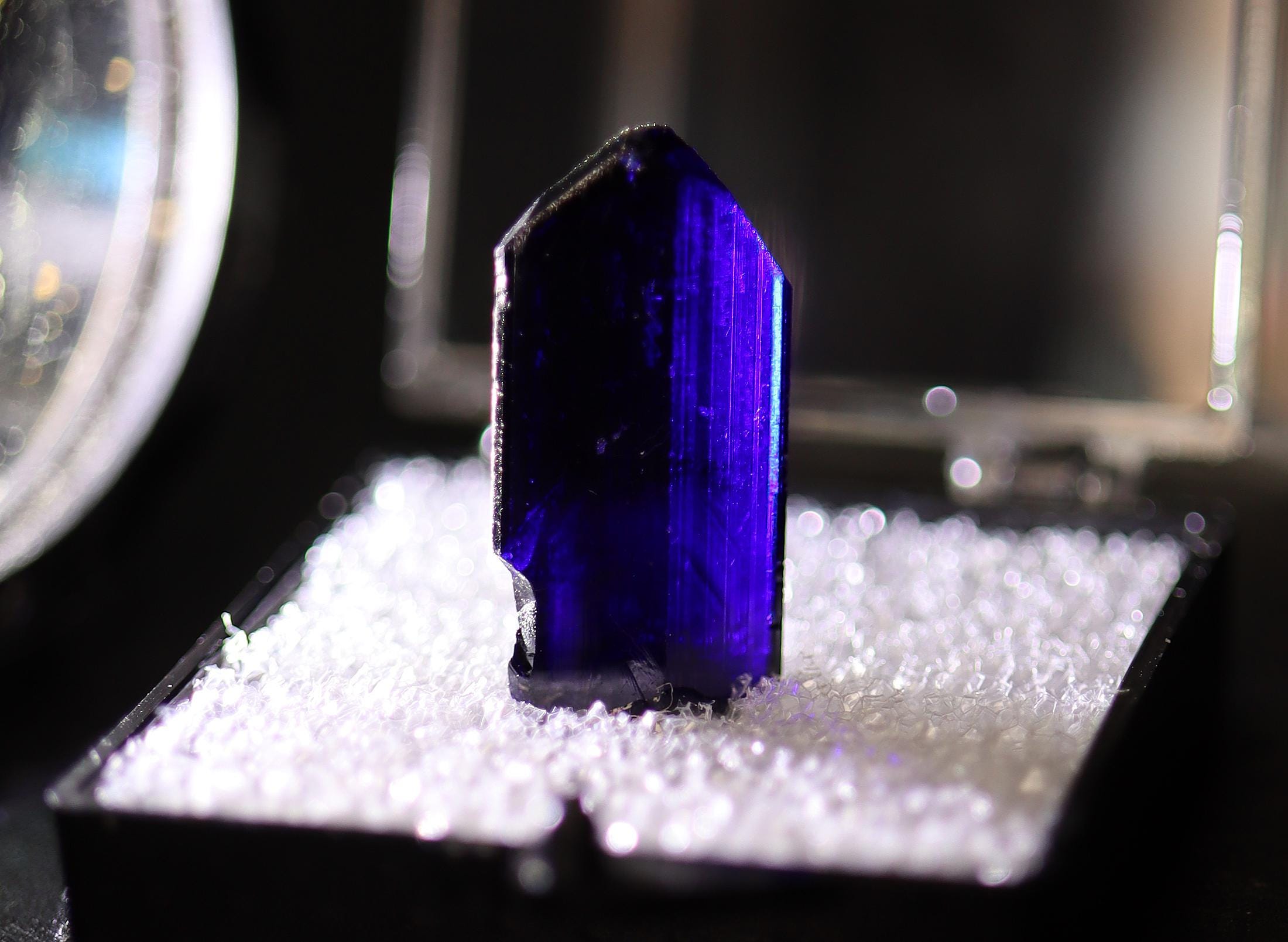 Offering a rich blue Azurite crystal blade thumbnail. Mined 2/16/75 Tsumeb, Namibia. Comes mounted in perky box. 21 mm x 12 mm x 4 mm