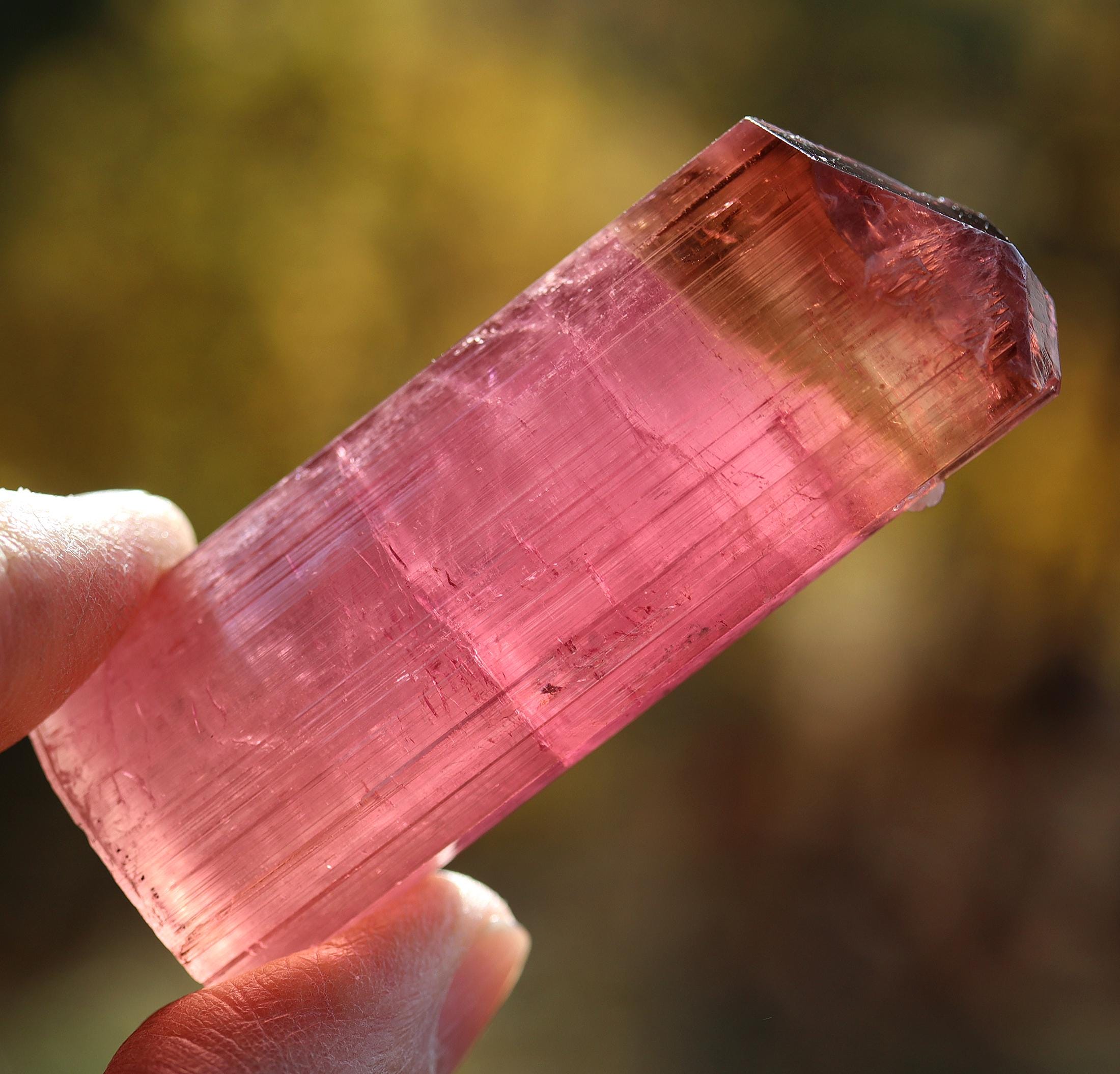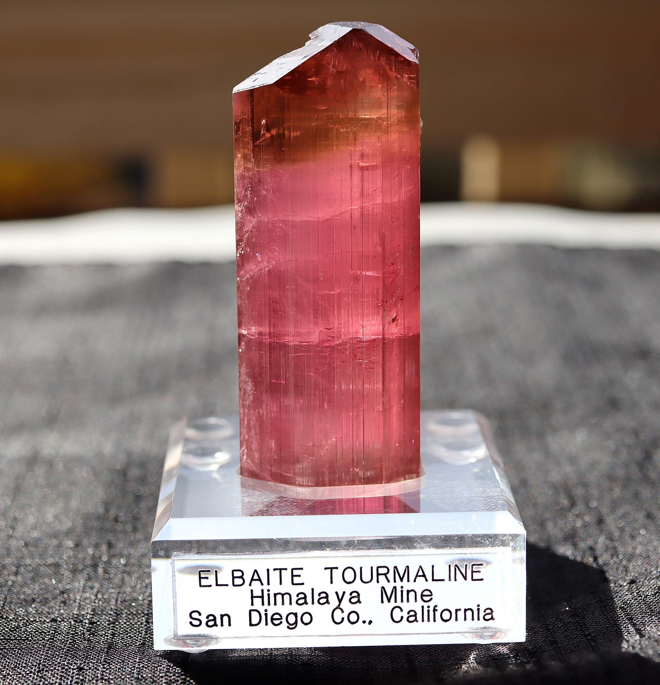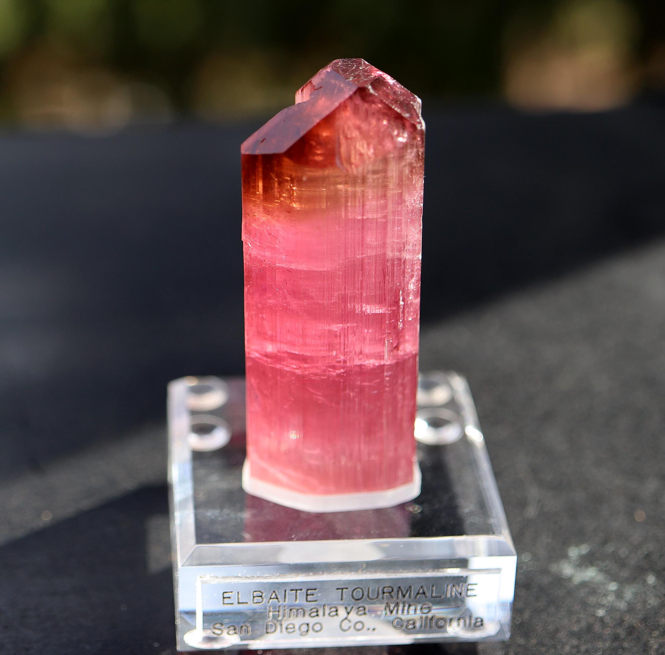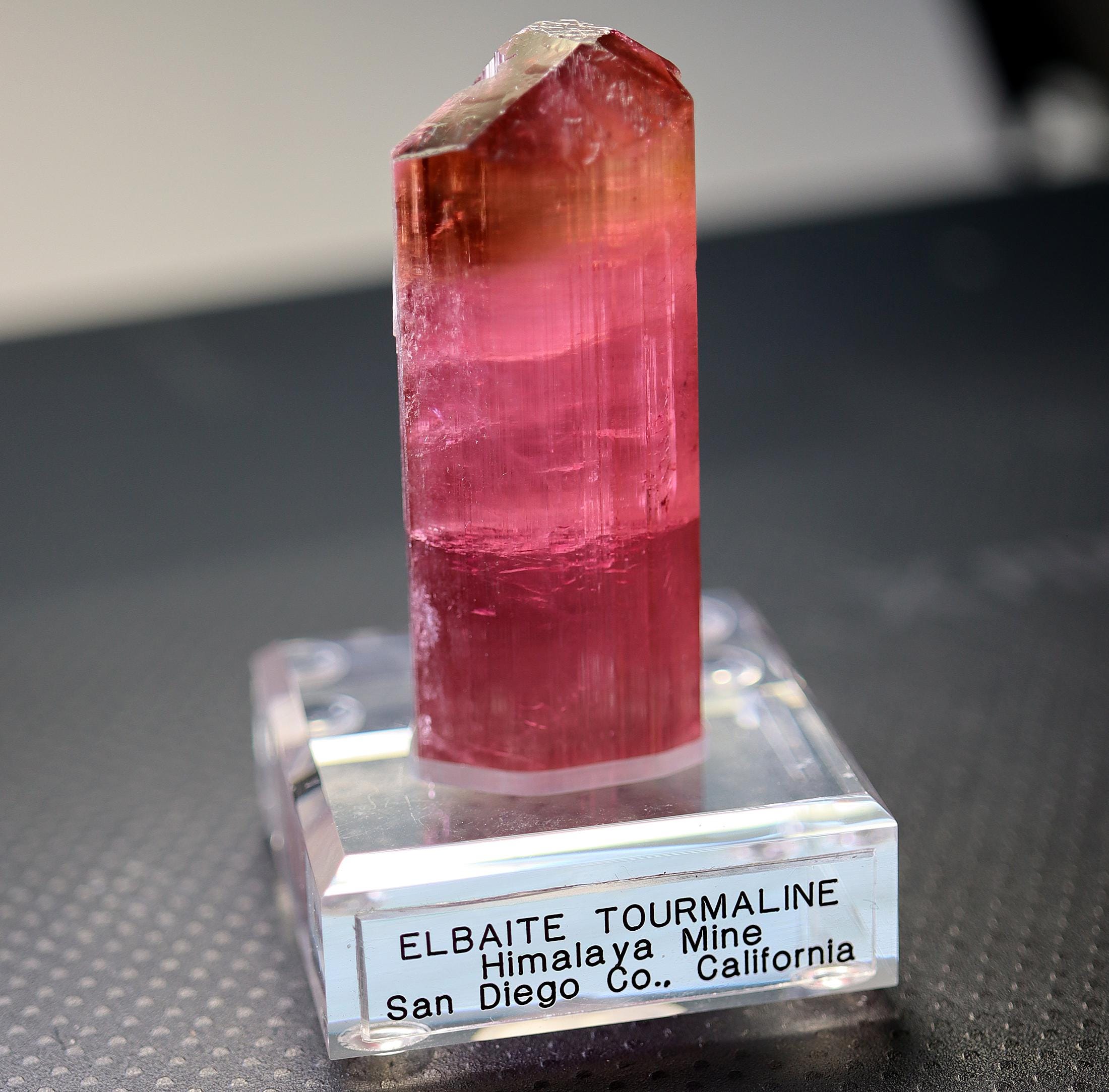 Gets no better than this Doubly terminated Tourmaline. Excellent transparency, termination is complex and beautiful with a natural flat bottom term. Color is so good in all light. No need to backlight. Good luster for Himalaya mine. Comes with a custom routed Sunnywood base as seen. 88.3 grams. No damage. Mined Himalaya Mine, San Diego Co., California 1980's. USA sale only. Signature will be required.