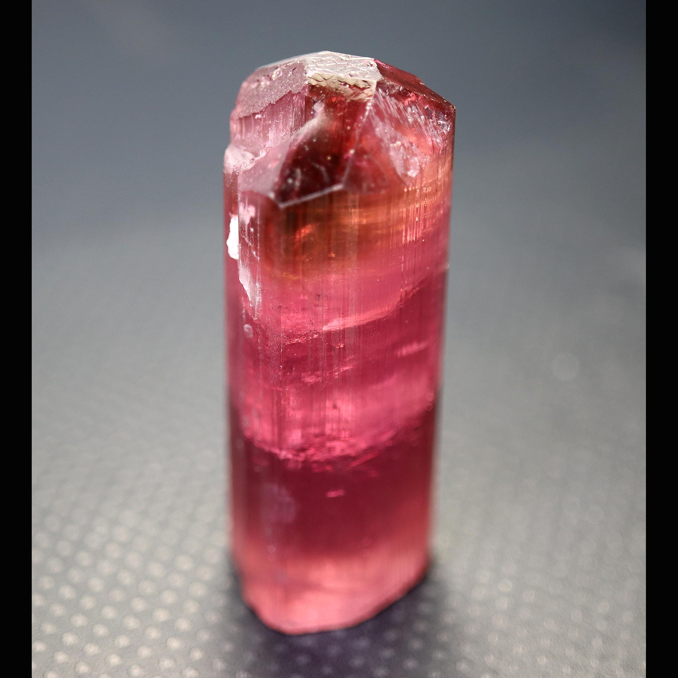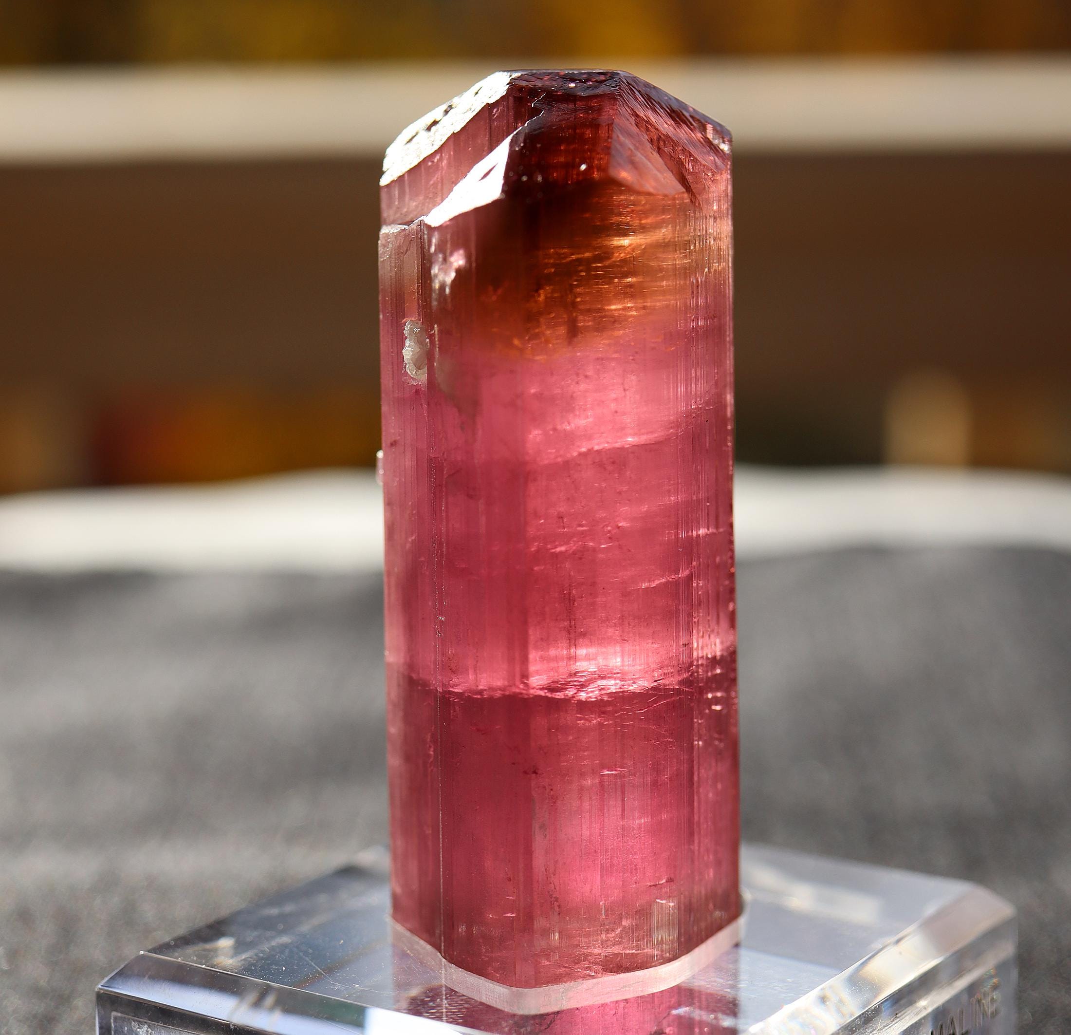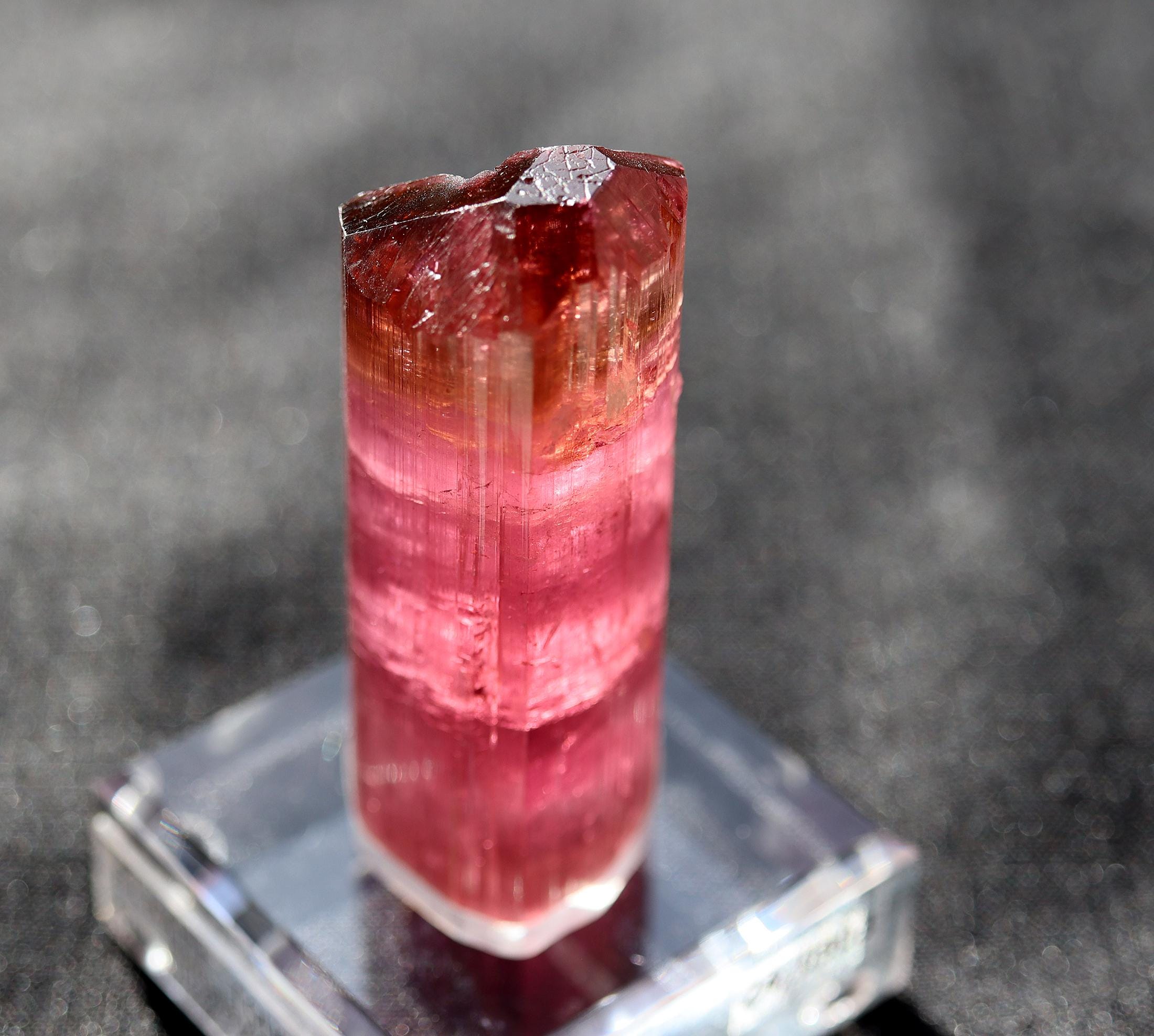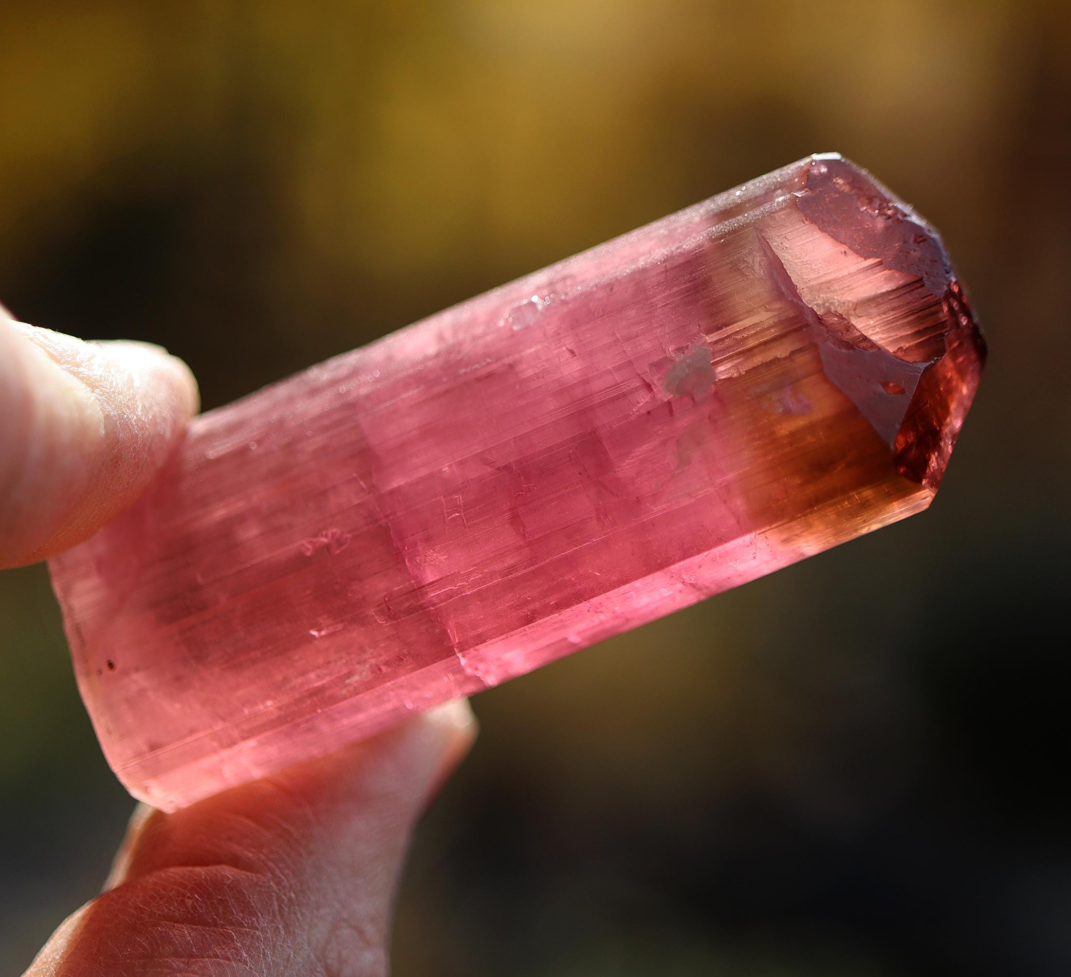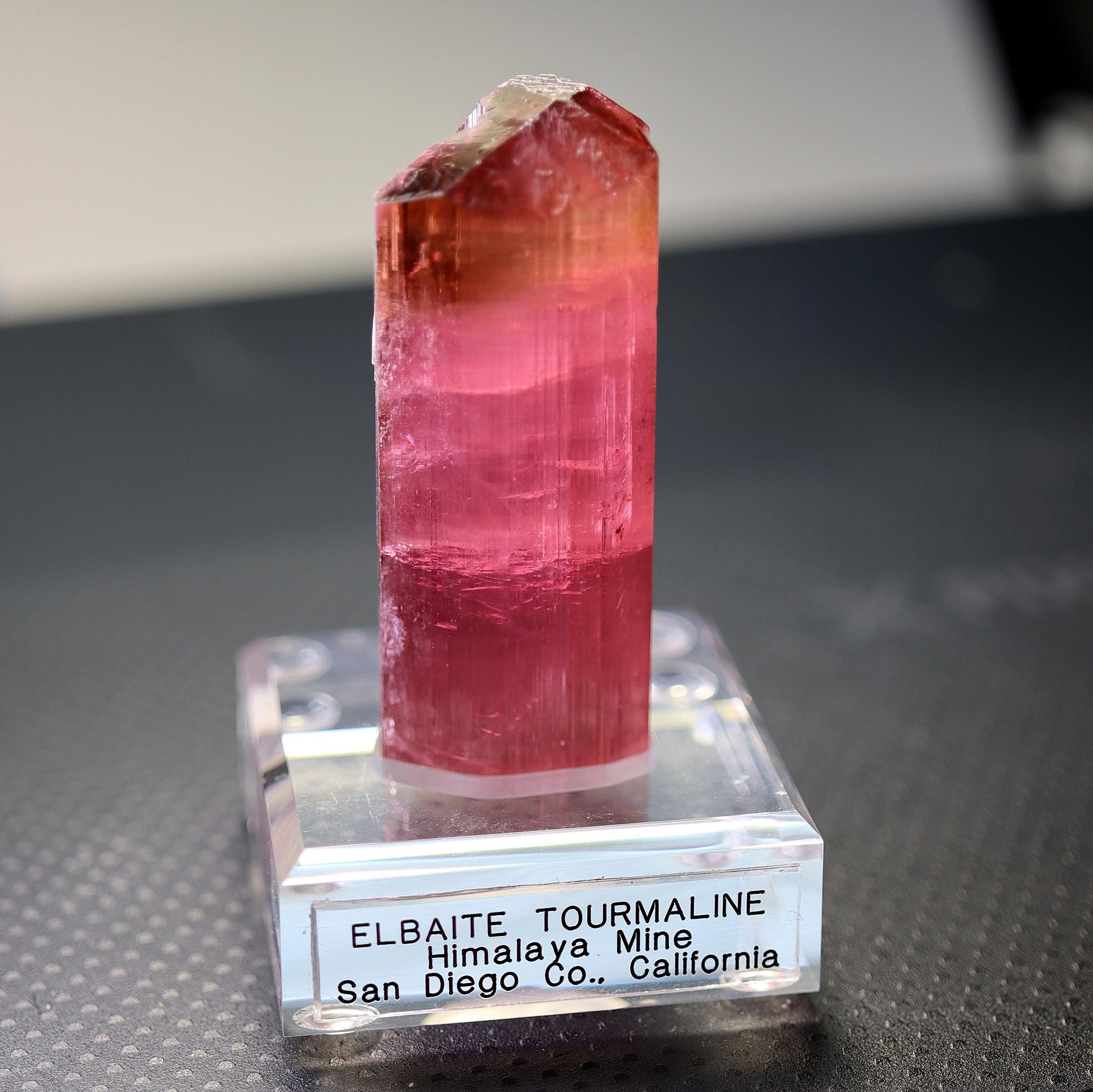 Gets no better than this Doubly terminated Tourmaline. Excellent transparency, termination is complex and beautiful with a natural flat bottom term. Color is so good in all light. No need to backlight. Good luster for Himalaya mine. Comes with a custom routed Sunnywood base as seen. 88.3 grams. No damage. Mined Himalaya Mine, San Diego Co., California 1980's. USA sale only. Signature will be required.