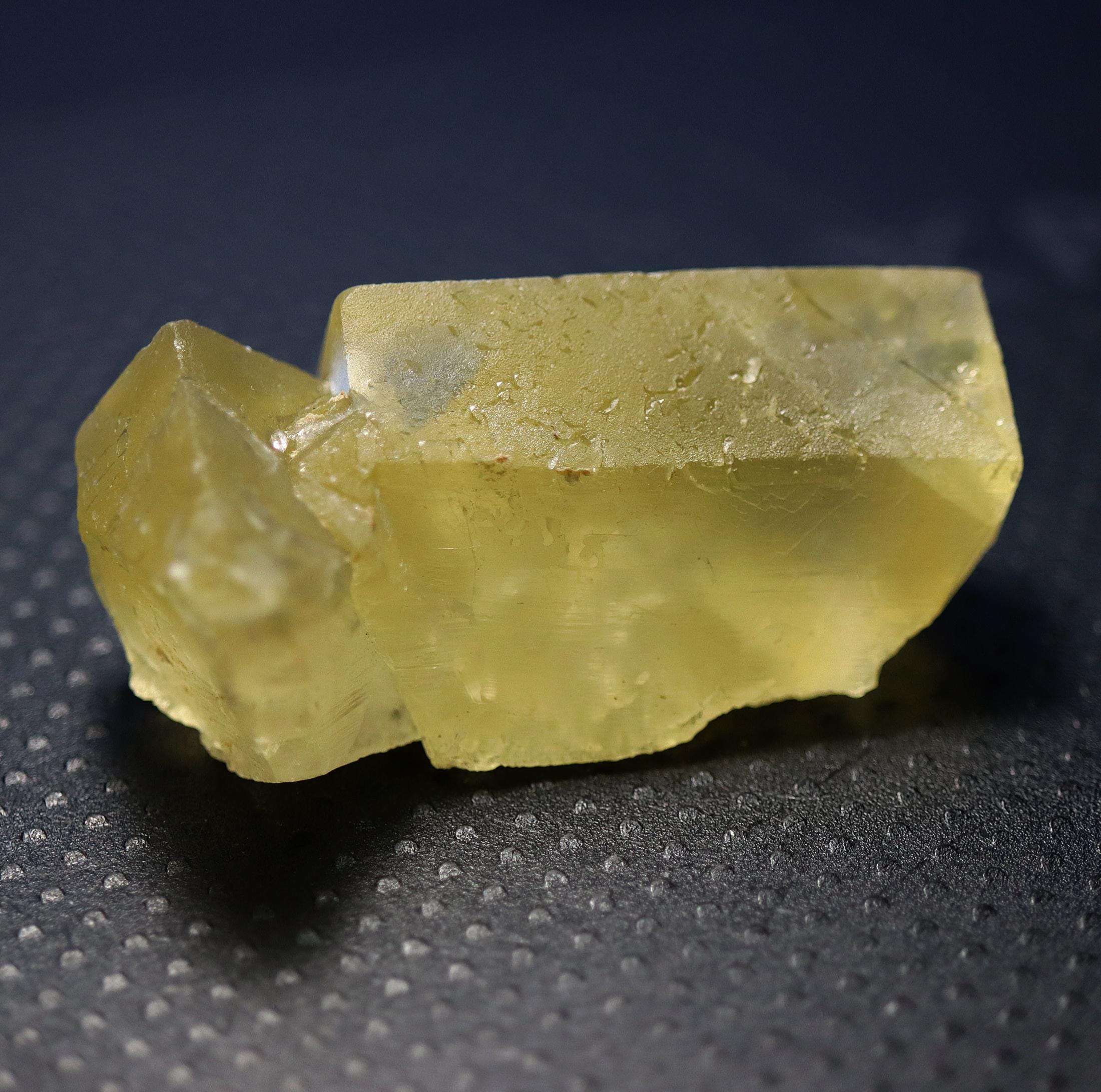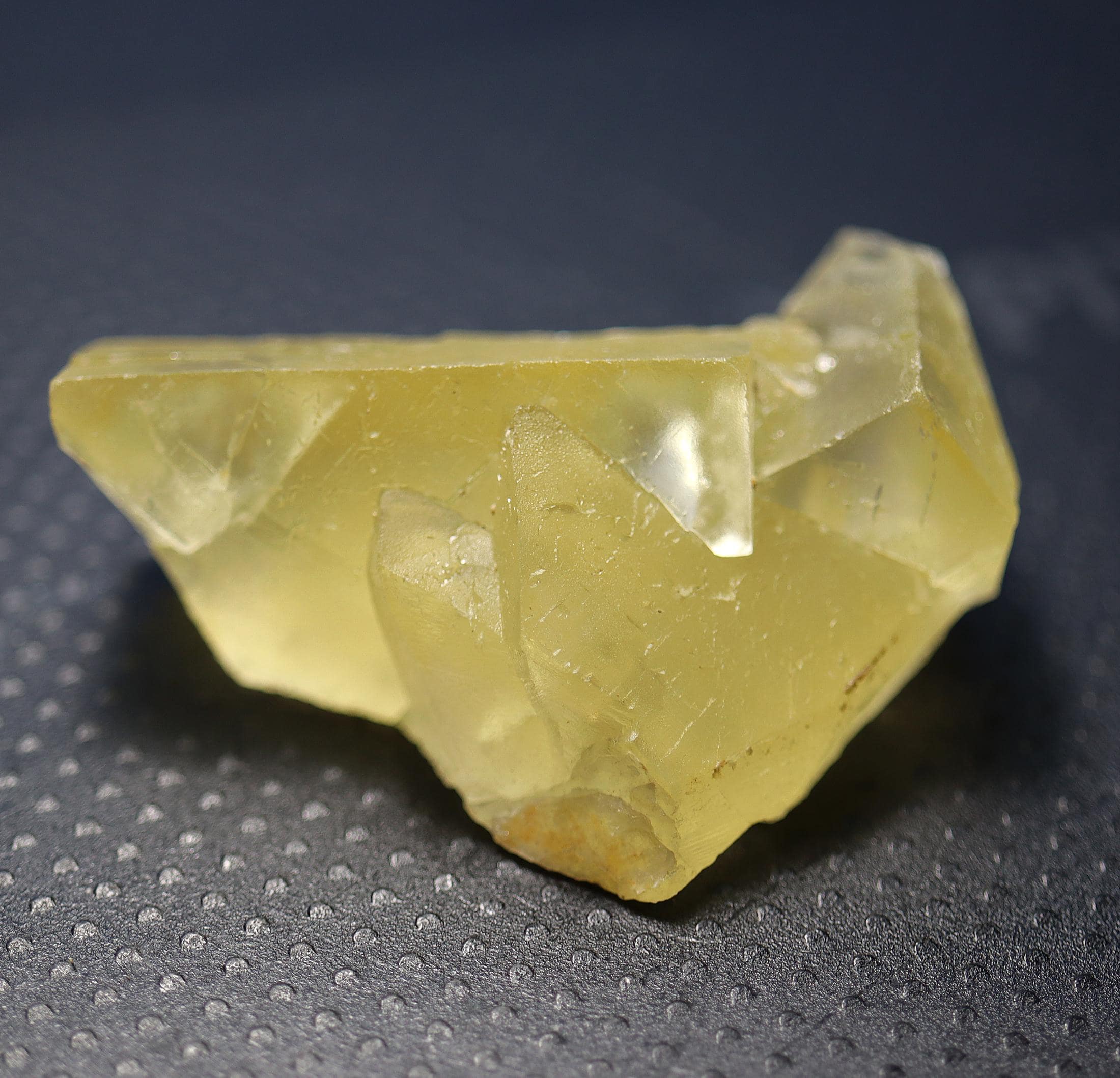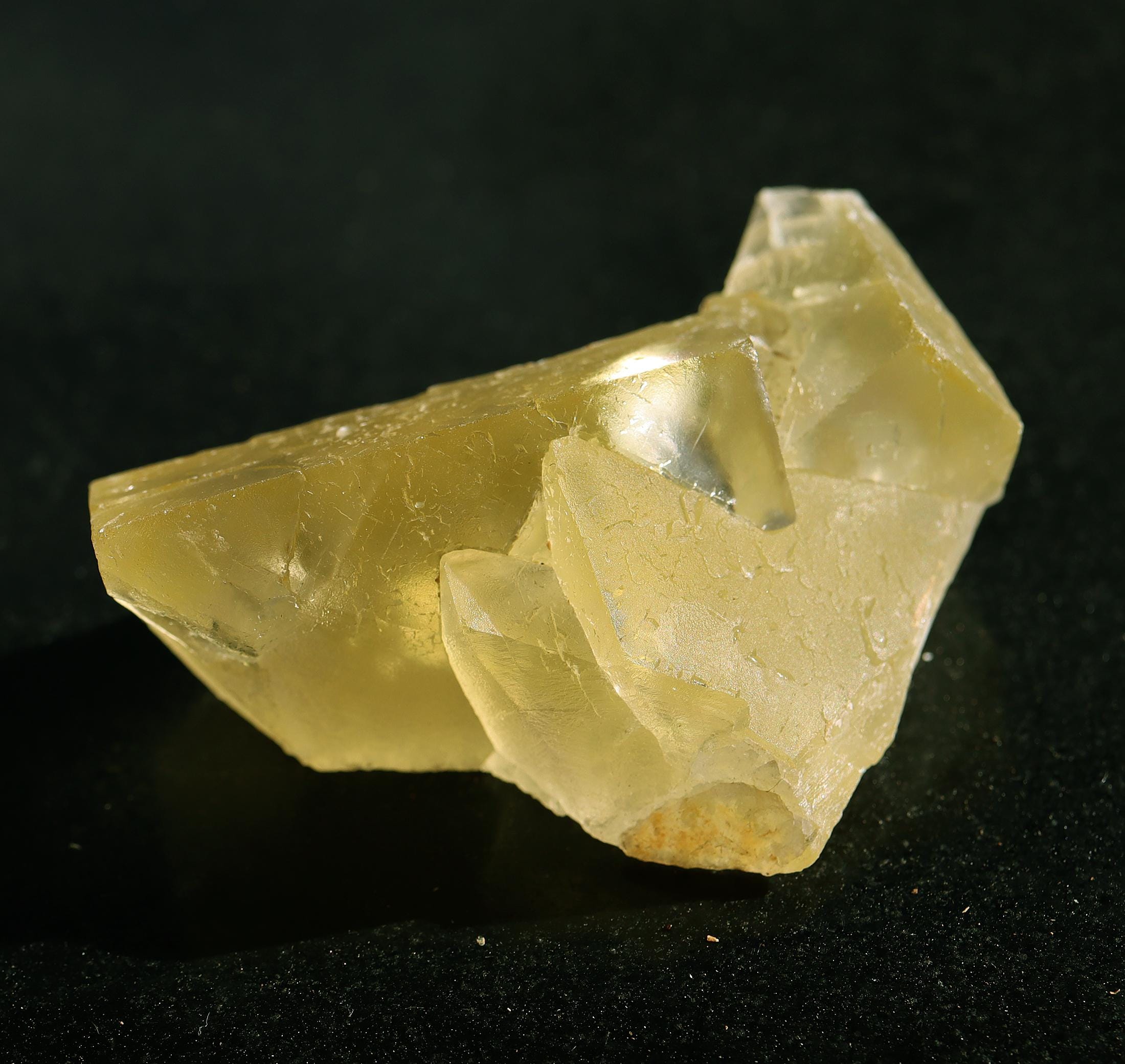Lemon yellow fluorite crystal. Unknown location. 2.25 inch wide. All intact and in excellent condition. Bottom is sawn flat.
