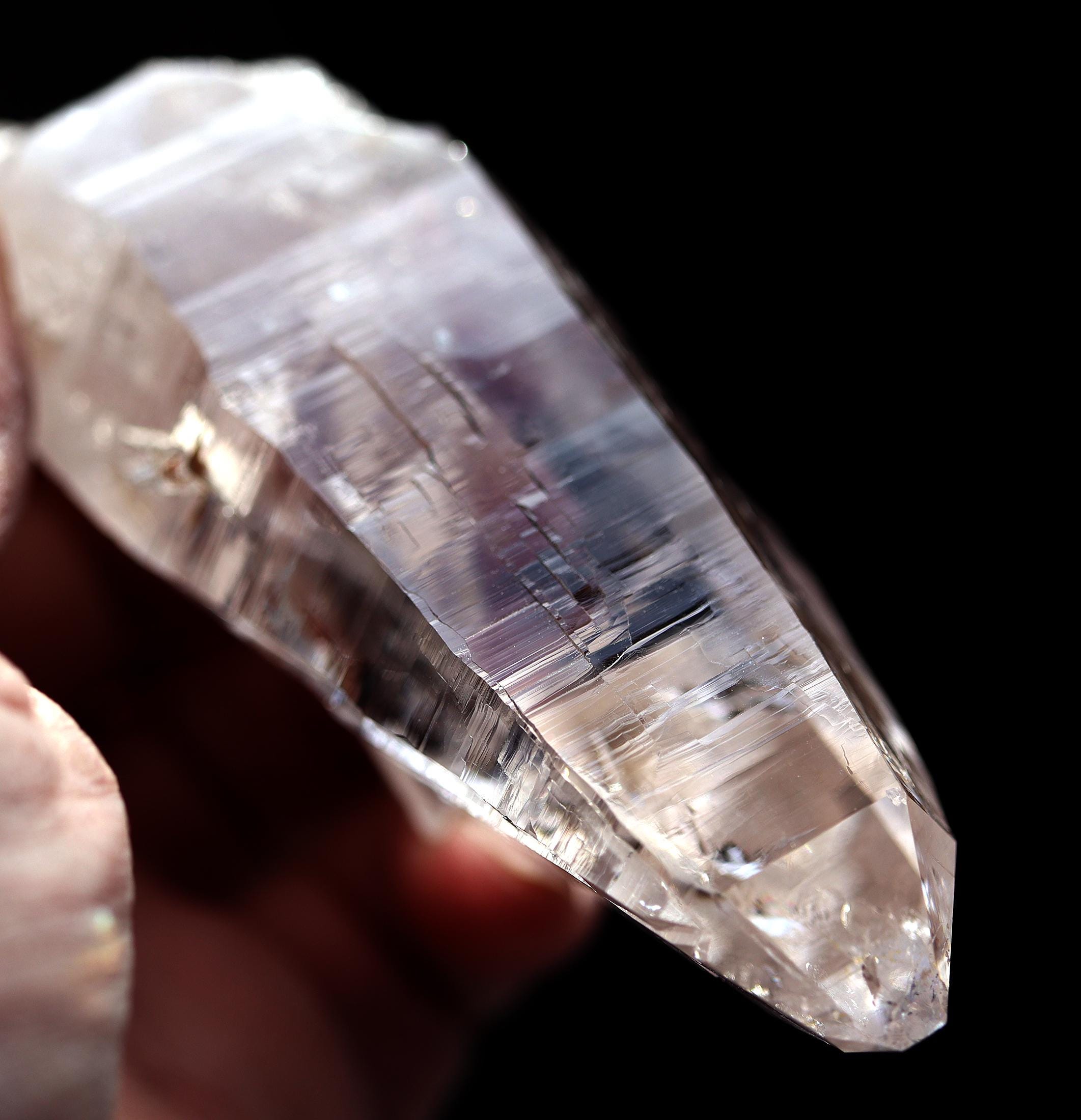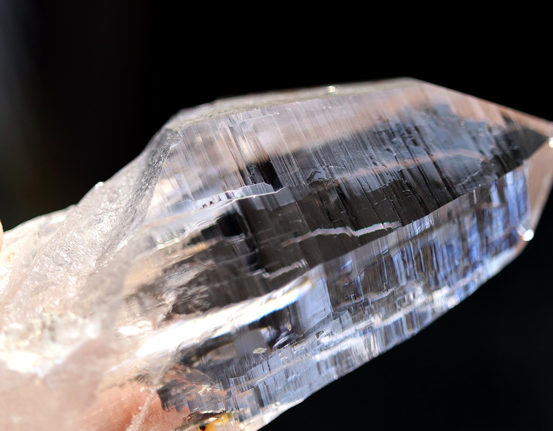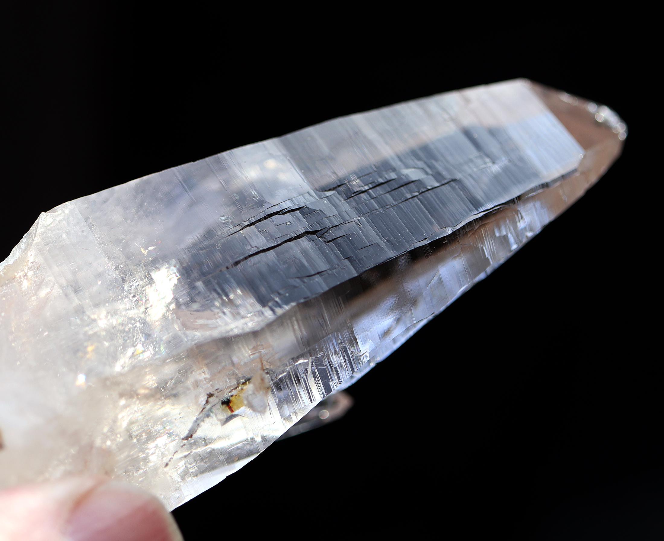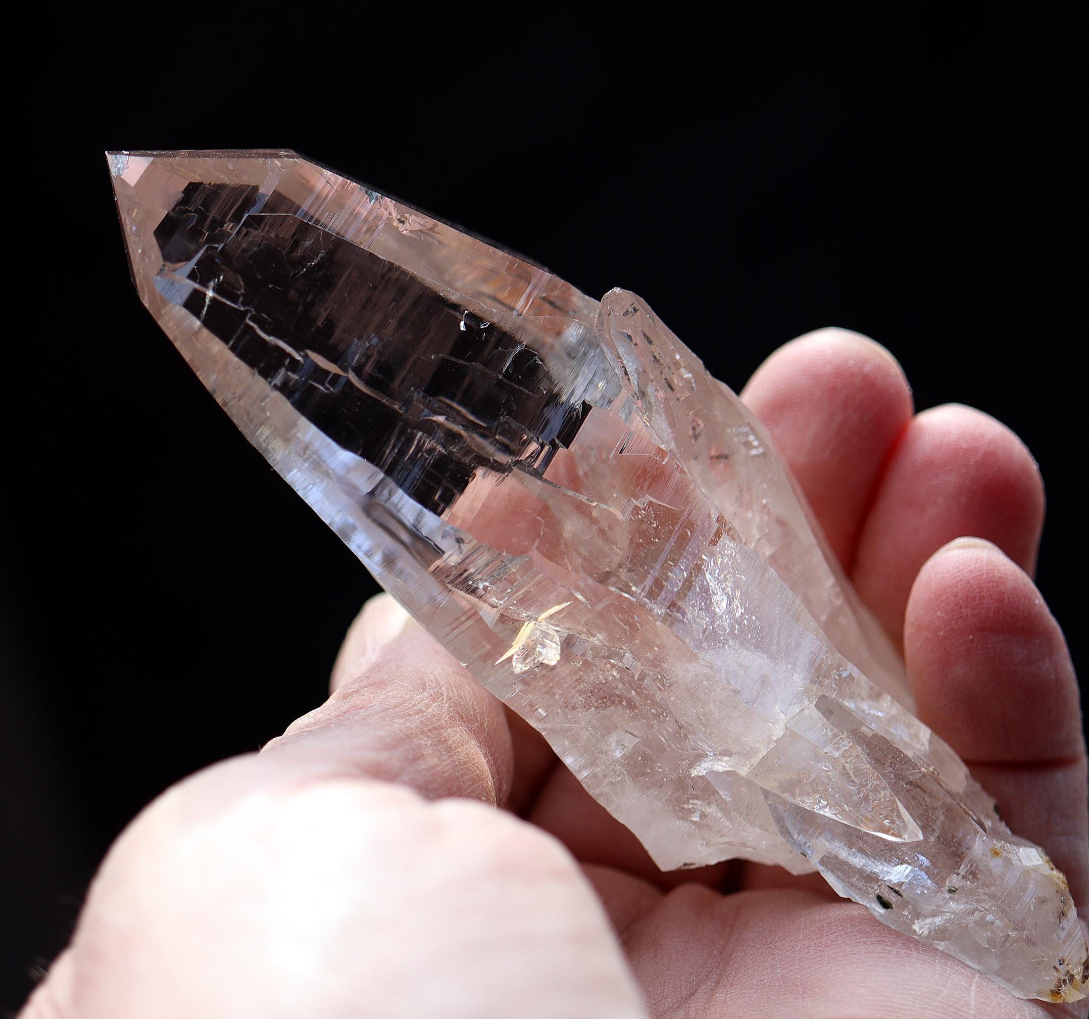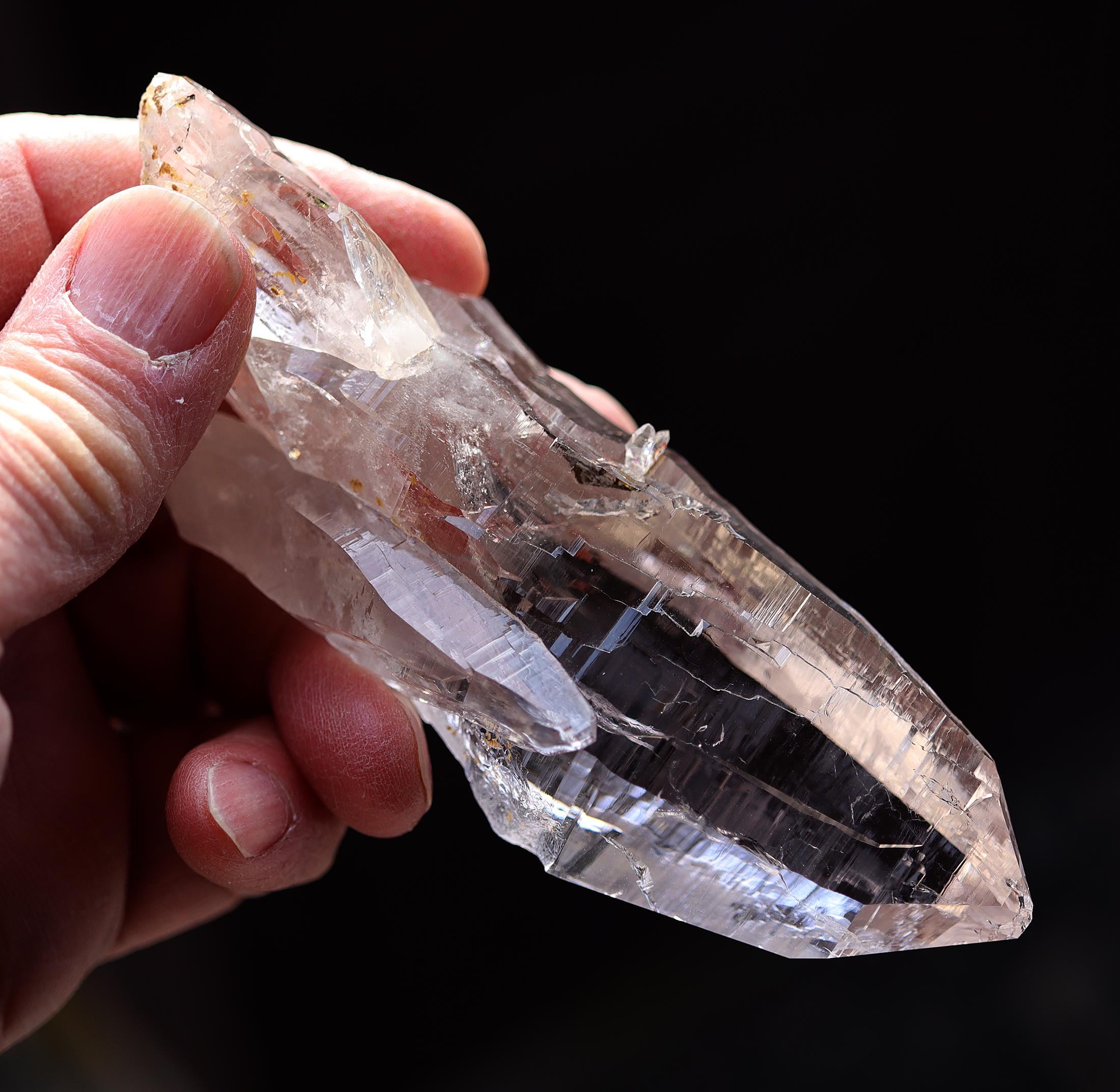 Offering a high quality Ice clear Tessin habit Quartz from Binntal, Switzerland. From an older European collection. Mined from high altitude Switzerland. Outrageous beautiful complex surface formation all sides. Top luster and clarity. The top termination is perfect and intact with a internal natural veil at the very tip. This is not damage but internal. The bottom has several side car crystals much of that is rehealed. 4.75 inch long. Weight 186 grams.