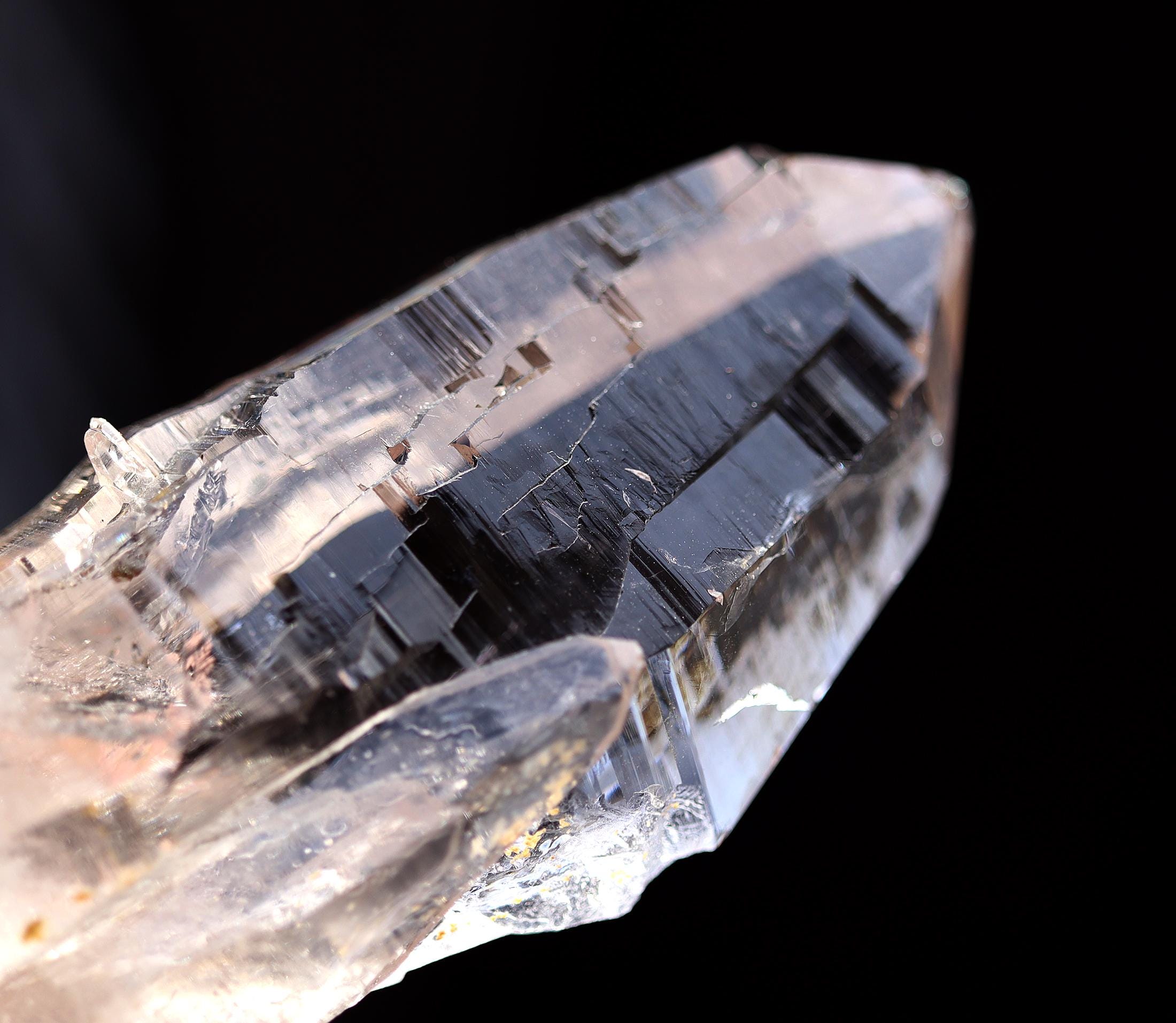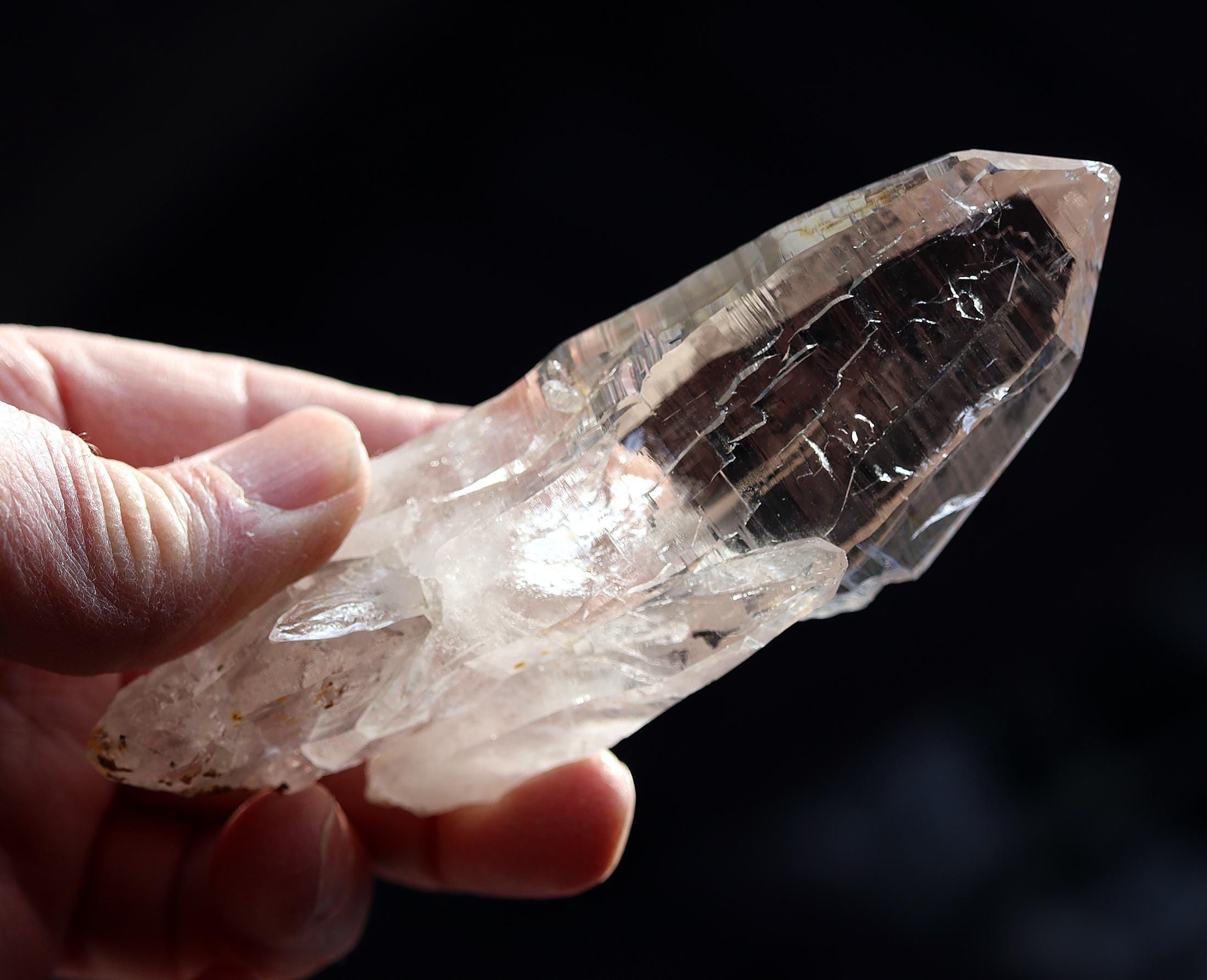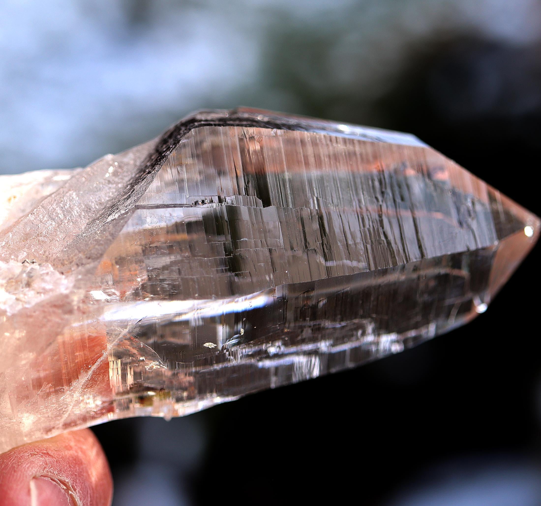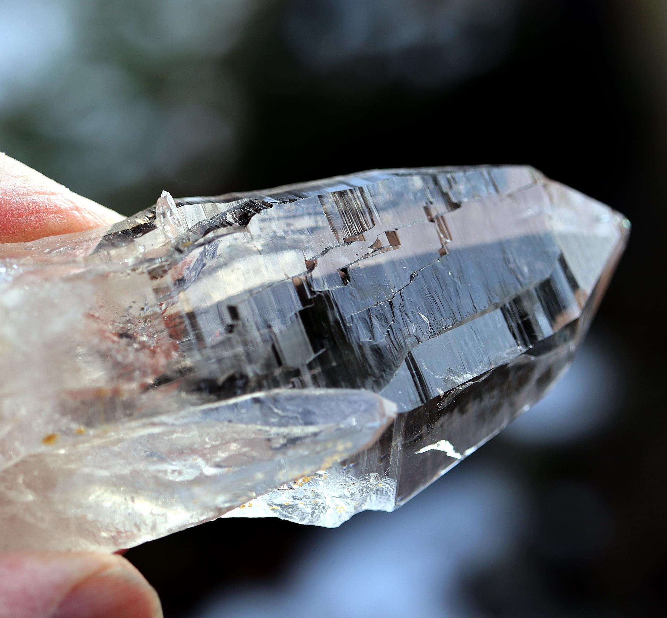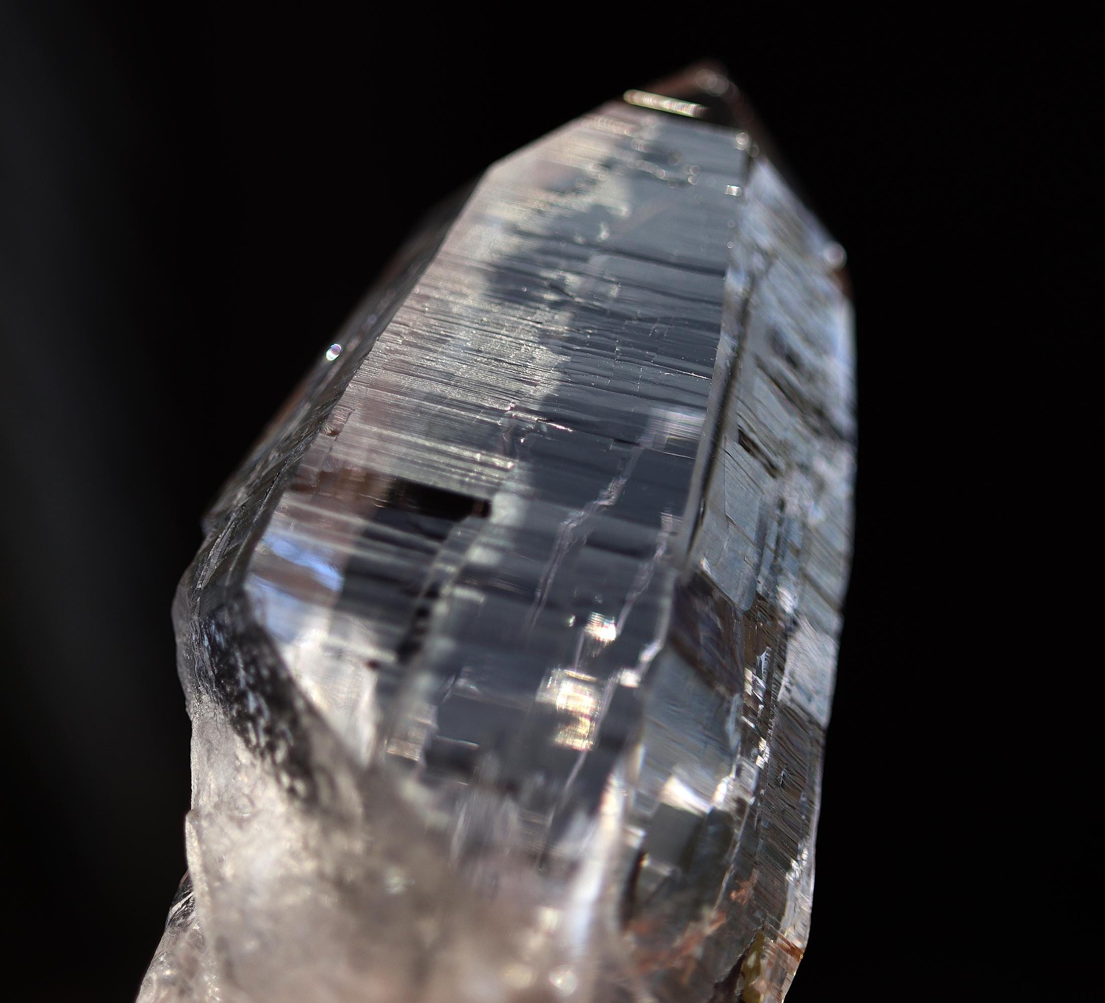 Offering a high quality Ice clear Tessin habit Quartz from Binntal, Switzerland. From an older European collection. Mined from high altitude Switzerland. Outrageous beautiful complex surface formation all sides. Top luster and clarity. The top termination is perfect and intact with a internal natural veil at the very tip. This is not damage but internal. The bottom has several side car crystals much of that is rehealed. 4.75 inch long. Weight 186 grams.