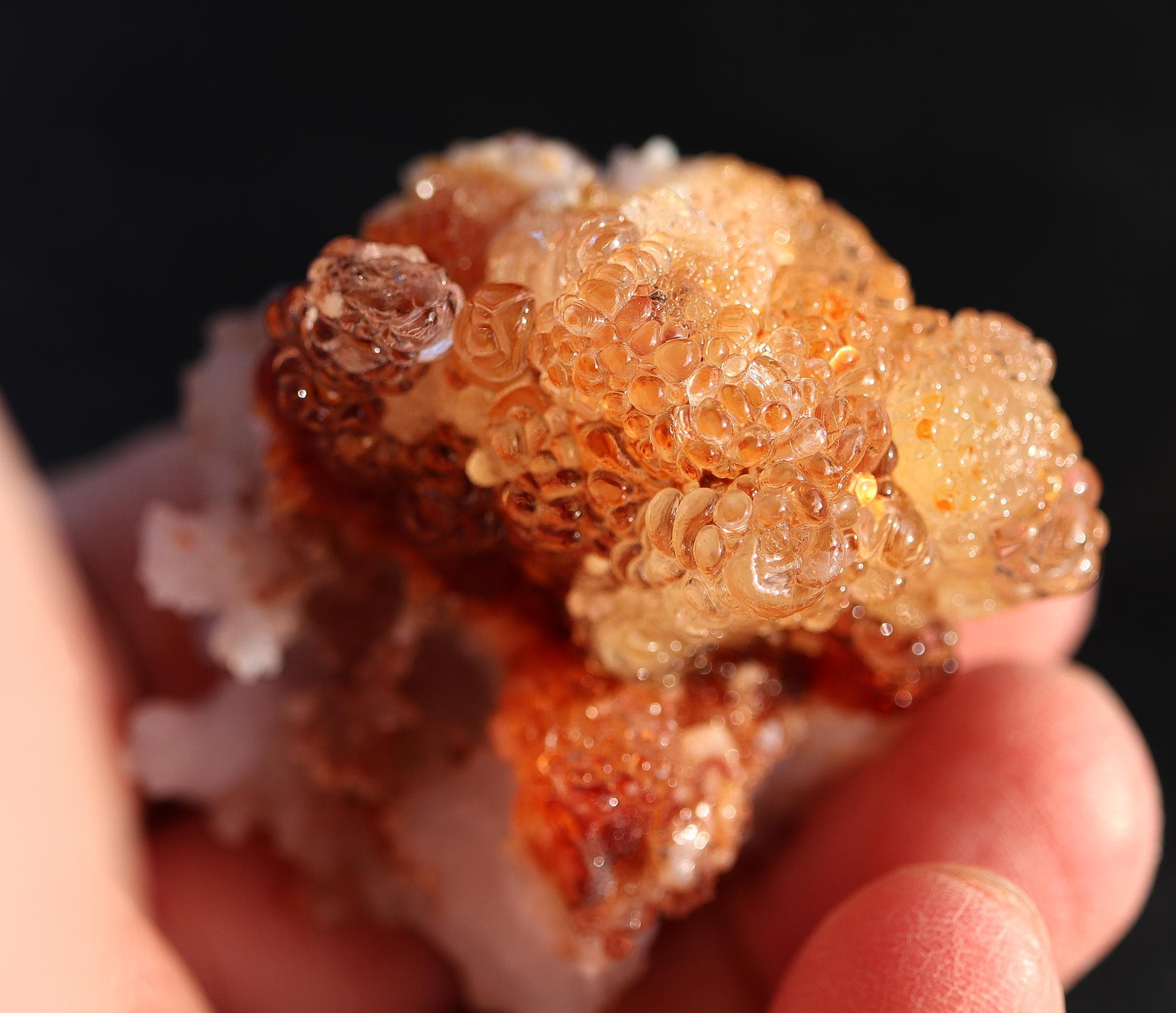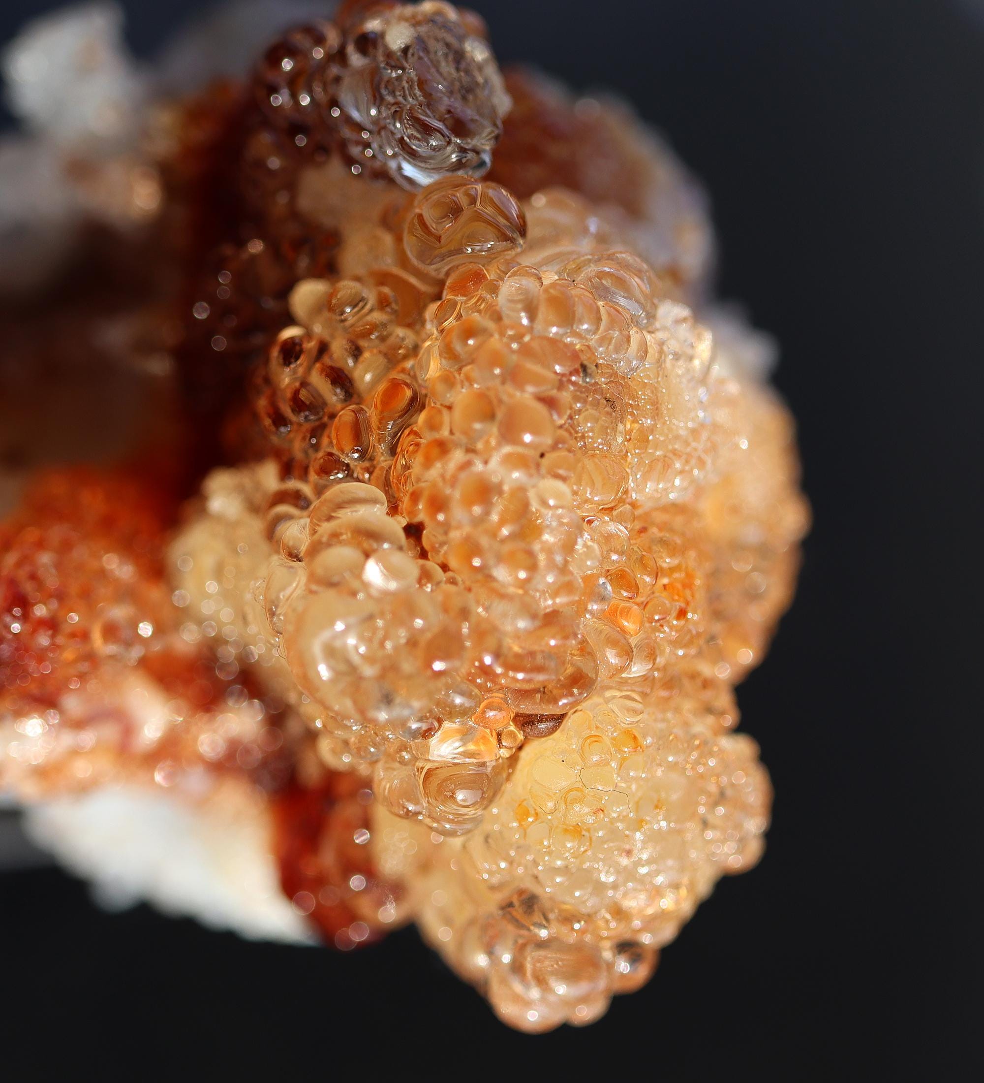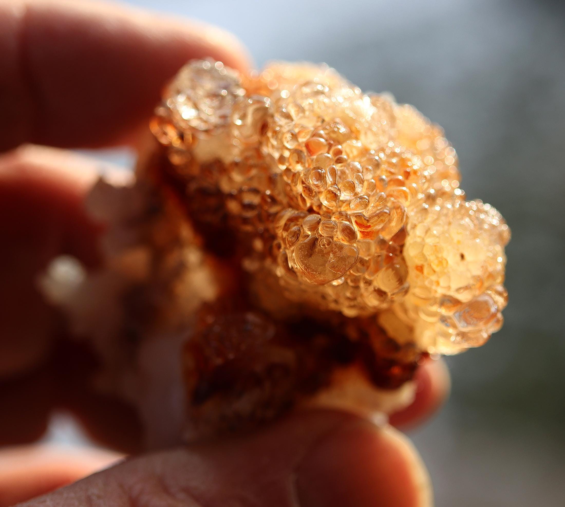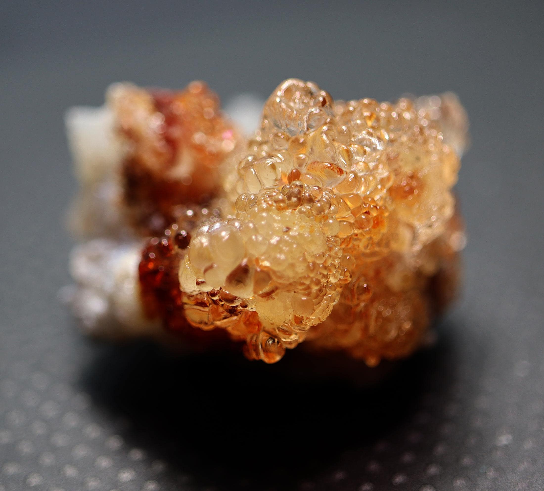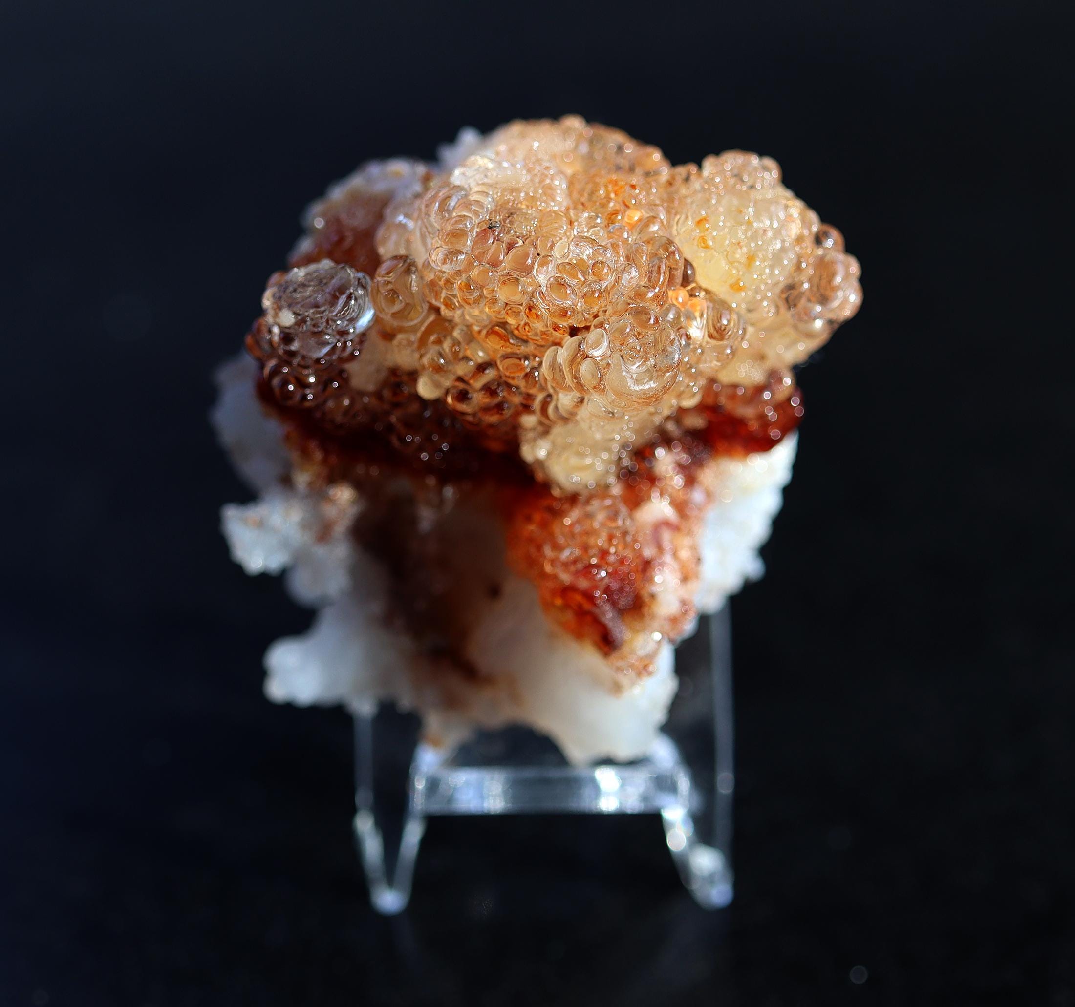 Hyalite Opal cap on Chalcedony, San Luis Potosí, Mexico. Beautiful botryoidal structure of a large mound of translucent Hyalite Opal. Highly fluorescent green under UV light. I had a light that went missing but as you know Hyalite Opal is highly fluorescent. 1.75 by 1.75 by 1.75 inch. 60.85 grams. This is an excellent specimen.