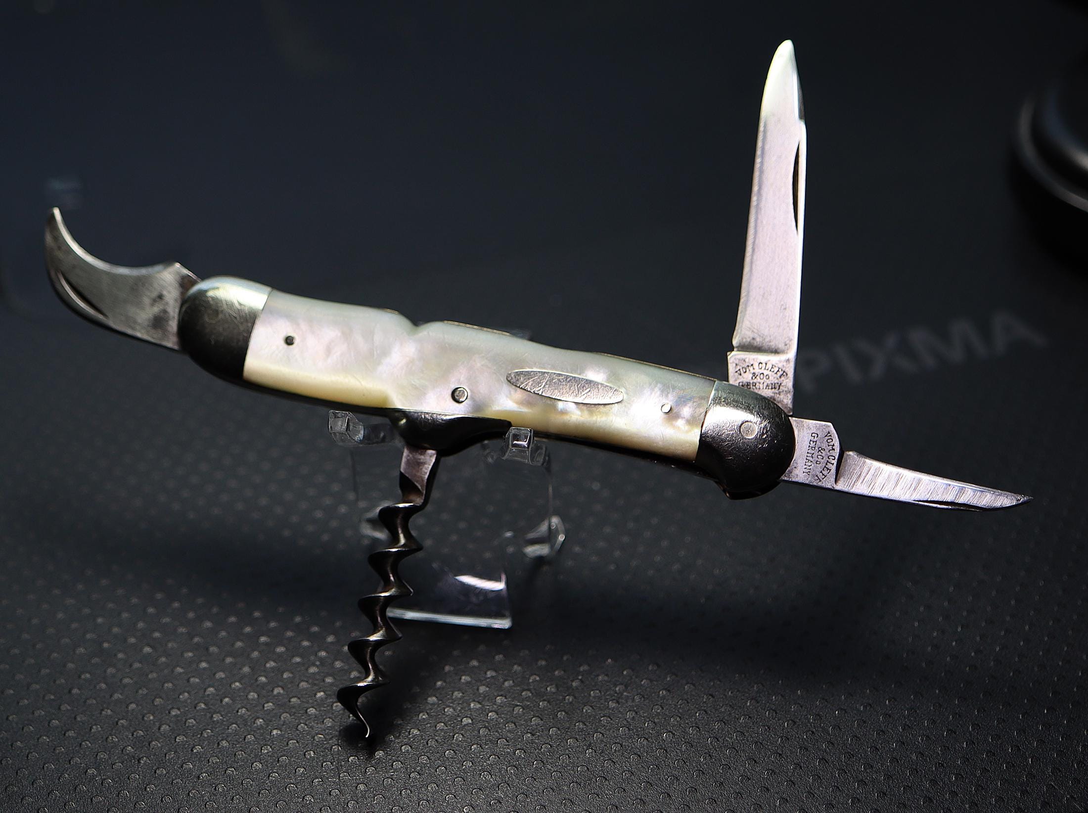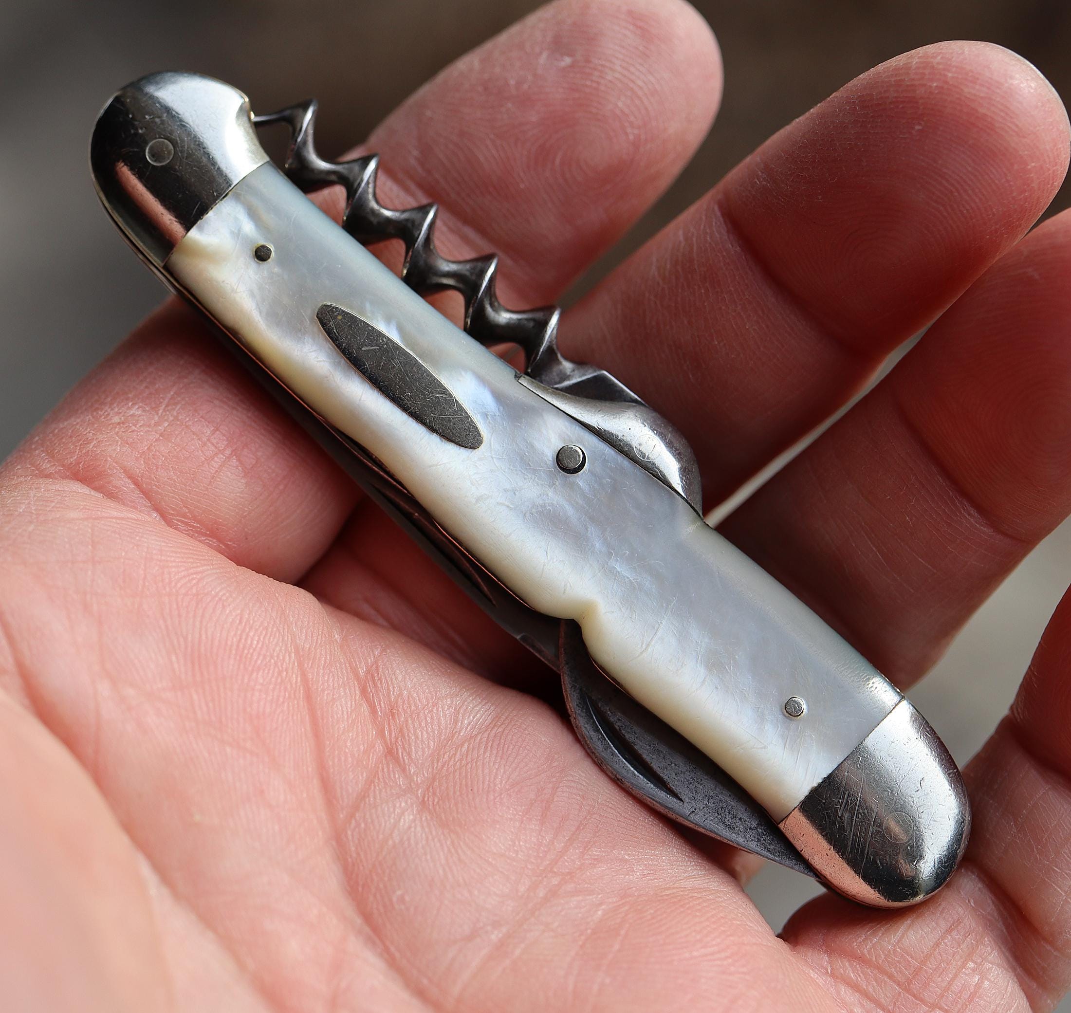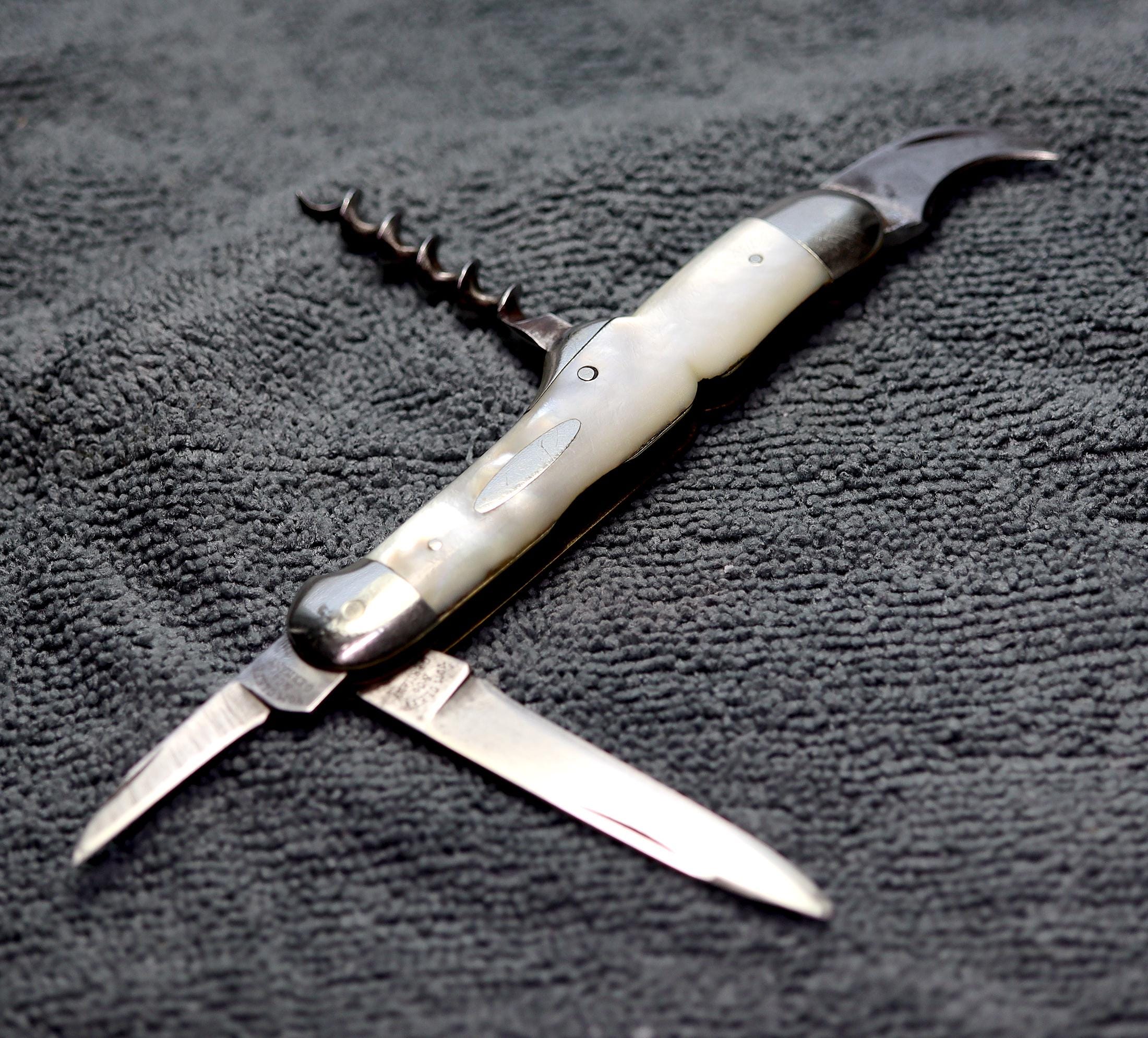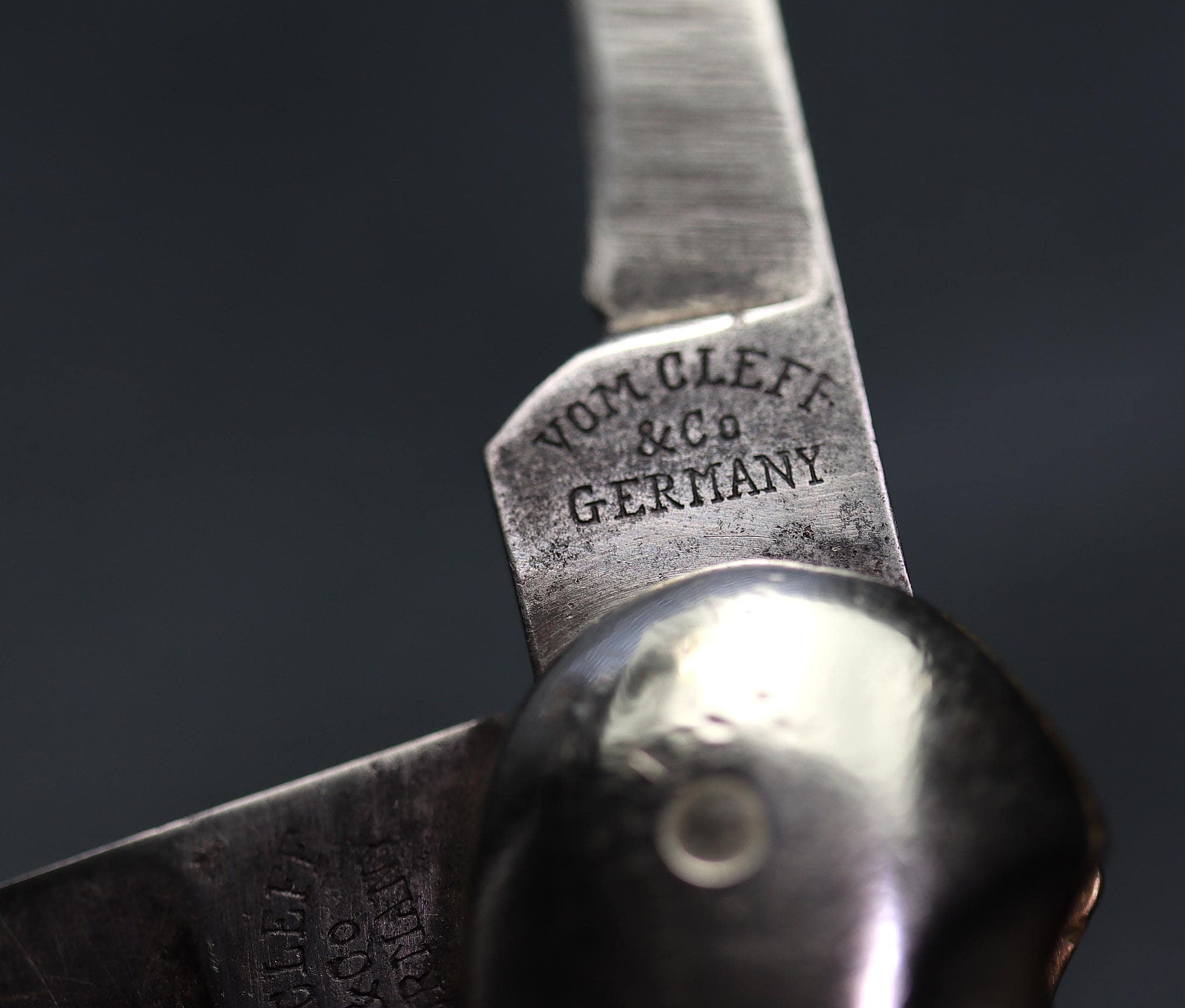 An early 4 blade pearl handle Bar knife Vom Cleff & Co. Germany. Lion Cutlery 1885-1926. Mother of Pearl scales are perfect no cracks no chips and great rainbow fire. All blades tang stamped, tight with good snap. All blades are complete with none broken. Rare to find in this condition. Made in Germany 1887-1926. Bench made in Germany. This is in great antique bar knife. How many bottles has this opened? USA SALE ONLY.