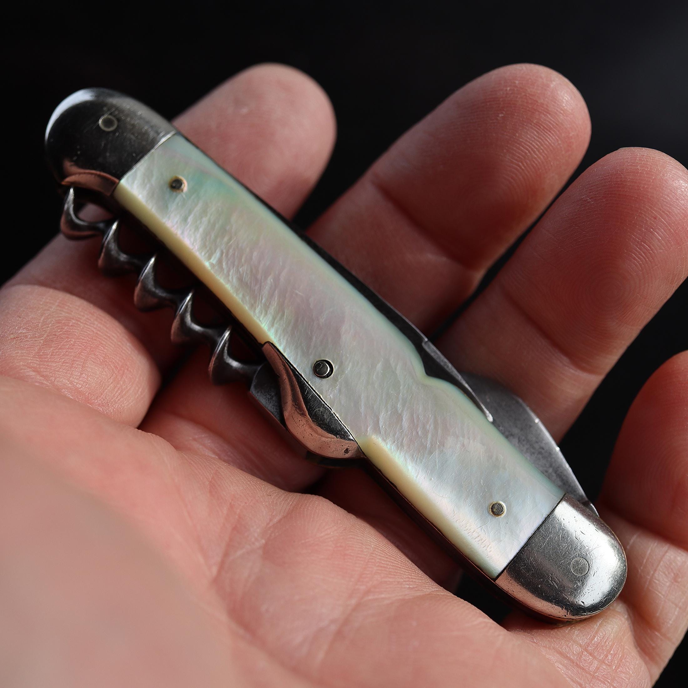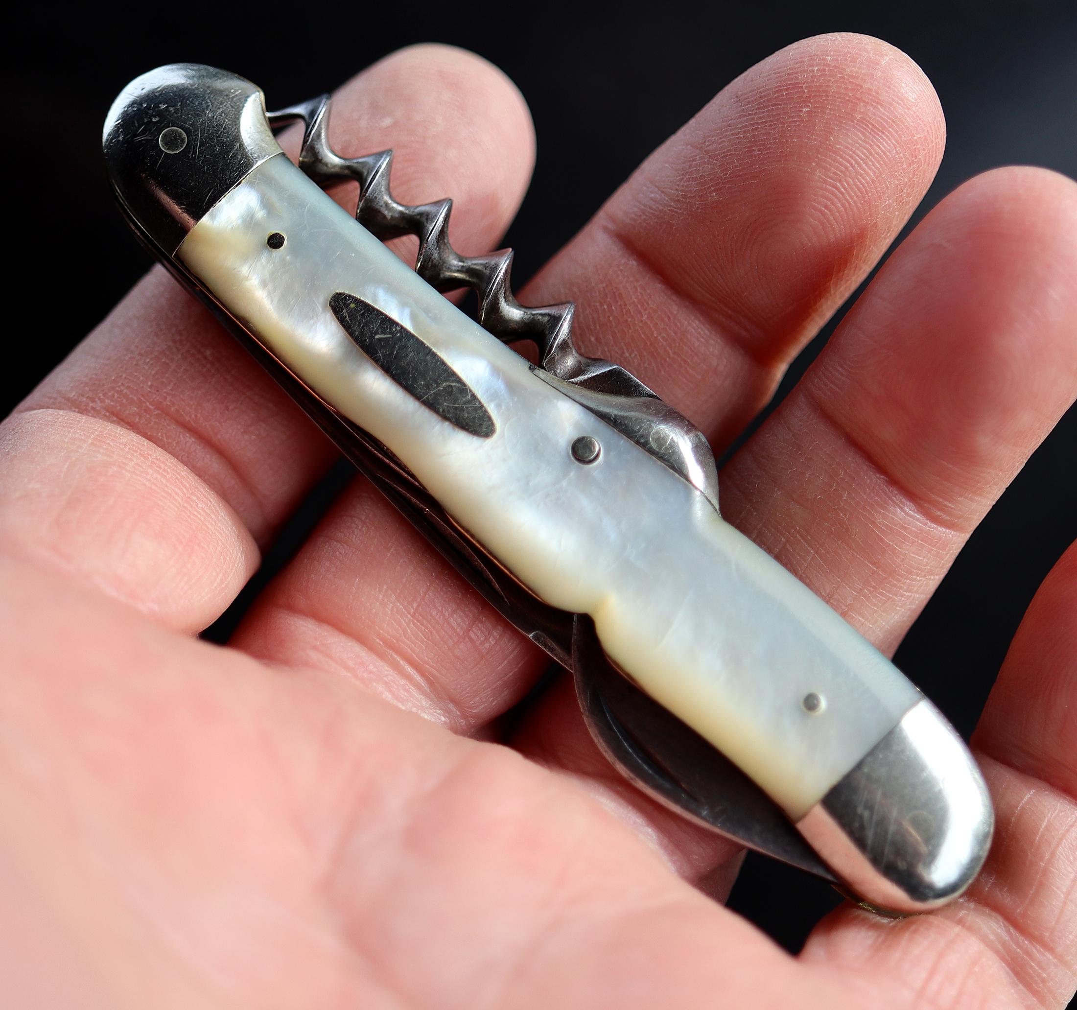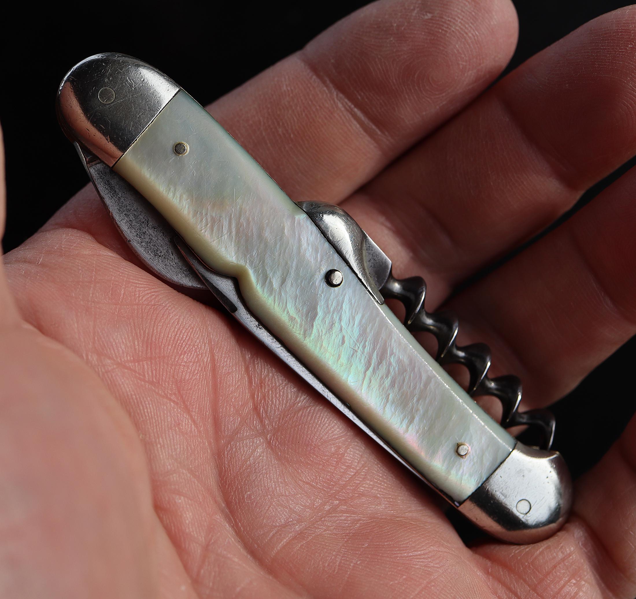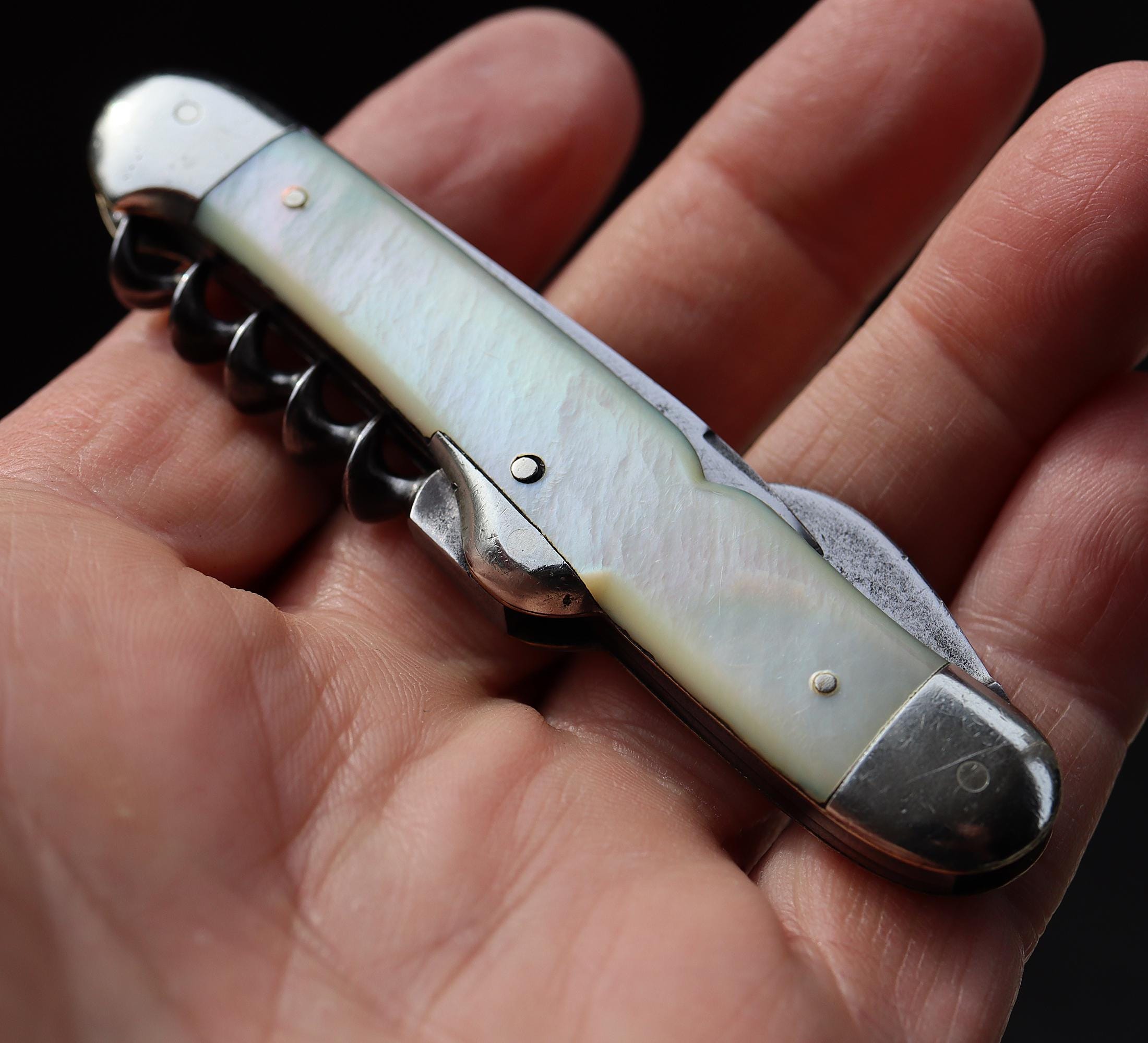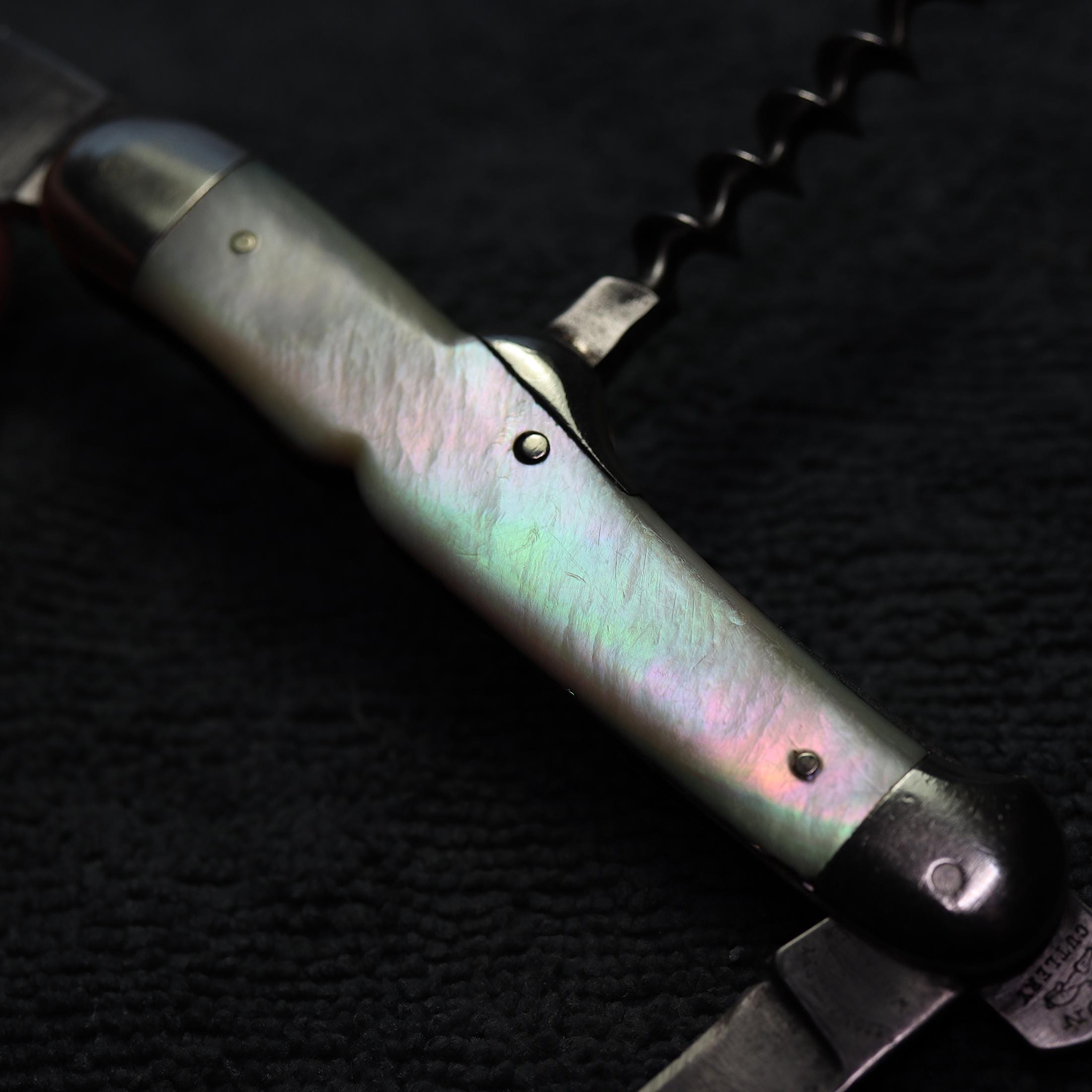 An early 4 blade pearl handle Bar knife Vom Cleff & Co. Germany. Lion Cutlery 1885-1926. Mother of Pearl scales are perfect no cracks no chips and great rainbow fire. All blades tang stamped, tight with good snap. All blades are complete with none broken. Rare to find in this condition. Made in Germany 1887-1926. Bench made in Germany. This is in great antique bar knife. How many bottles has this opened? USA SALE ONLY.