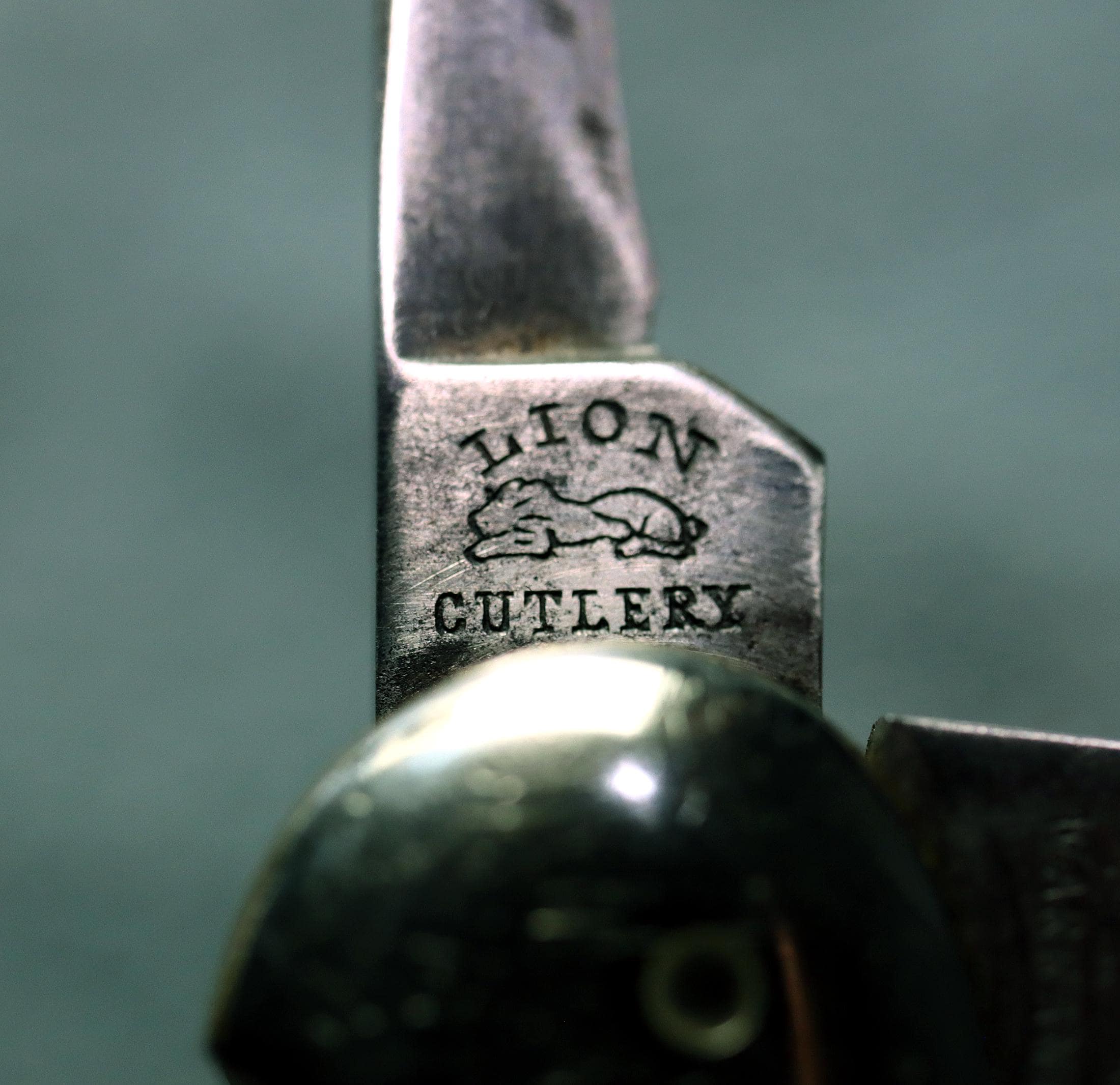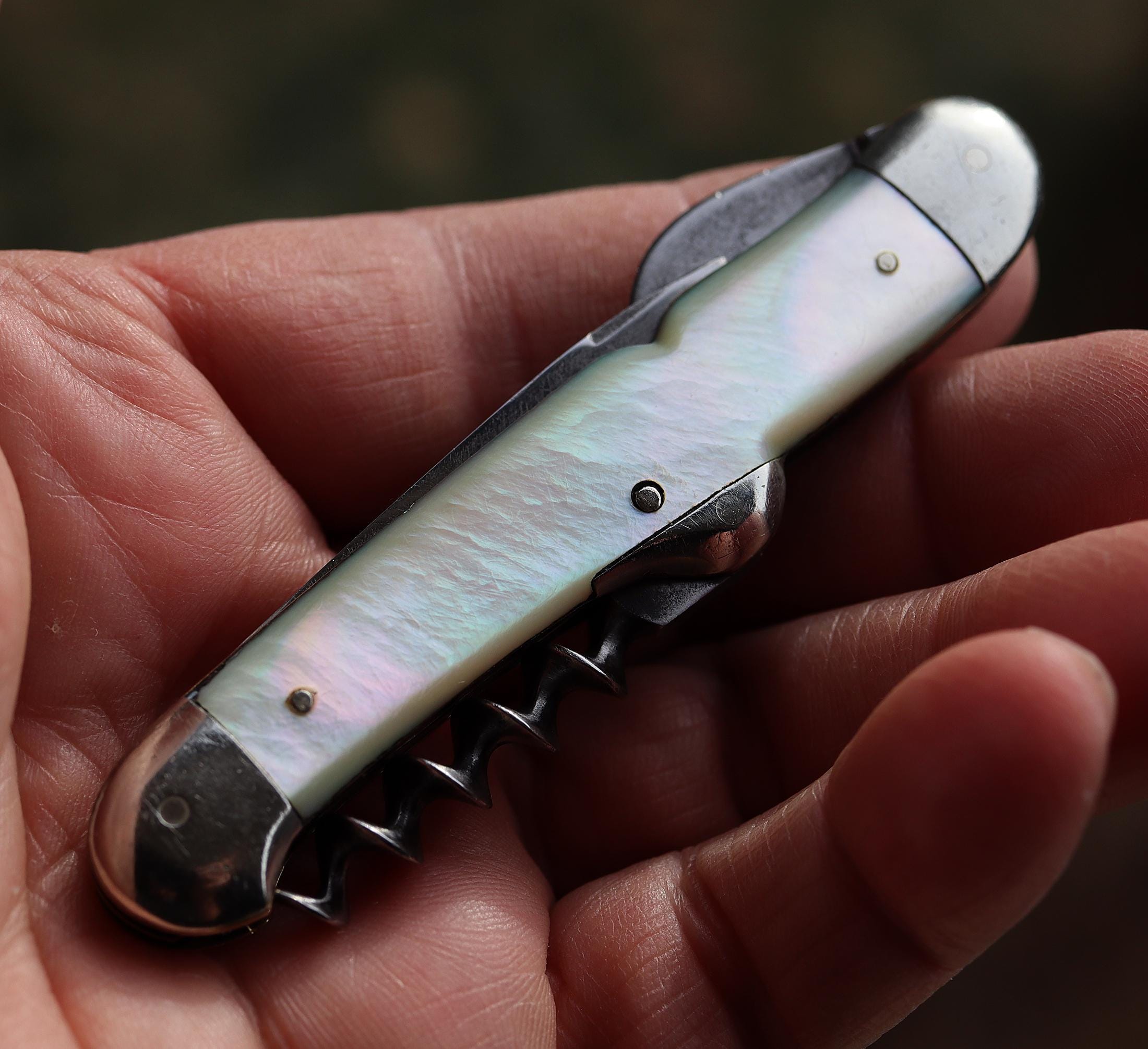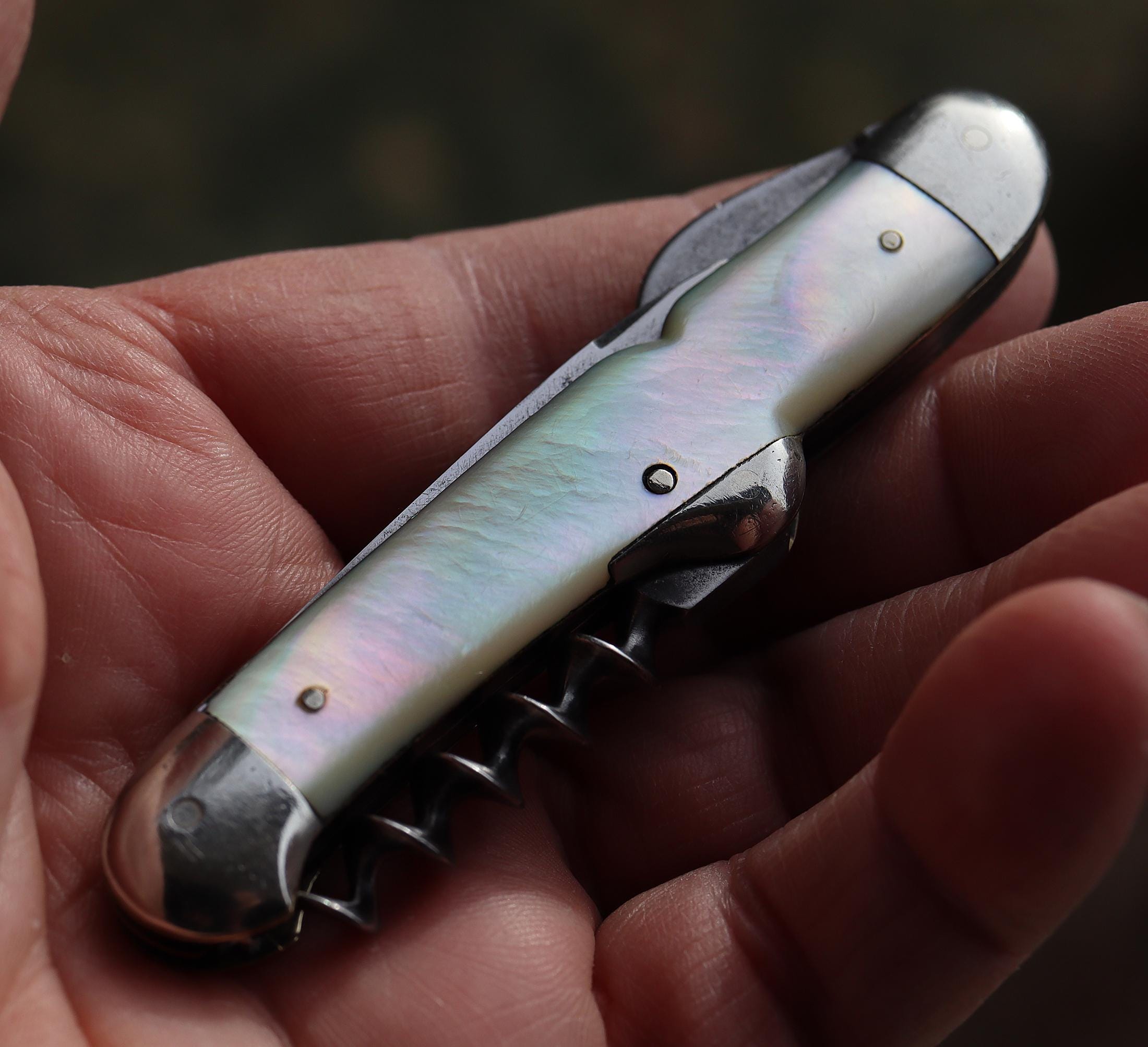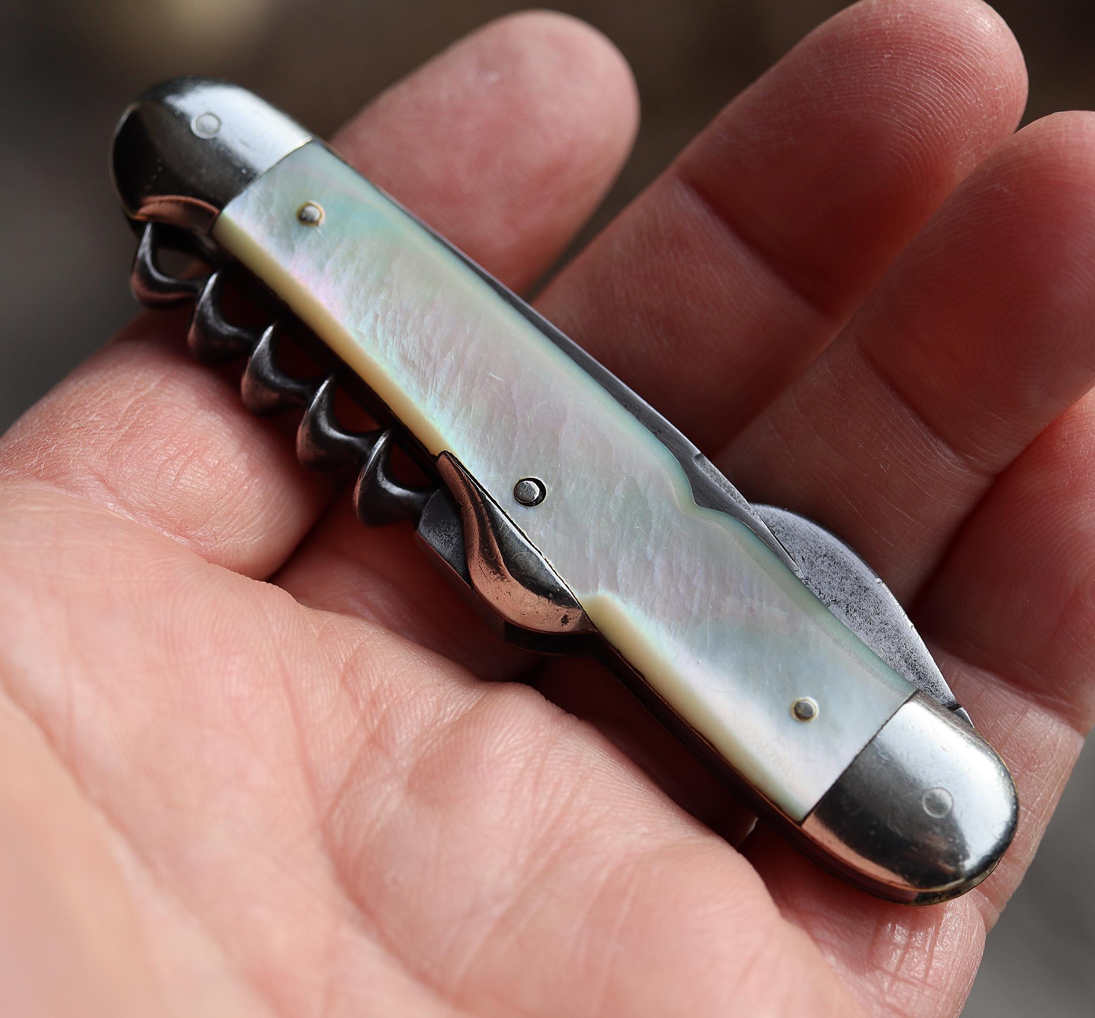 An early 4 blade pearl handle Bar knife Vom Cleff & Co. Germany. Lion Cutlery 1885-1926. Mother of Pearl scales are perfect no cracks no chips and great rainbow fire. All blades tang stamped, tight with good snap. All blades are complete with none broken. Rare to find in this condition. Made in Germany 1887-1926. Bench made in Germany. This is in great antique bar knife. How many bottles has this opened? USA SALE ONLY.