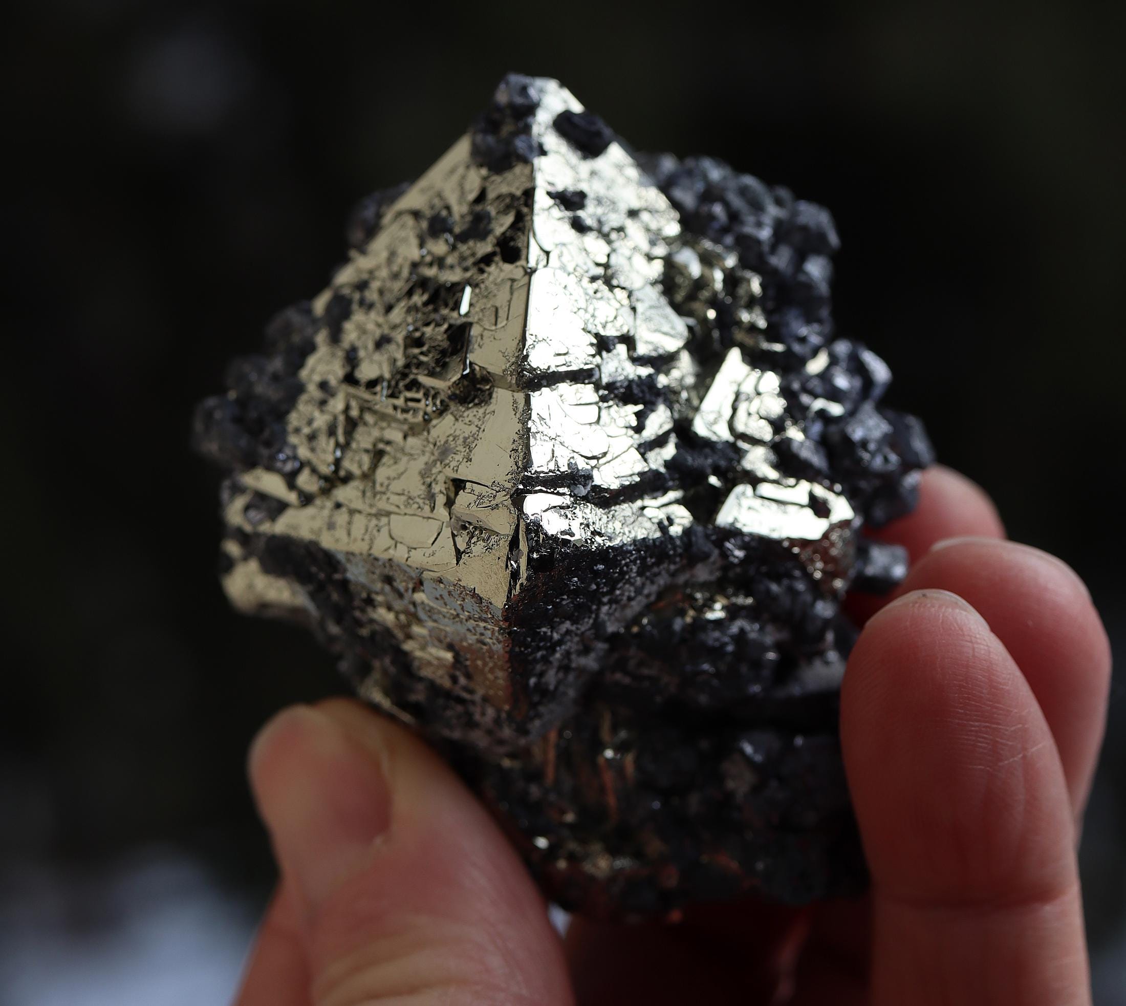 Offering a lustrous Octahedral Crystal Pyrite with Galena. Sharp well formed crystals in excellent no damage condition. Shows beautifully with the back being a detach area. Interesting complex growth on all surfaces. Mined Huanzala mine, Huallanca, Bolognesi Prov., Ancash, Peru. This one is screaming for a custom base. Not a common specimen. 2.75 inch tall by 2.25 wide. 252 grams. Write us about overseas sales