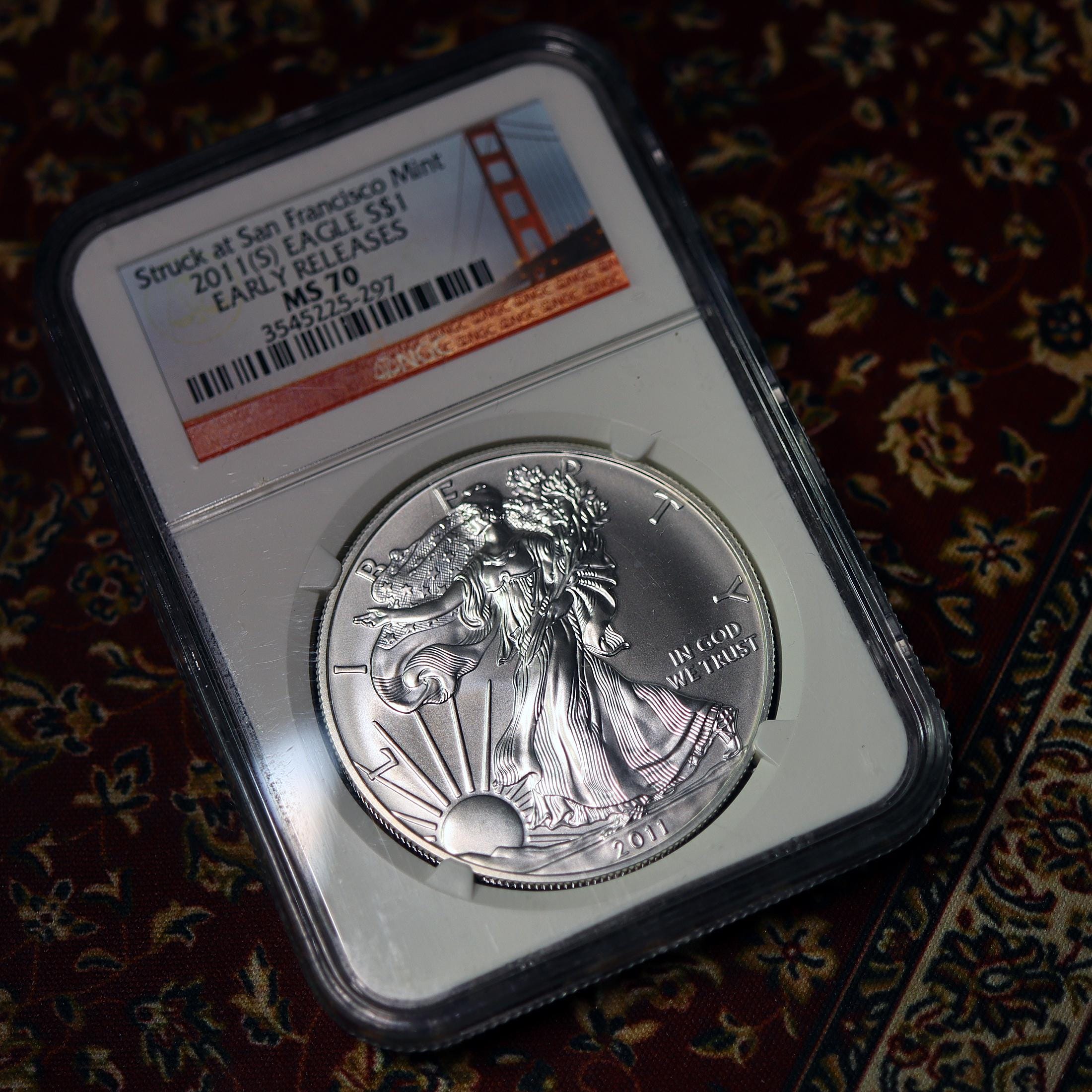 The 2011 S American Silver Eagle $1 Coin is a highly sought-after coin for collectors due to its stunning design and pristine condition, certified by NGC as MS 70 Early RELEASES. San Francisco Mint. With the certification from NGC, collectors can be assured of the coin's authenticity and quality, making it a prized possession for any numismatist. Note any scratching seen is on the outside case from lighting, the coin is perfect.