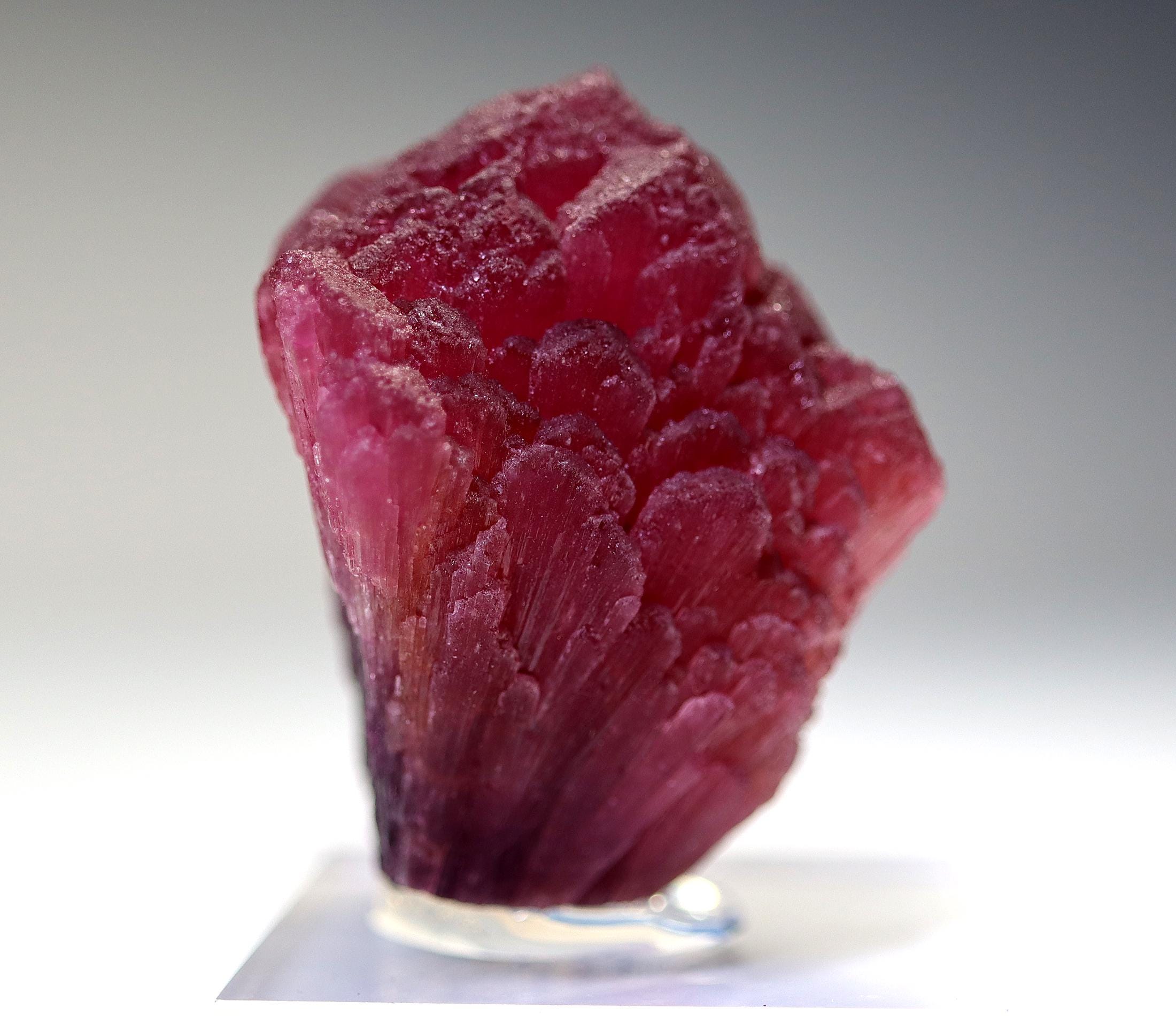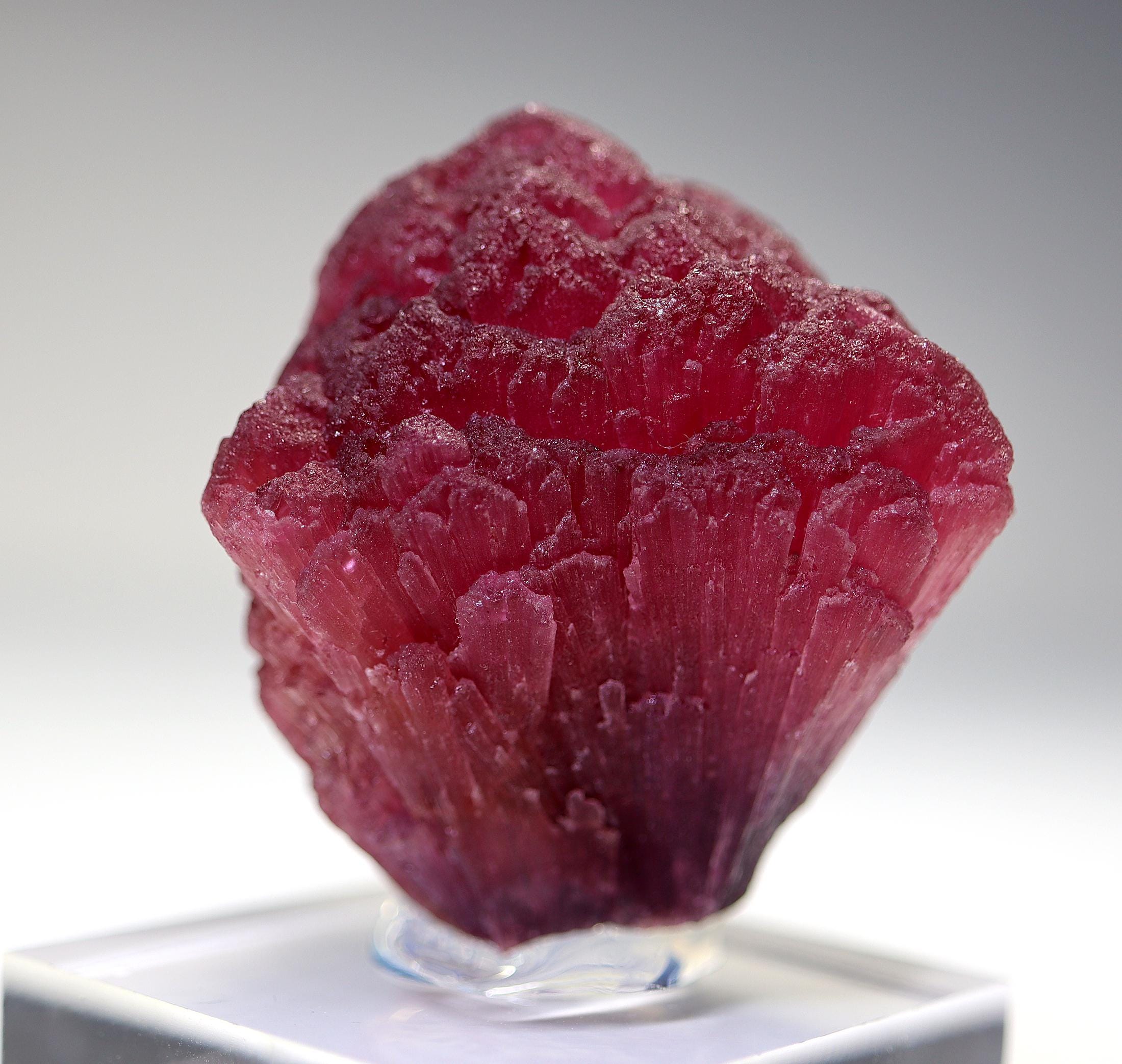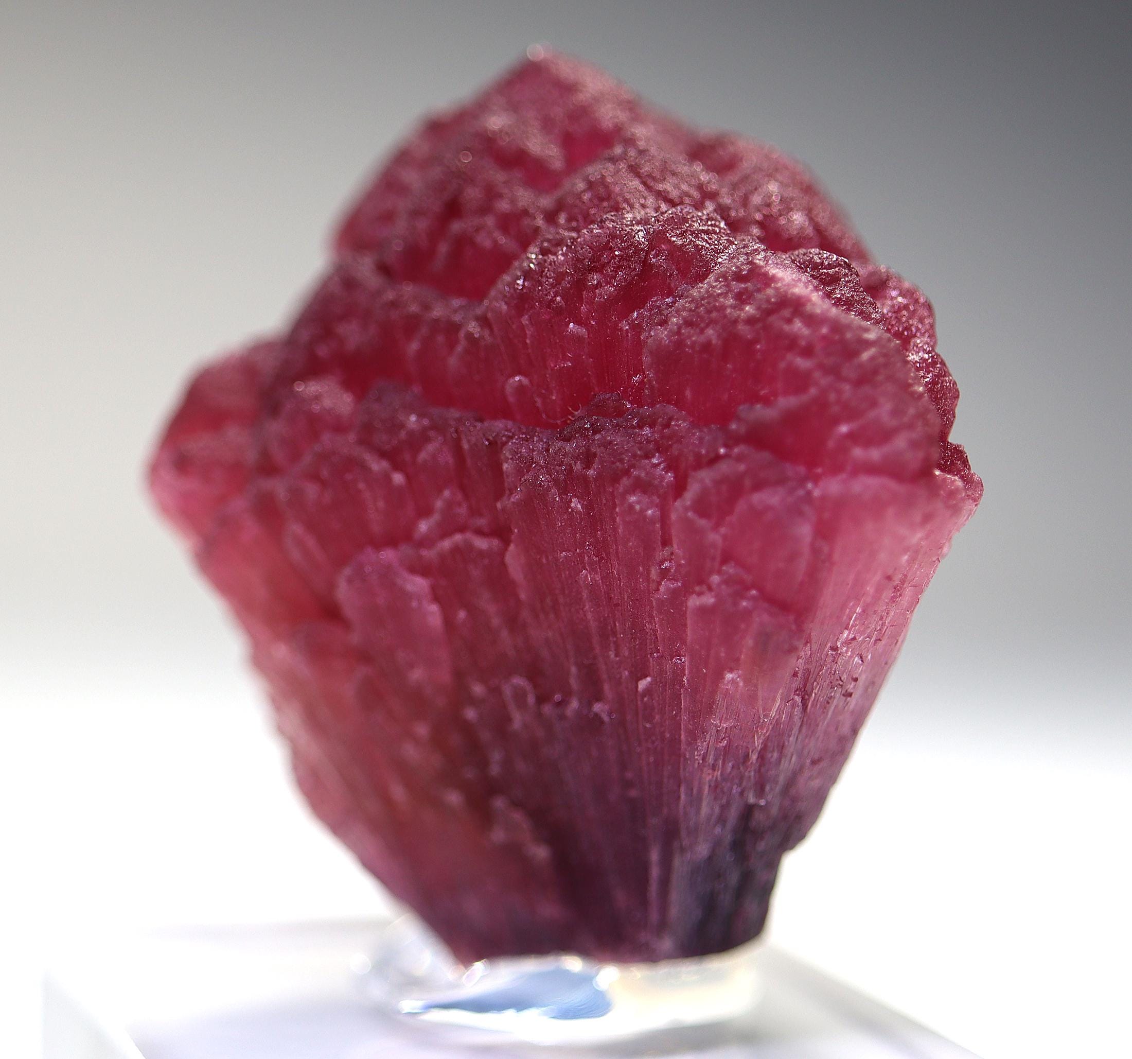 Offering a large perfect shape all around Rubellite crystal. Known as Mushroom Tourmaline by some. Shape is classic every side with no fractured areas as many are. No scuffing. Color is excellent with photos shot under a desk lamp. The crystal will come hot glued to a thick Lucite base. Weight is about 70 grams on this rubellite. Mined Khetchel, Malo, Burma. 43 mm tall by 47 mm wide by 38 mm.