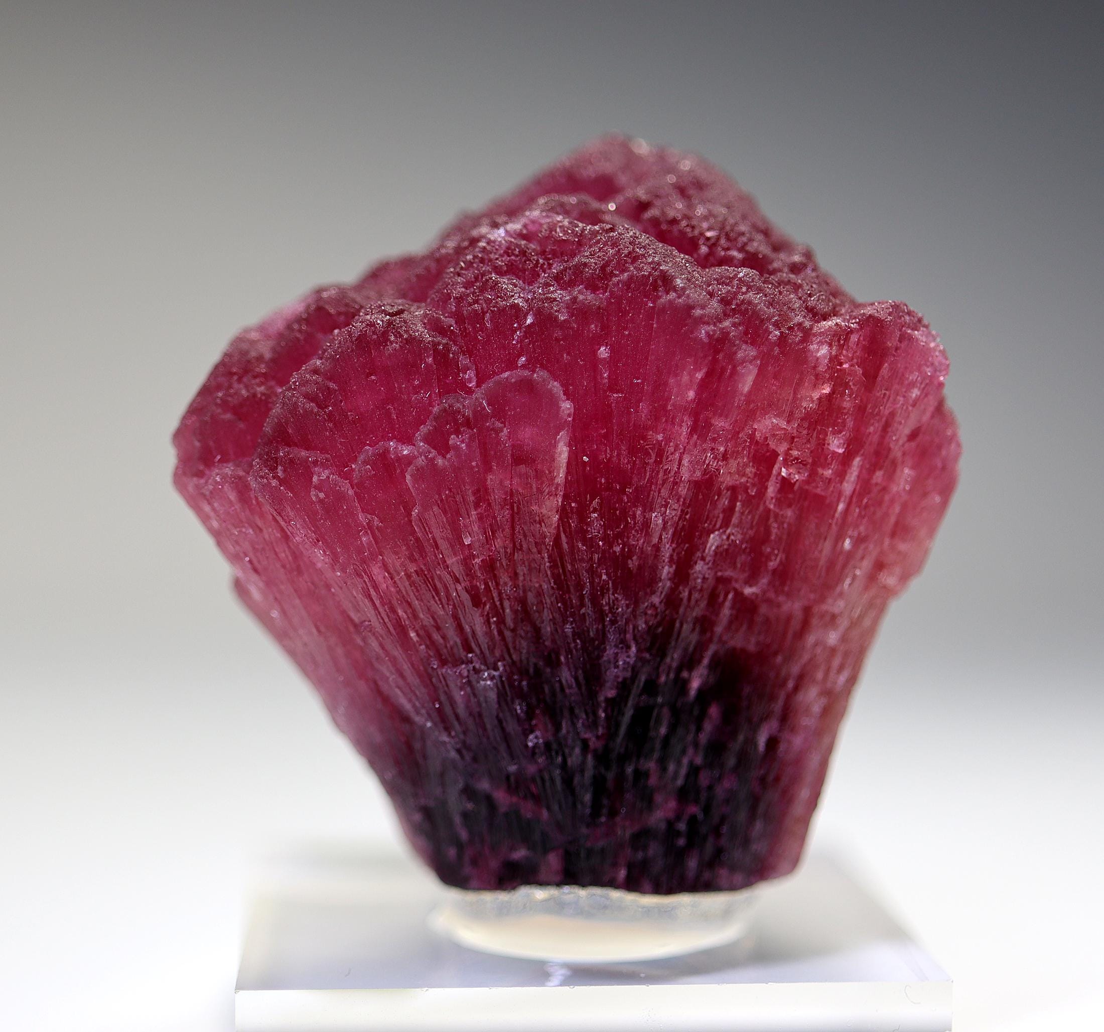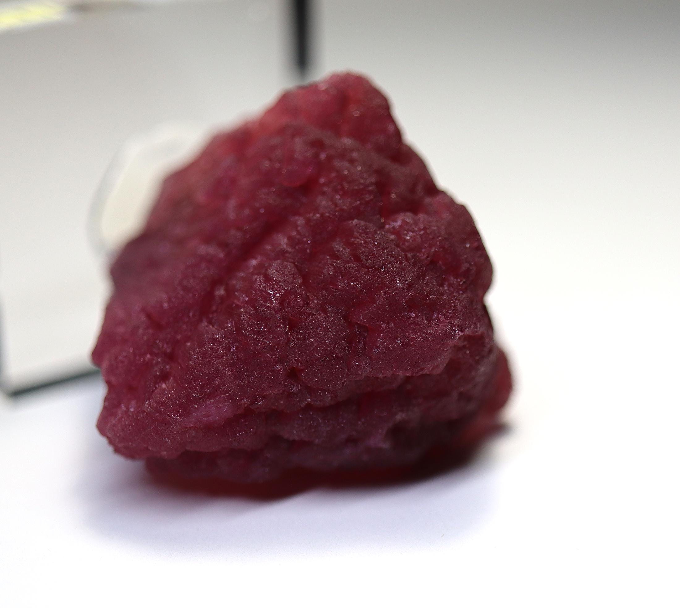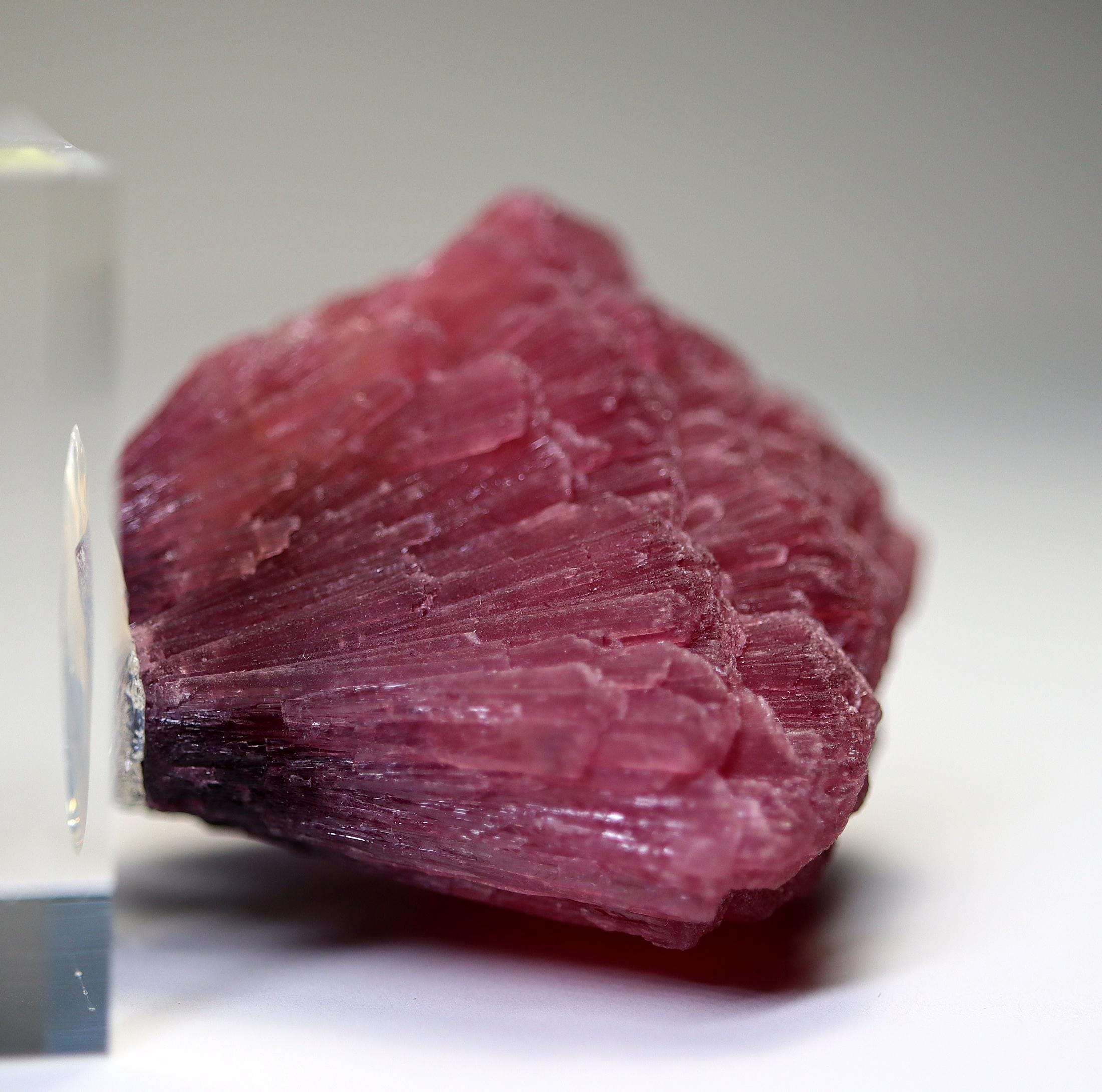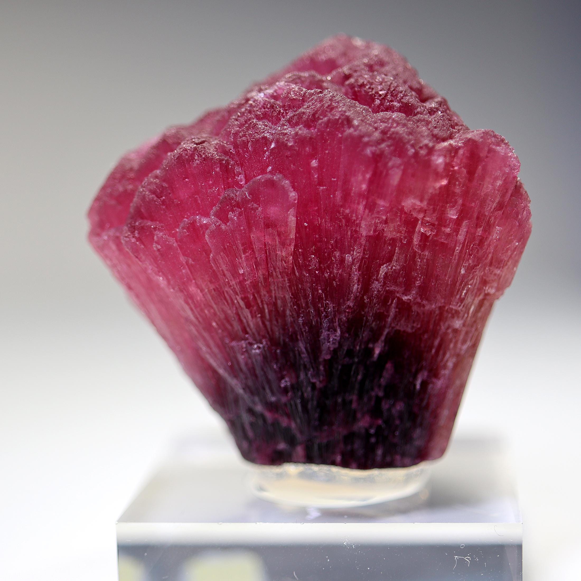 Offering a large perfect shape all around Rubellite crystal. Known as Mushroom Tourmaline by some. Shape is classic every side with no fractured areas as many are. No scuffing. Color is excellent with photos shot under a desk lamp. The crystal will come hot glued to a thick Lucite base. Weight is about 70 grams on this rubellite. Mined Khetchel, Malo, Burma. 43 mm tall by 47 mm wide by 38 mm.