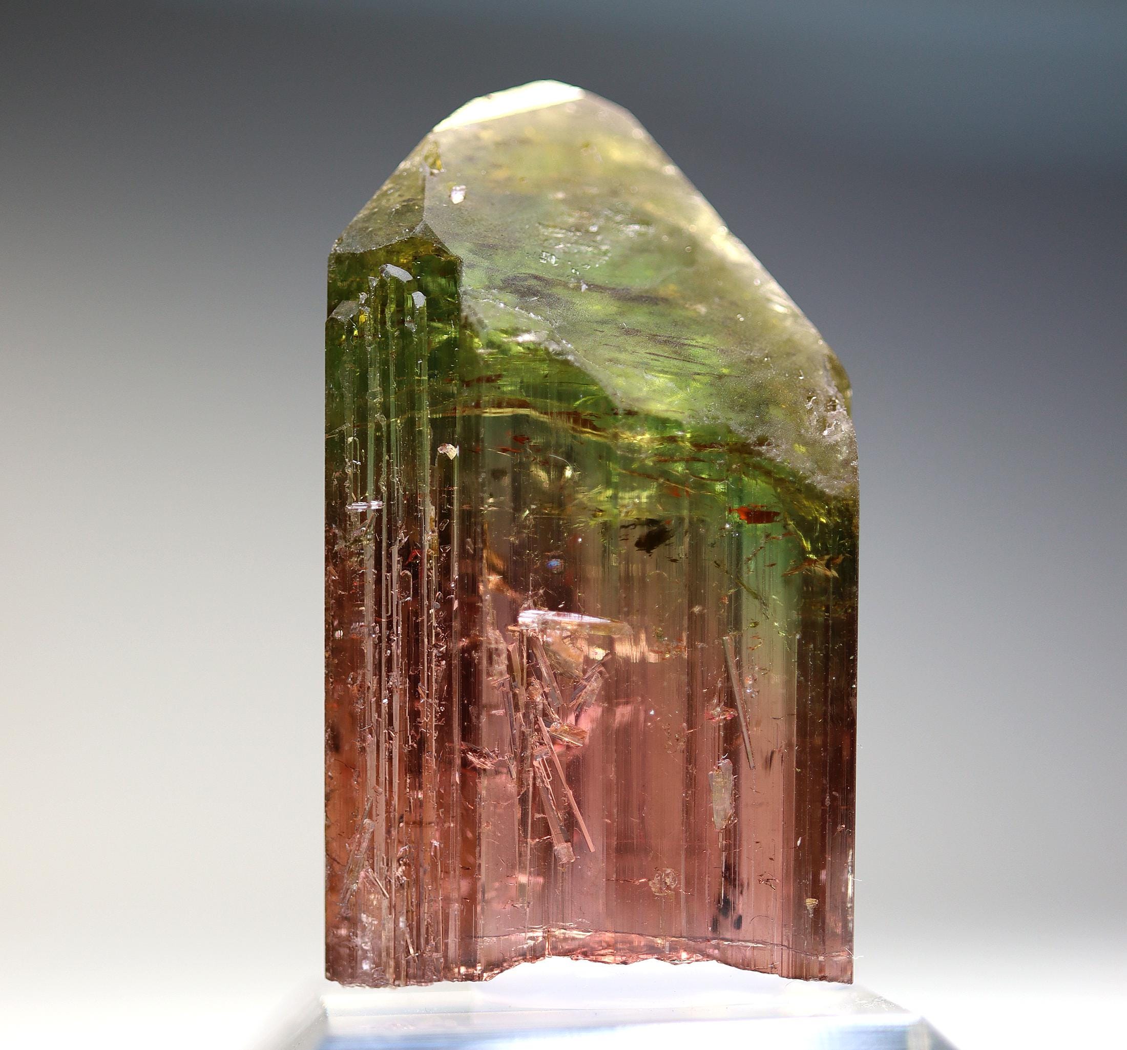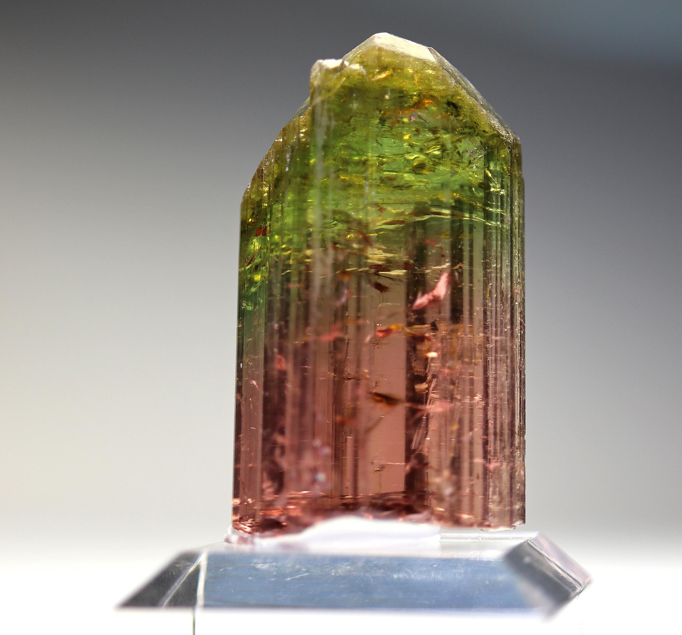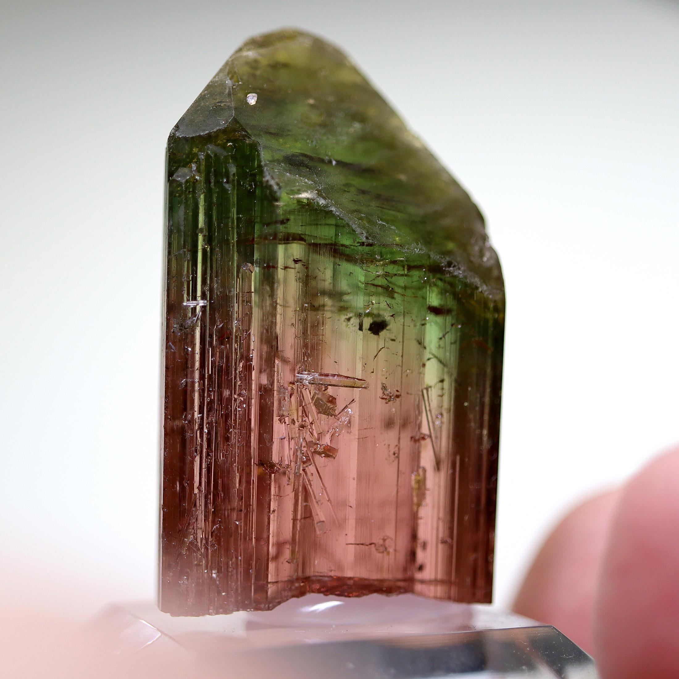 offering a high quality gem Tourmaline. Excellent Luster and transparency. Color is true to our photos. No chipping. Nuaparra Pegmatite, Alto Molocue District, Zambezia Prov., Mozambique. Aprox. 50 grams. Comes hot glued on a thick Lucite base. Excellent gemstone. USA sale only