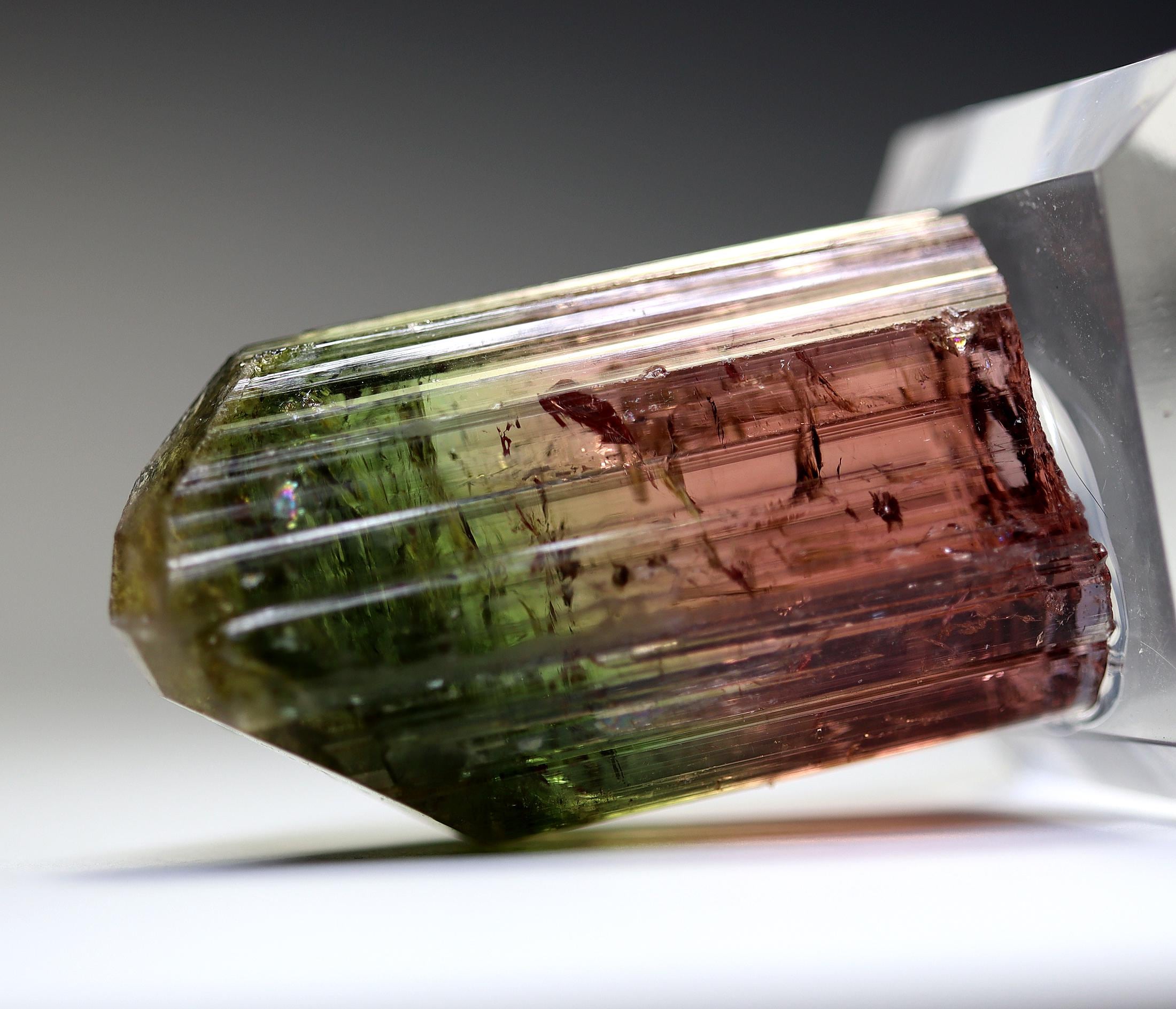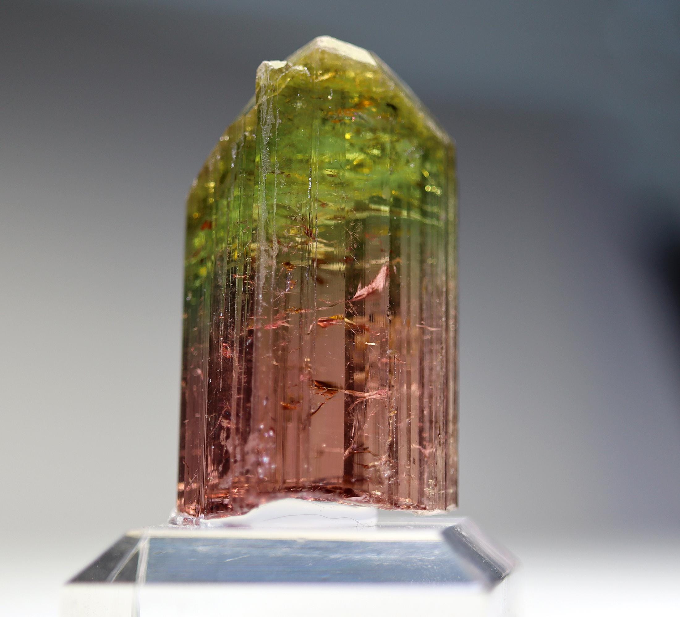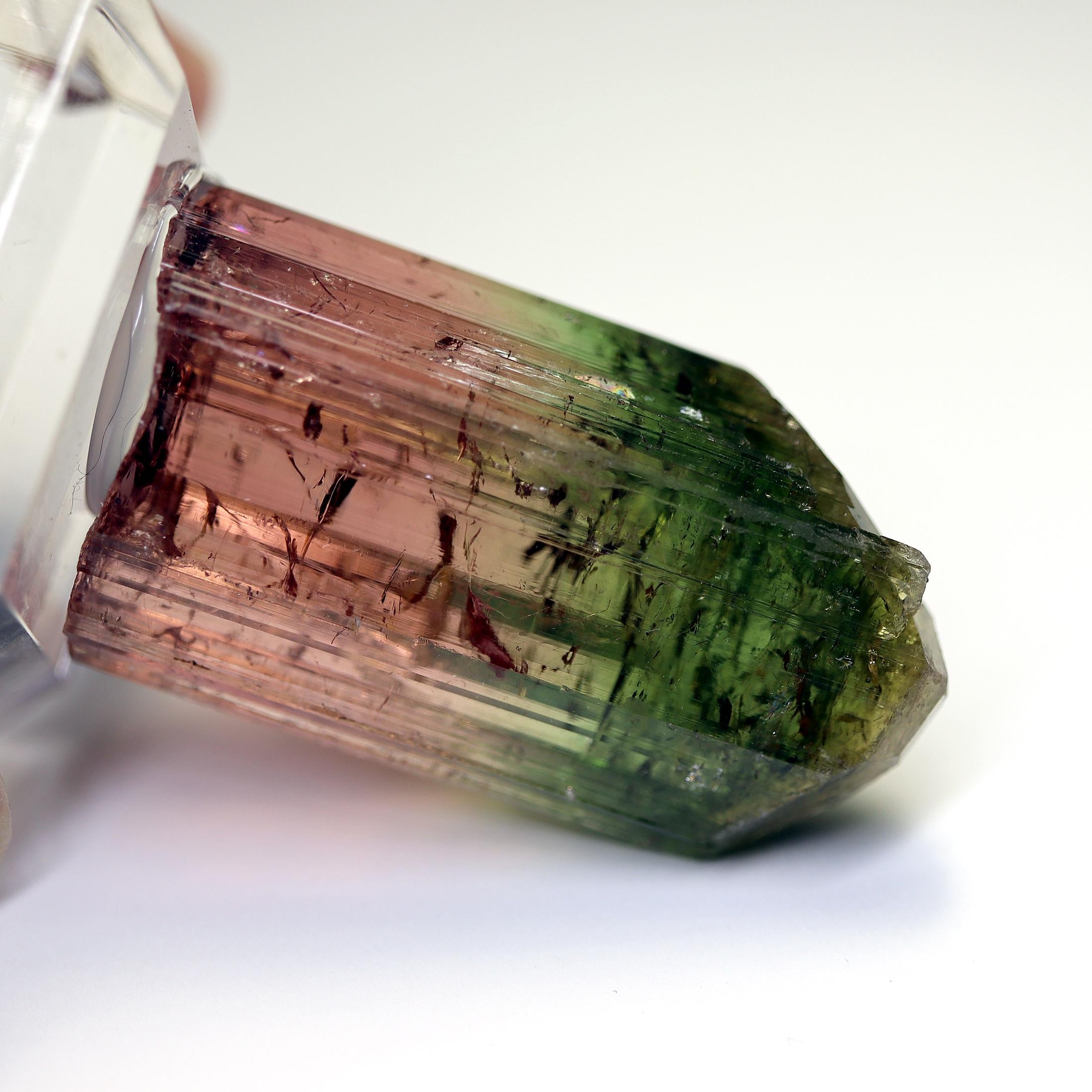 offering a high quality gem Tourmaline. Excellent Luster and transparency. Color is true to our photos. No chipping. Nuaparra Pegmatite, Alto Molocue District, Zambezia Prov., Mozambique. Aprox. 50 grams. Comes hot glued on a thick Lucite base. Excellent gemstone. USA sale only