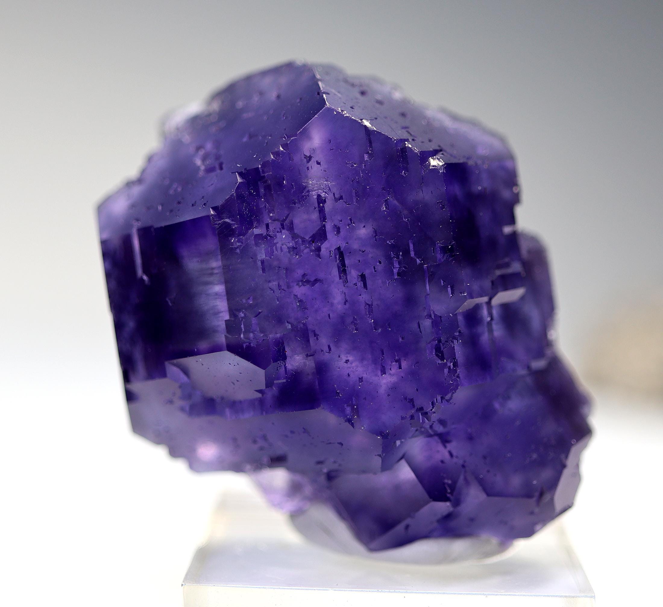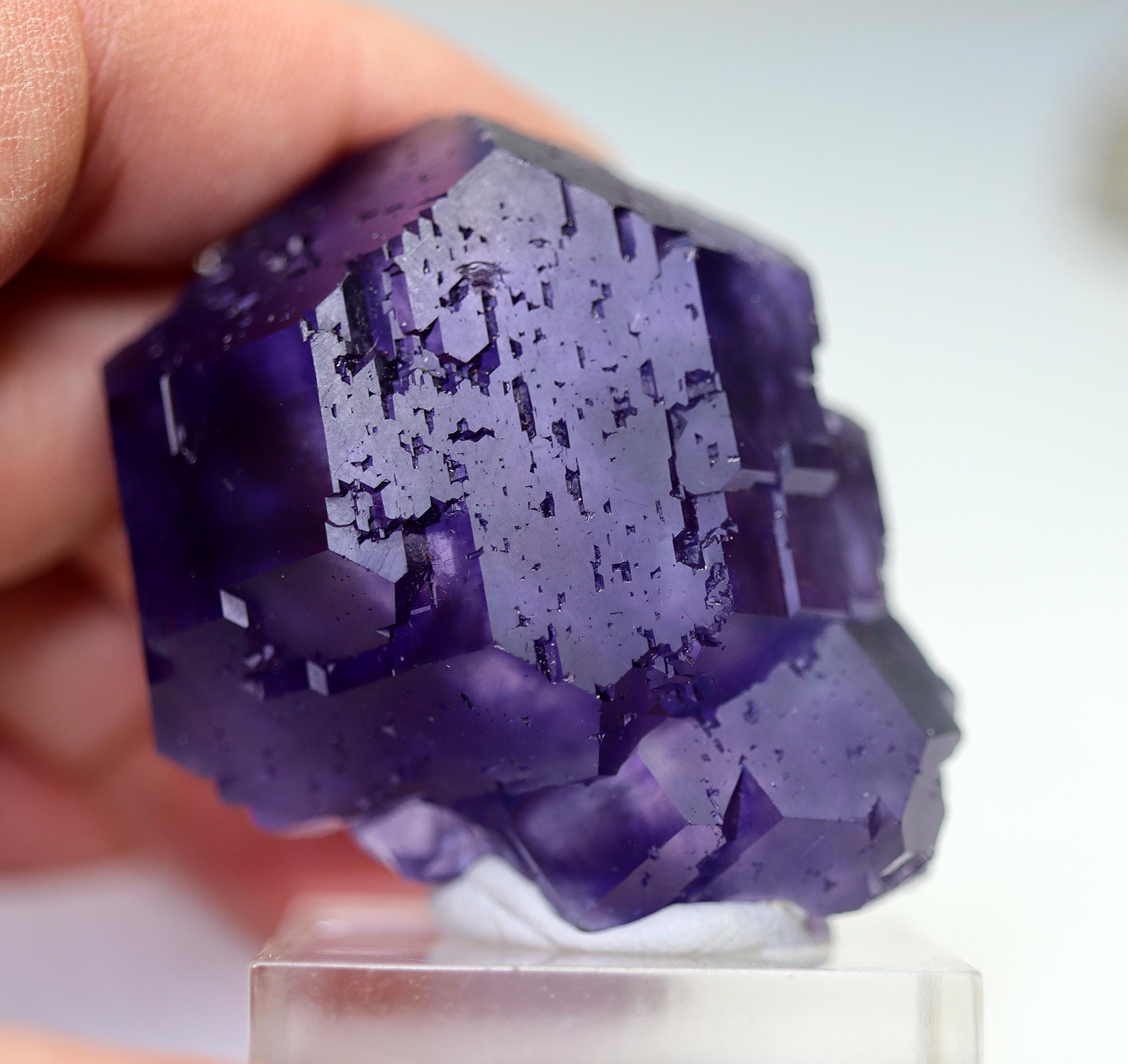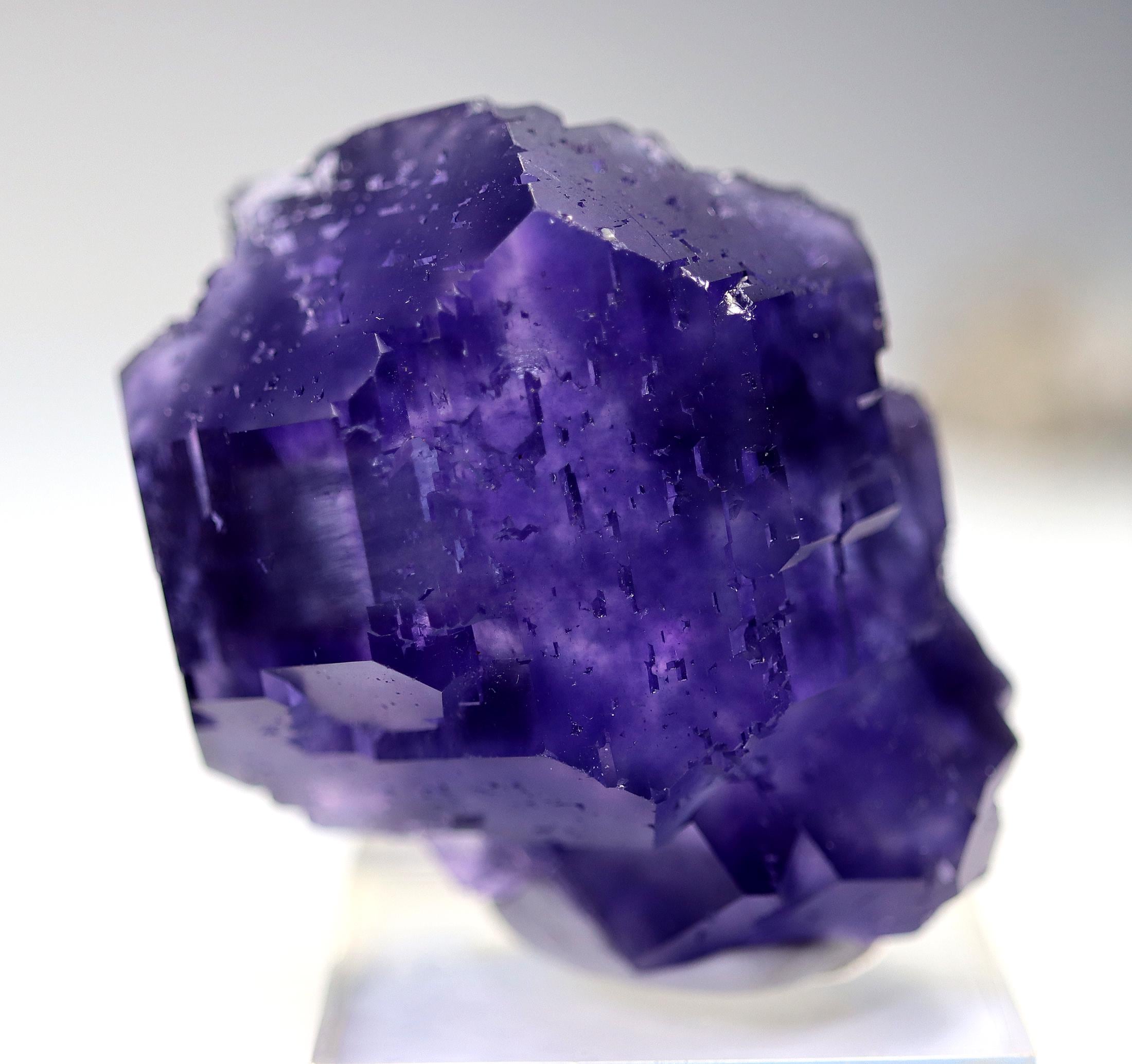 Offering a classic "Tanzanite" Fluorite. Yongchun Co., Quanzhou, Fujian, China. Ex Don Olson collection so its a great specimen for those that know Don. Color and form is spot on. No damage noted. 55 mm by 46 mm. Base shown included. Don's label included with his collection note at back.