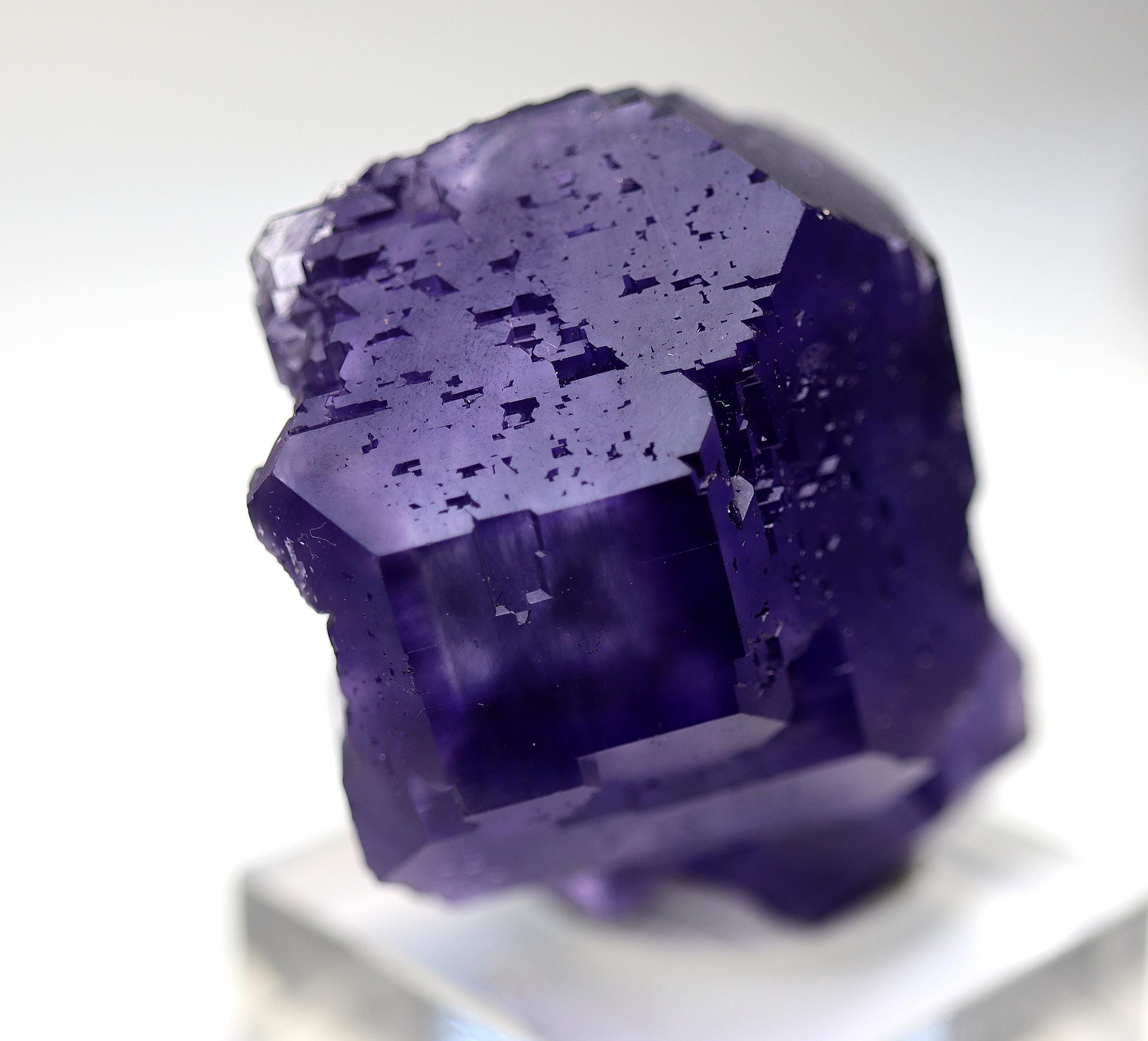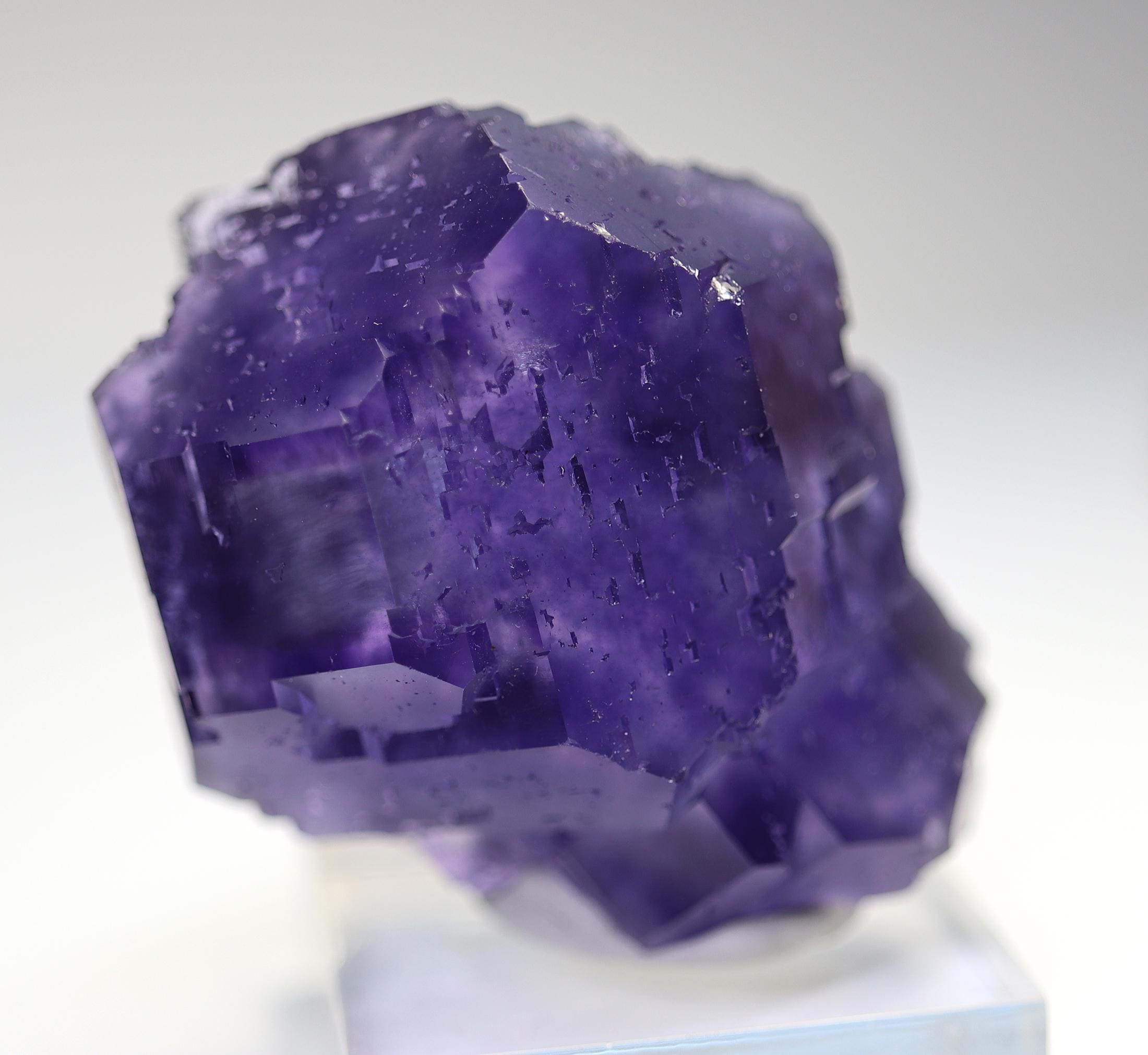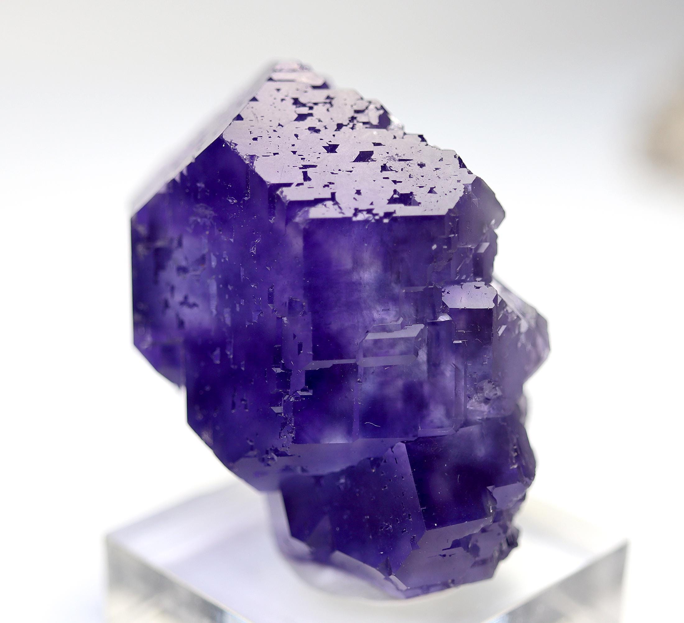 Offering a classic "Tanzanite" Fluorite. Yongchun Co., Quanzhou, Fujian, China. Ex Don Olson collection so its a great specimen for those that know Don. Color and form is spot on. No damage noted. 55 mm by 46 mm. Base shown included. Don's label included with his collection note at back.