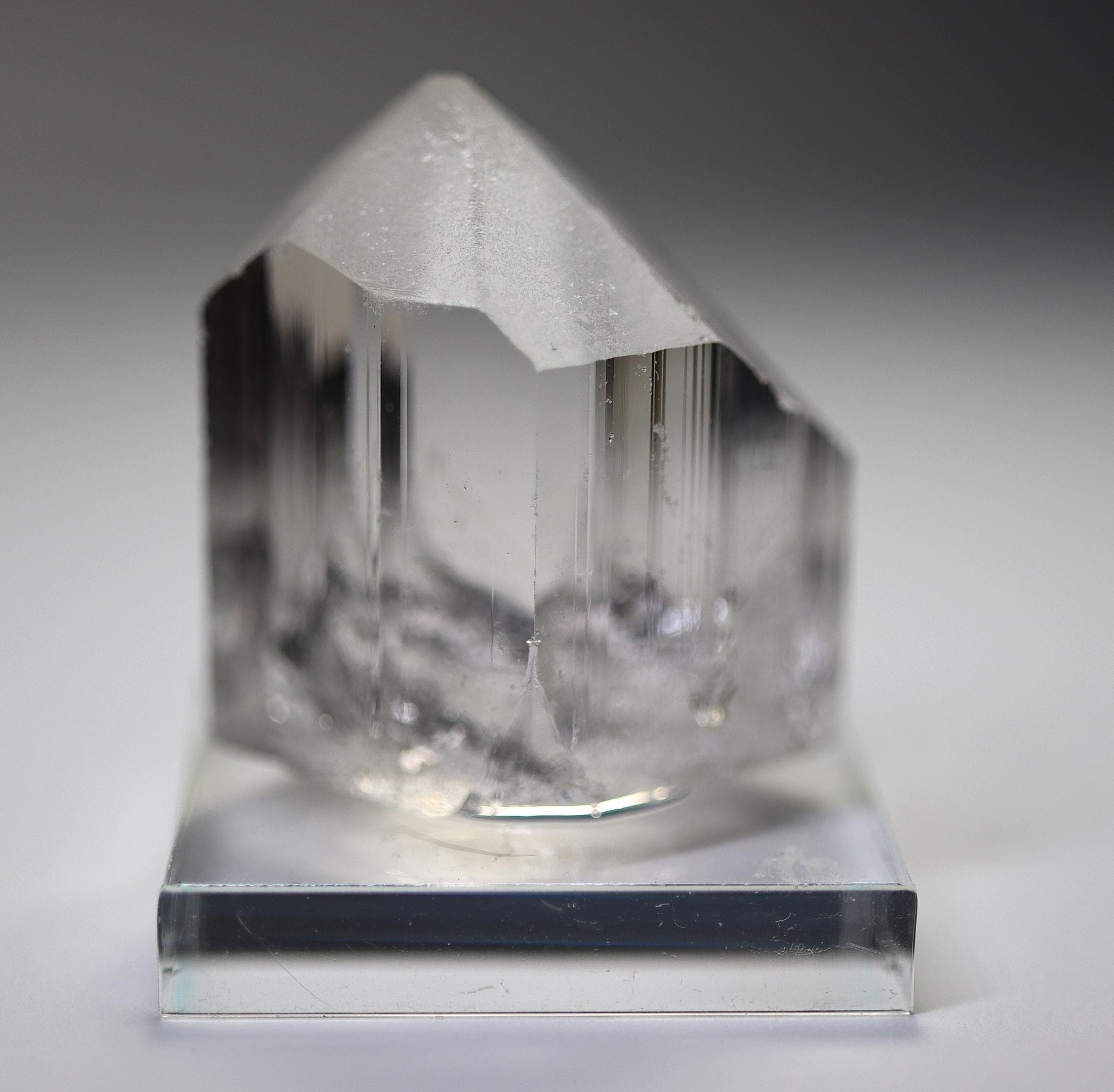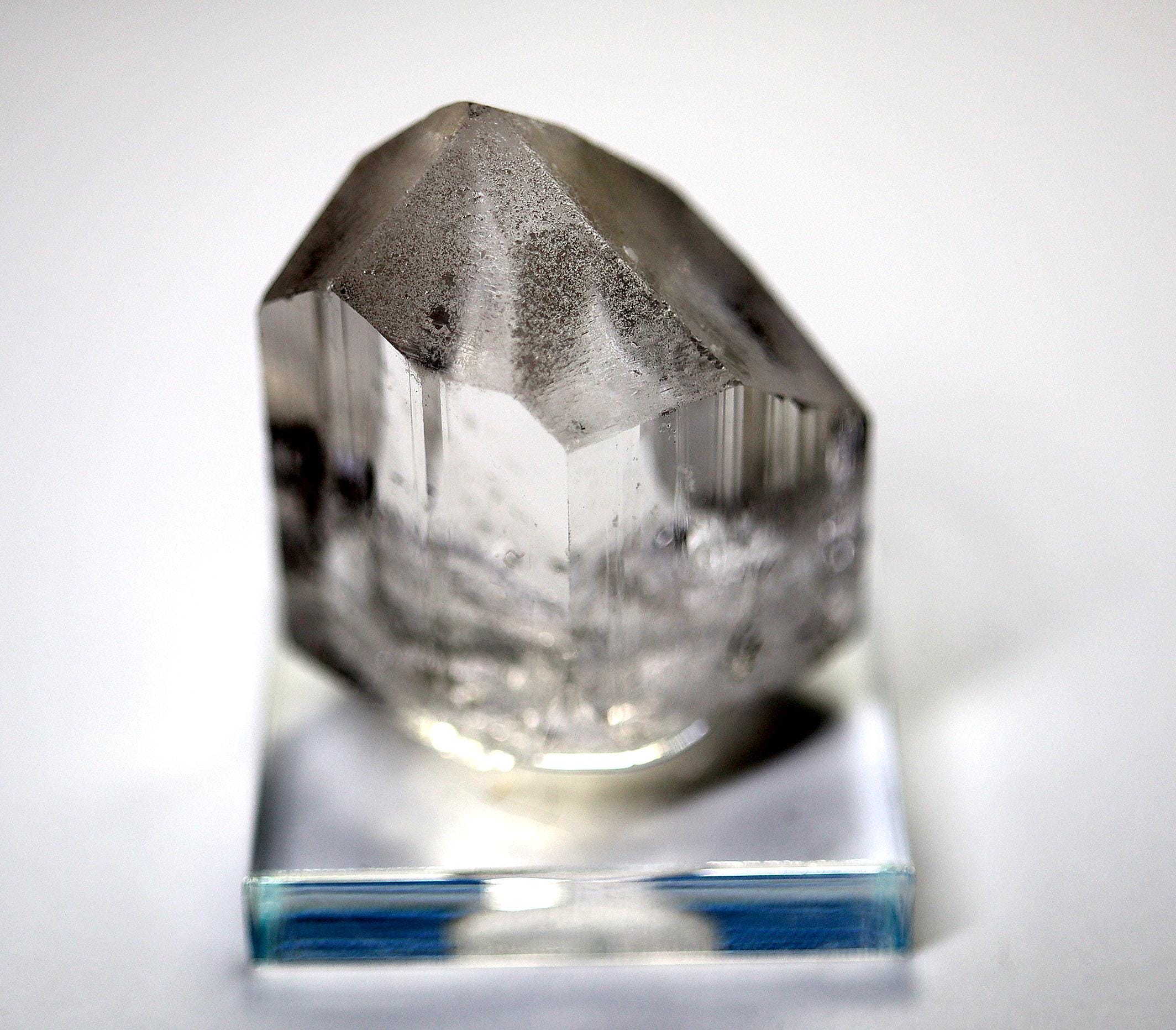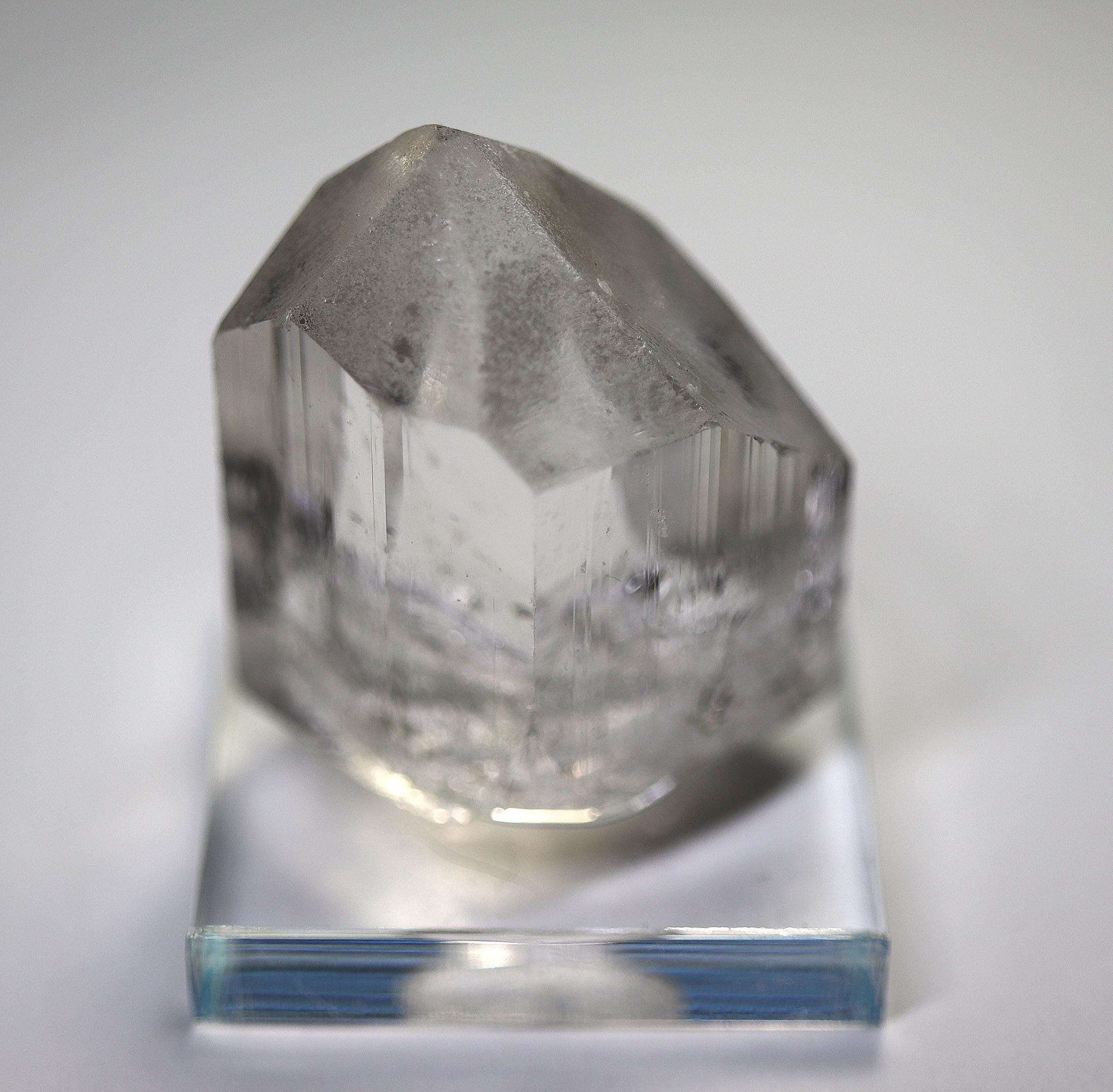 Offering a Gem colorless Topaz crystal. Clear as ice. Sharp well formed termination with a touch of etching. Highly lustrous sides. No damage but for a detach point at bottom back. Mined Pan-taw (Pandaw), Kyatpyin North, Mogok Township, Pyin-Oo-Lwin District, Mandalay Region, Myanmar. Comes mounted on a Lucite base. 40.04 total grams including the base. 31 mm wide by 31 mm tall by 21 mm deep. Facet grade crystal. Overseas ships Etsy shipping ONLY