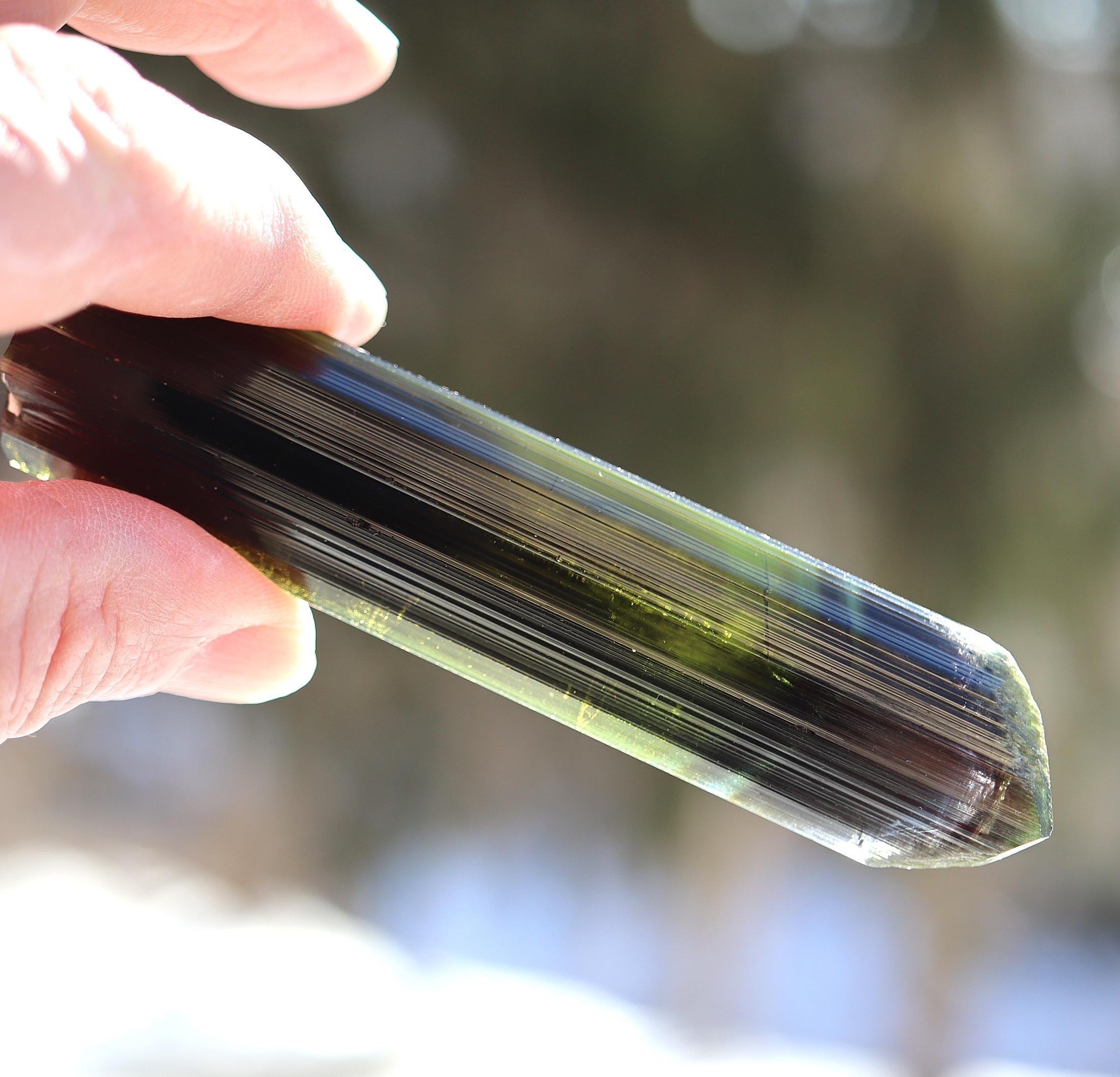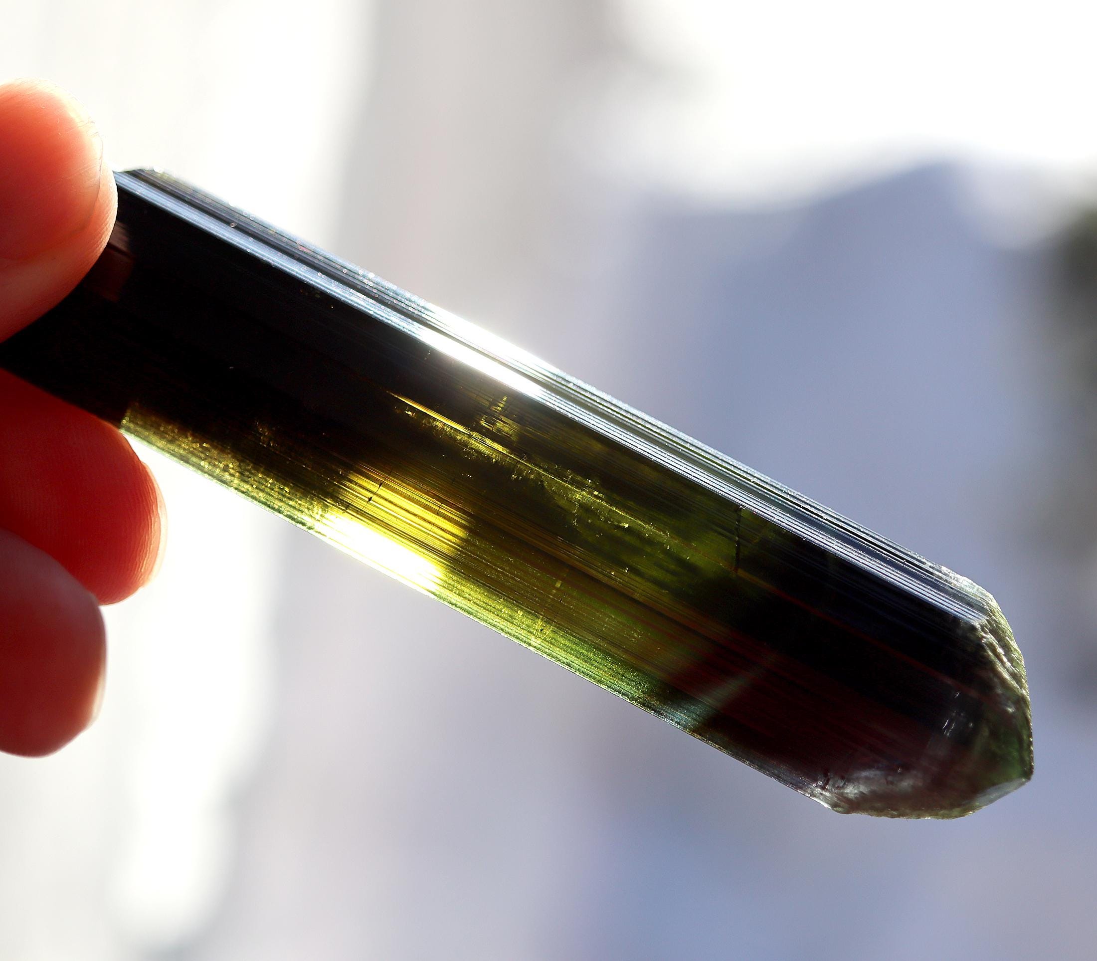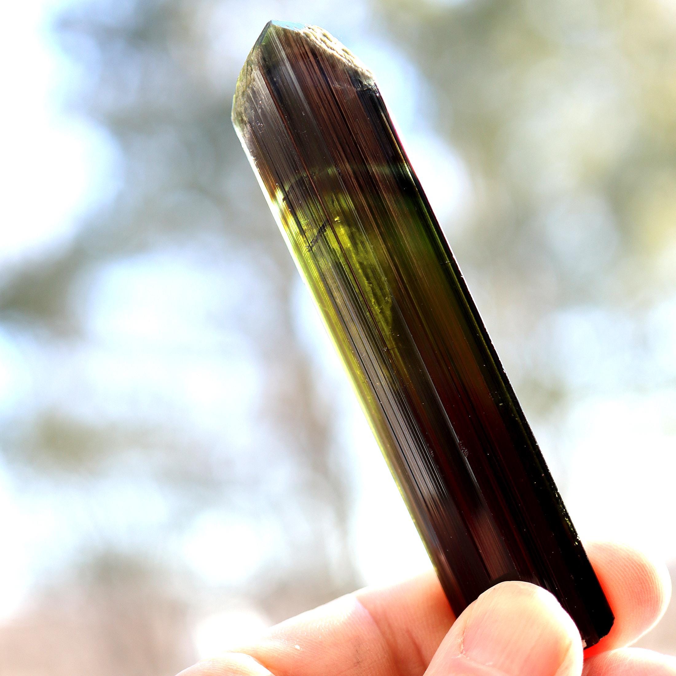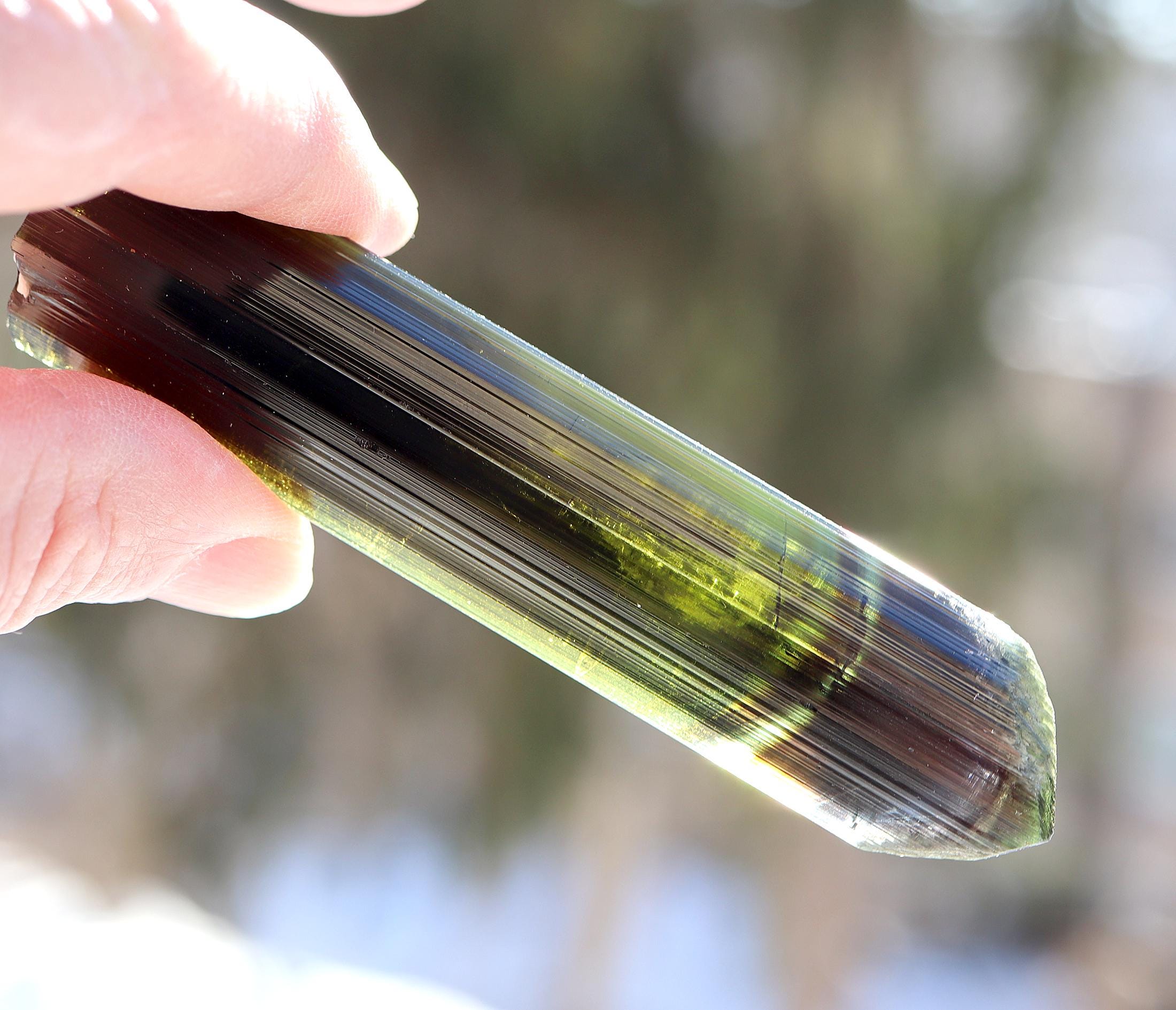 Offering a lustrous Tabby Tourmaline. No repairs no damage. Deep green to lighter green to a phantom of blue towards the termination. Mined Santa Rosa mine, Itambacuri, Minas Gerais, Brazil 10.79 cm. 4.25 inch by 1 inch wide by 3/8 inch thick. Solid crystal no cracks. Weight 44.38 grams.