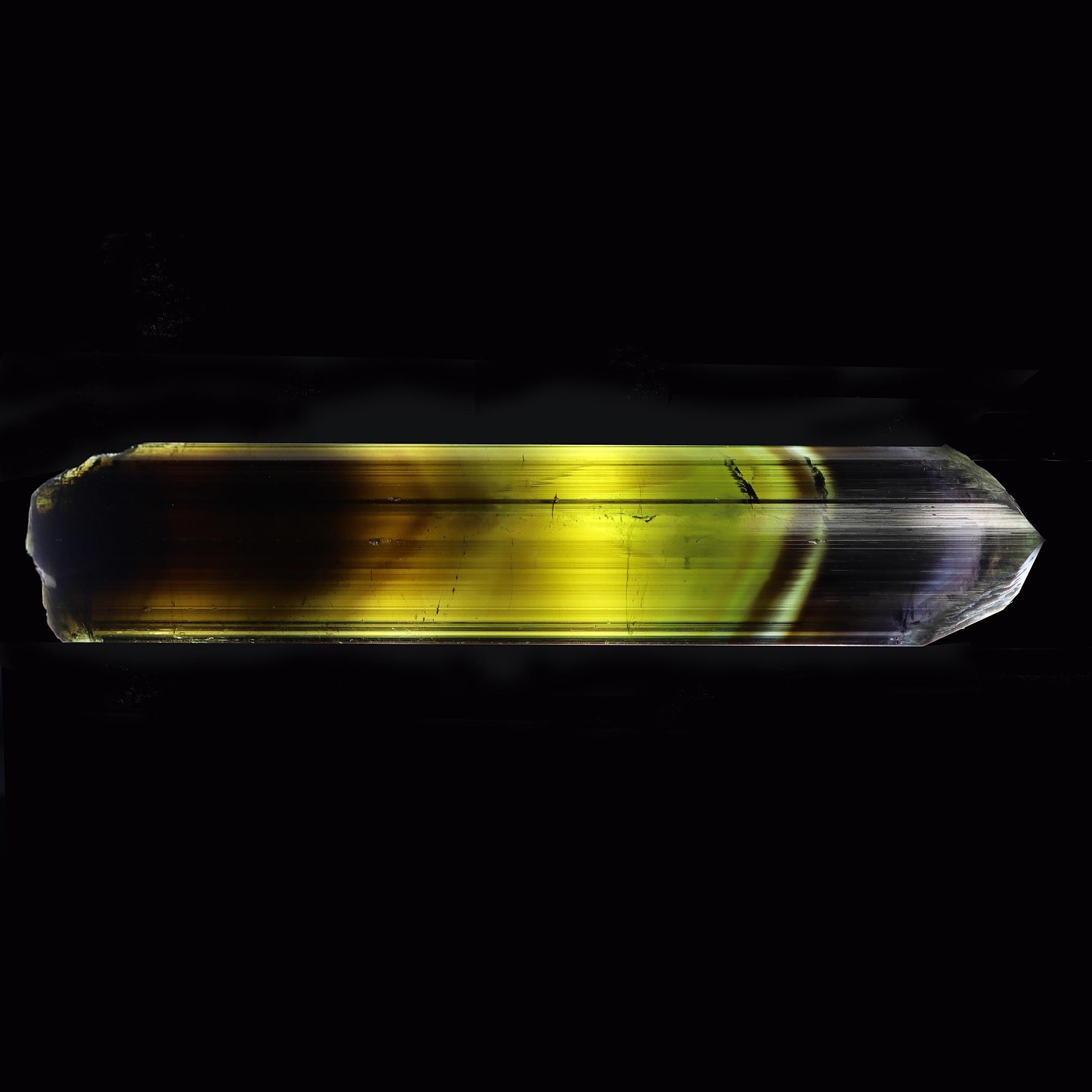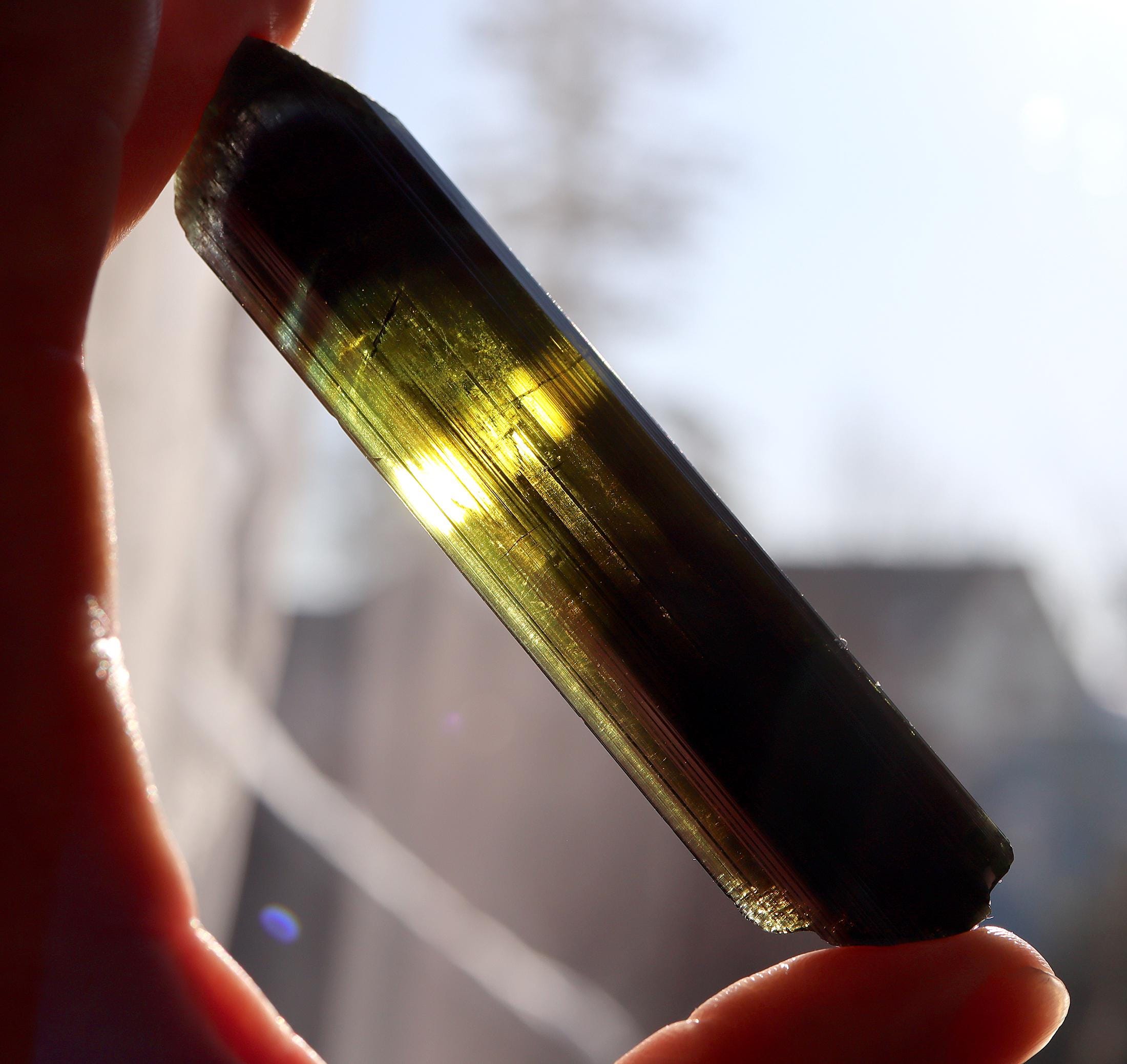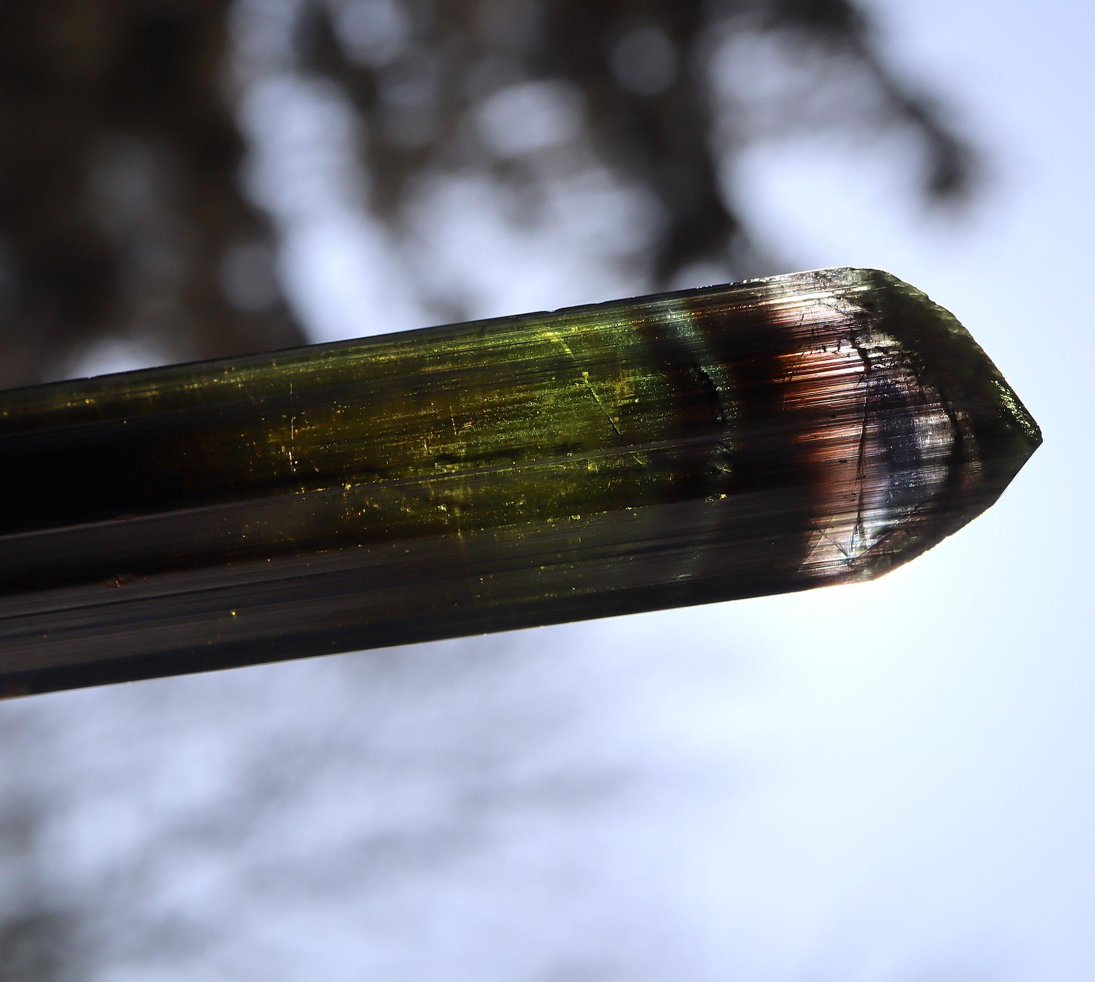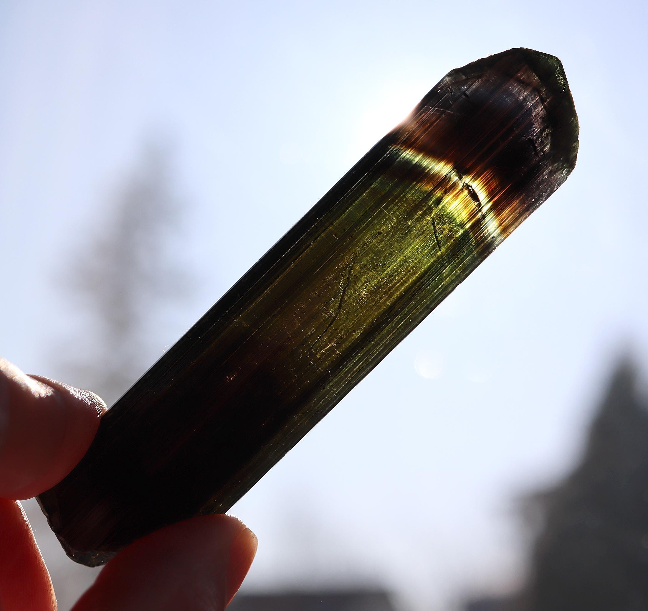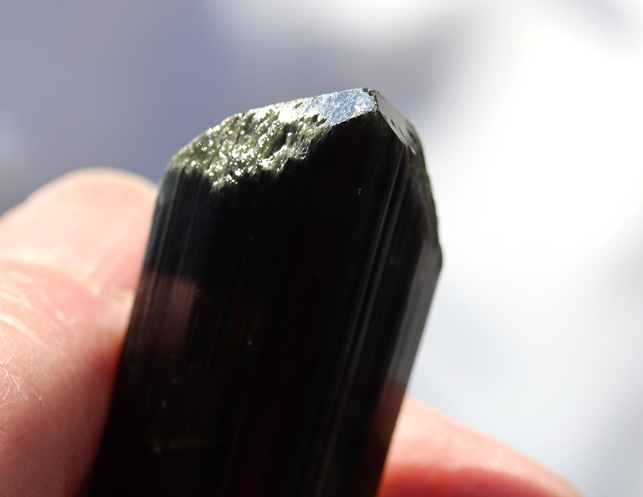 Offering a lustrous Tabby Tourmaline. No repairs no damage. Deep green to lighter green to a phantom of blue towards the termination. Mined Santa Rosa mine, Itambacuri, Minas Gerais, Brazil 10.79 cm. 4.25 inch by 1 inch wide by 3/8 inch thick. Solid crystal no cracks. Weight 44.38 grams.