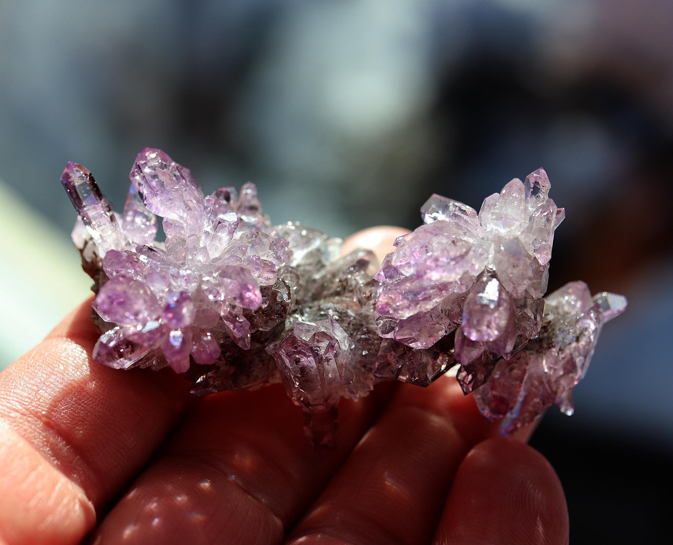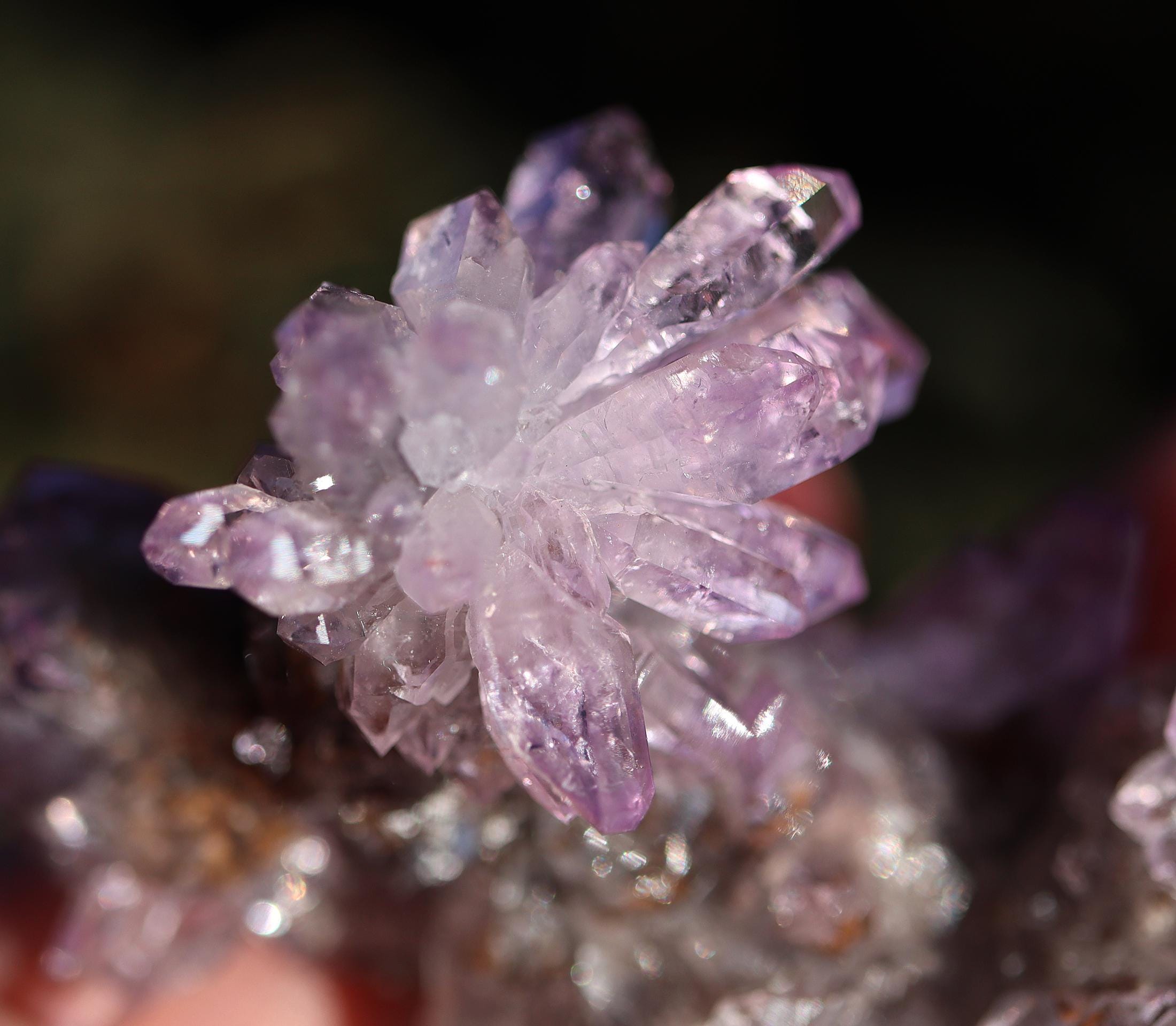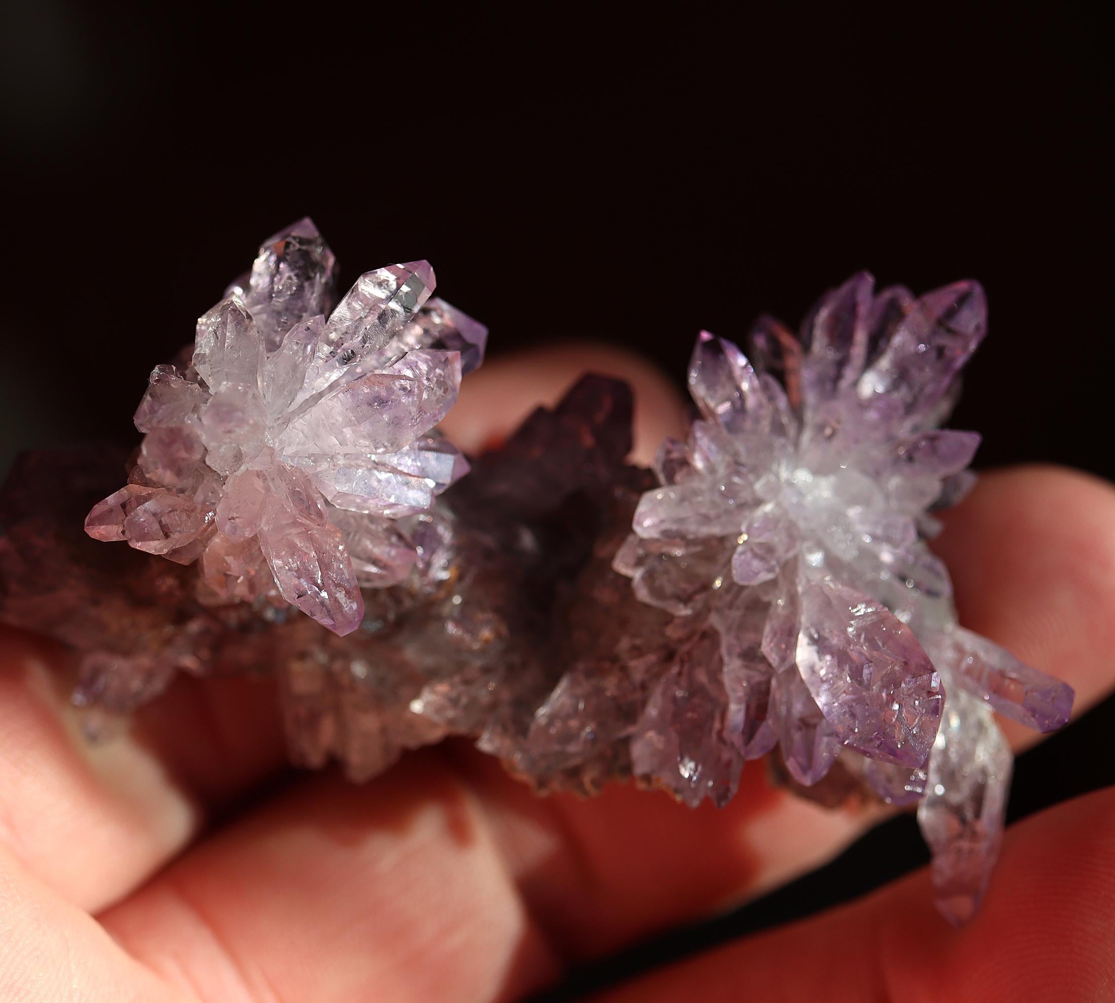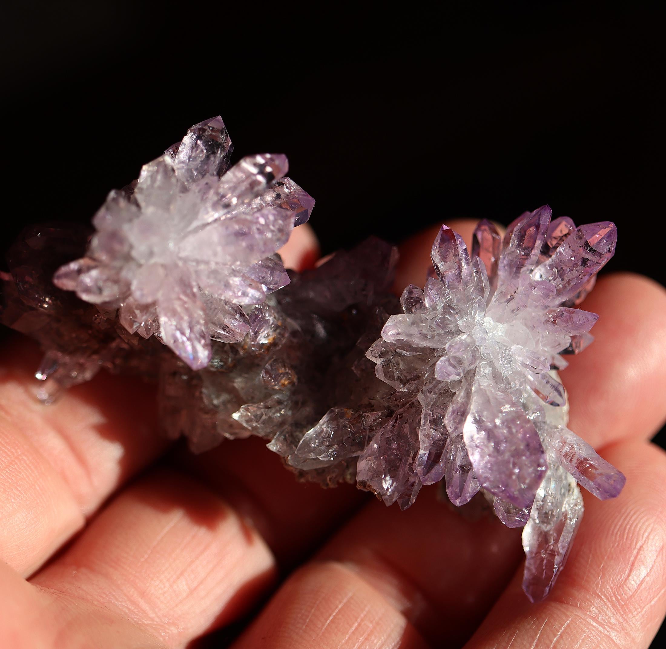 Offering a lustrous twin amethyst flower crystals. Both flowers are in excellent condition with good color and form. There is a slight matrix on the bottom. Sits perfectly on its own. Mined Piedra Parada, Tatatila, Veracruz, Mexico. 2.75 inch across. 34.8 grams.
