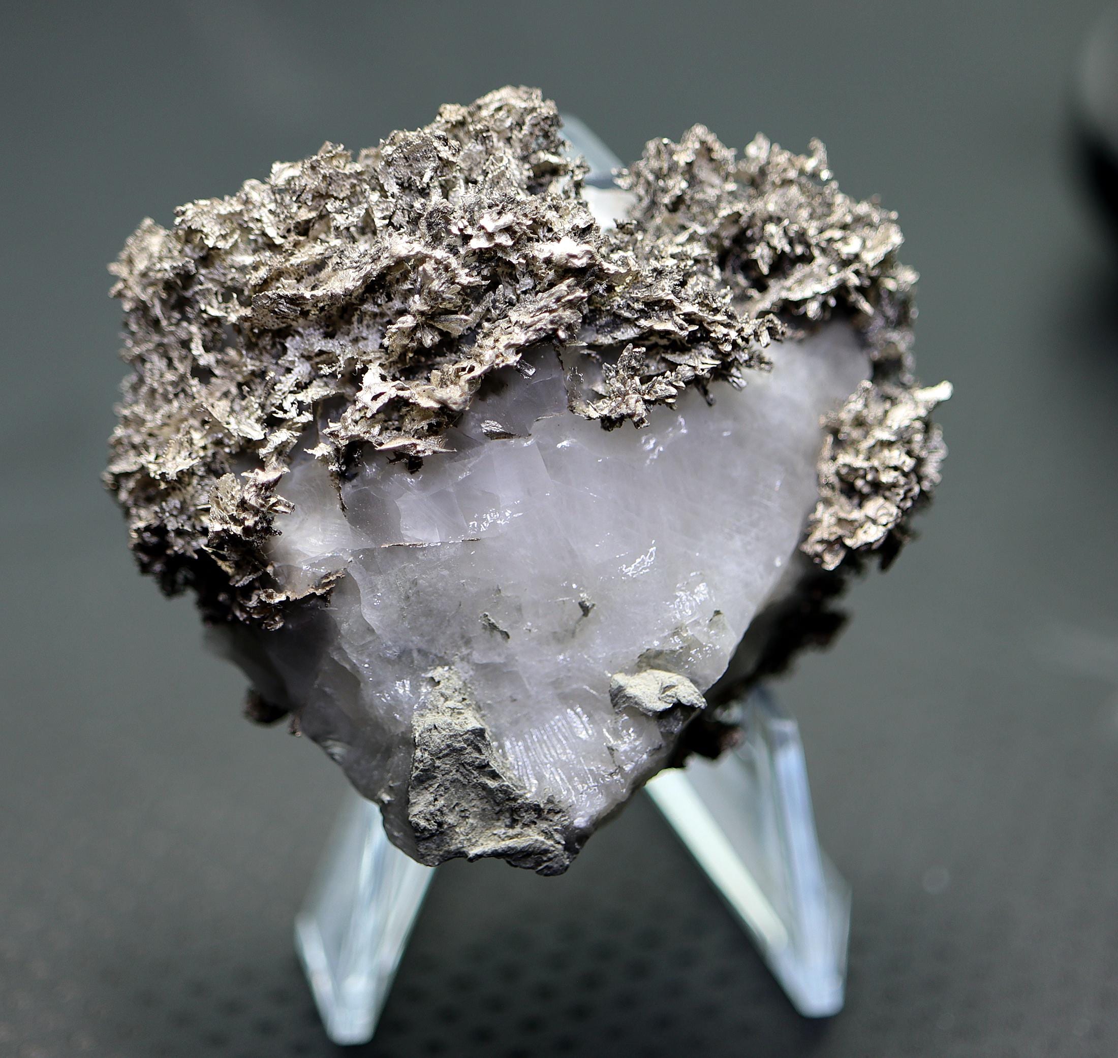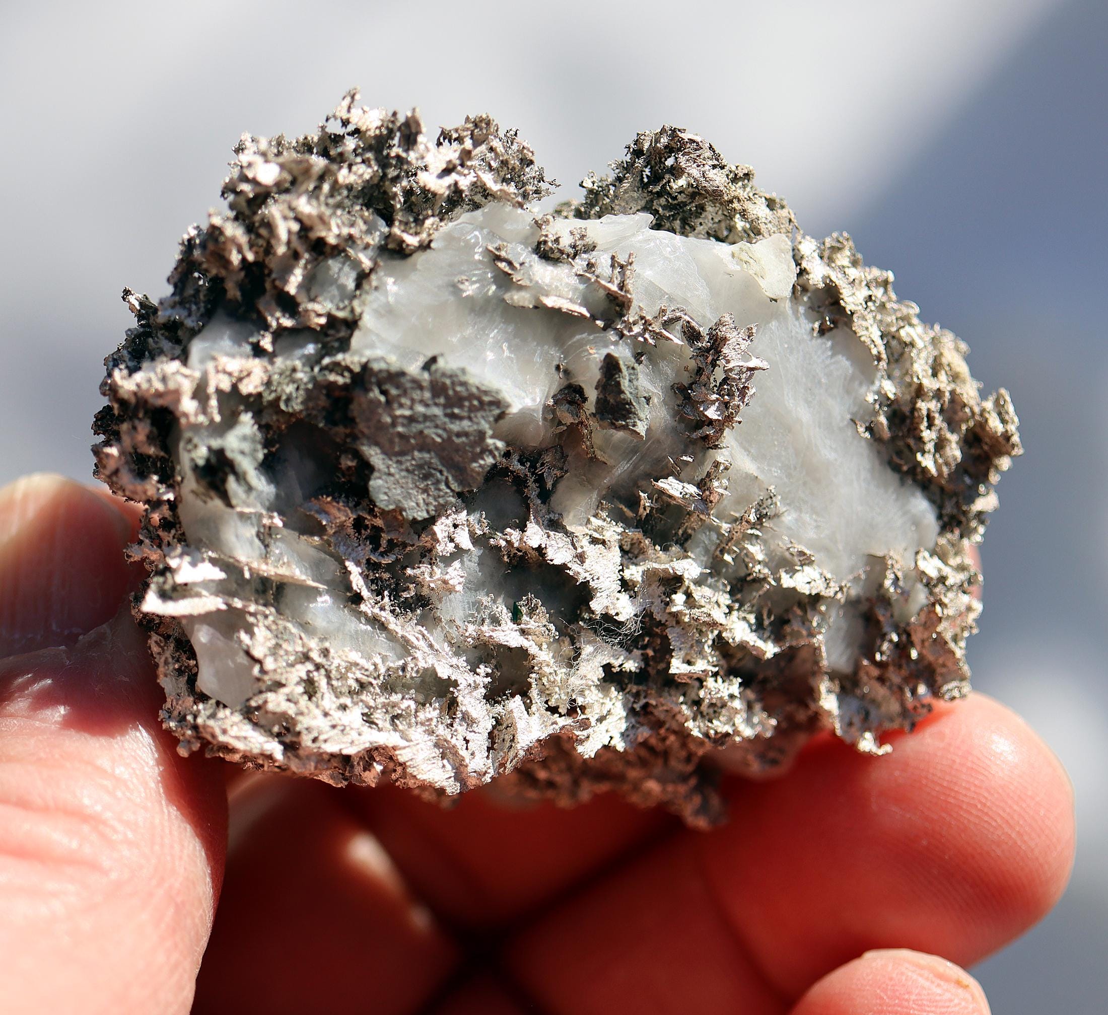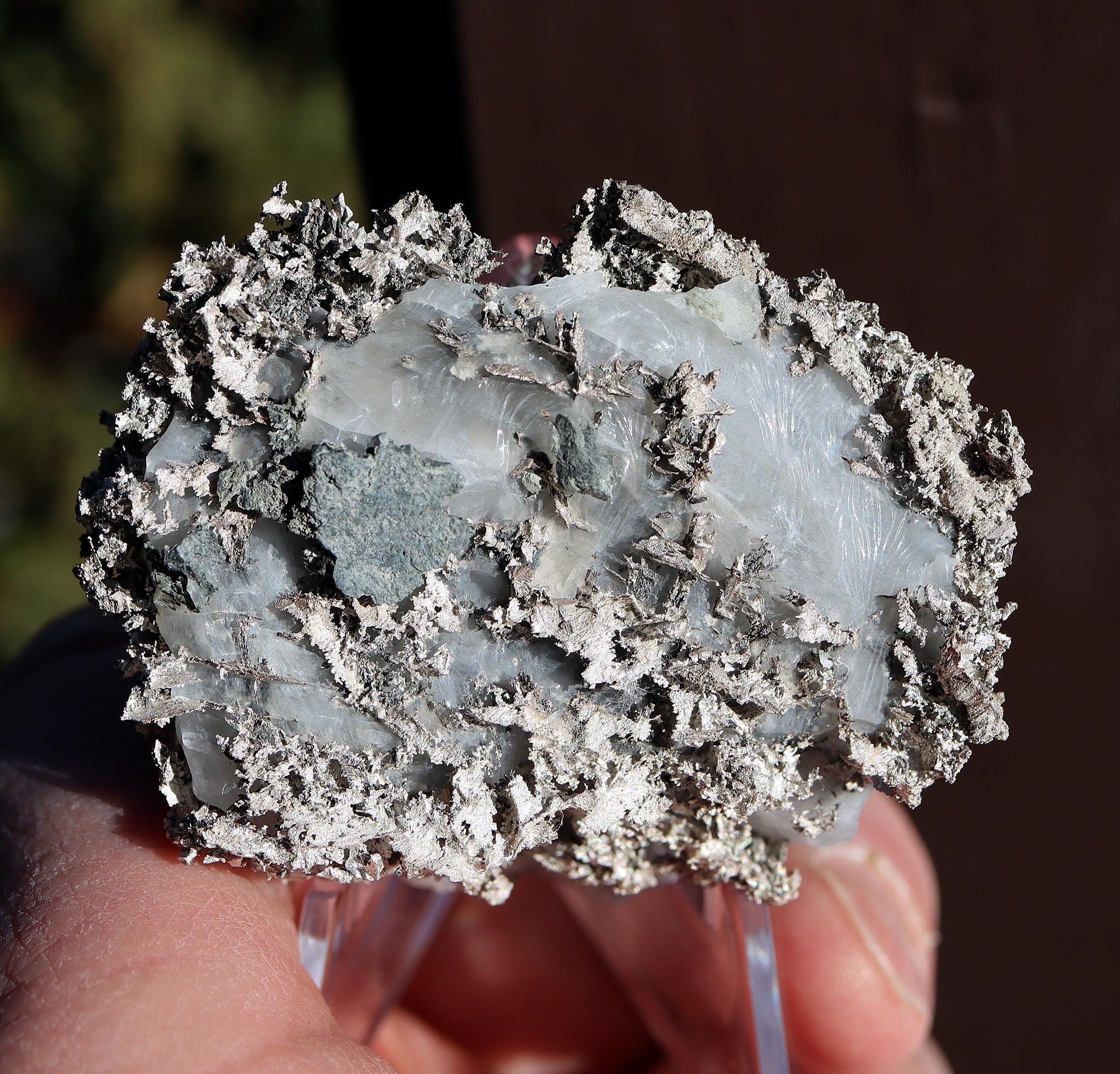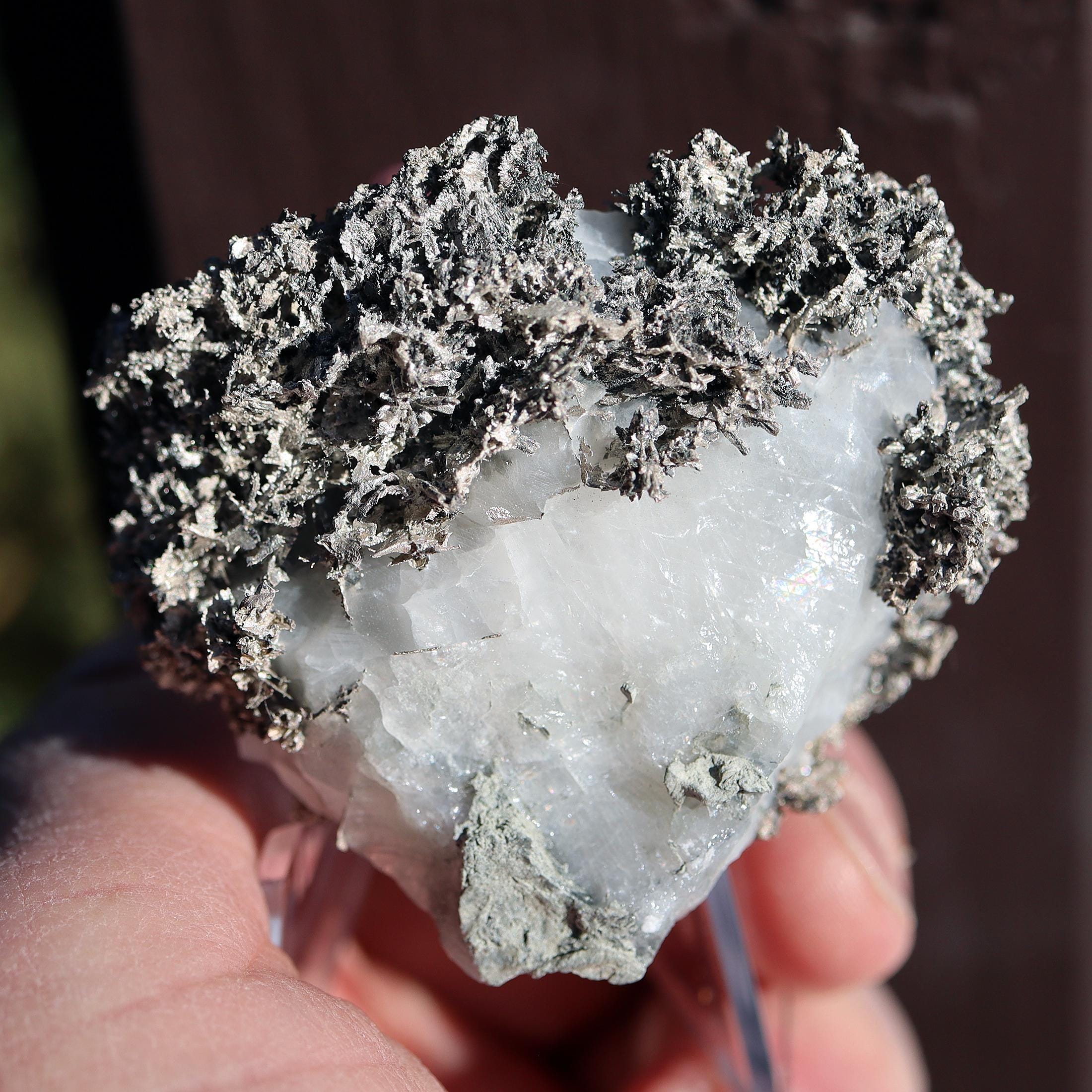 Offering native silver crystals on calcite. The silver covers a good amount of the calcite all around. Mined Bouismas Mine, Zagora Province, Drâa-Tafilalet Region, Morocco. Measure 2.25 by 2 by 1 inch. Weight: 70 grams. There maybe a touch of shedding during shipping but it will be unnoticeable given the structure. An excellent specimen for its type.