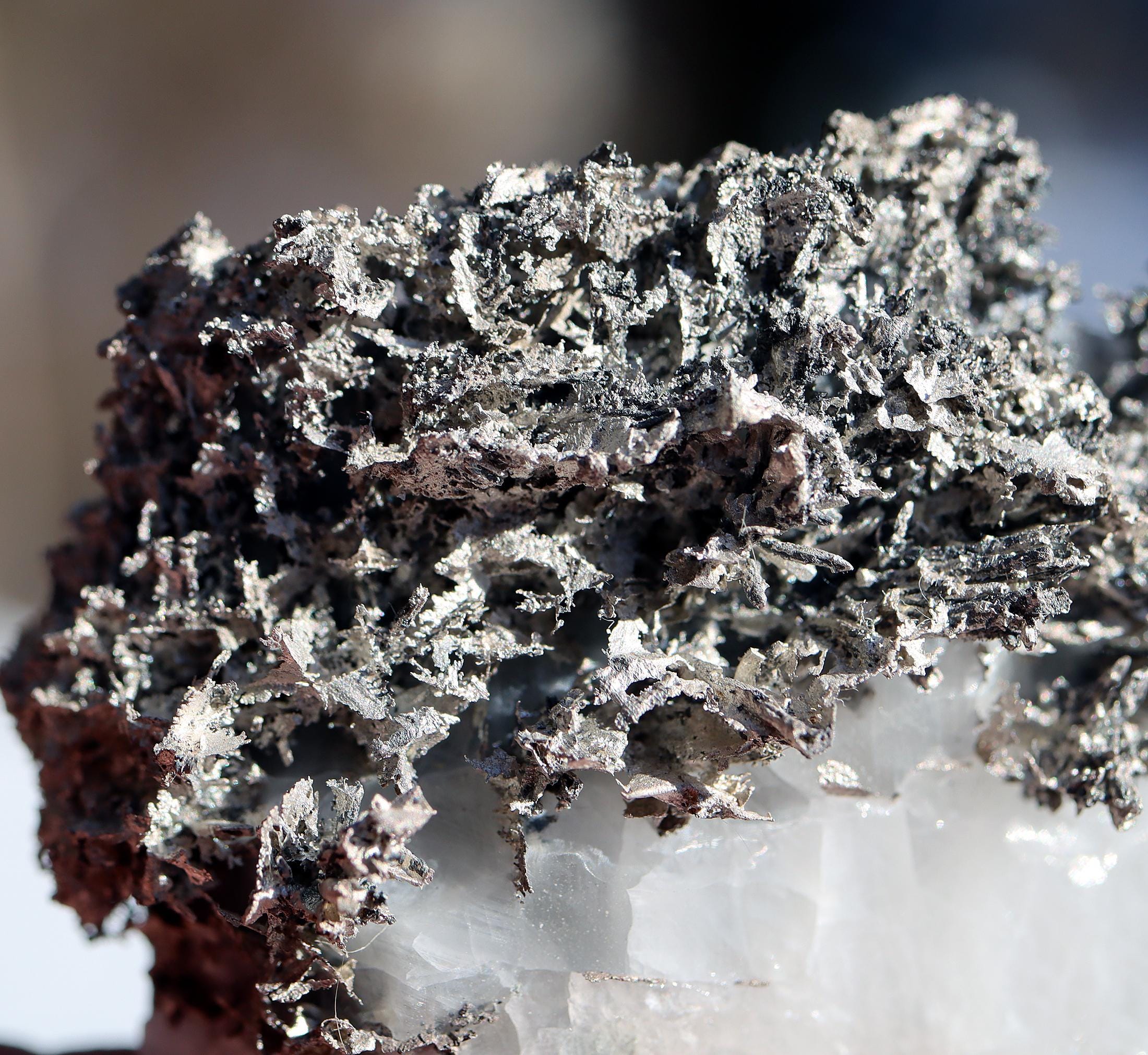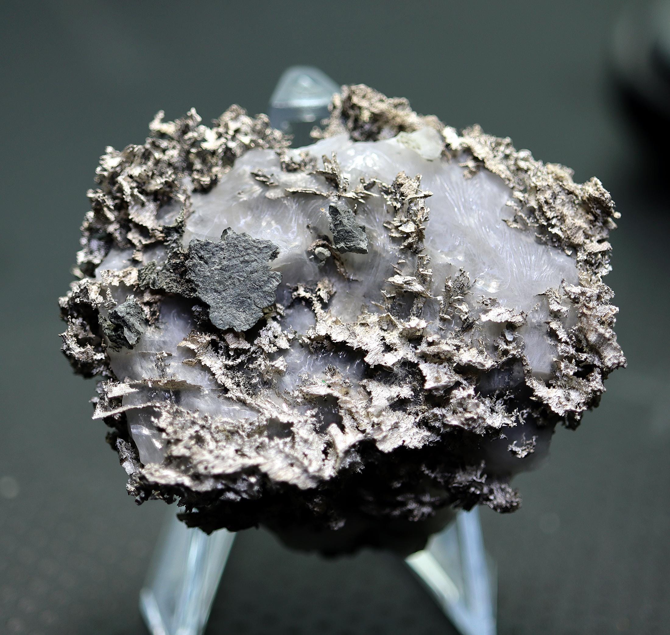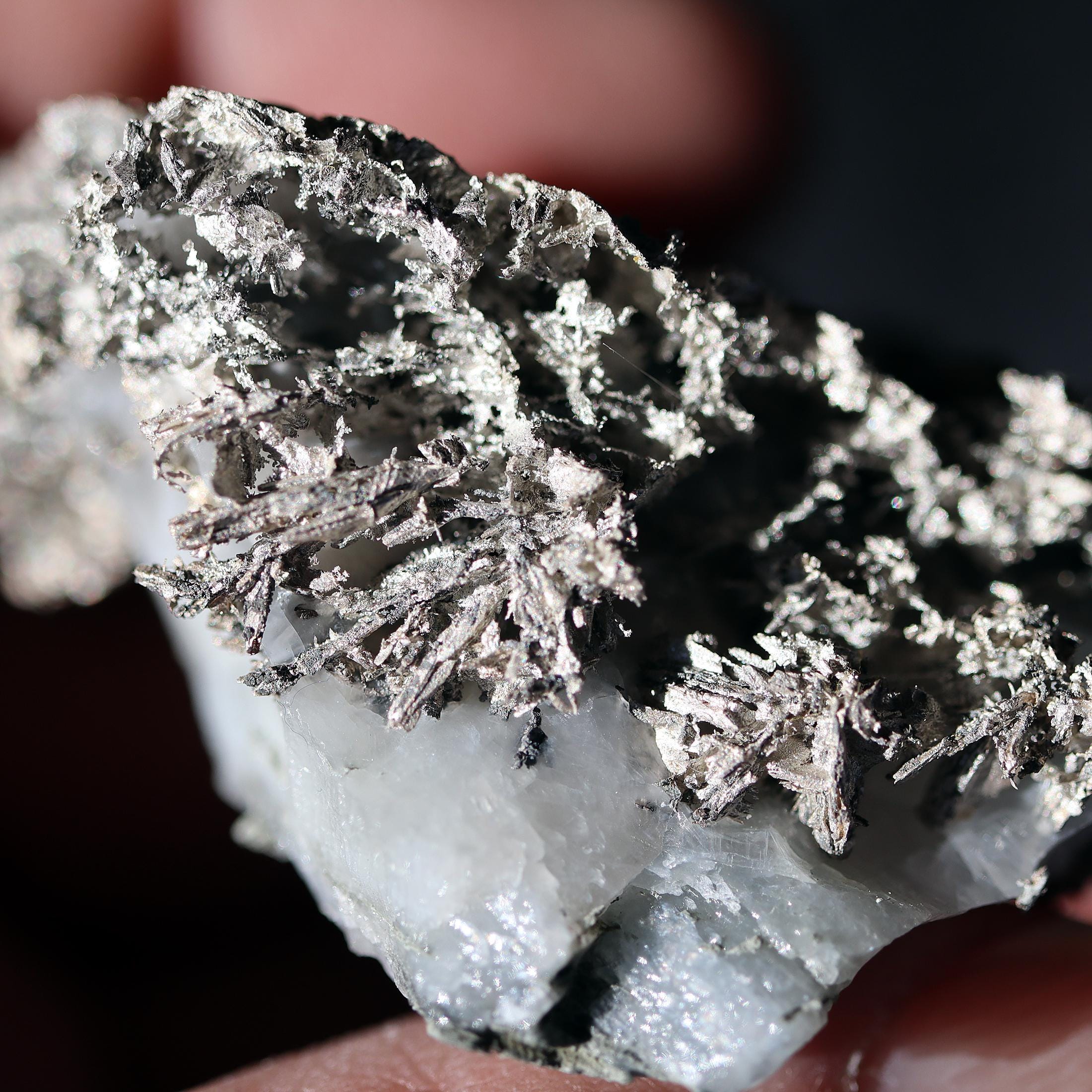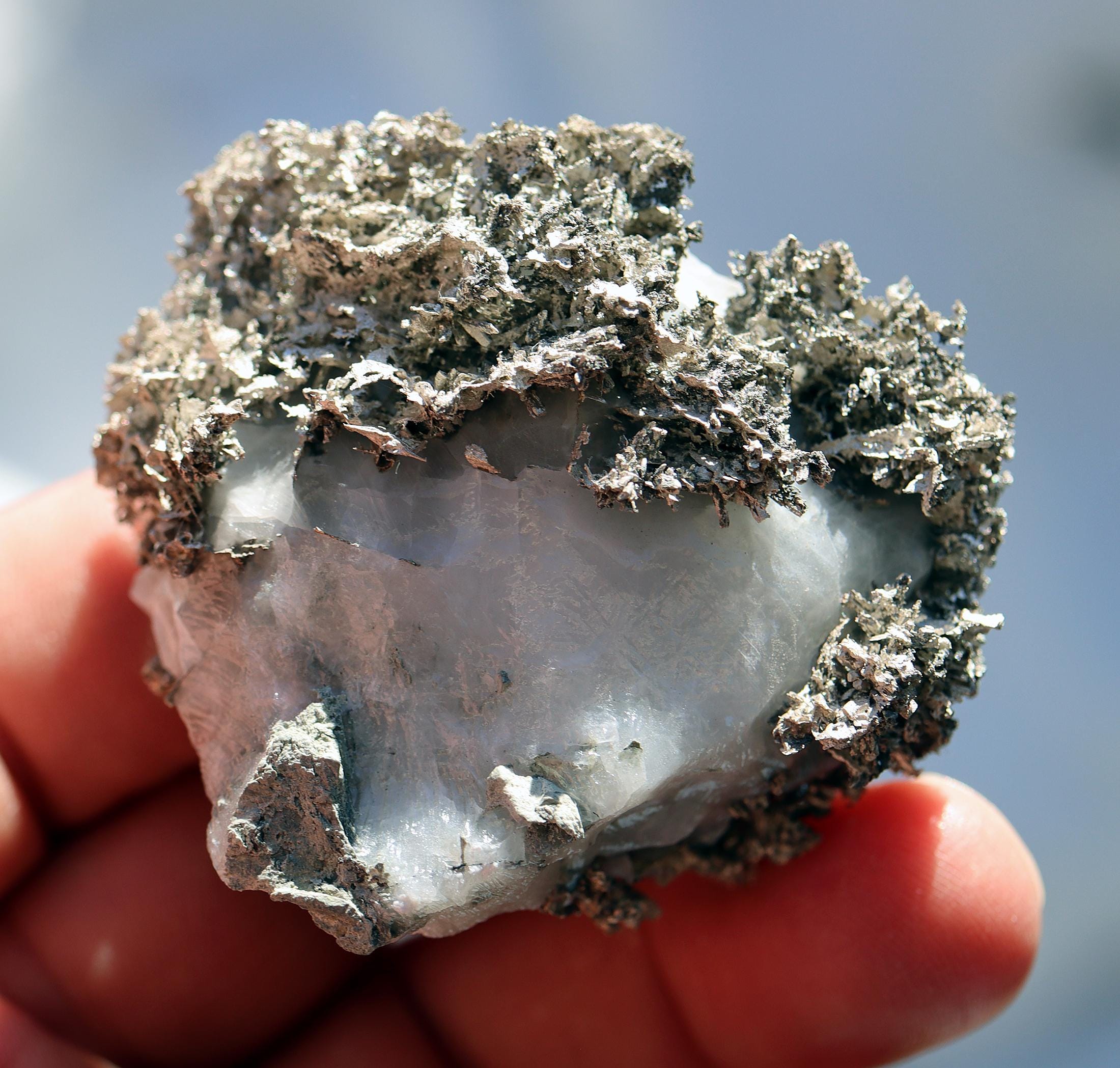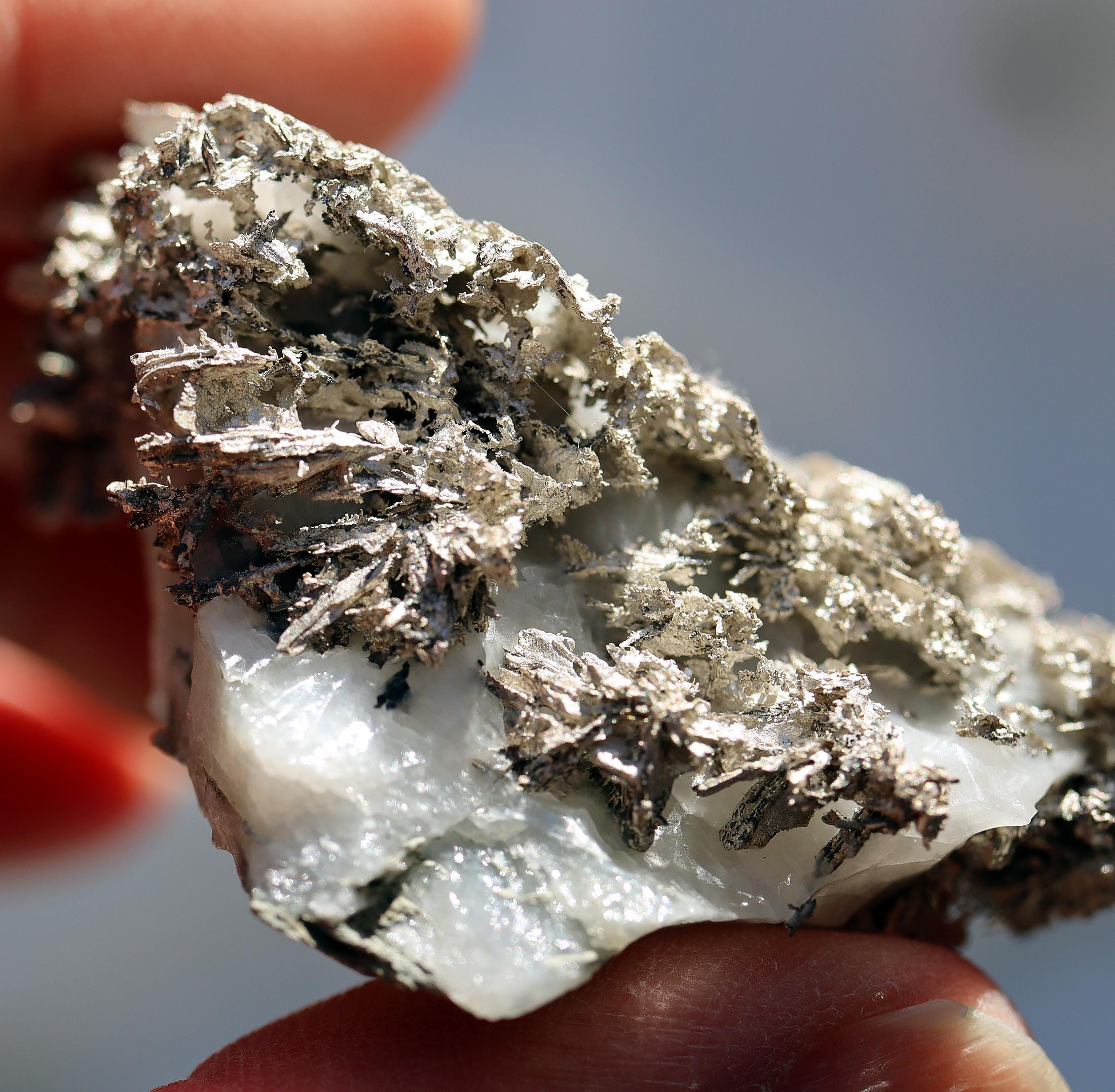 Offering native silver crystals on calcite. The silver covers a good amount of the calcite all around. Mined Bouismas Mine, Zagora Province, Drâa-Tafilalet Region, Morocco. Measure 2.25 by 2 by 1 inch. Weight: 70 grams. There maybe a touch of shedding during shipping but it will be unnoticeable given the structure. An excellent specimen for its type.