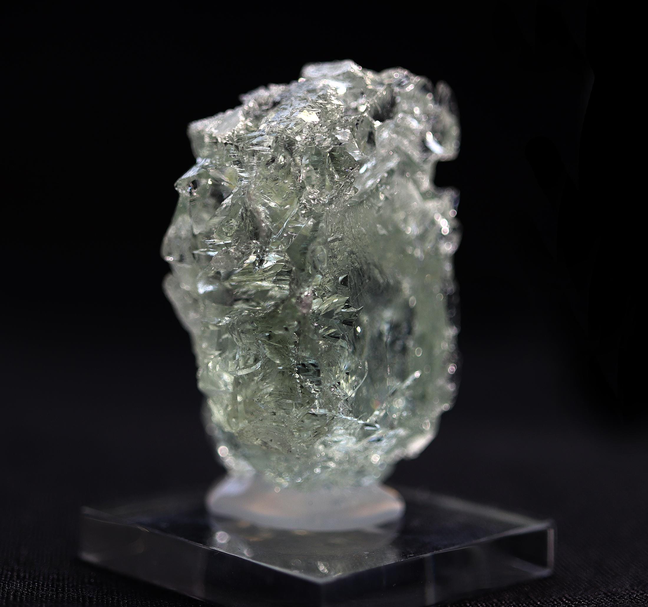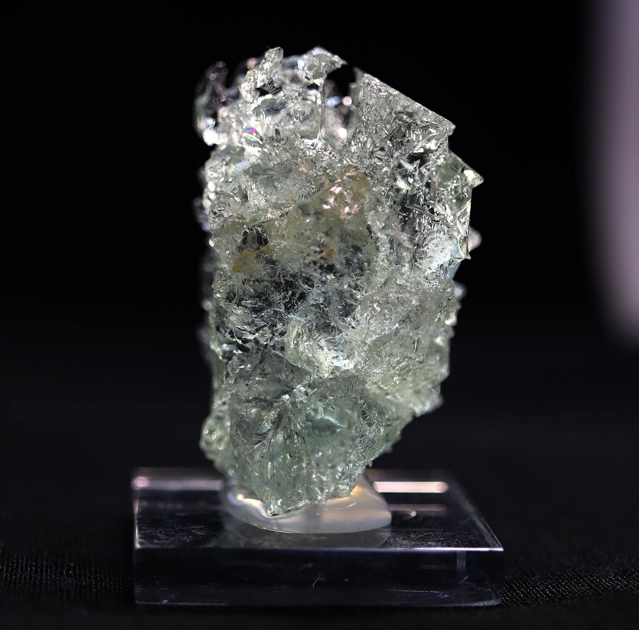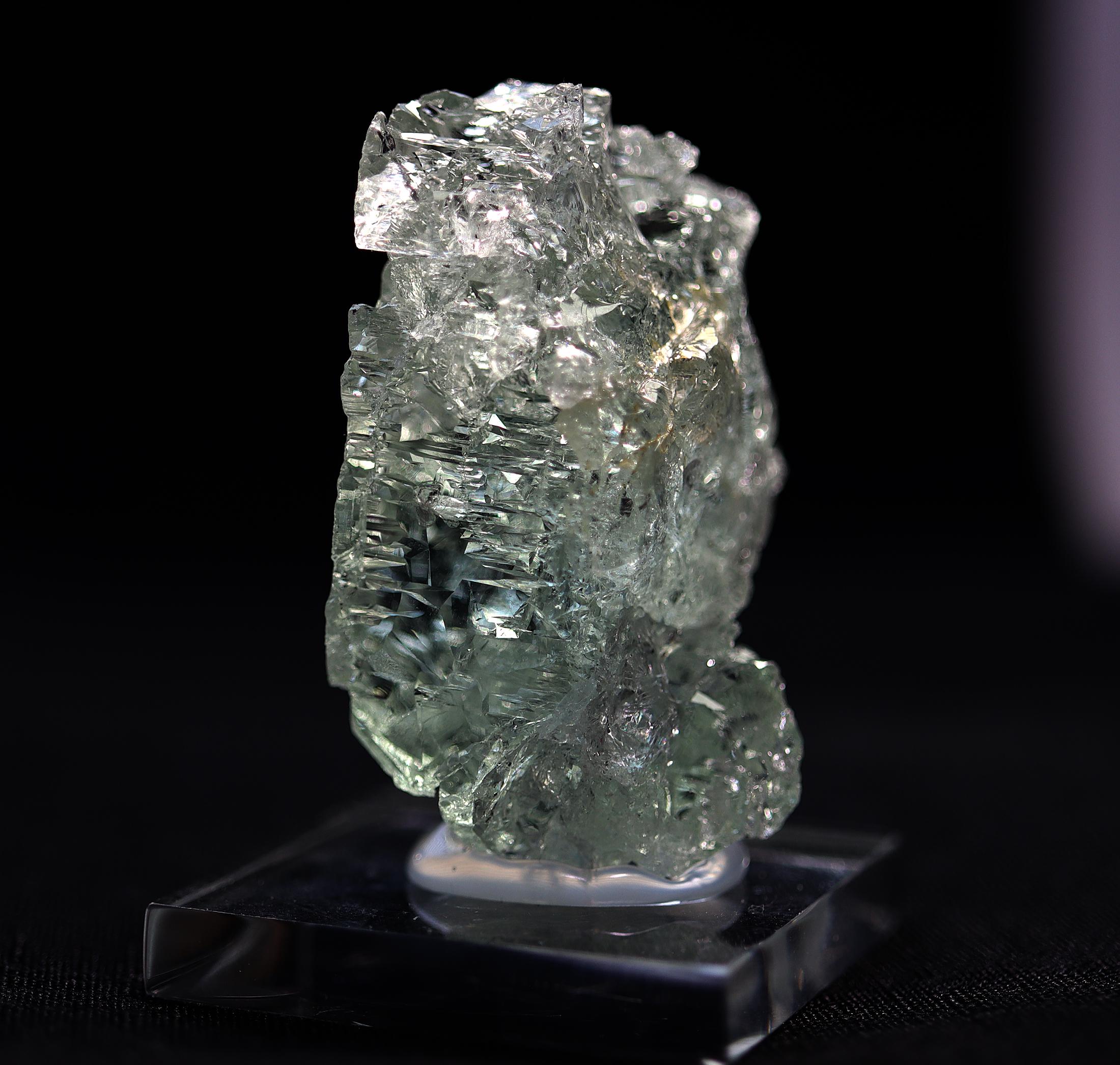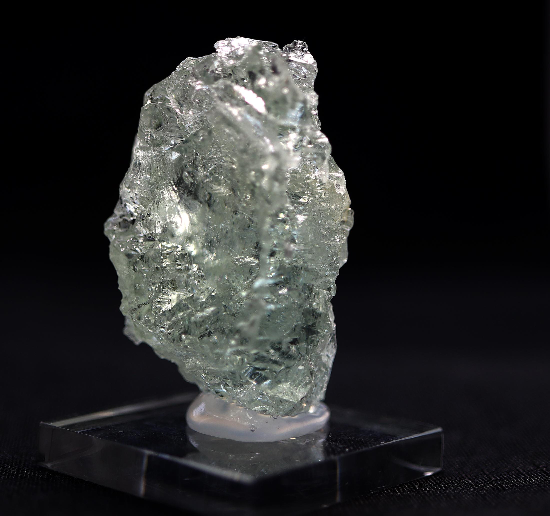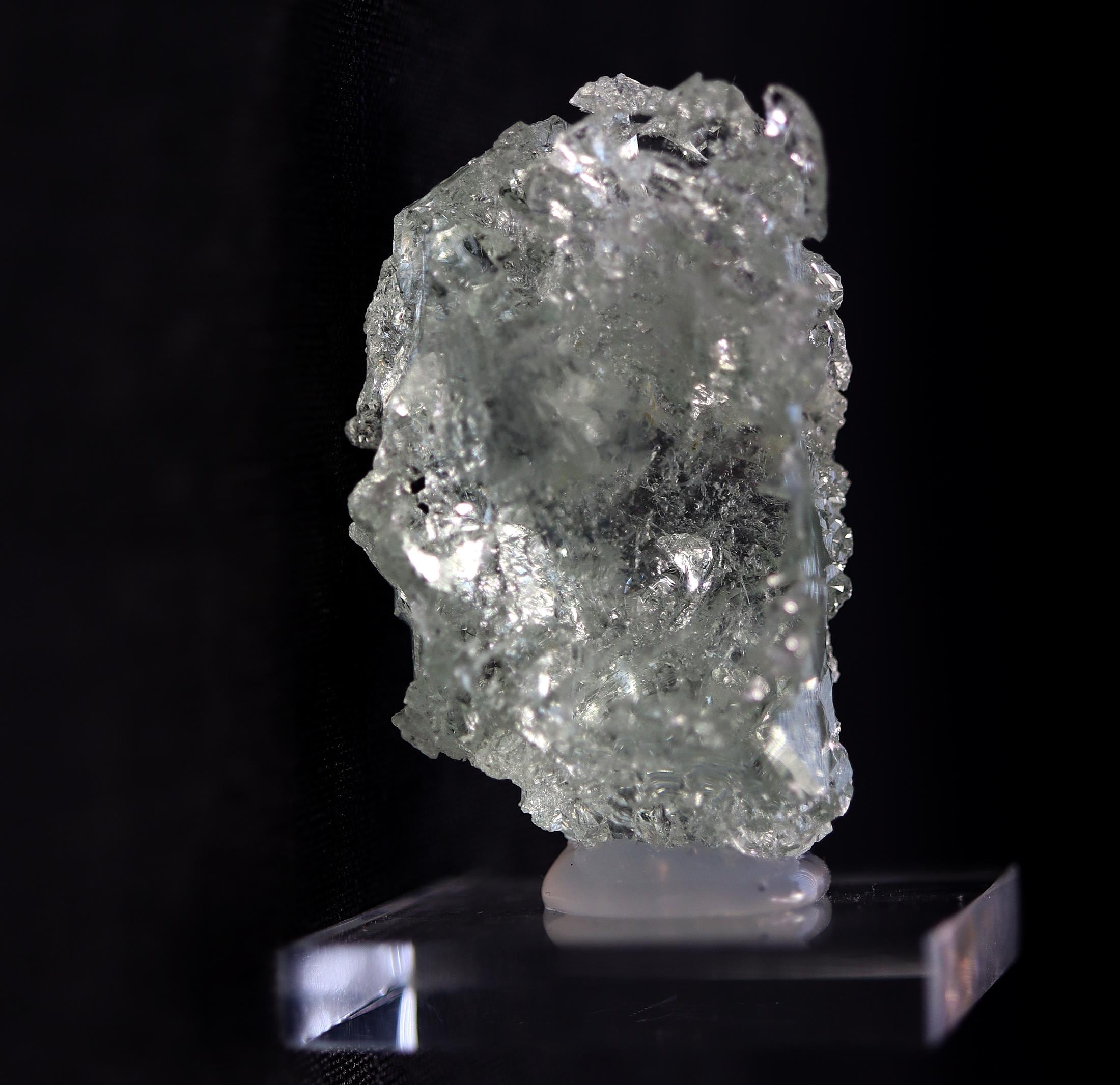 A floater naturally etched gemmy pale blue spiky crystal of beryl var. Aquamarine. One side retains its crystal face. Comes hot glued to a Lucite base. 1.75 inch by 1.25 wide by 1.2 inch deep. Natural no damage. Mined Sao Geraldo do Baixio, Minas Gerais, Brazil
