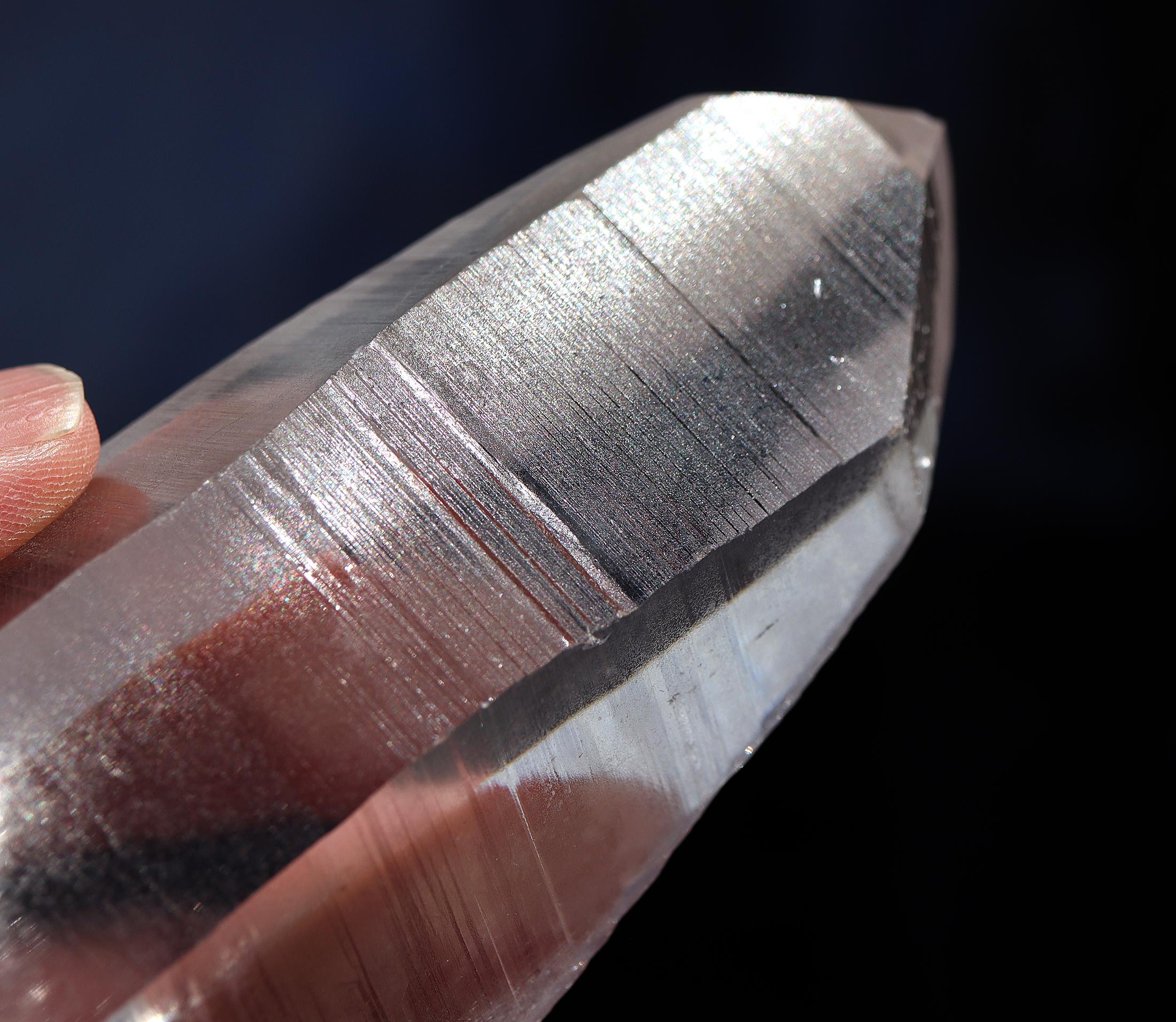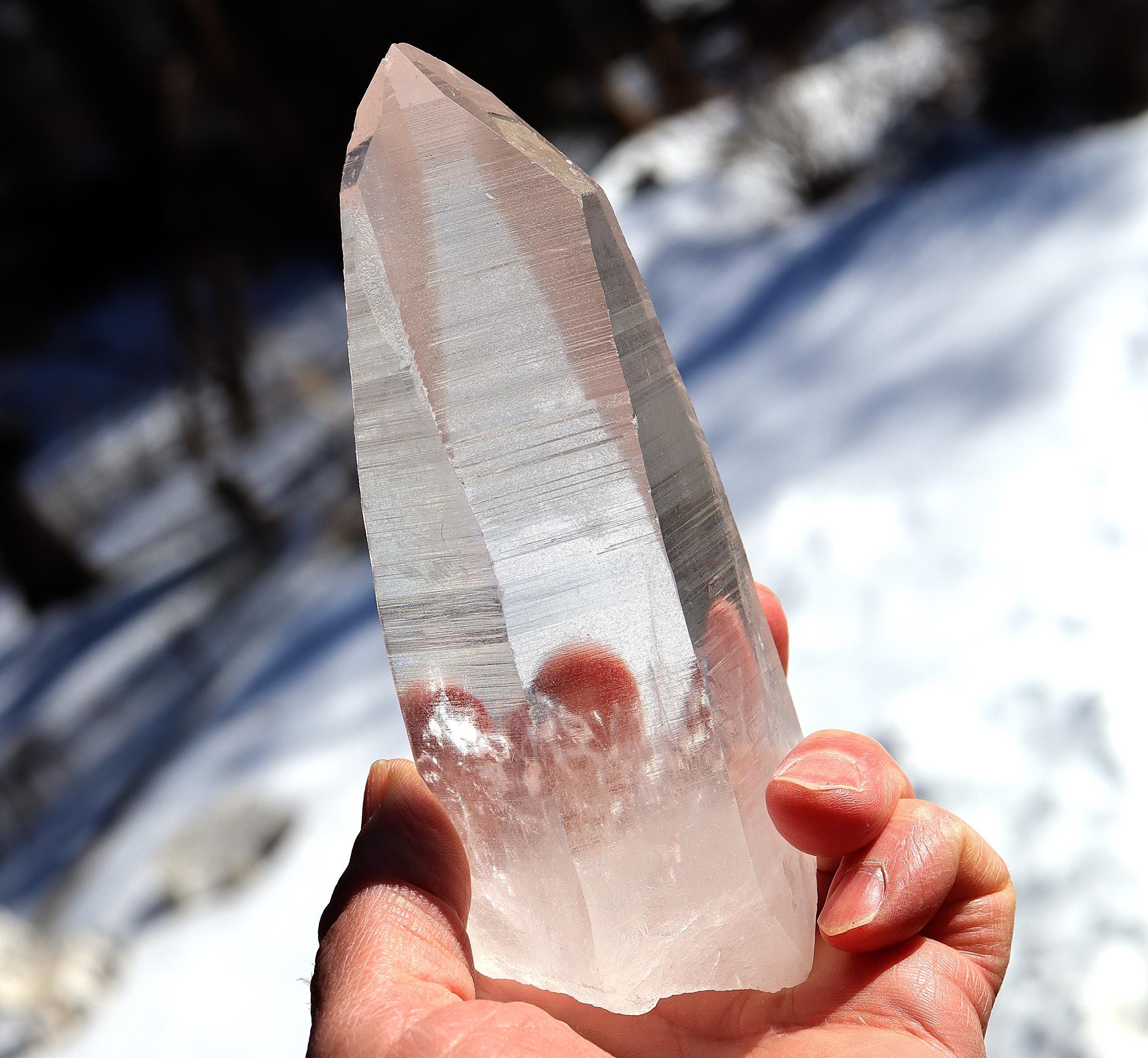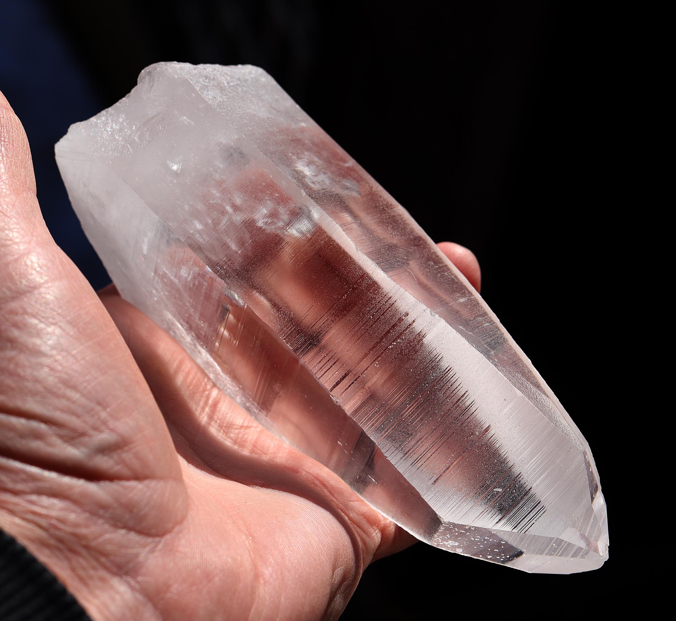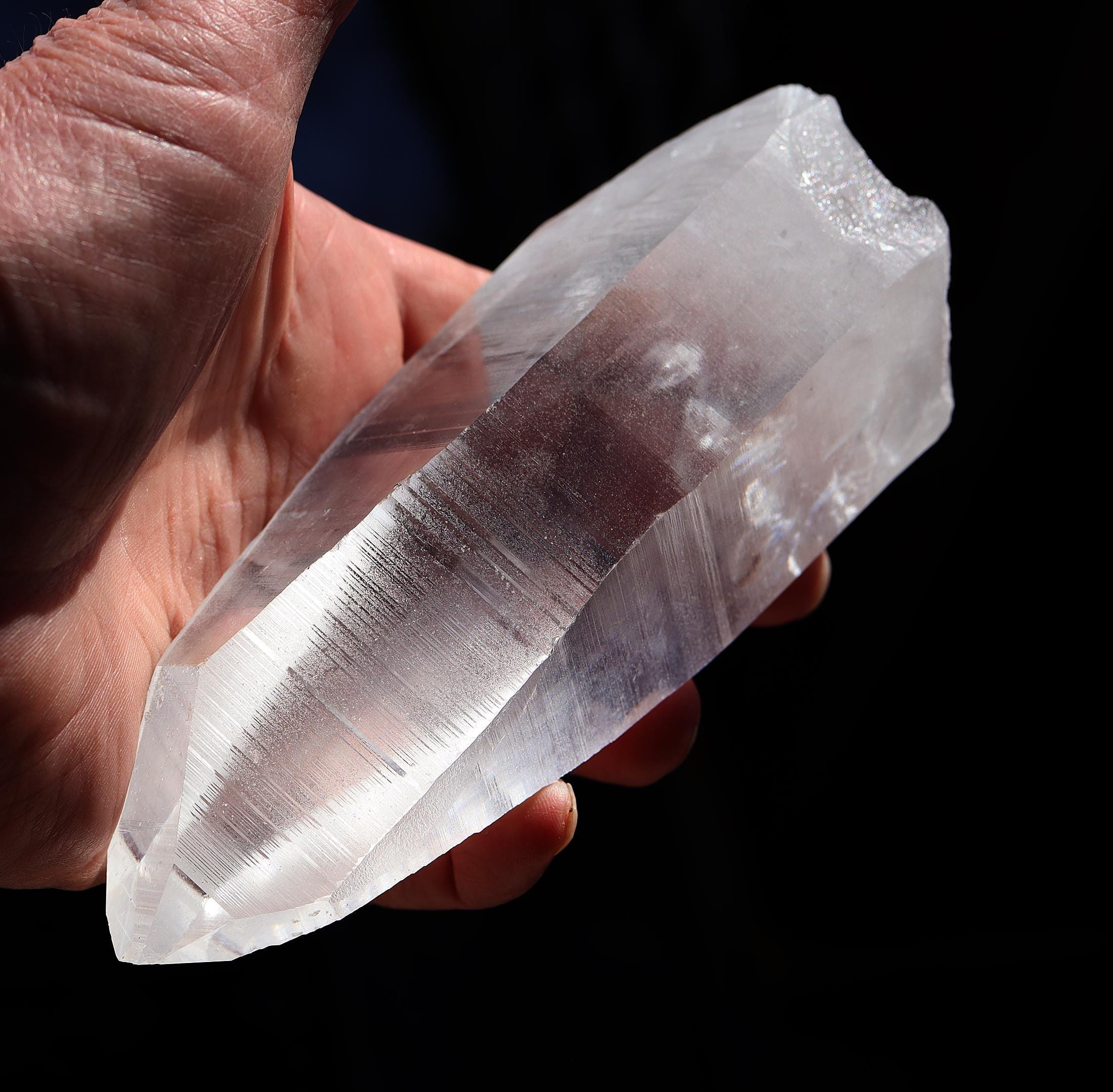Offering a top clear natural no polish Lemurian Seed Crystal 663 grams, 1 pound 7.1 ounce. 6 inch tall by 2.5 inch wide. Quartz with Muzo habit growth lines from Serra Do Cabral & Bahia region of Brazil. The crystal is very clear. The first photo shows this well. Some photos show a glare of light. The crystal is large and in exceptional condition. Overseas orders ship Etsy shipping only, no exceptions