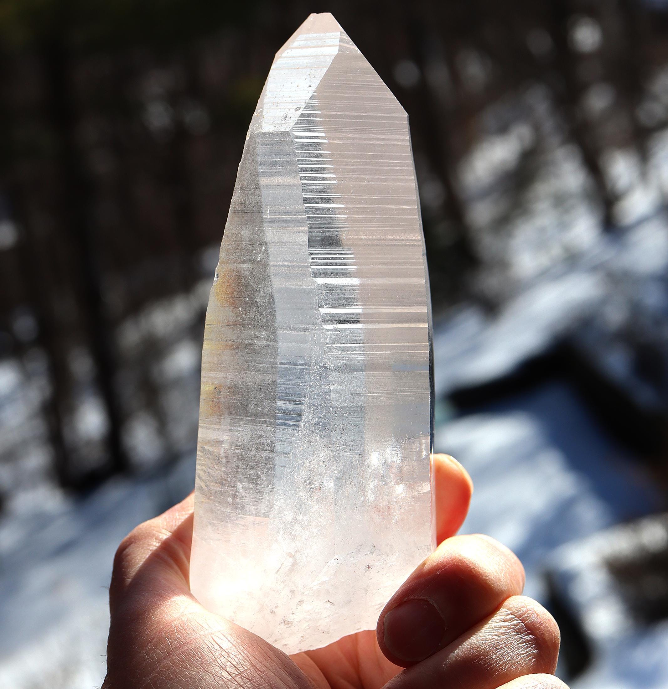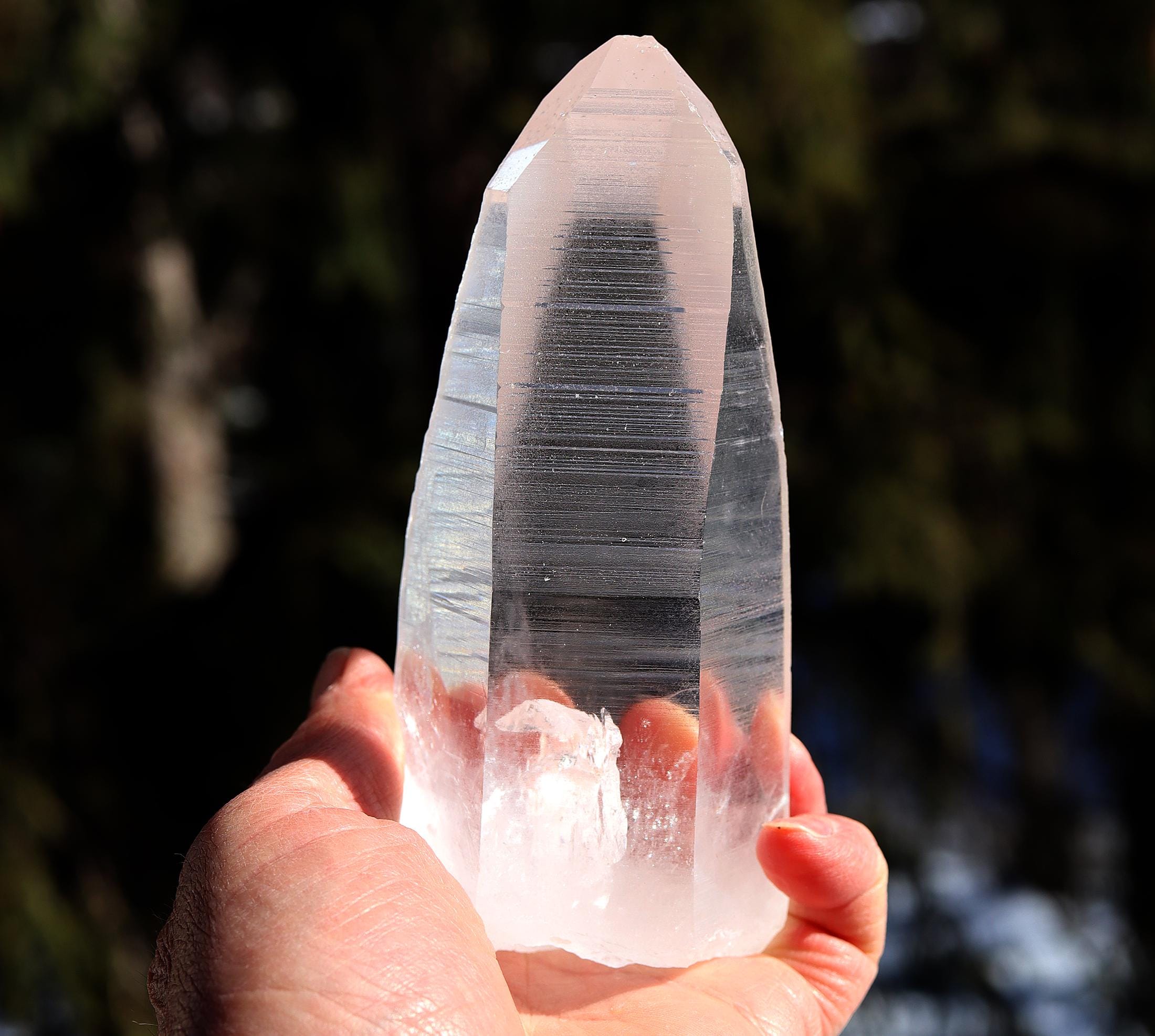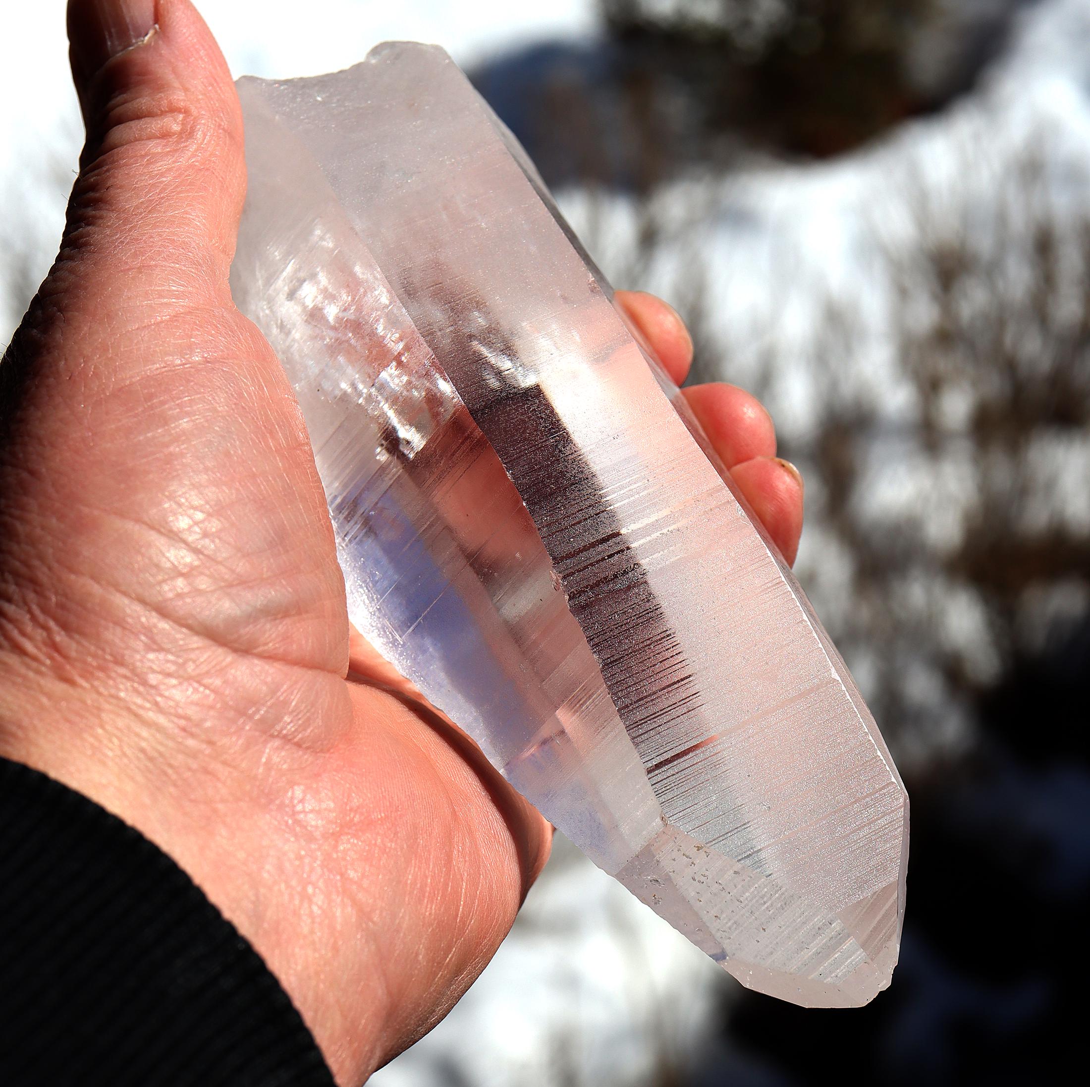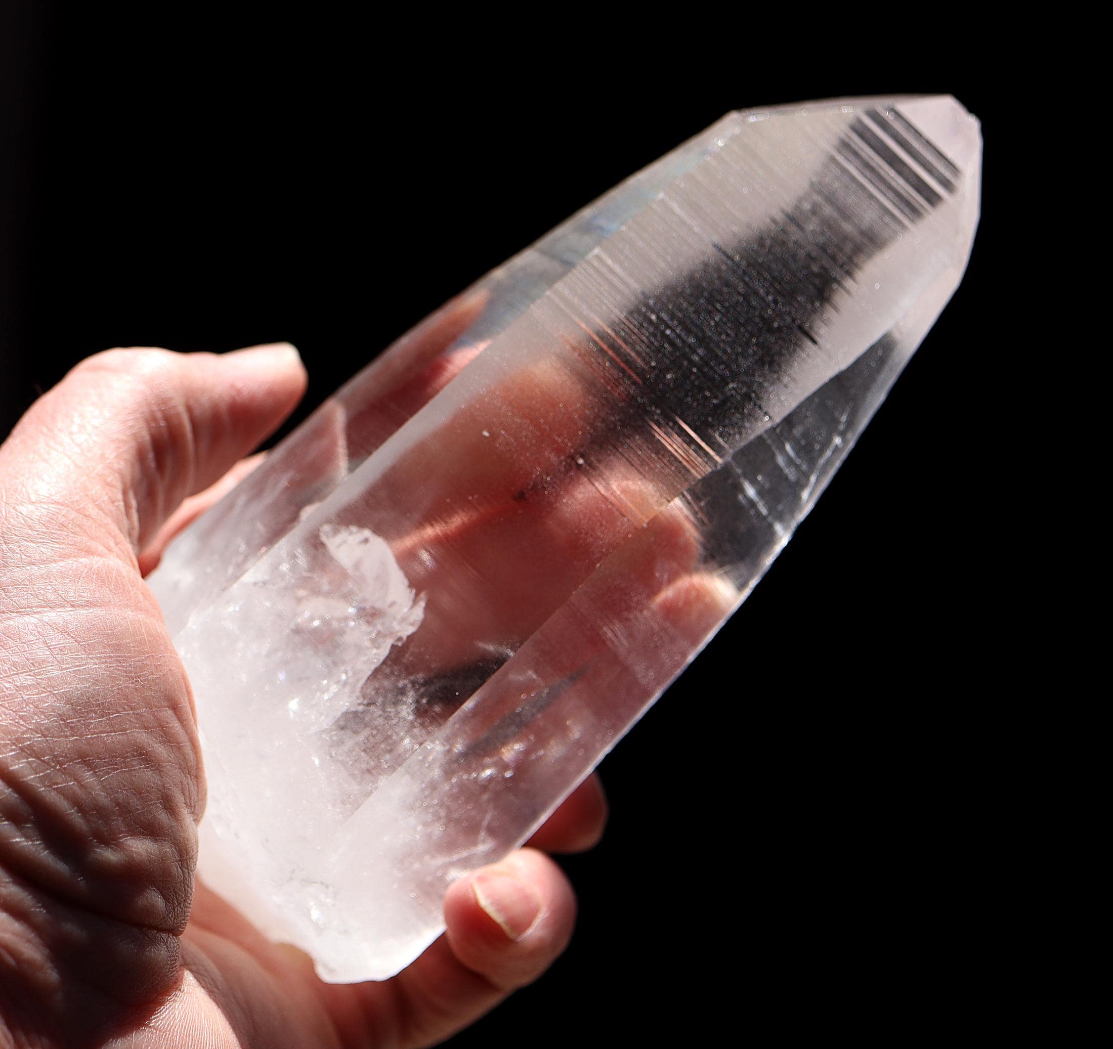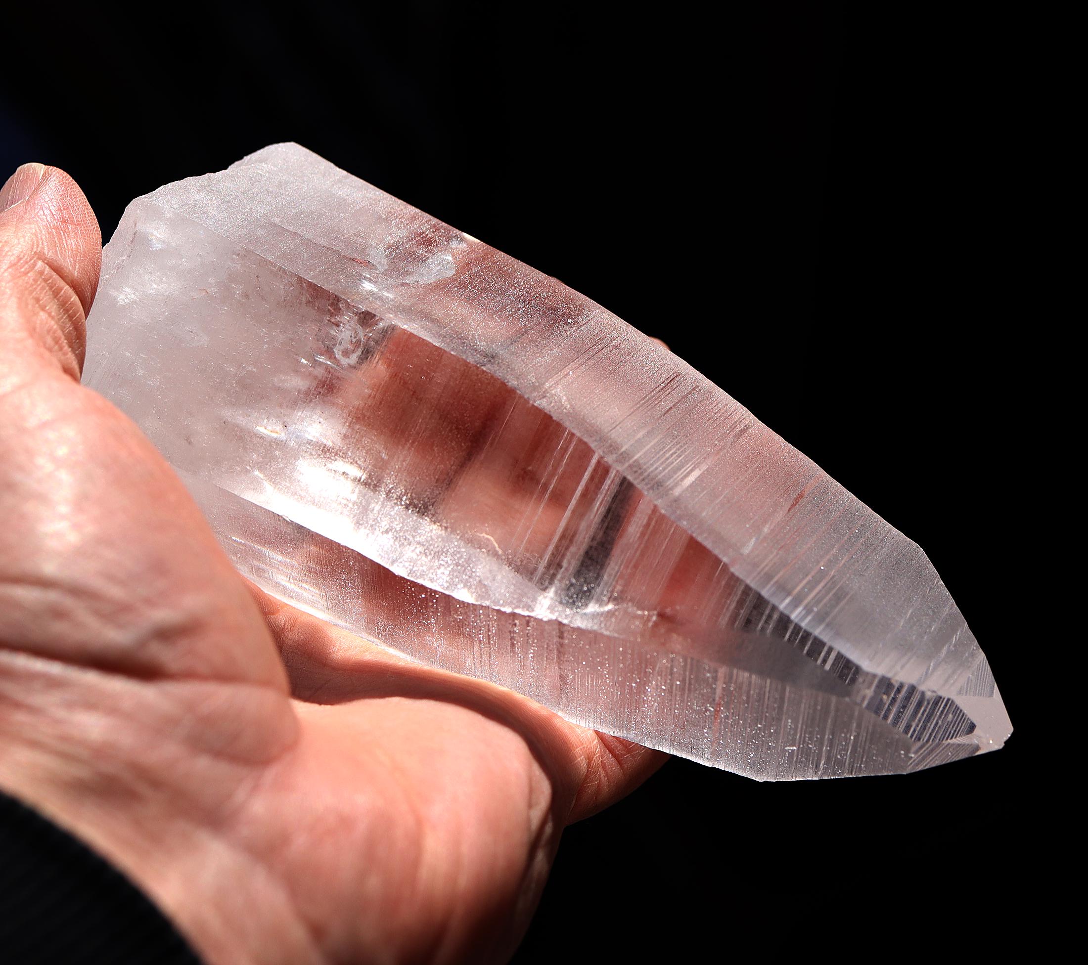 Offering a top clear natural no polish Lemurian Seed Crystal 663 grams, 1 pound 7.1 ounce. 6 inch tall by 2.5 inch wide. Quartz with Muzo habit growth lines from Serra Do Cabral & Bahia region of Brazil. The crystal is very clear. The first photo shows this well. Some photos show a glare of light. The crystal is large and in exceptional condition. Overseas orders ship Etsy shipping only, no exceptions