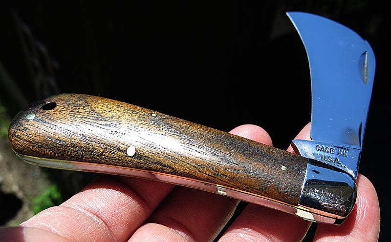 A wood handle Unused 10 dot 1970 Case XX Hawkbill Pocket knife Pattern number 11011. This pattern was used to death and most never survived in this condition. The blade has no scratches, original mirror and factory edge. Strong snap. No cracks to the handle. Mint Excellent with no issues, the knife is near perfect from 1970. Measure is 4 inches closed.
