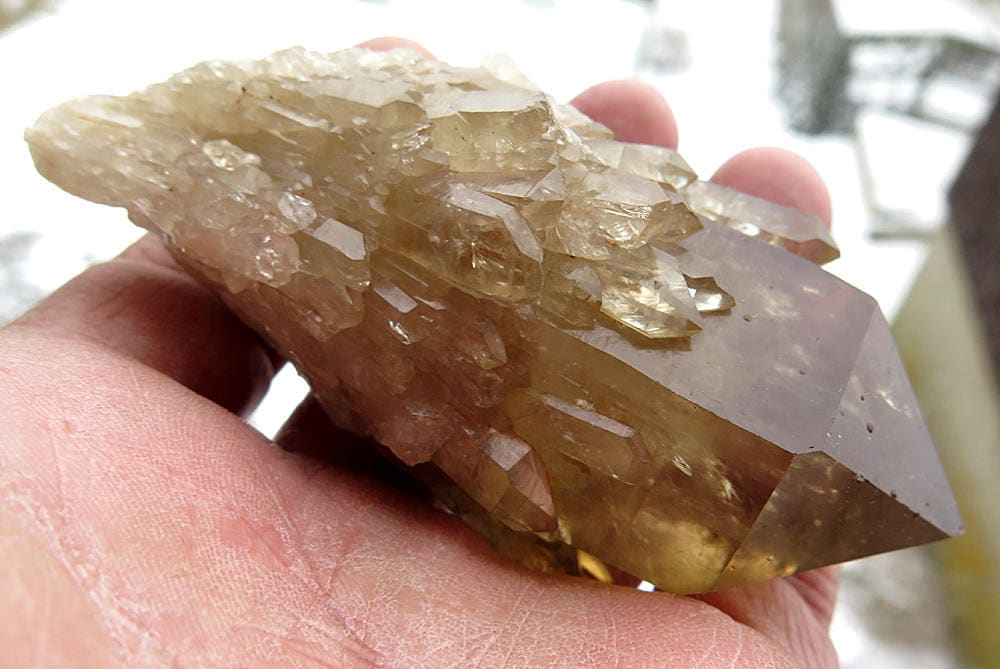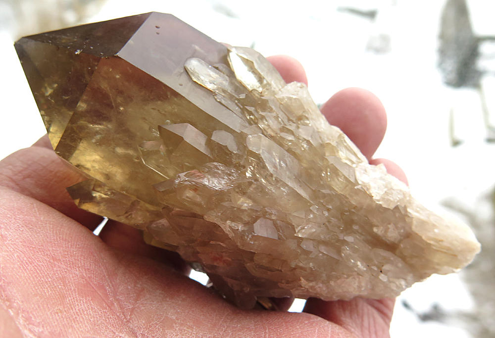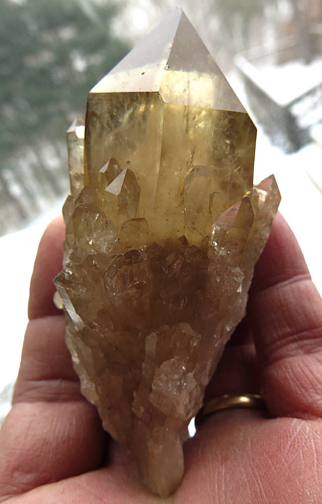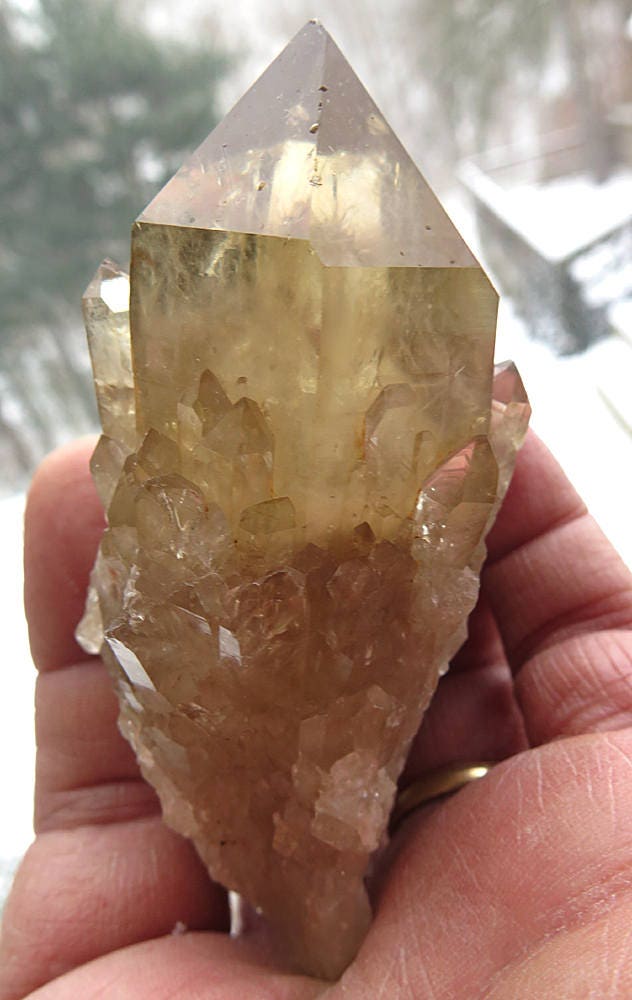 Love real citrine pineapple quartz! This one is beautiful all around with side car crystals all around. 185.1 grams at 3.75 inch tall by about 2 inches wide. The main point in it's center is clear yet golden. The tip has a tiny chip and a few on the sidecars but wow! what a true citrine healer. Mined in the Congo, I did prep work on this beauty.