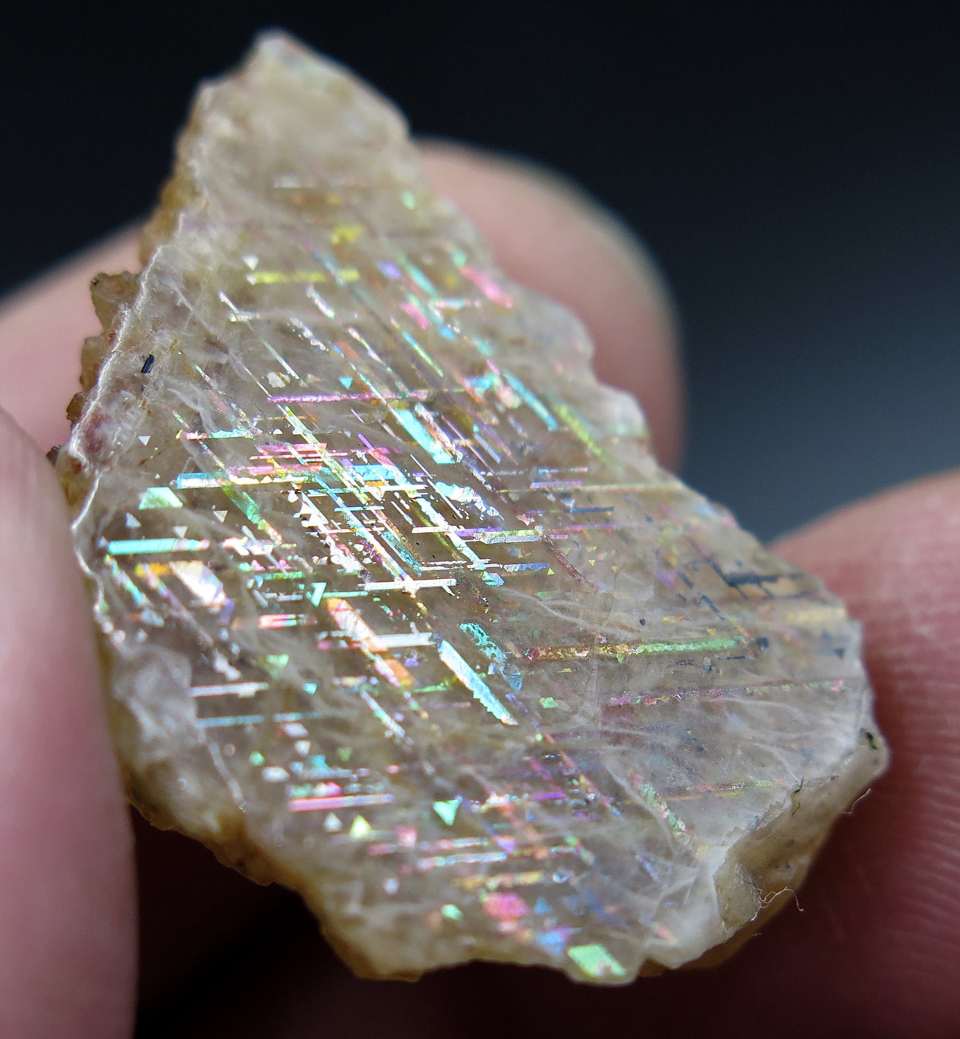22.5 carat Rainbow Lattice Sunstone Harts Range, Northern Territory, Australia. Flash is almost total on one side depending on how it is tilted. 1 1/8 inch across.
