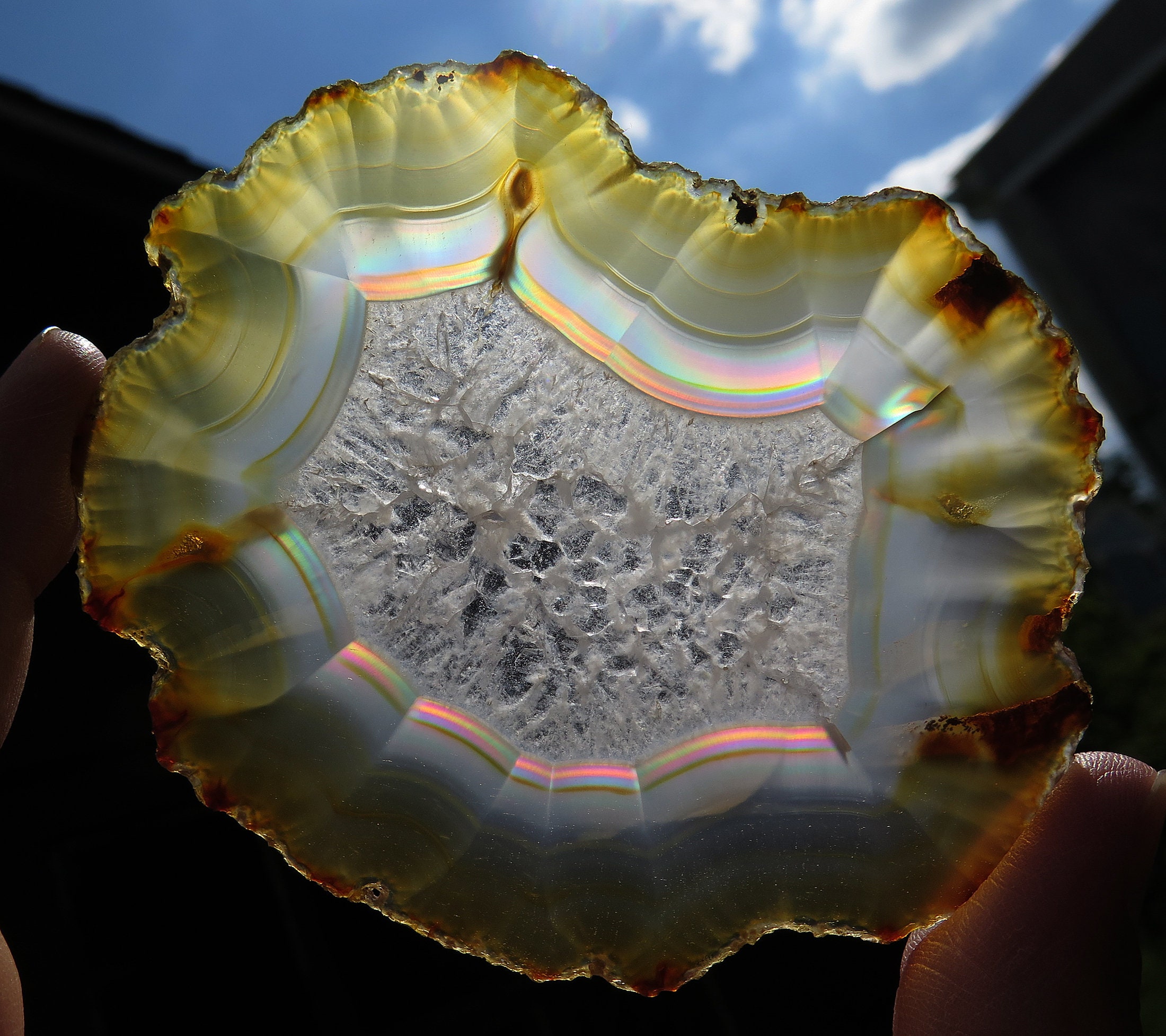 An iridescent variety of agate - when sliced into a thin section it exhibits all the colors of the spectrum when viewed in transmitted light. Iris Agate is one of the most valuable varieties of Chalcedony. It is often cut into unique carvings to display iridescent effect. From East Java Province, Indonesia. Photos shot in direct sunlight backlite. No pushing of exposure, what you see is what you will get. No broken partial slab here, complete no damage round.